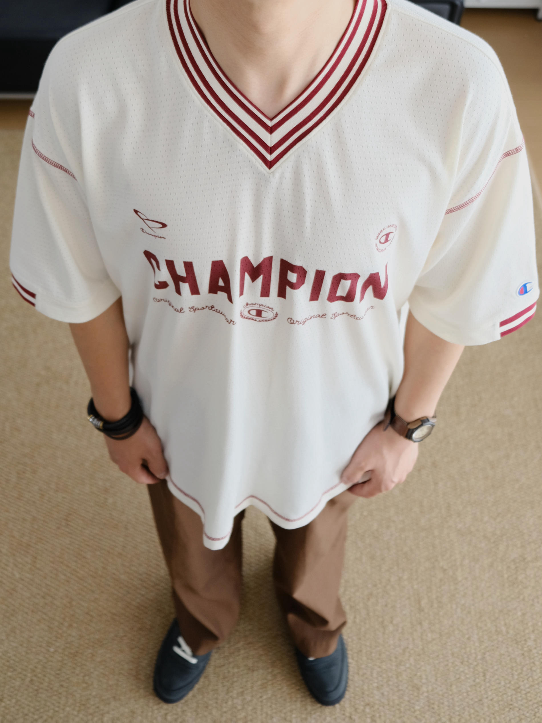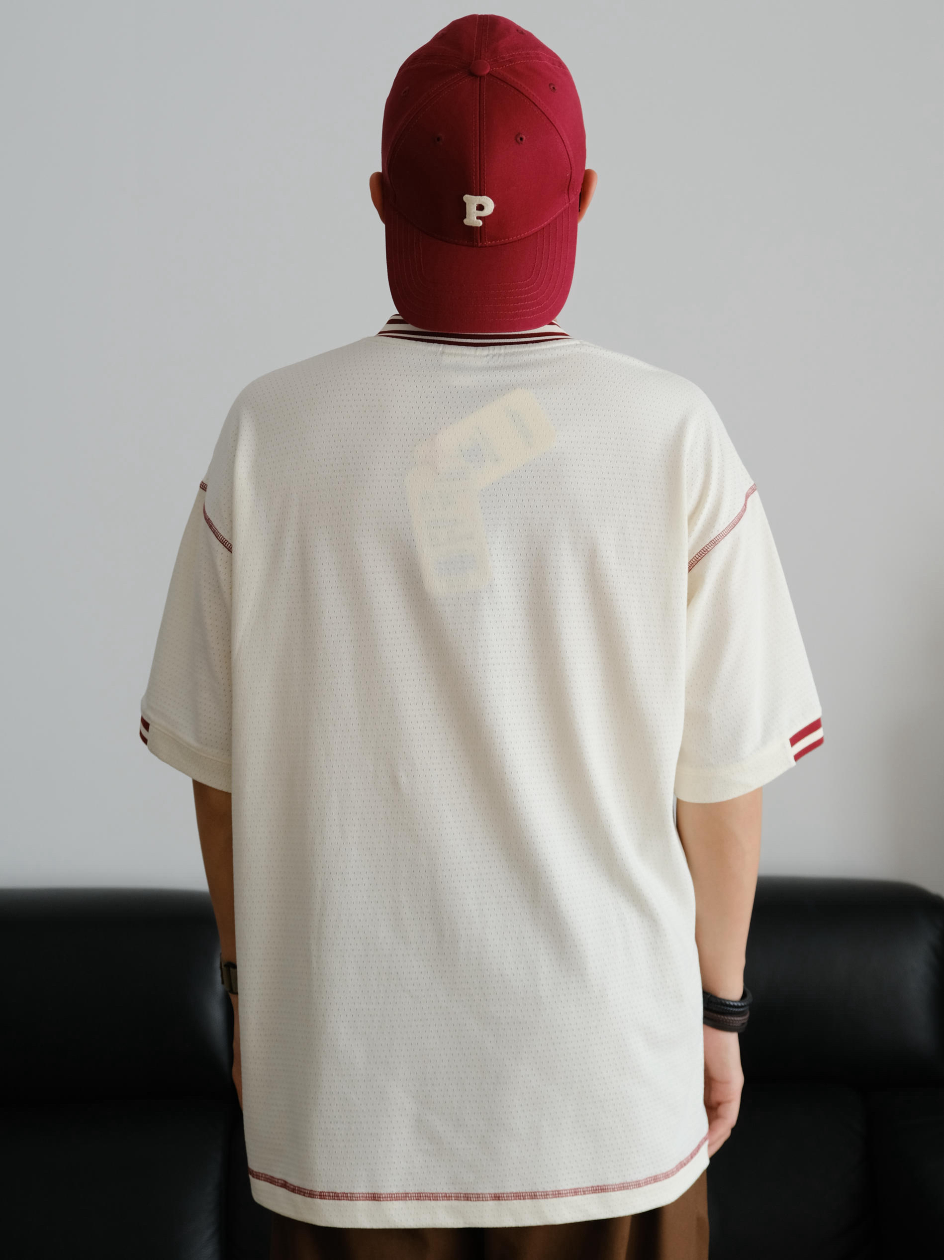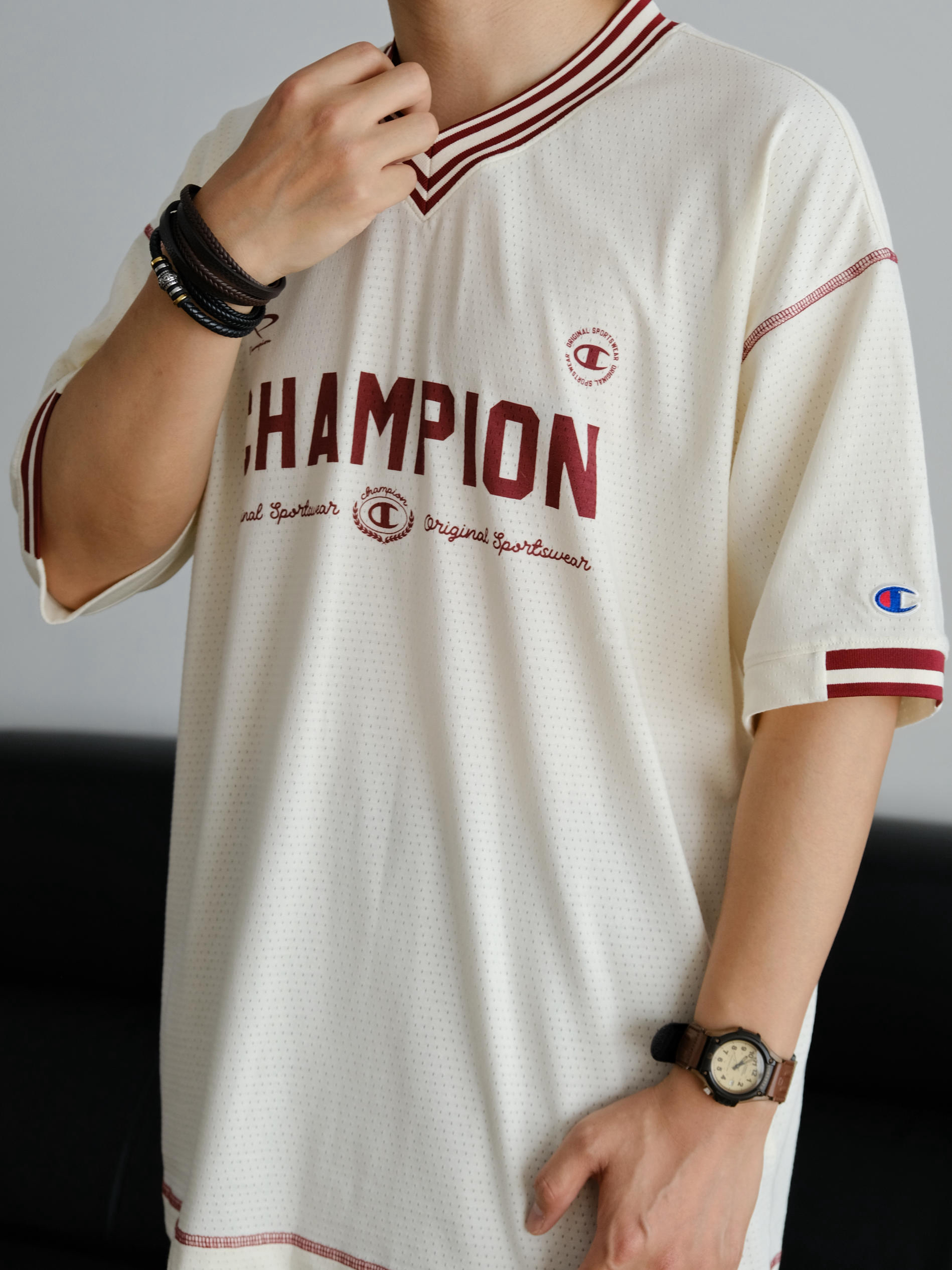 夏天想要凉爽还不失造型 这样的网眼球衣T恤就很合适 宽松落肩的版型巨能藏肉完全不挑身材 整件全部都是透气网眼设计敲适合夏天der 米色作为底色搭配酒红色字母妥妥的美式复古感 经典的V领设计视觉上让颈部看起来更加修长 我身高175cm,体重70kg 这件T恤上身的是L码给大家参考下