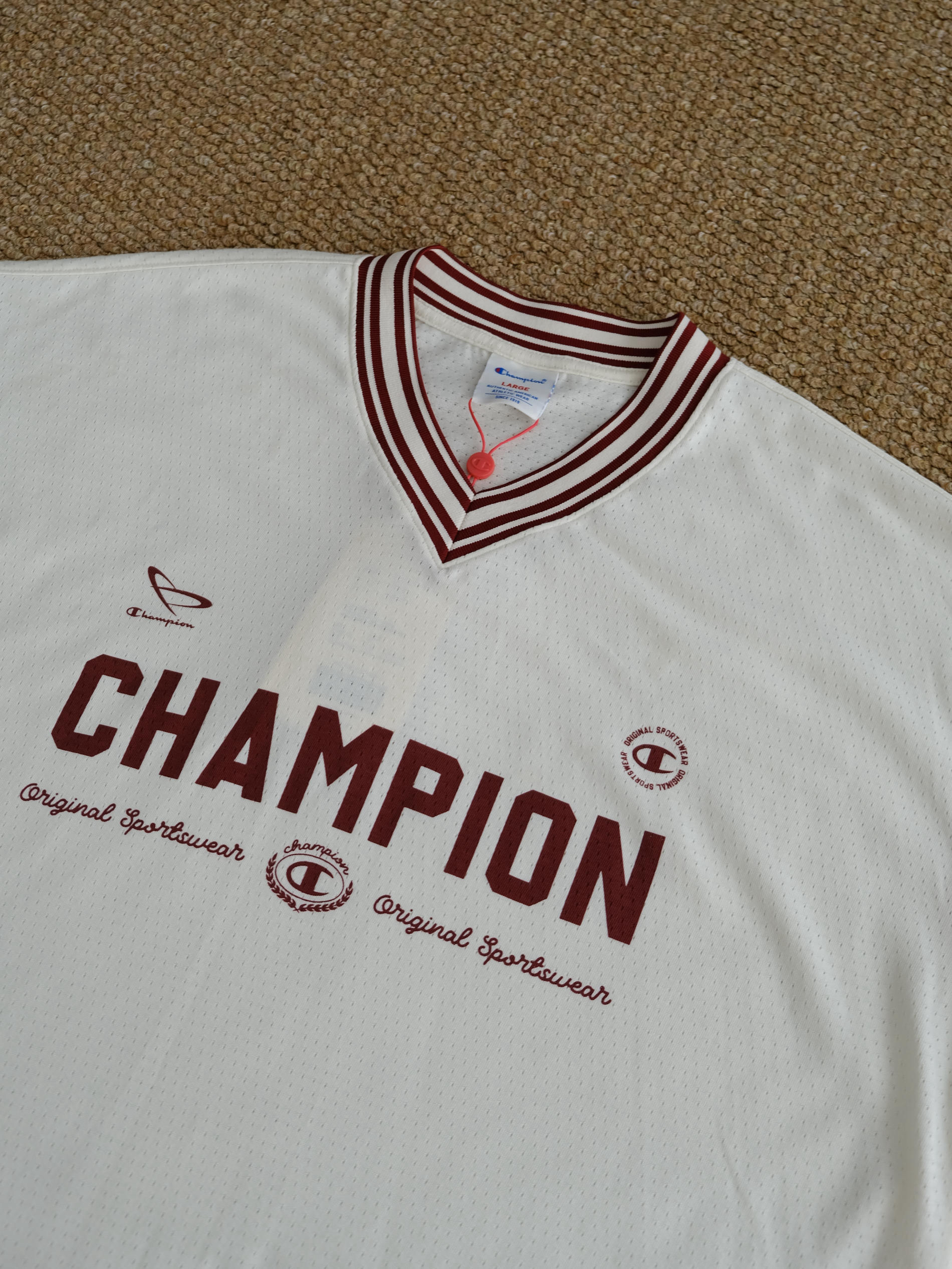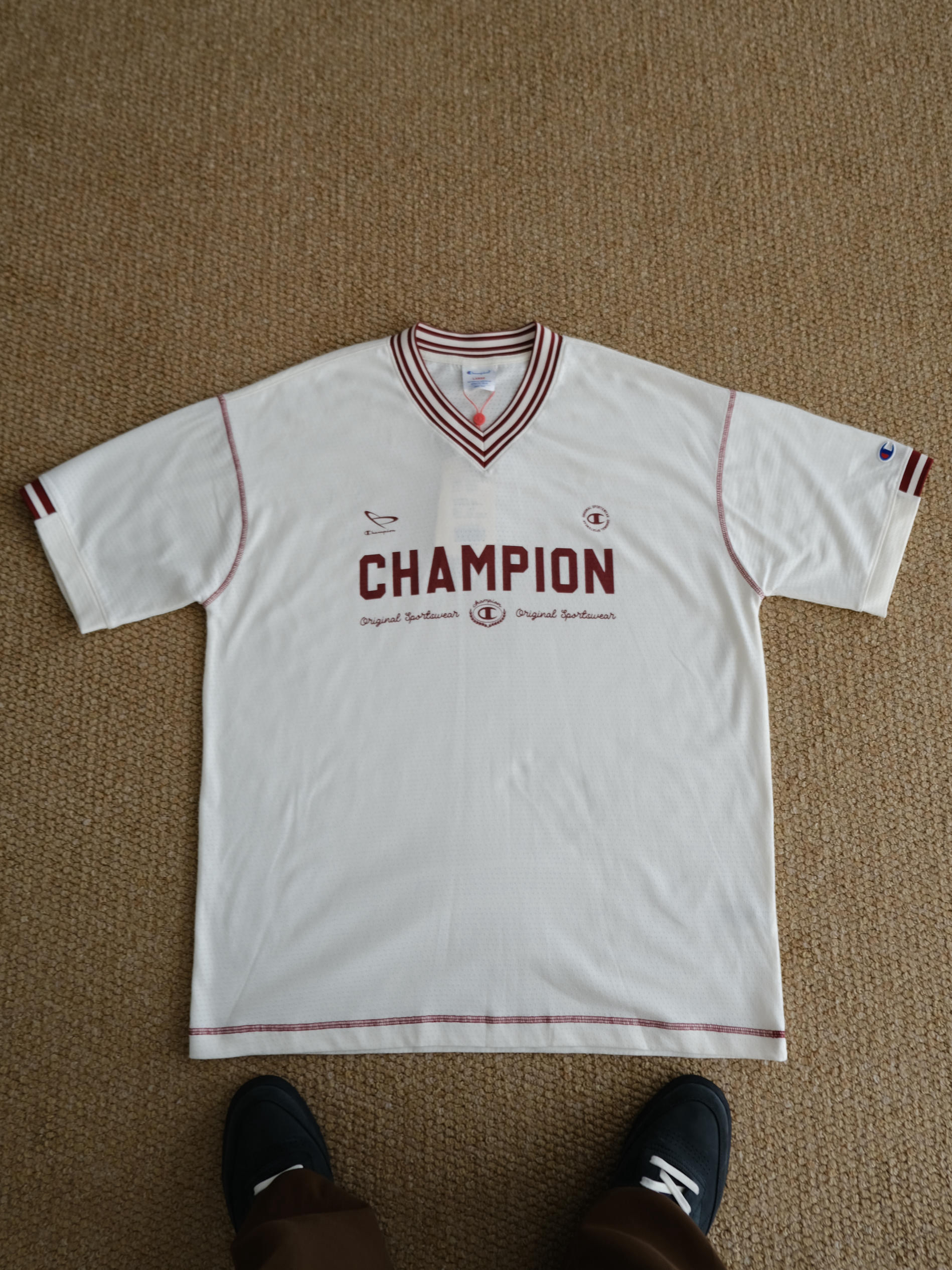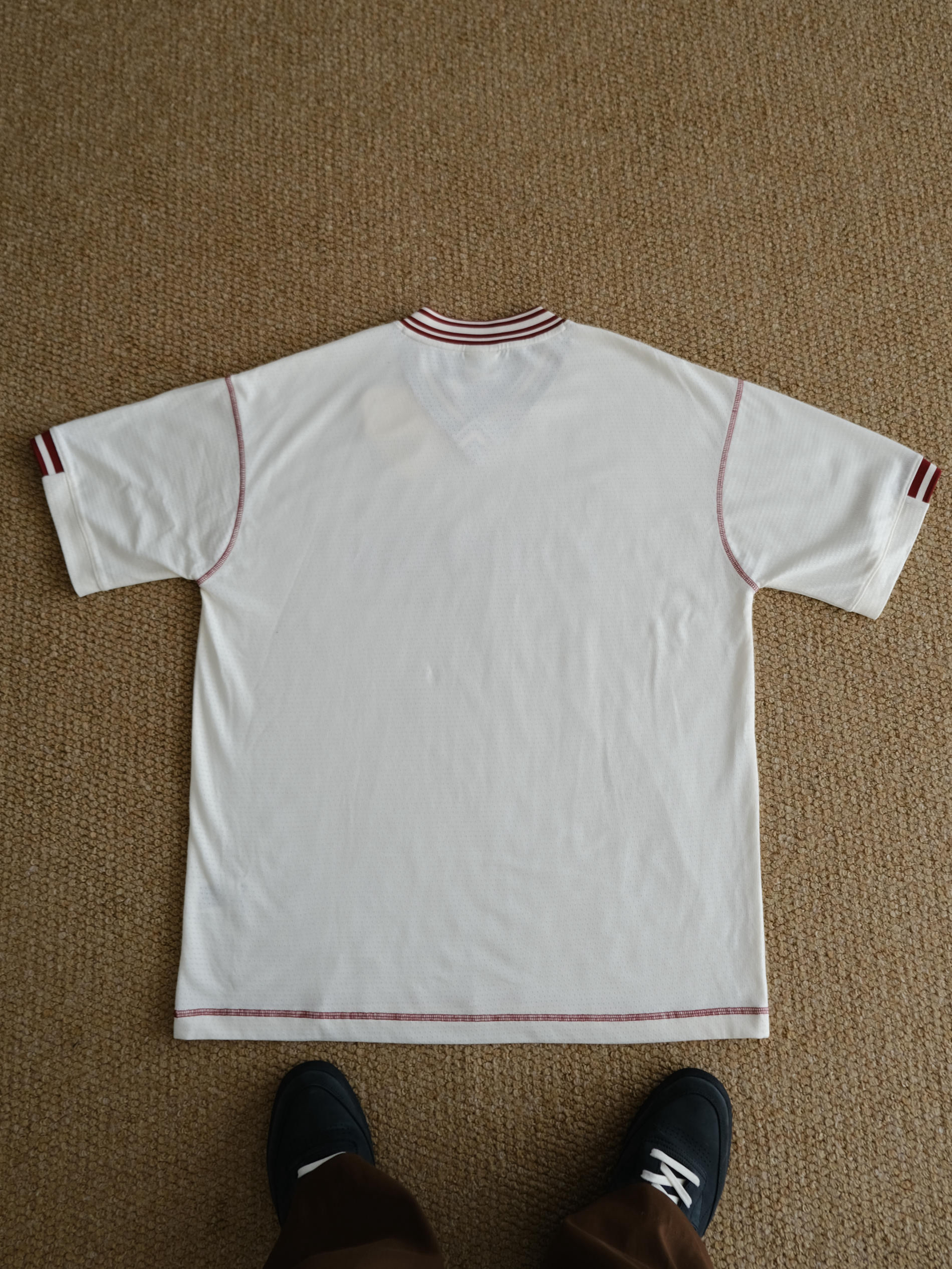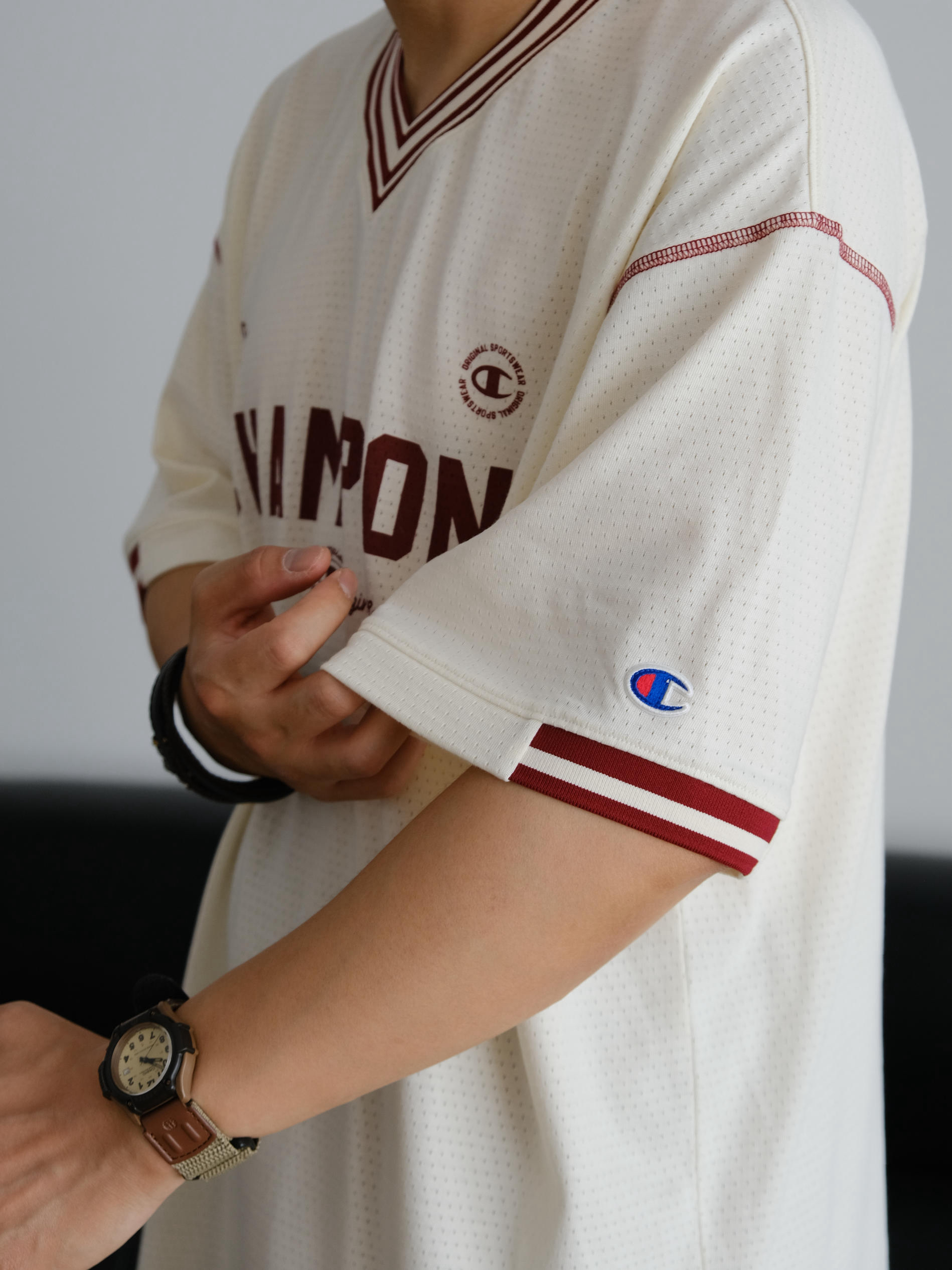 夏天想要凉爽还不失造型 这样的网眼球衣T恤就很合适 宽松落肩的版型巨能藏肉完全不挑身材 整件全部都是透气网眼设计敲适合夏天der 米色作为底色搭配酒红色字母妥妥的美式复古感 经典的V领设计视觉上让颈部看起来更加修长 我身高175cm,体重70kg 这件T恤上身的是L码给大家参考下