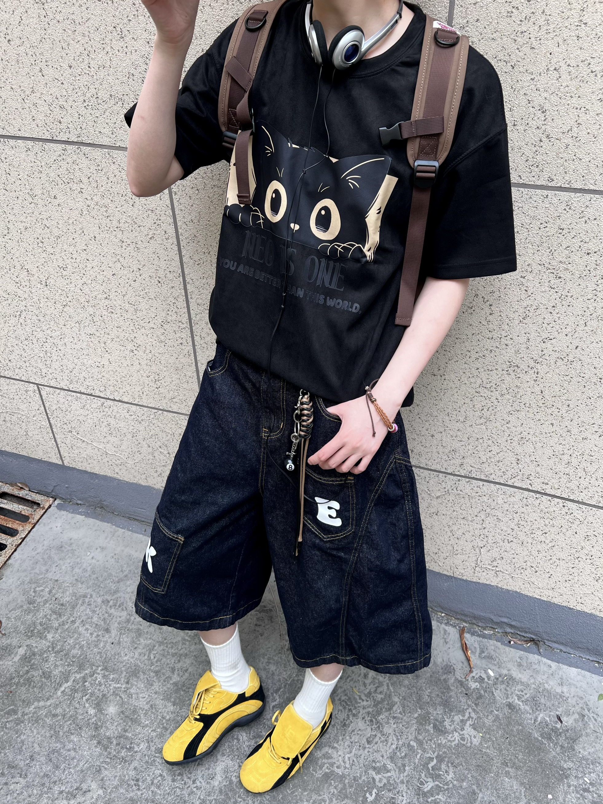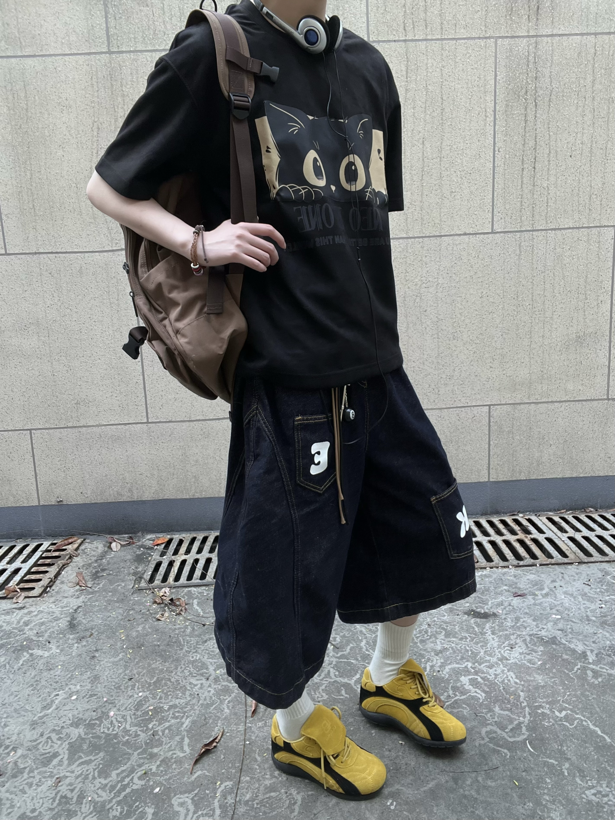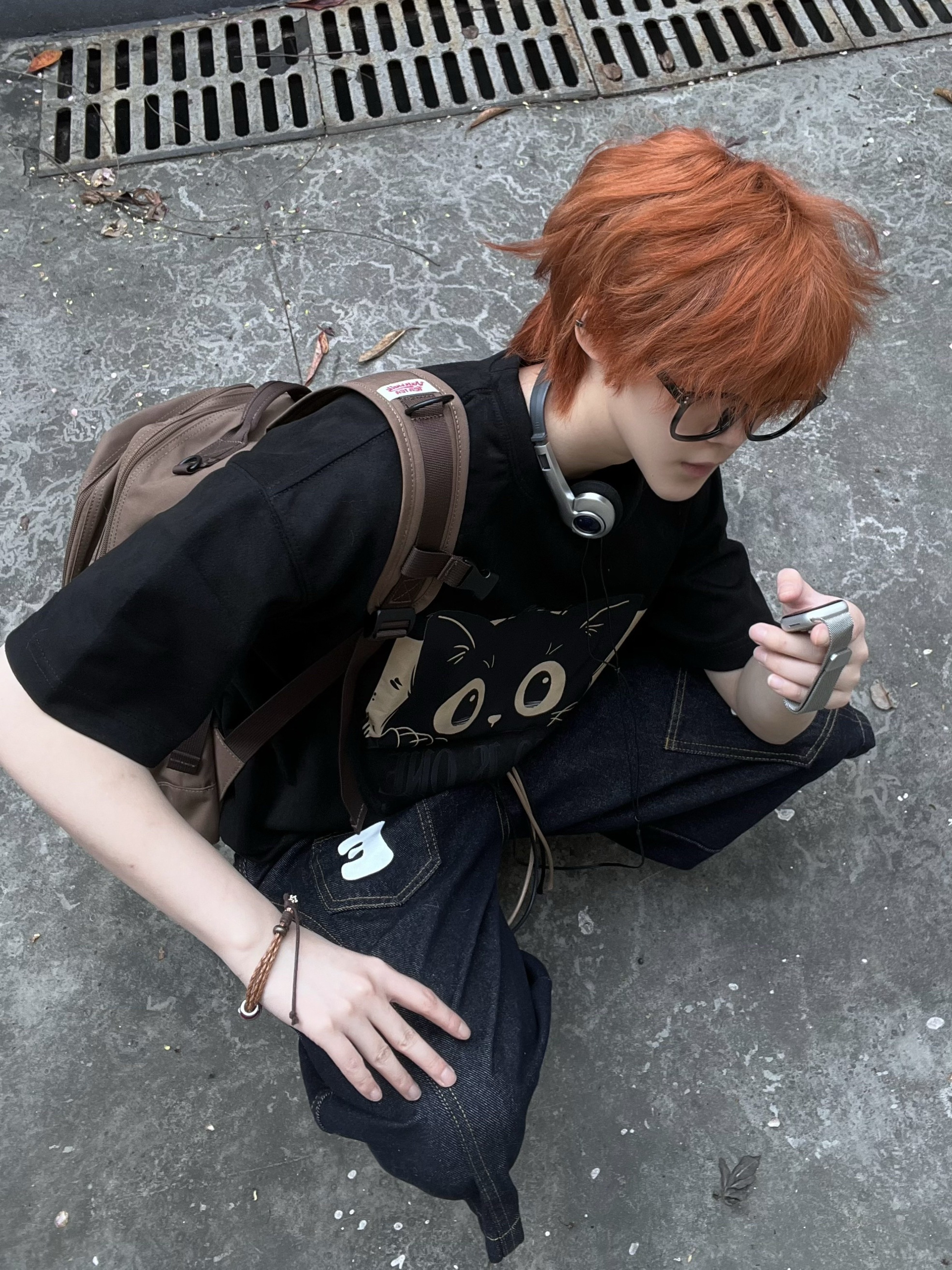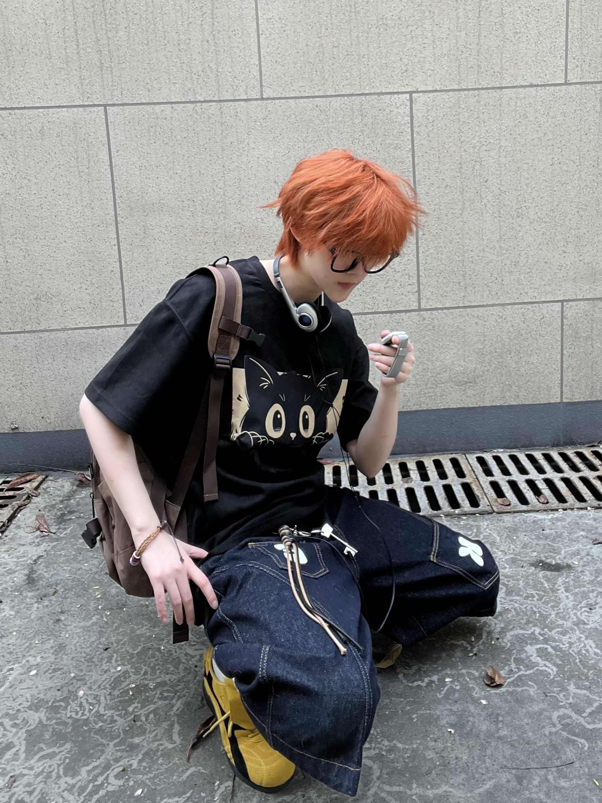 谁懂啊,这套真的把松弛感和少年感焊在身上了! 黑底大眼猫咪T恤软乎乎的,麂皮质感自带慵懒氛围,圆领宽松版型不挑身材,日常穿完全不闷汗。 做旧牛仔七分裤是整套的灵魂!大口袋+字母印花设计感拉满,阔腿版型巨藏肉,梨形身材直接闭眼冲,夏天穿清爽又随性。 姜黄拼黑德训鞋是点睛之笔,复古配色和黑T形成撞色,上脚软乎乎的,暴走一天都不累。 再配上同色系双肩包、复古头戴式耳机,橙发+黑框眼镜,日系少年感...