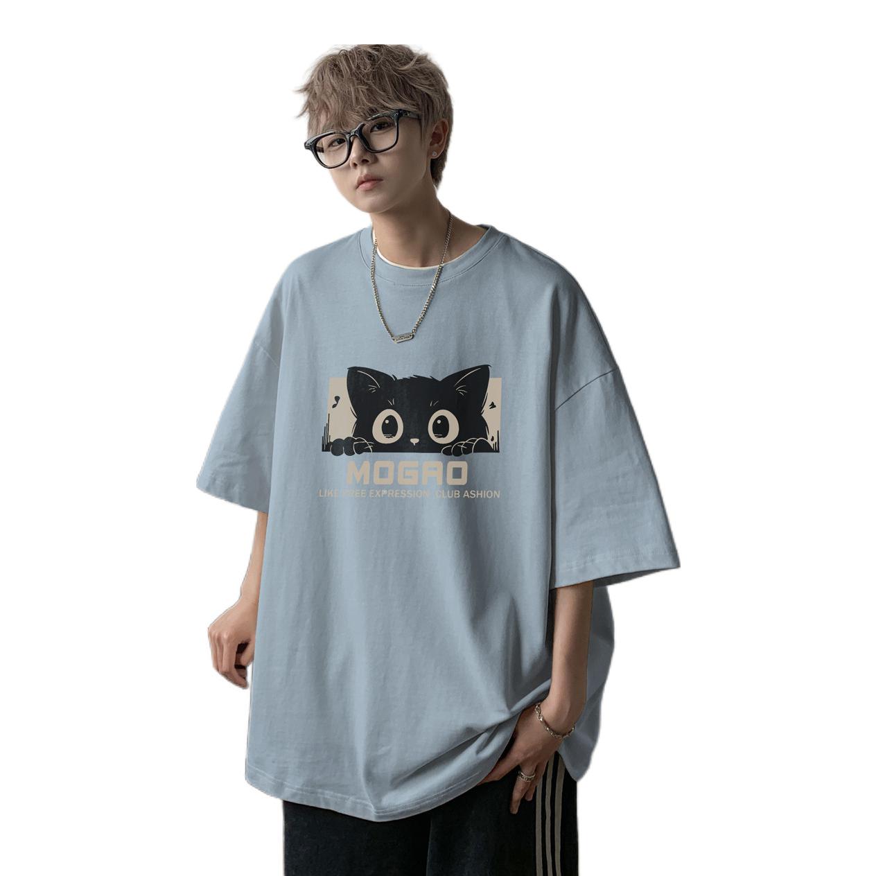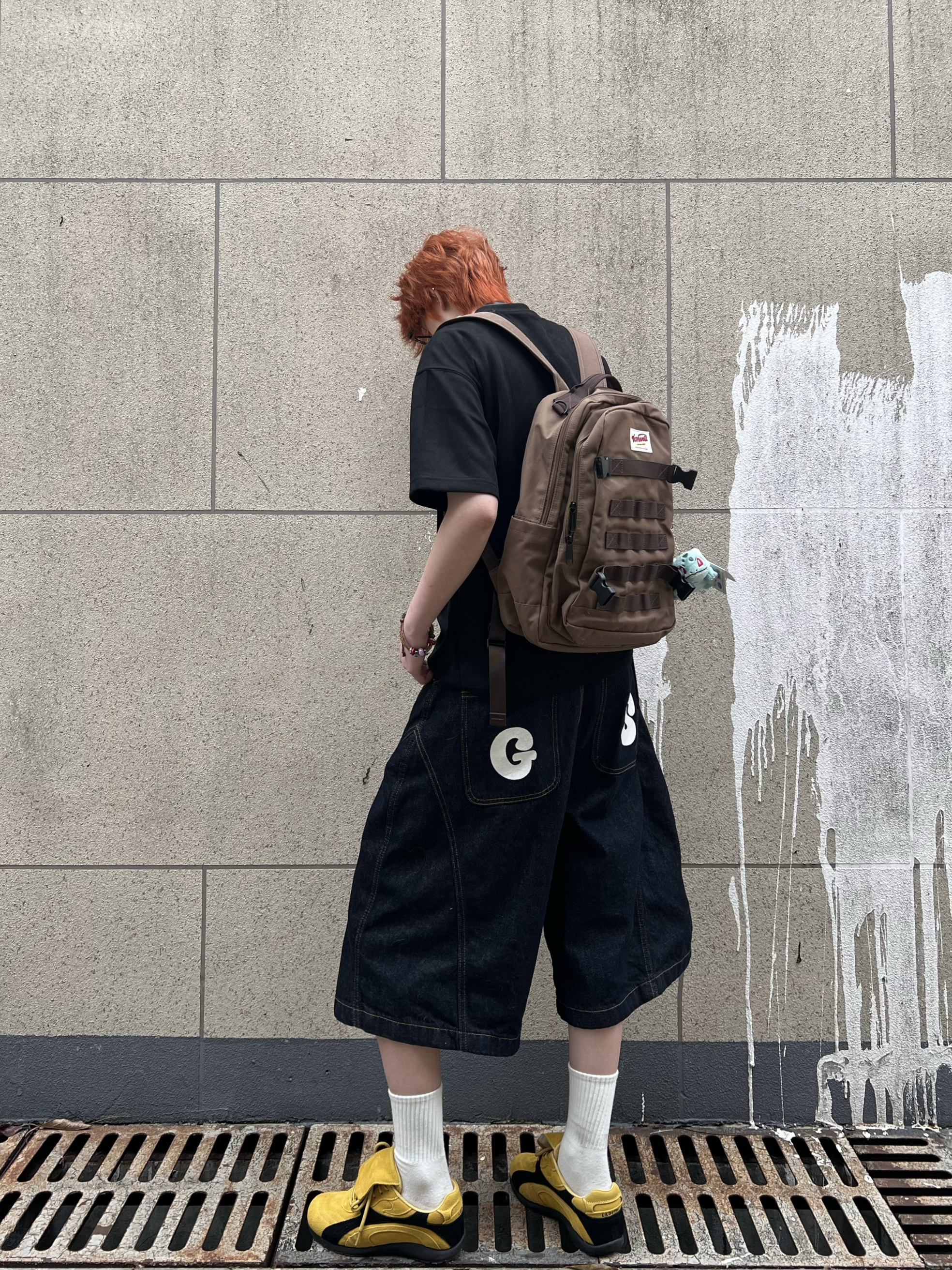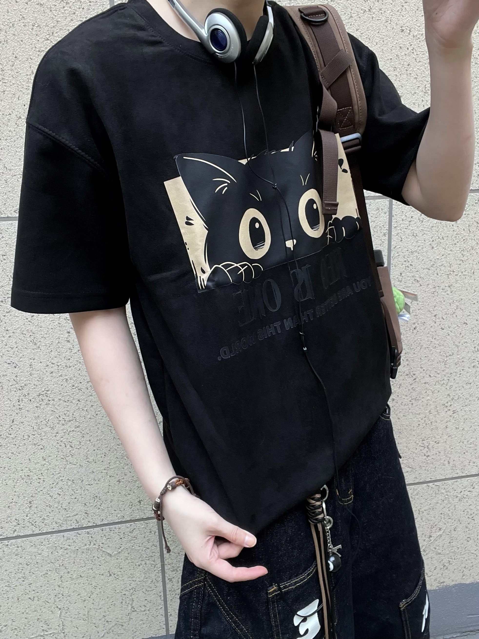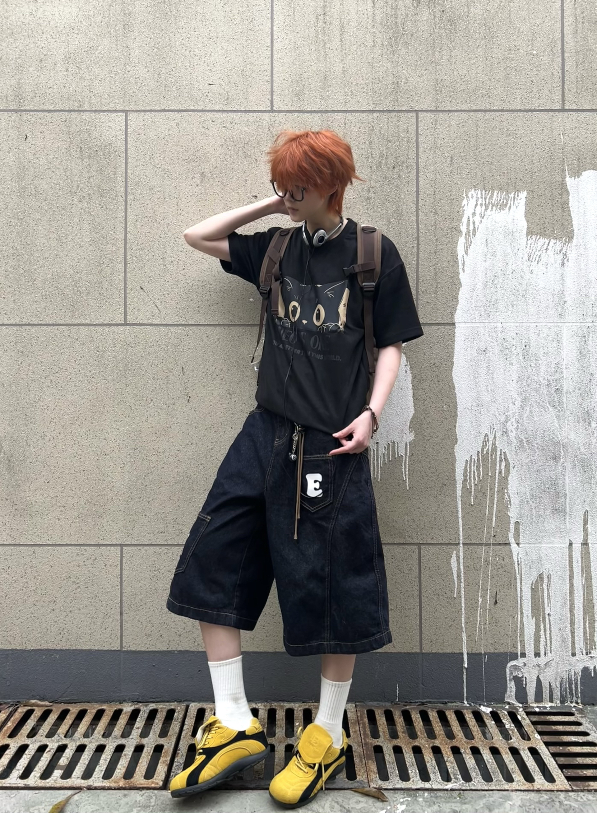 谁懂啊,这套真的把松弛感和少年感焊在身上了! 黑底大眼猫咪T恤软乎乎的,麂皮质感自带慵懒氛围,圆领宽松版型不挑身材,日常穿完全不闷汗。 做旧牛仔七分裤是整套的灵魂!大口袋+字母印花设计感拉满,阔腿版型巨藏肉,梨形身材直接闭眼冲,夏天穿清爽又随性。 姜黄拼黑德训鞋是点睛之笔,复古配色和黑T形成撞色,上脚软乎乎的,暴走一天都不累。 再配上同色系双肩包、复古头戴式耳机,橙发+黑框眼镜,日系少年感...