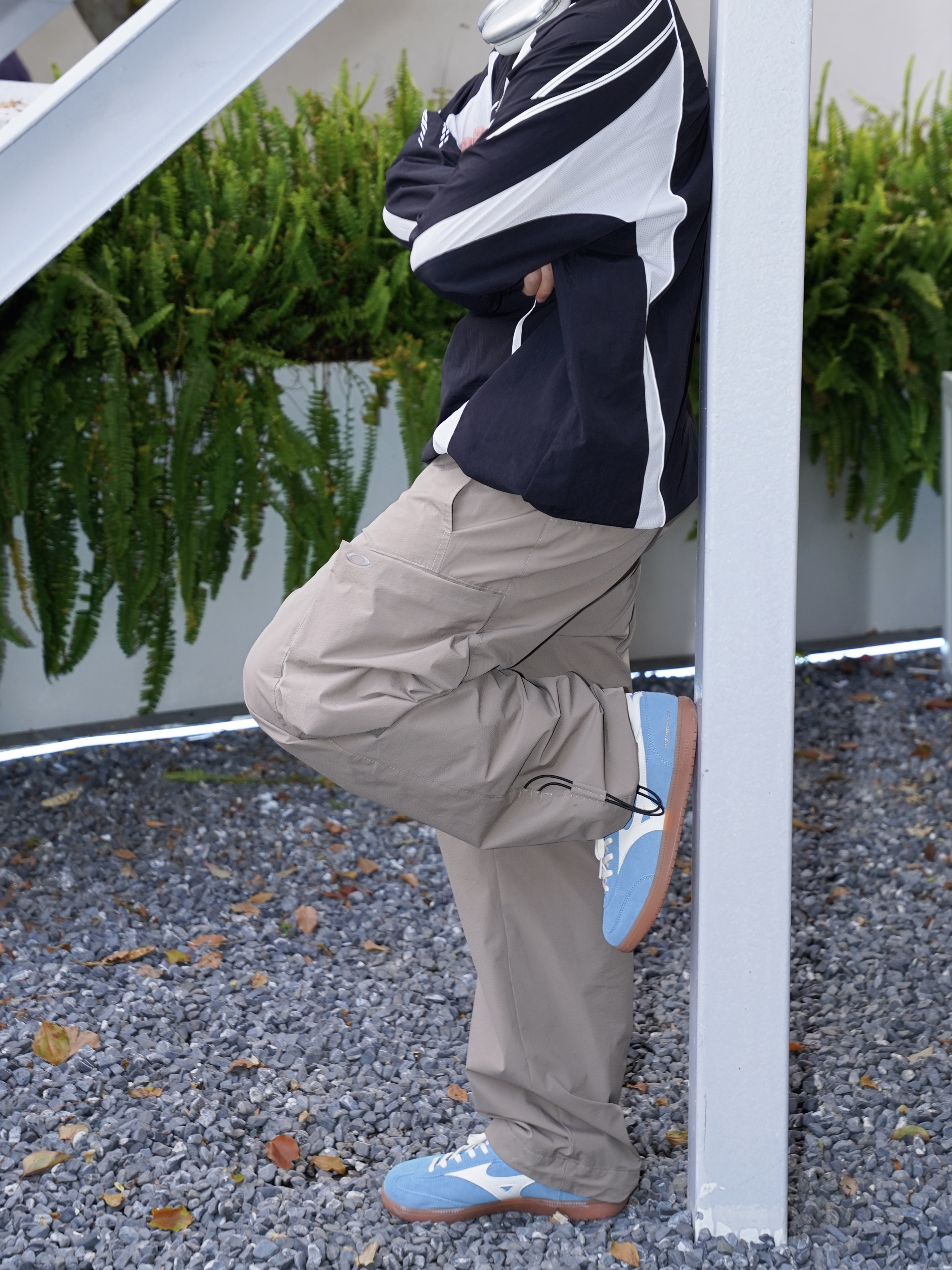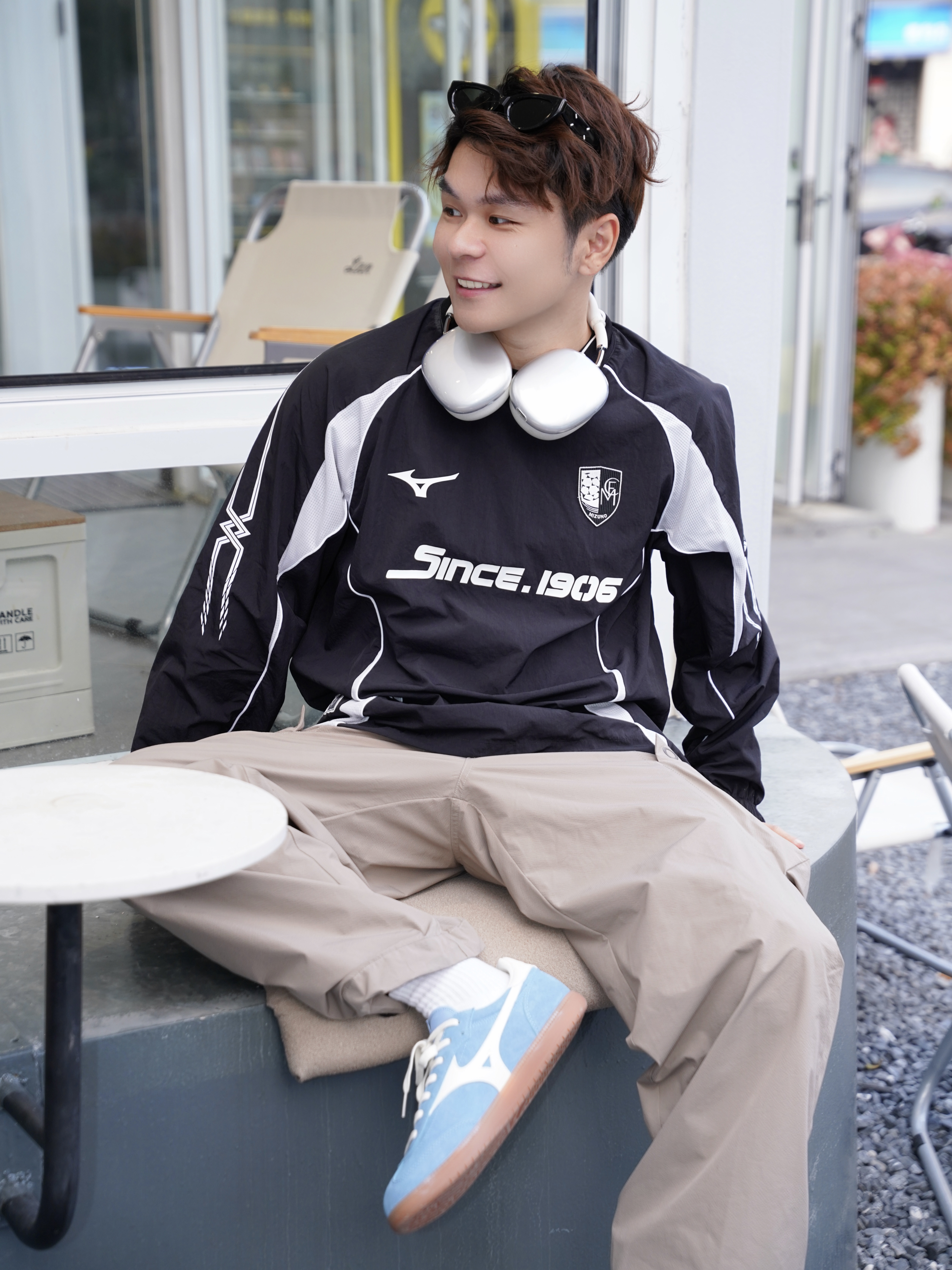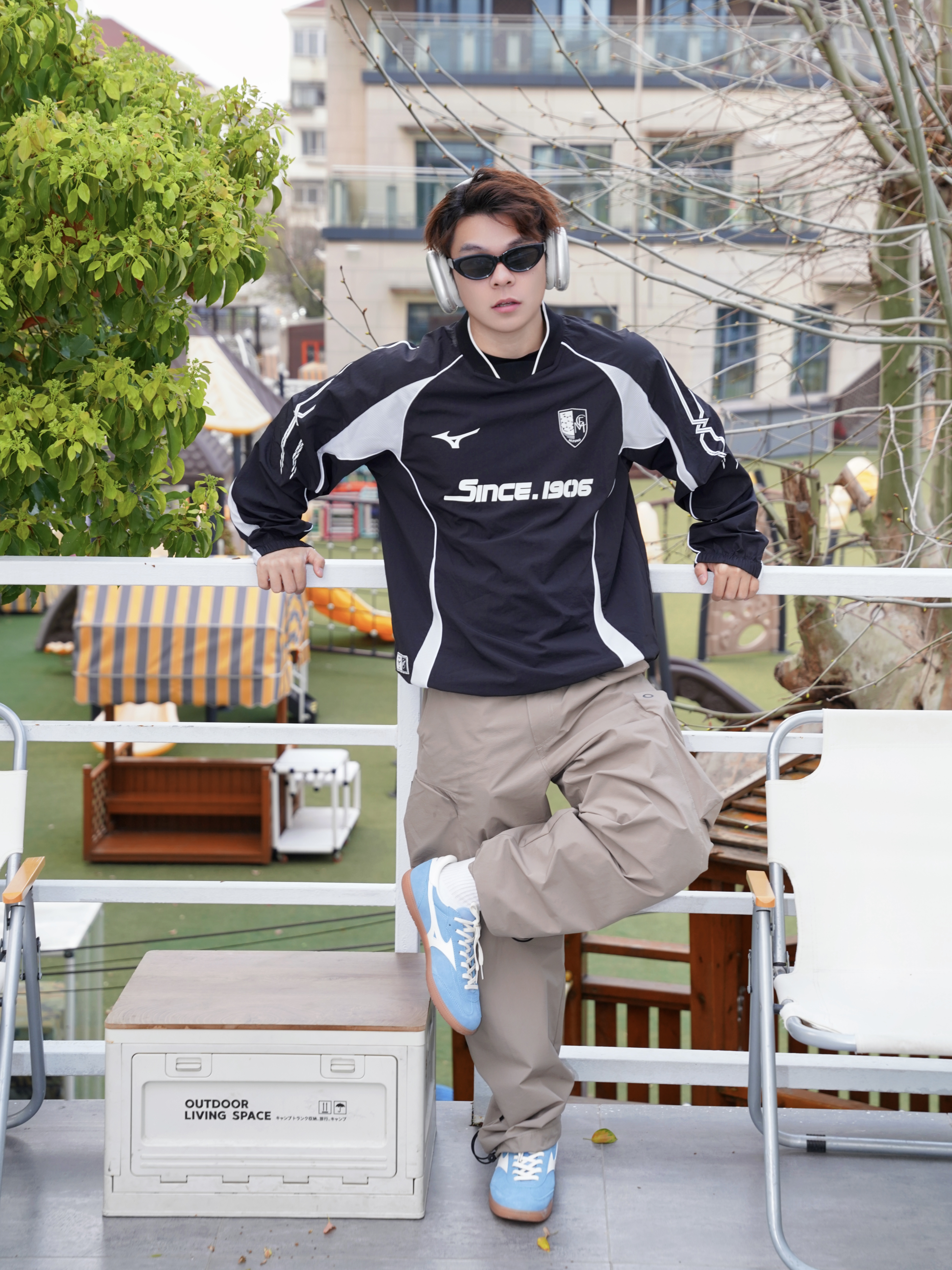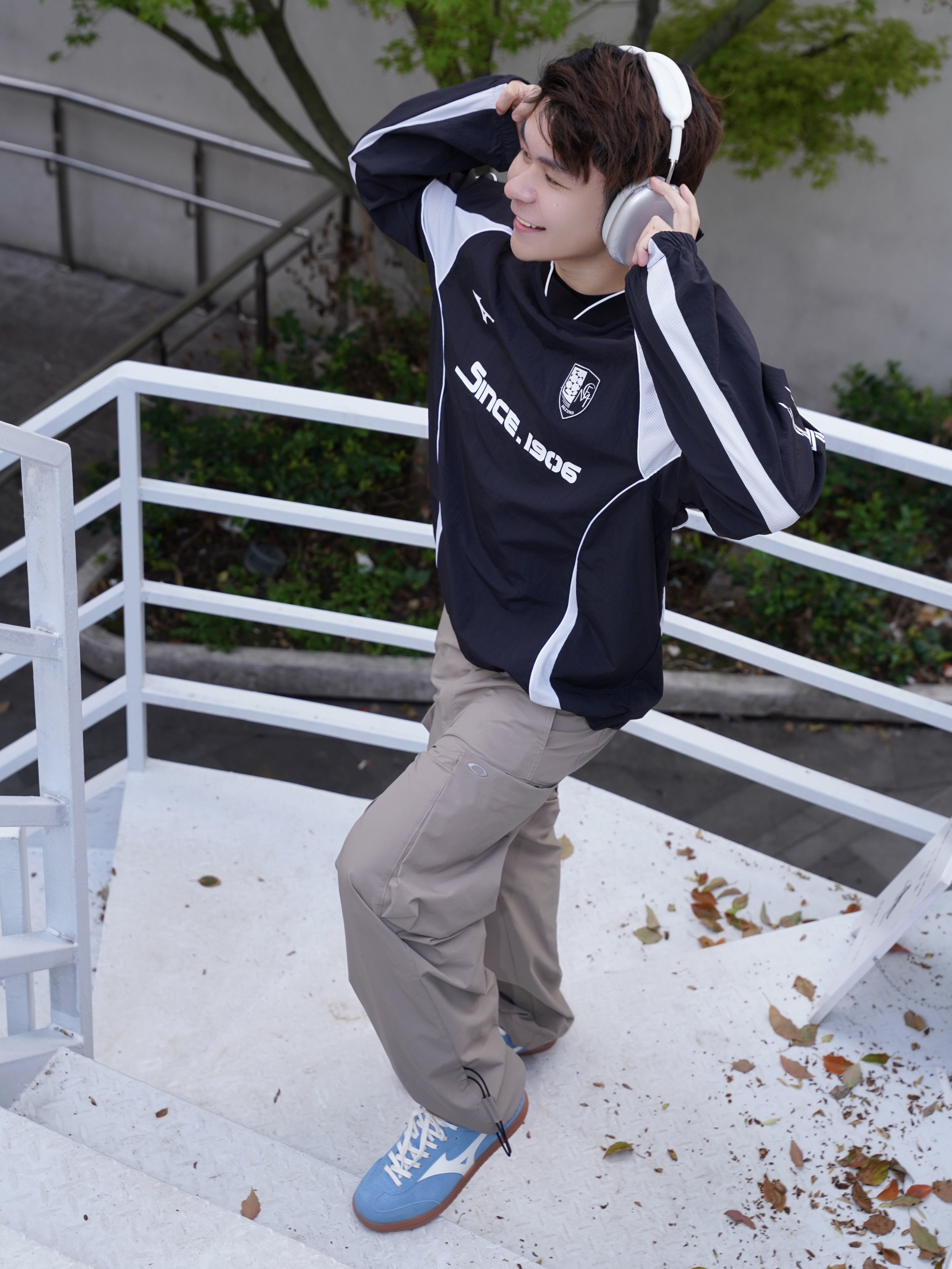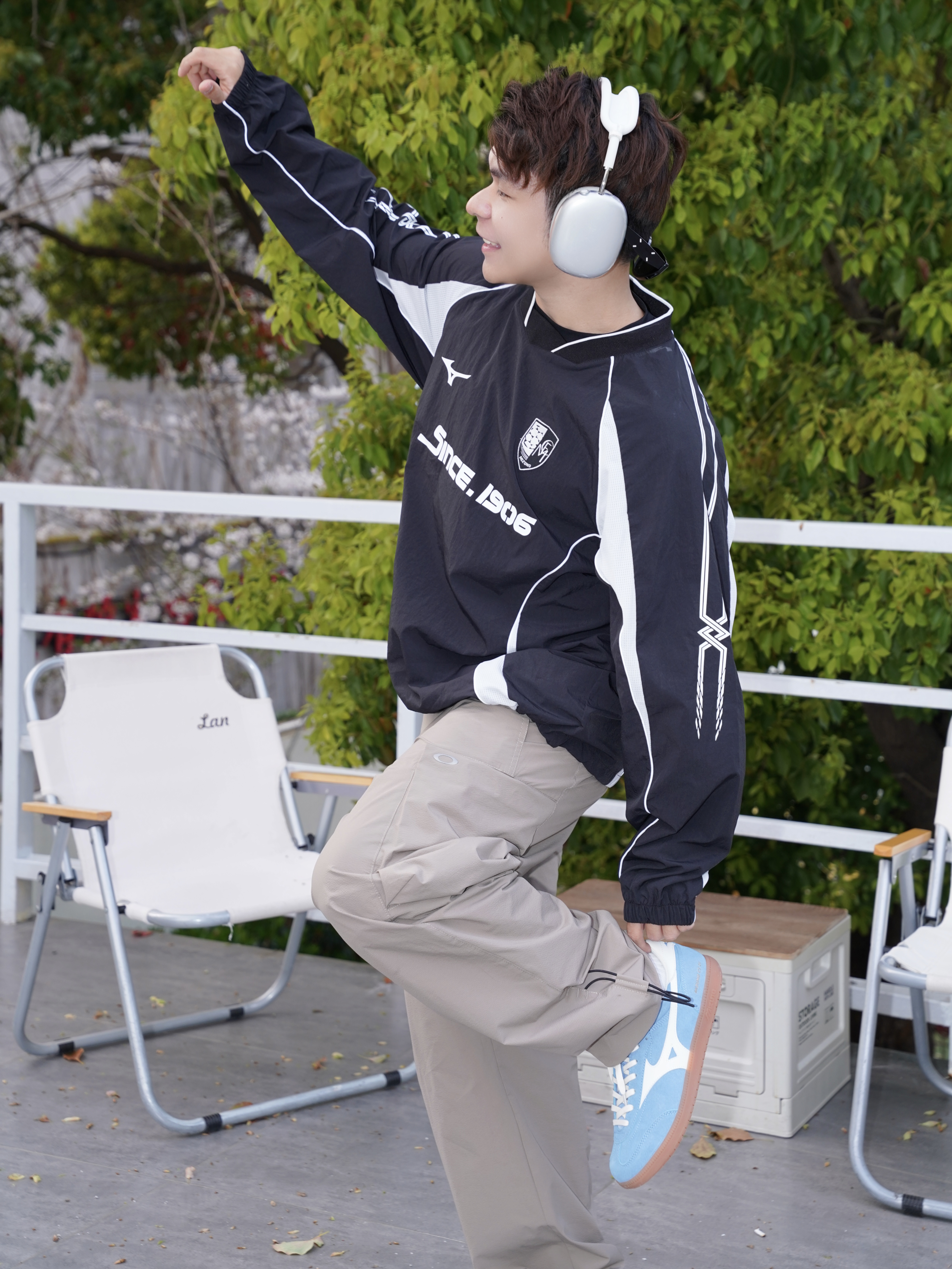 - 初春的太阳晒得人懒洋洋,套上这件黑色Mizuno插肩T。棉料软软的,领口刚好露出锁骨,足球风的小翻领显得肩膀很挺。 - 裤子随便搭条卡其裤,脚上那双雾霾蓝CT 01薄底鞋,橡胶底柔软又很好看。走起路来鞋底又轻又贴脚,跑两步追公交都不带响的。朋友说看着像从日杂走出来的少年,干干净净,风吹过来时衣服鼓成舒服的弧度。