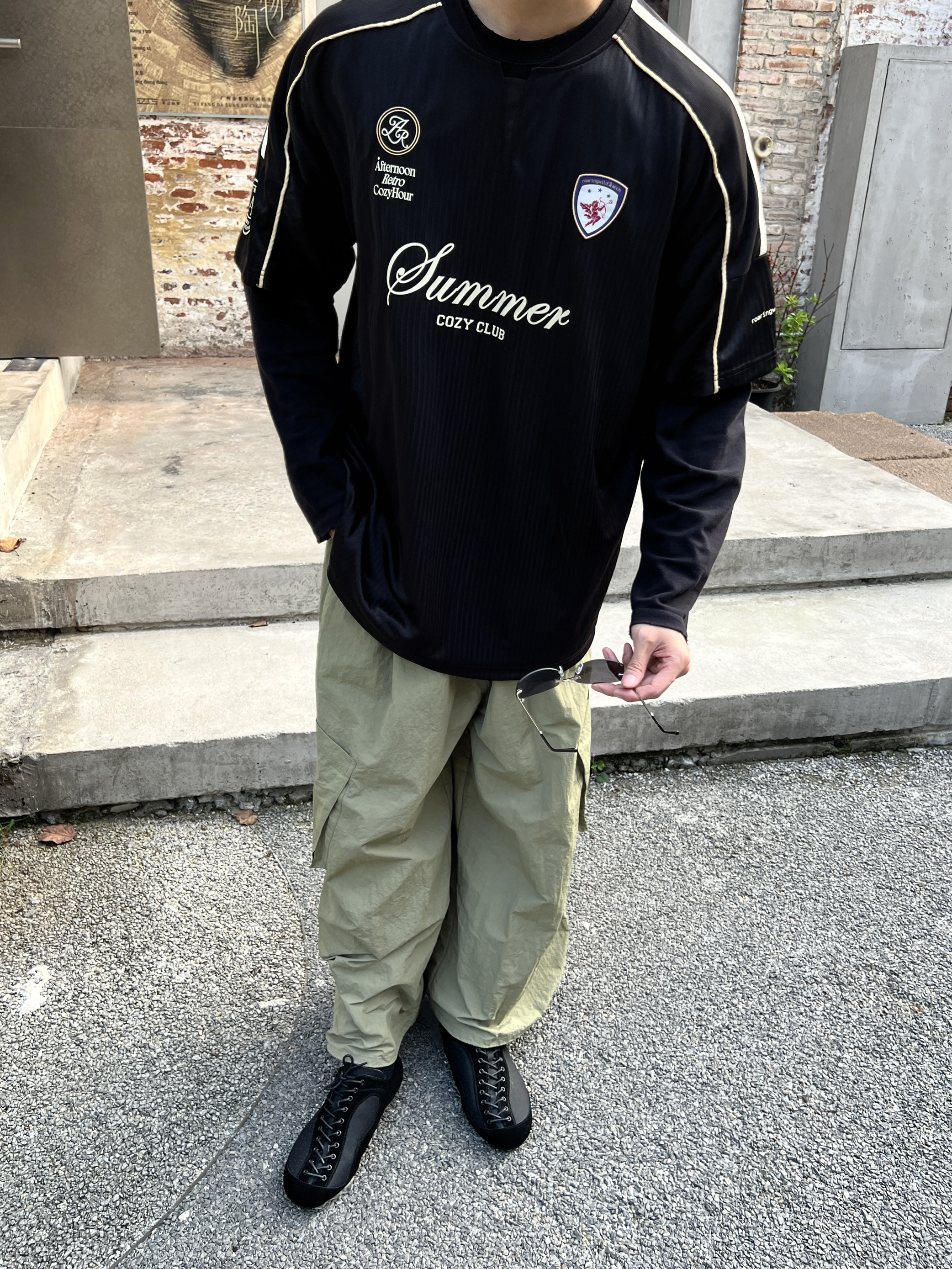今天约会的不是公主👸🏼 是酷拽的模特队学姐hhhh🖤 夏天到了 最近开始尝试不同风格 这次是黑灰配色cp🖤🩶 赛车风格➕扩脱裤很显身材 👕/👖ROARINGWILD 速干圆领赛车T恤/宽松伞兵阔腿裤 👟TYPELOOK牛皮薄底德训鞋