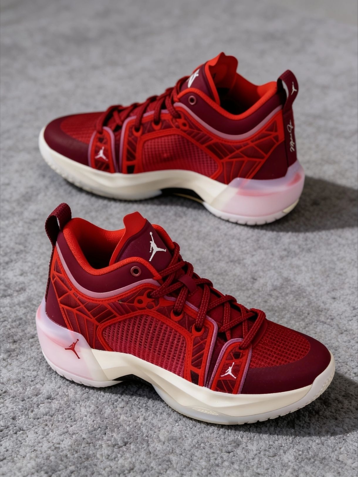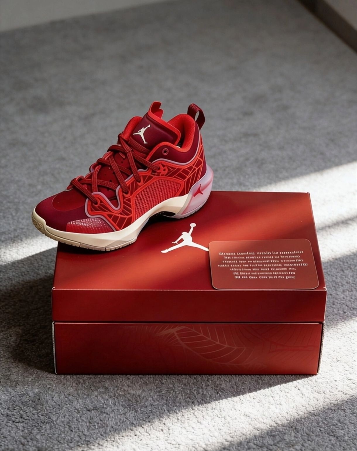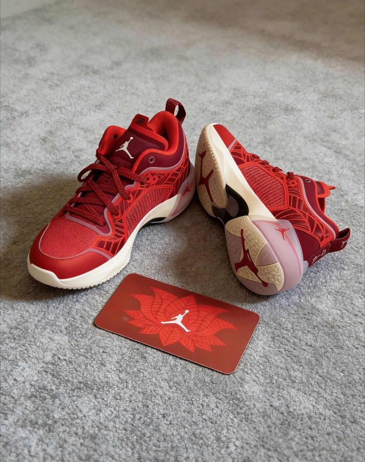终于在得物蹲到这双AJ37 Low团队红了!实物比图片还绝,正红配色配米白中底,半透明水晶外底还带点渐变质感,鞋盒卡片的莲花细节直接把仪式感拉满,收藏党真的顶不住!