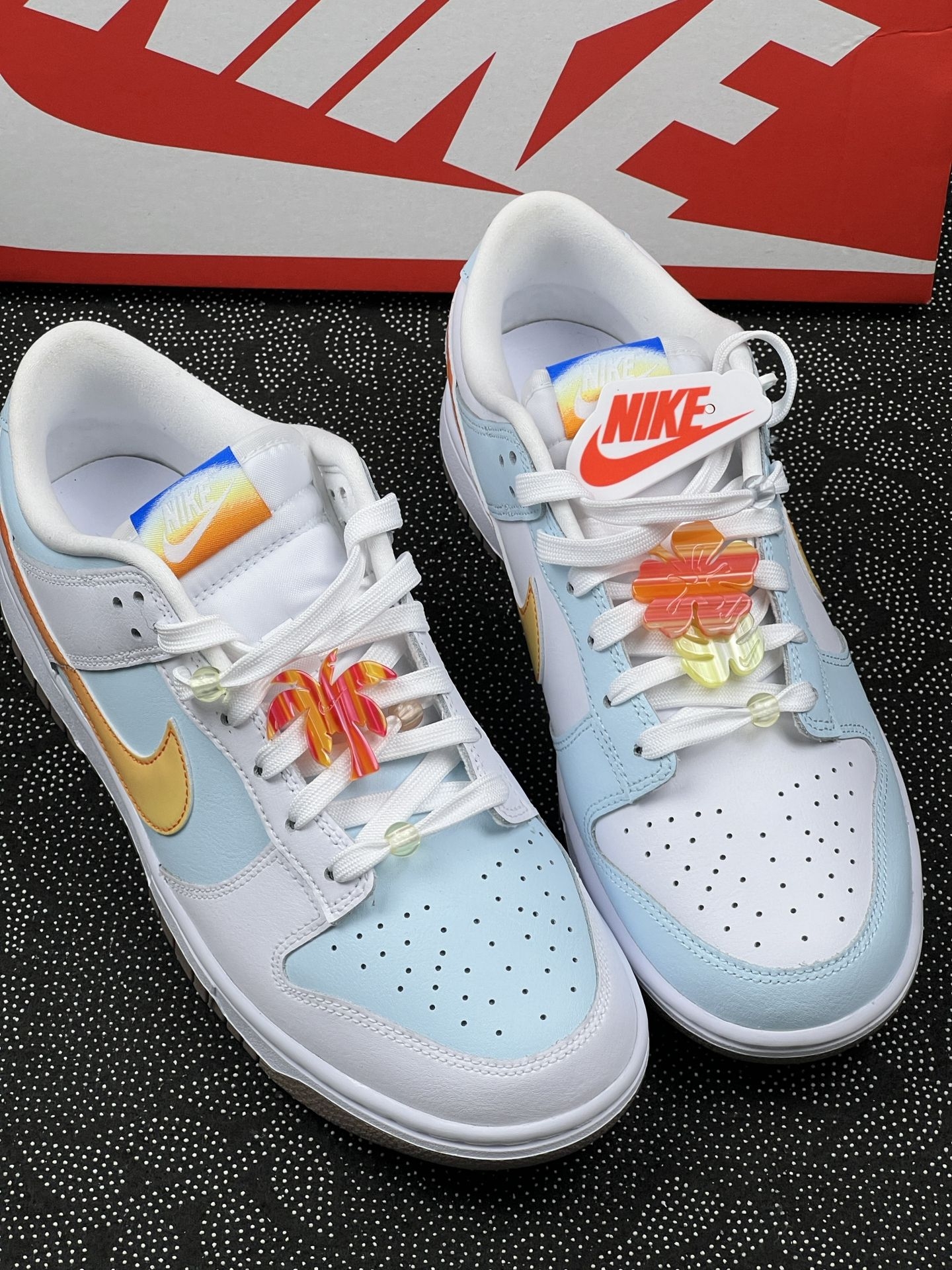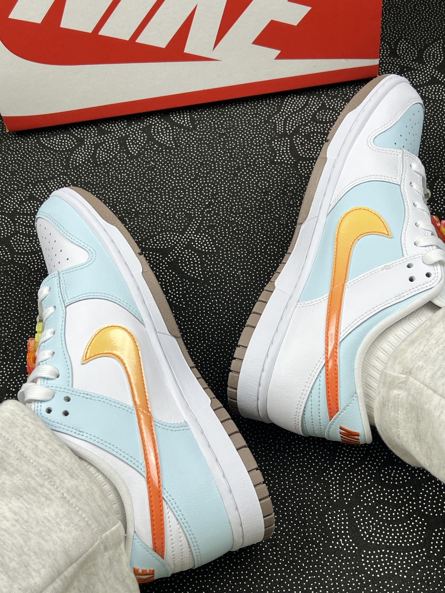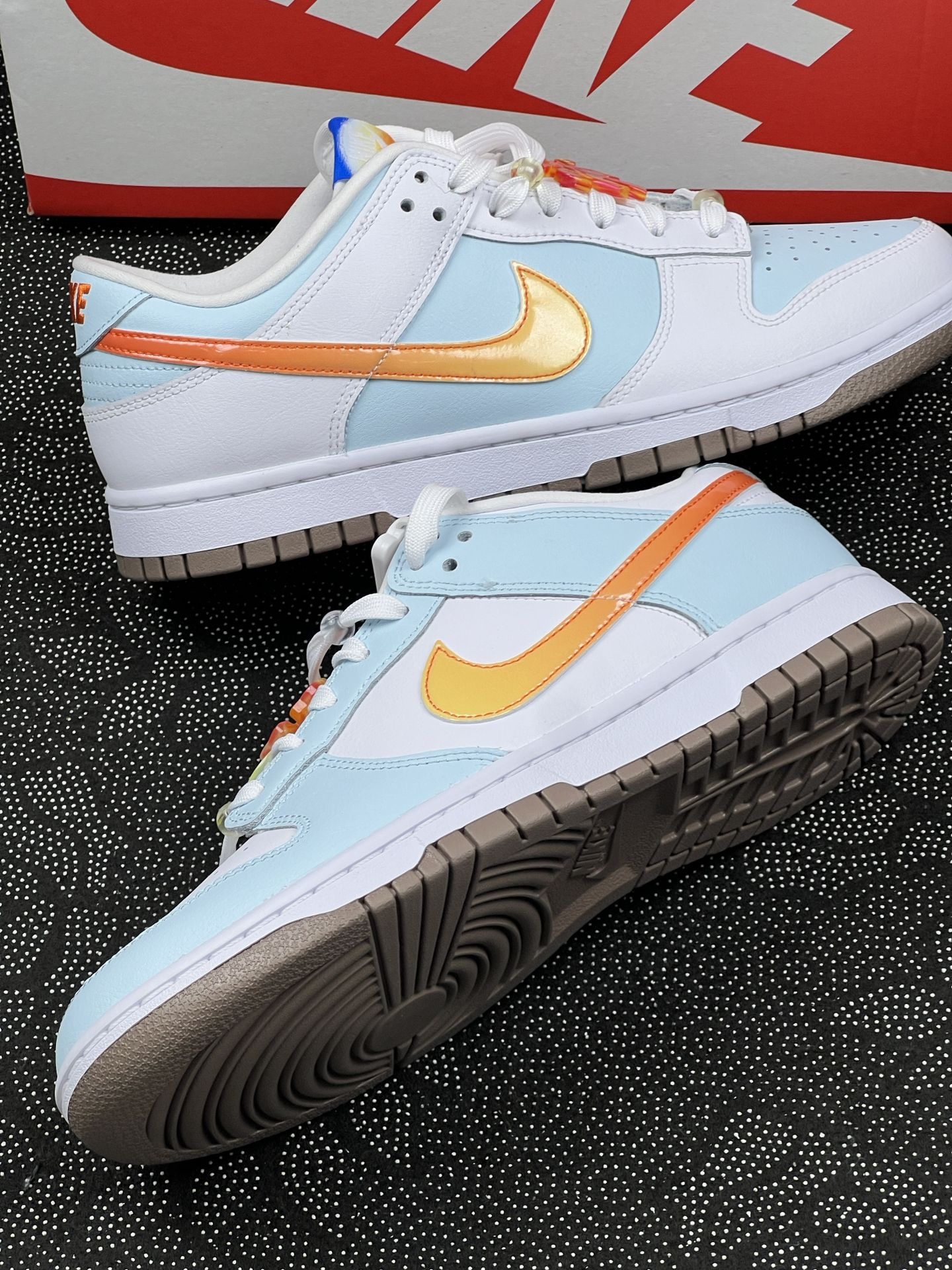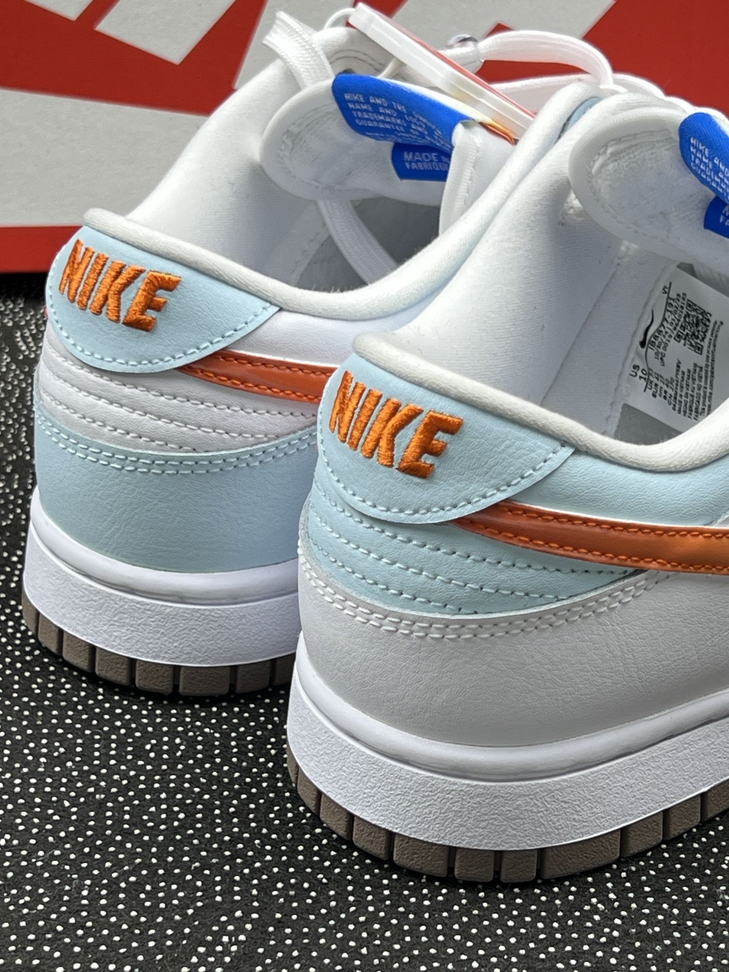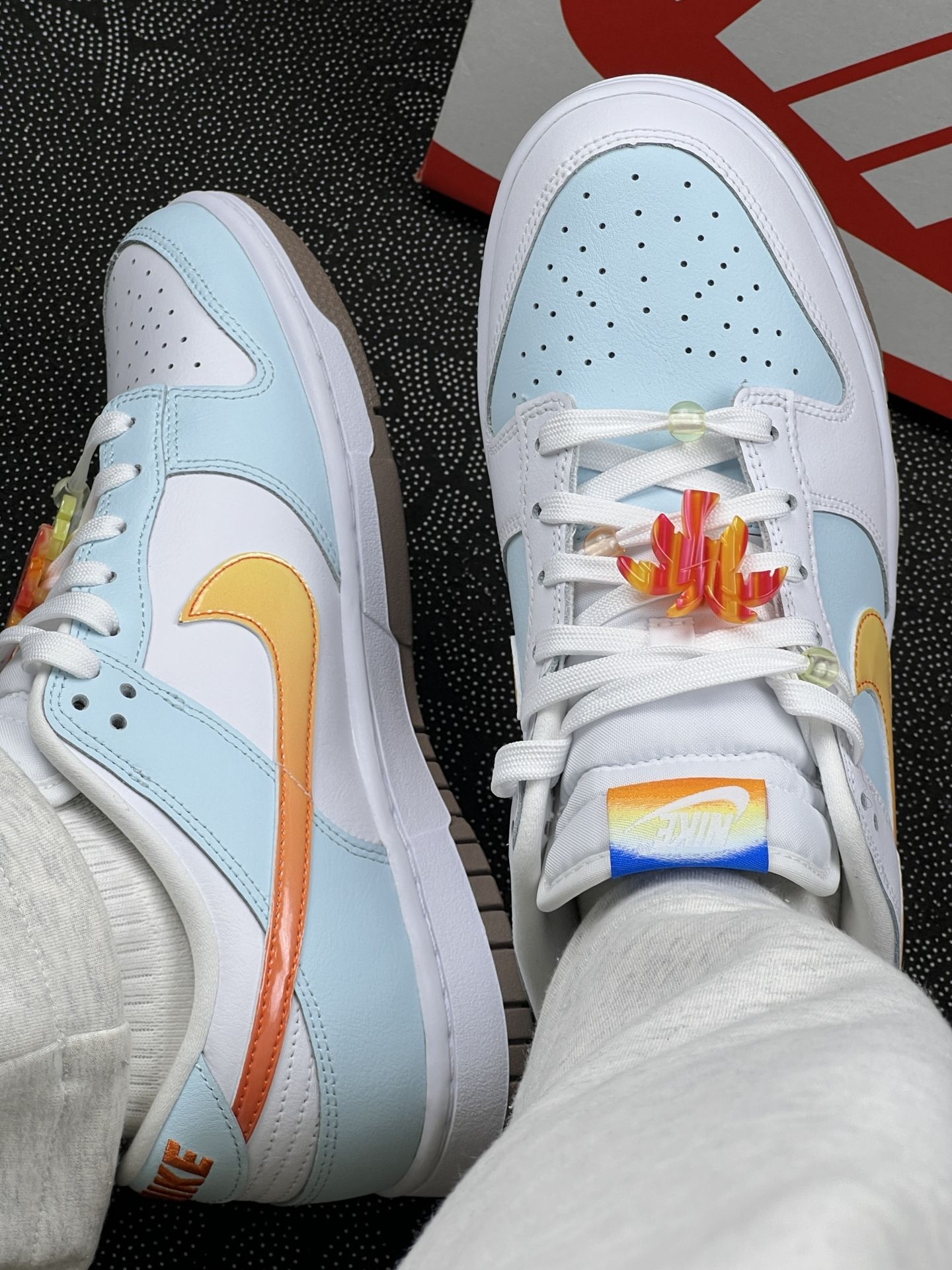 Nike Dunk Low 到手体验|配色能打,但这些缺点得说⚠️|||刚到手这双 Nike Dunk Low,配色是清新的白蓝橙🍊 实物颜值确实在线,浅蓝和白色搭配很清爽,橙色调勾子和鞋尾点缀得刚好,夏天穿看上去很清新,无论搭牛仔裤还是工装裤,甜甜的风格或者酷酷的风格都能无脑搭配,鞋上小配饰也有点小俏皮🤪很为穿搭加分~ 上脚试了试,脚感是属于比较适中的,日常走路、逛街不会觉得累,但要是追求软弹...