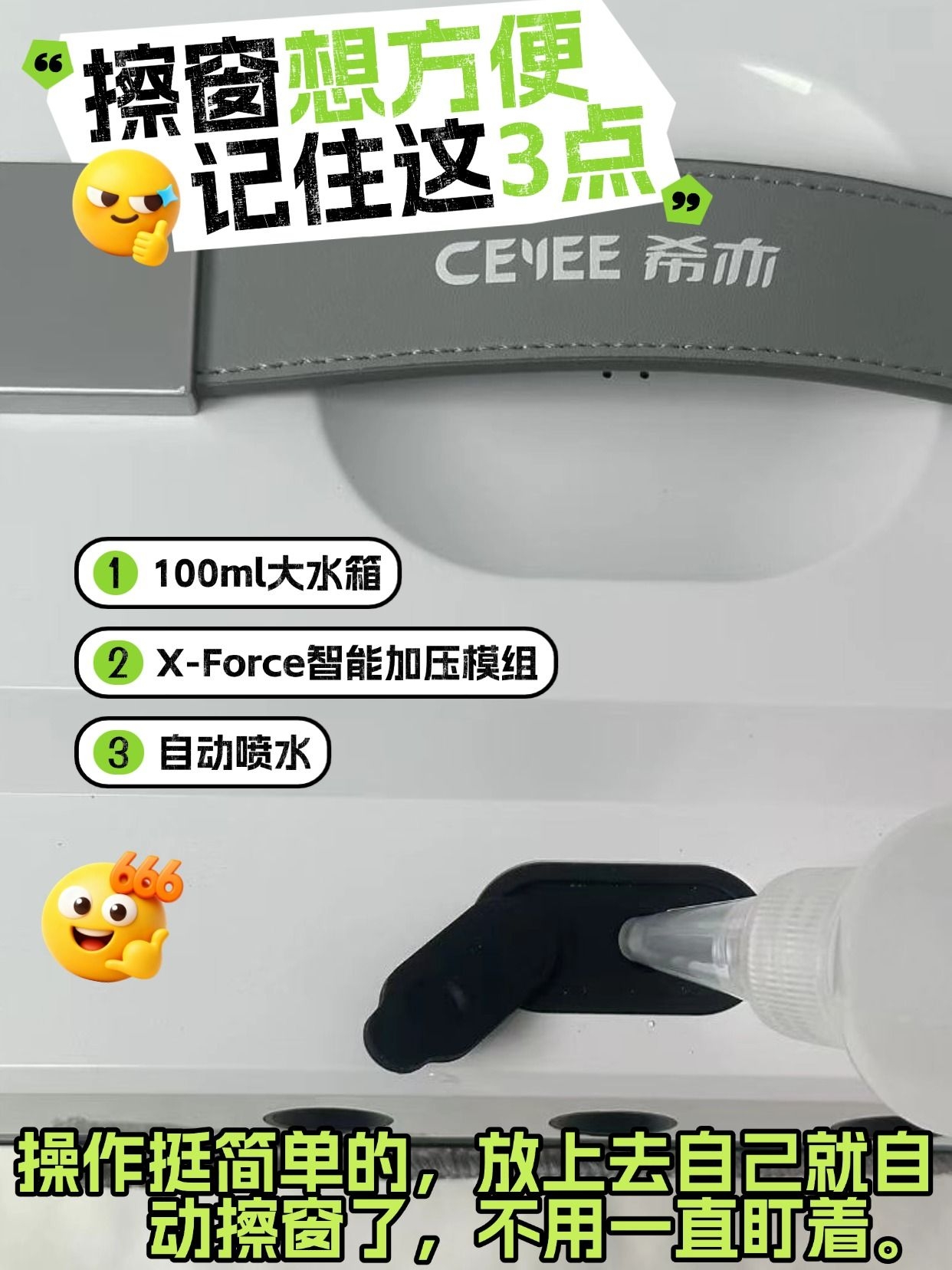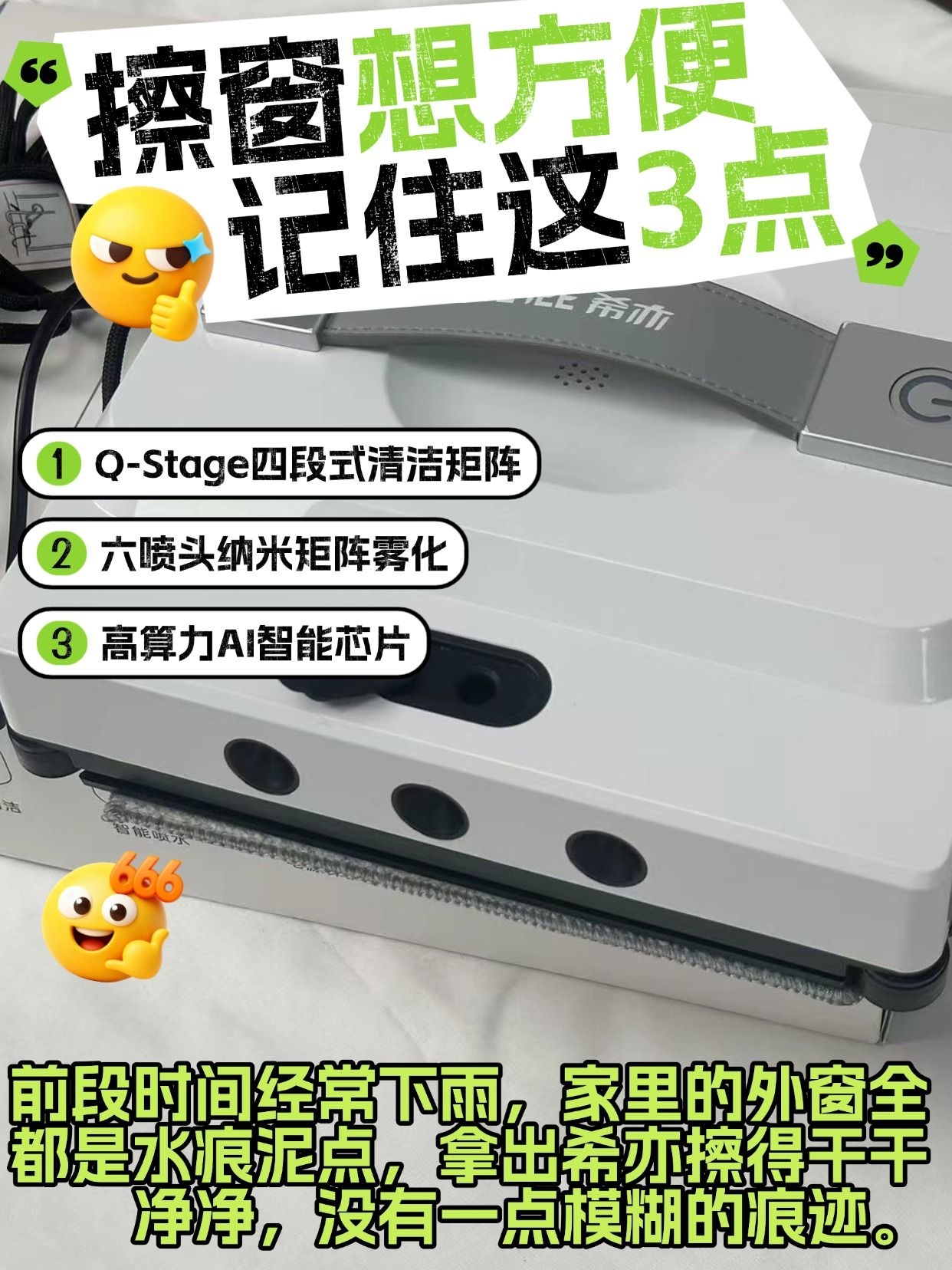 擦玻璃最窒息的不是累,是擦完没多久就返脏!刚擦干净的玻璃,隔天就落满浮灰,甚至还会析出水垢印, 尤其是阴雨天,擦完直接返潮起雾,白忙活一场,反复擦反复脏,真的越擦越无力,直到入了希亦W1擦窗机器人,才算跳出循环! 希亦W1真的精准戳中我的痛点!再也不用弯腰踮脚、费劲擦玻璃,一键启动就能全自动工作,我瘫在沙发上刷手机,它就把玻璃擦得干干净净。 六喷头纳米雾化喷水,细腻不飞溅,不会弄湿窗台和地板...