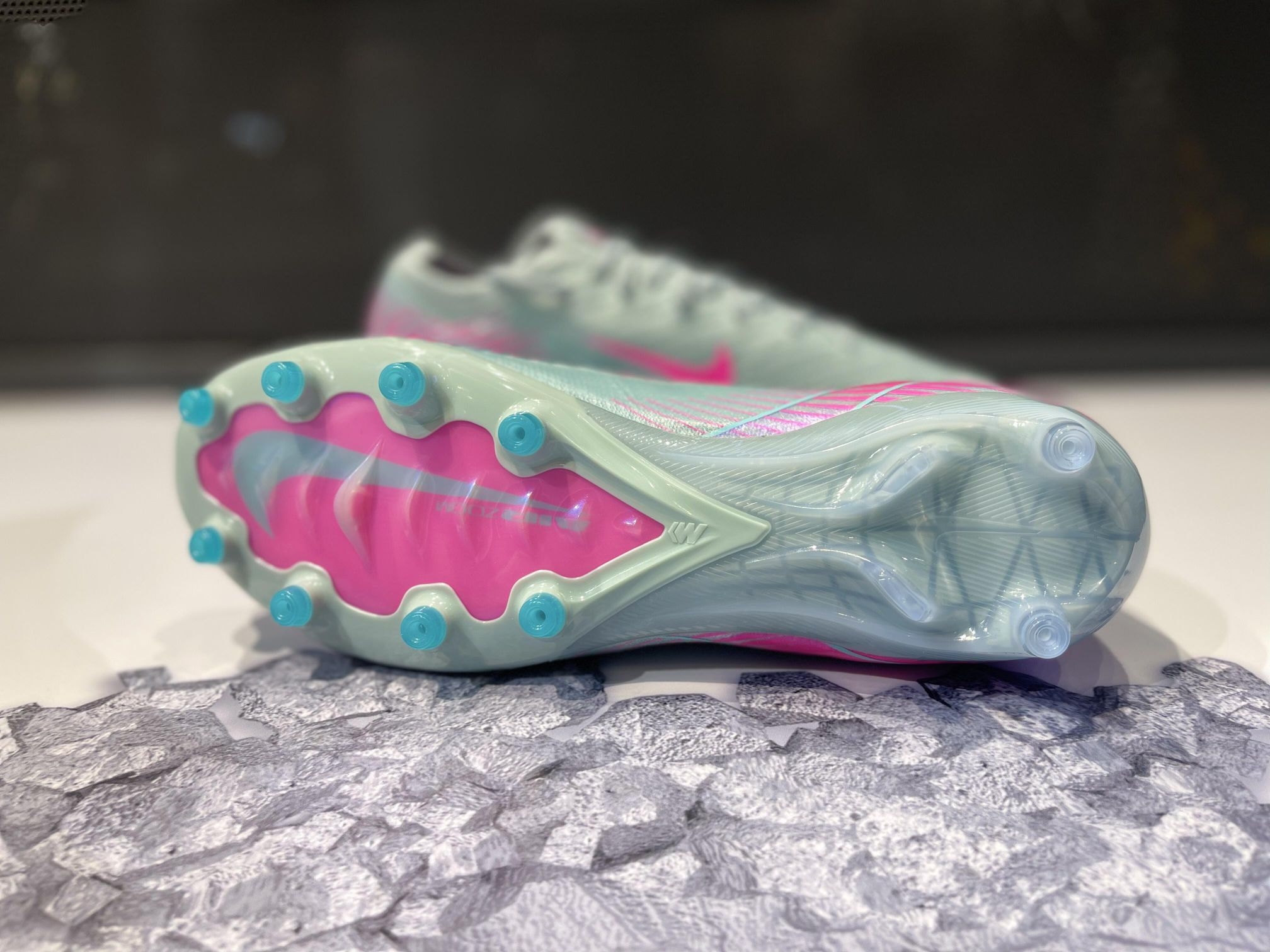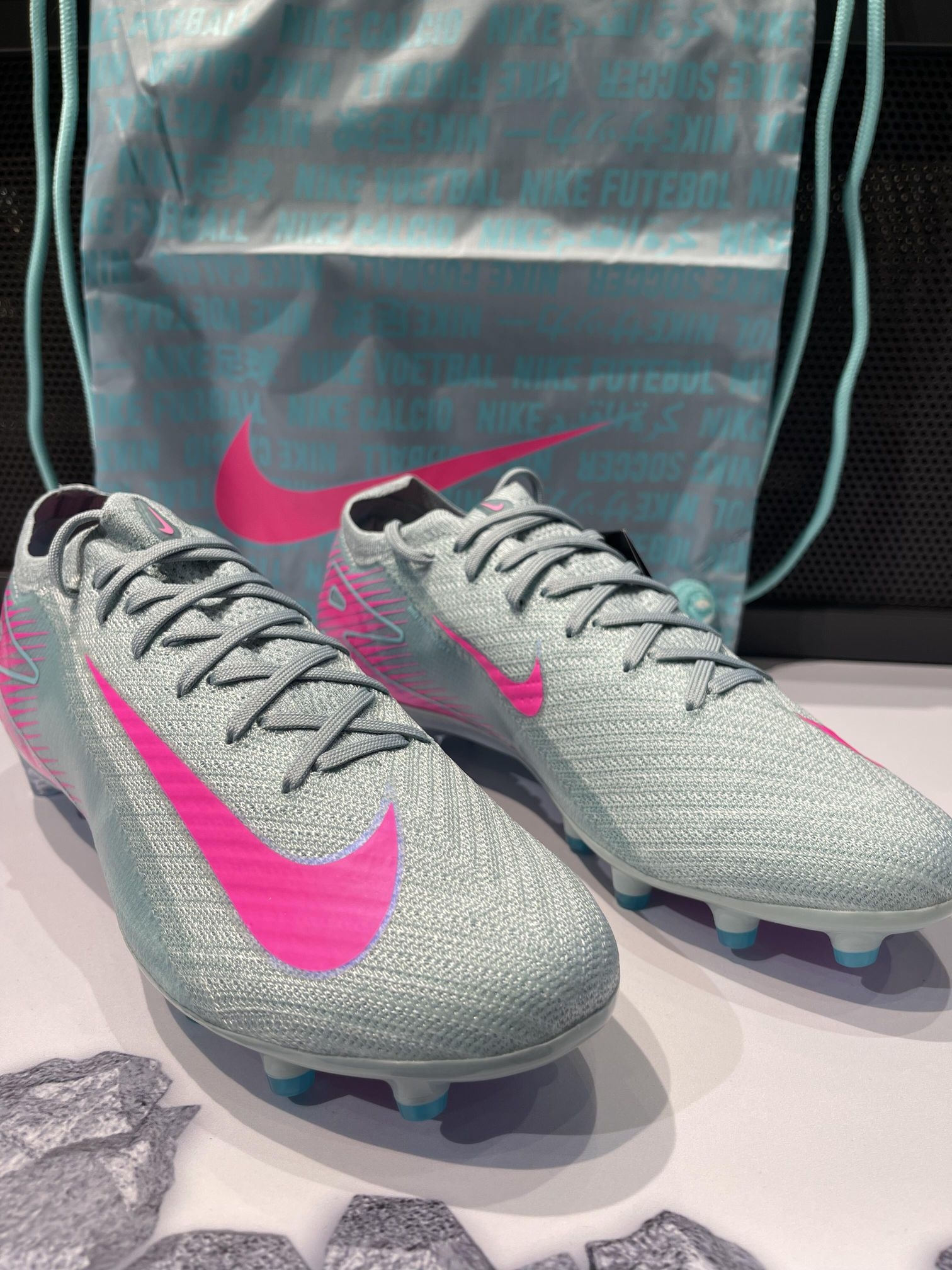 采用高端Flyknit鞋面,轻盈贴合,触球感超棒!鞋底长钉结构,抓地力和稳定性满分,适合高速跑动和急停变向⚽。银灰配色+亮粉Swoosh,视觉冲击力十足,兼具功能与时尚感✨。高端定位,