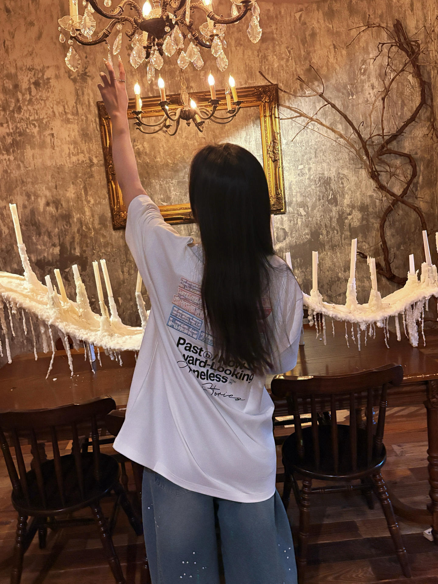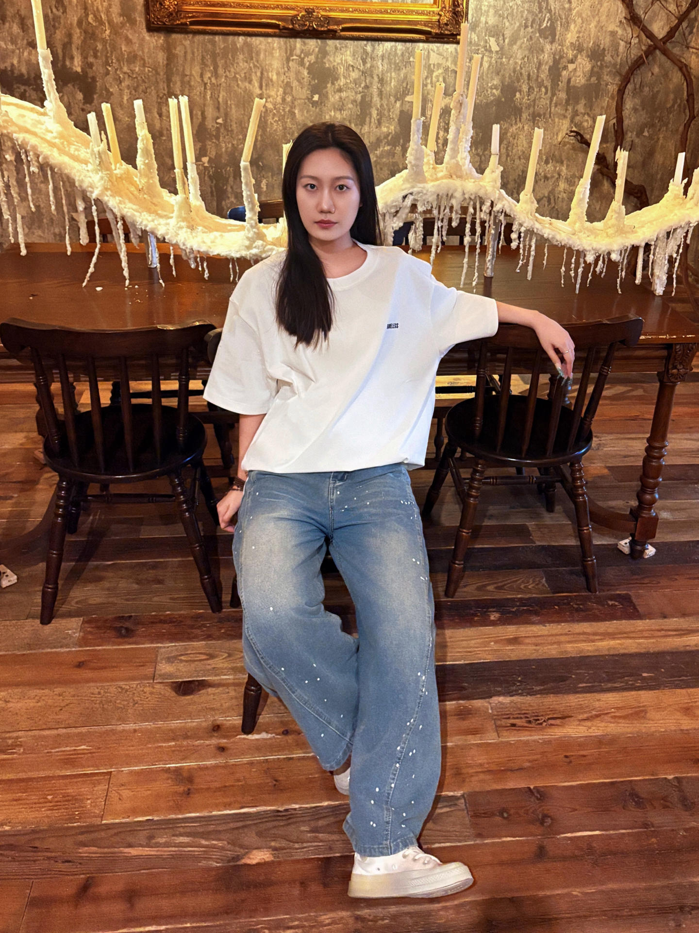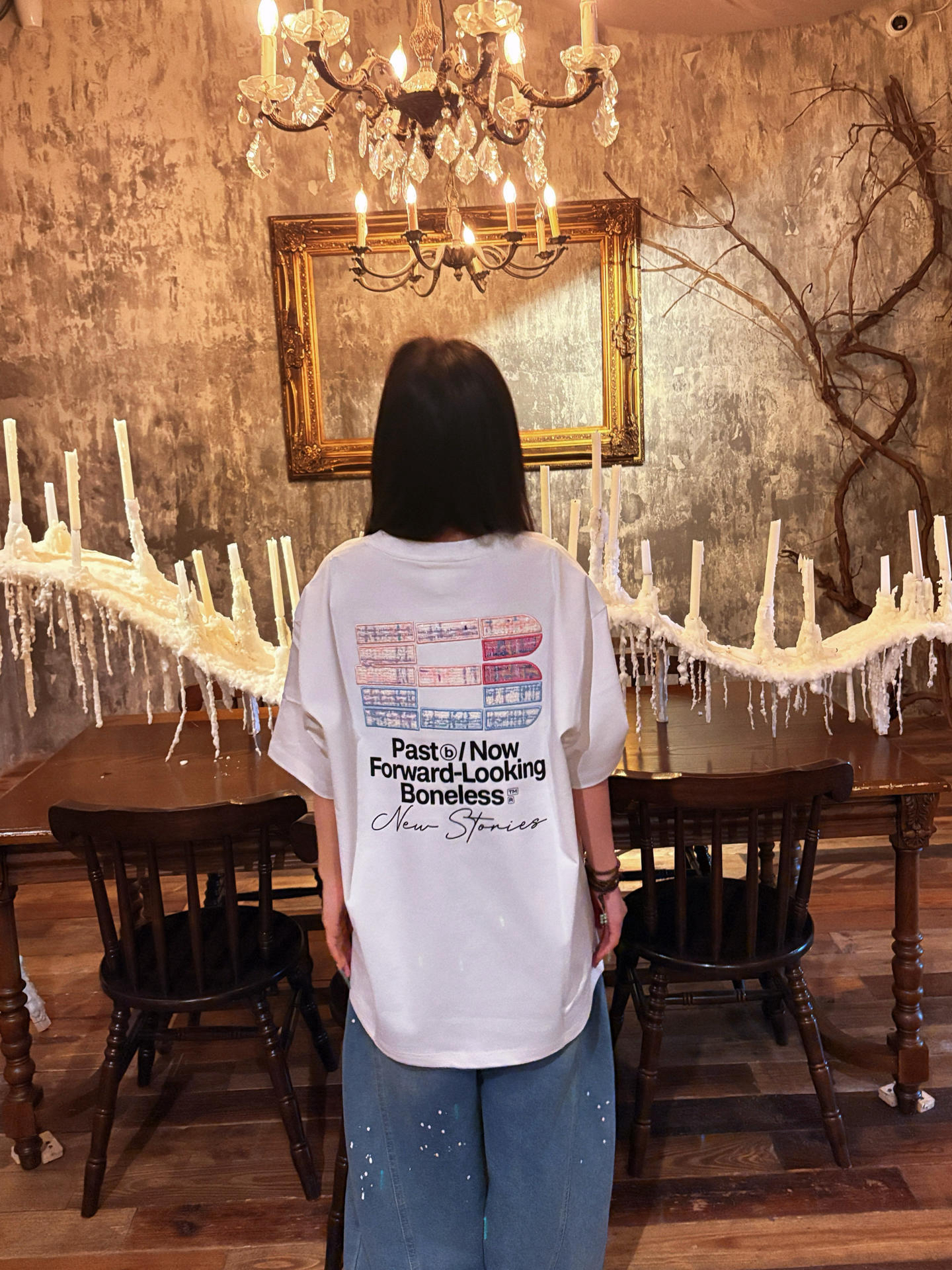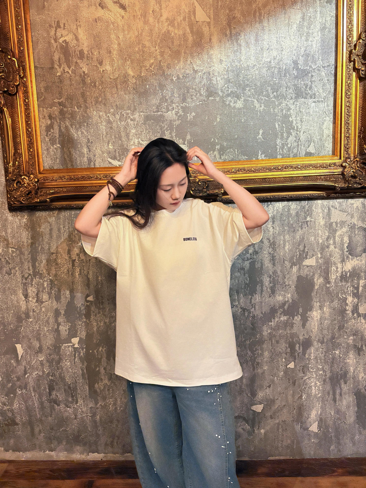 不靠建模 靠穿搭 想要日常穿搭有氛围感 又显瘦💥 那就要学会扬长避短 简约的over size大白T可以很好的藏住肉肉 而且宽大的版型 视觉就会显得人比较瘦小👀 这件T恤的亮点在背后的设计👏🏻 小香风肌理 撞色贴布拼接的一个超大logo 真的设计感满满 而且做工超级细致 随便搭配一条牛仔裤就可以搭出氛围感🌟 而且这一套妥妥穿出 纸片人 的既视感 真的太显瘦了🫶🏻