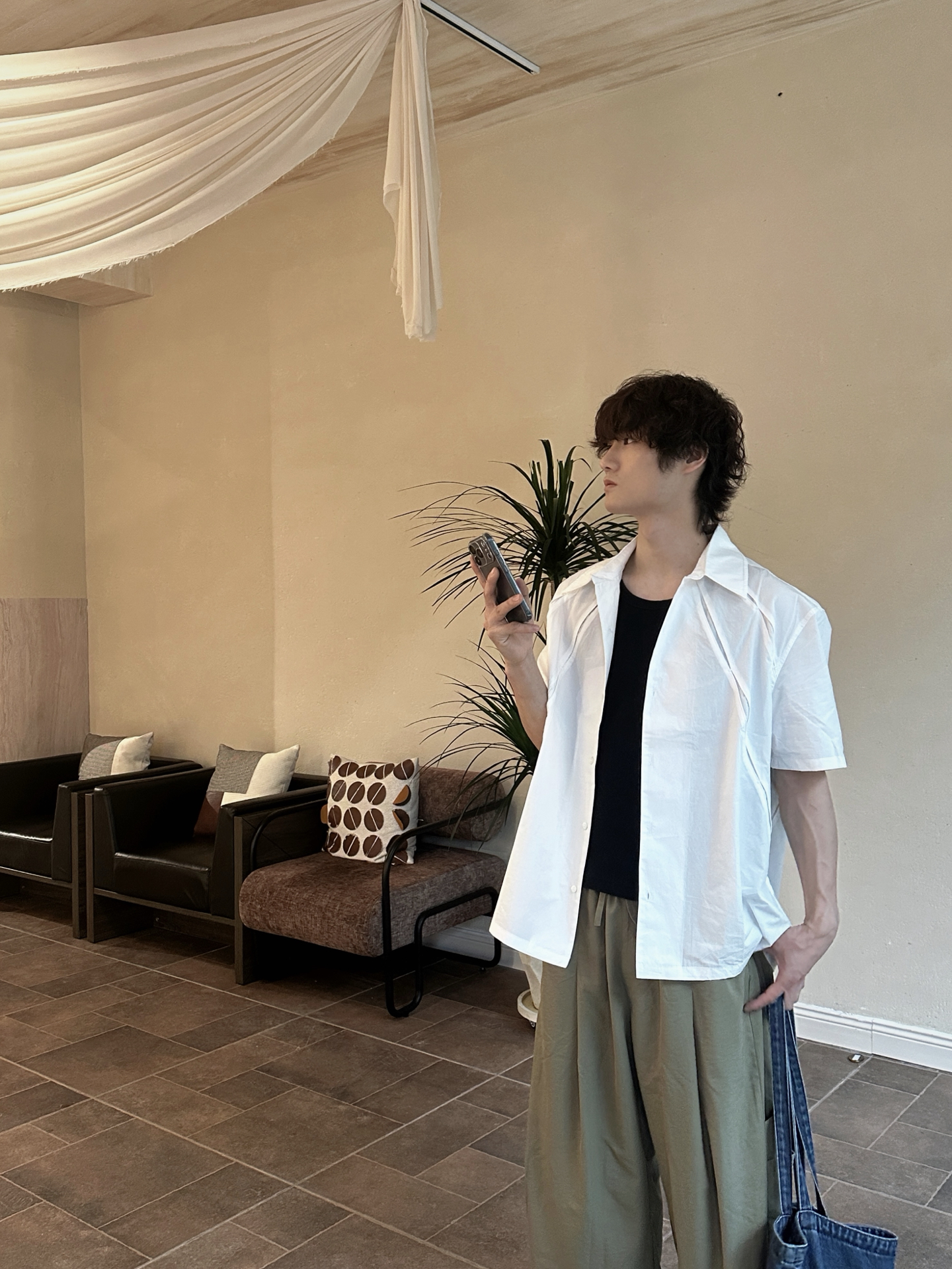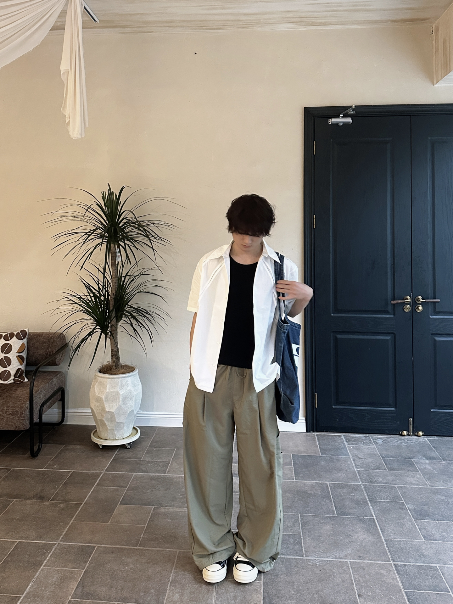 春夏穿搭的松弛感被这套拿捏了🍃 白衬衫+黑背心+橄榄绿阔腿裤,经典不出错 衬衫面料是那种透气的棉感,上身轻盈不闷汗 很喜欢这种有垂感的阔腿裤,日系的氛围~ 不费力的帅,轻松拿捏夏日氛围感~