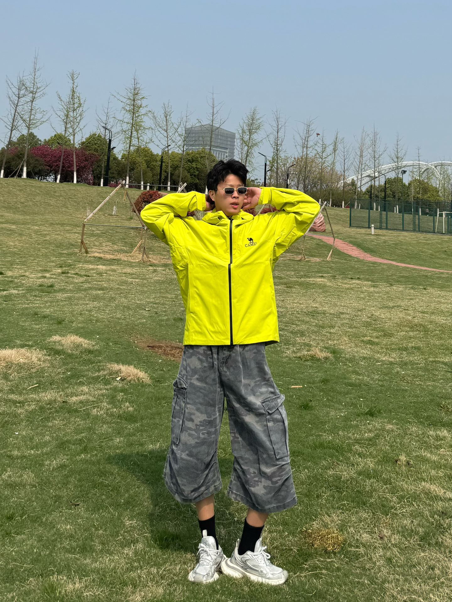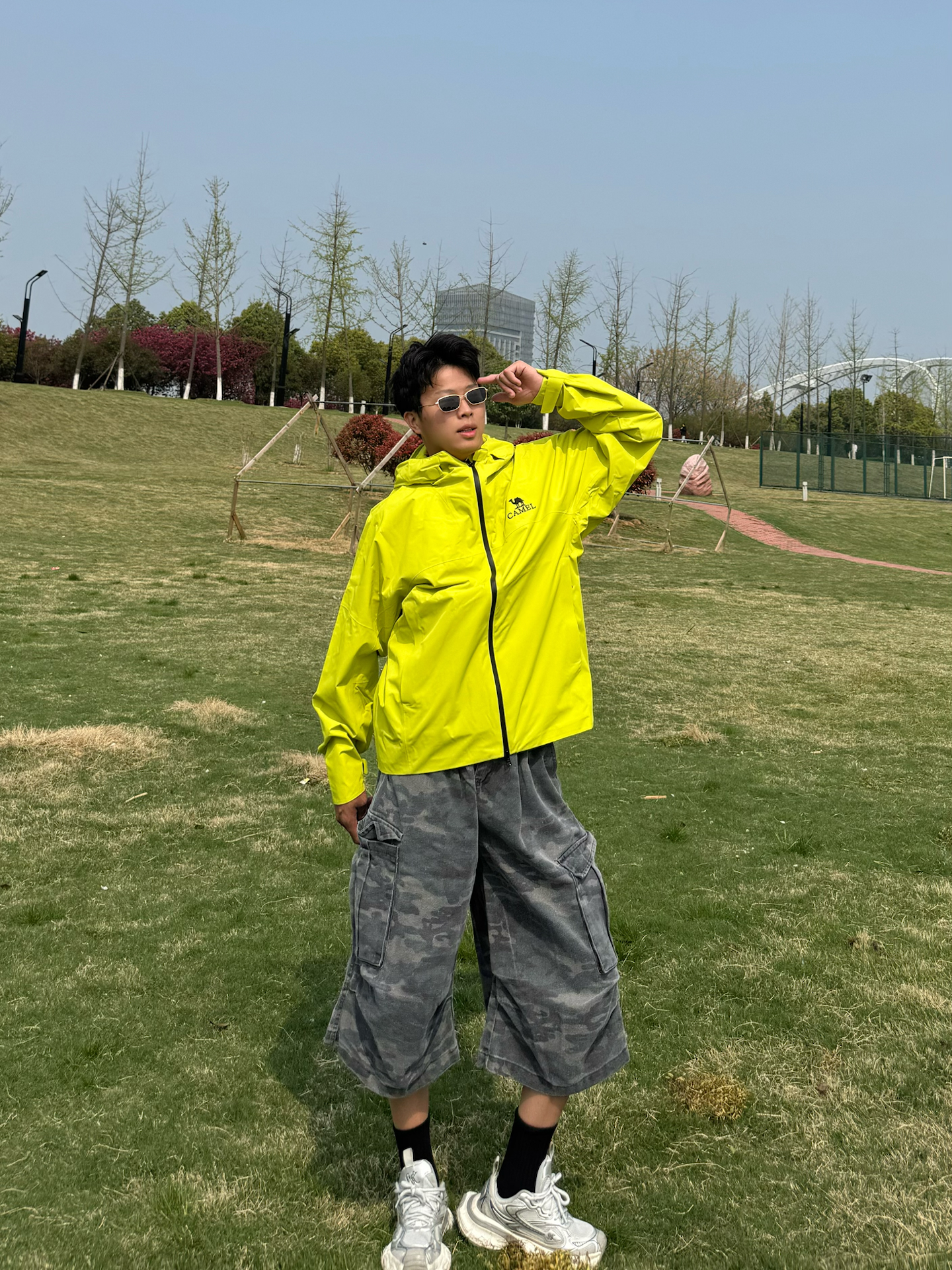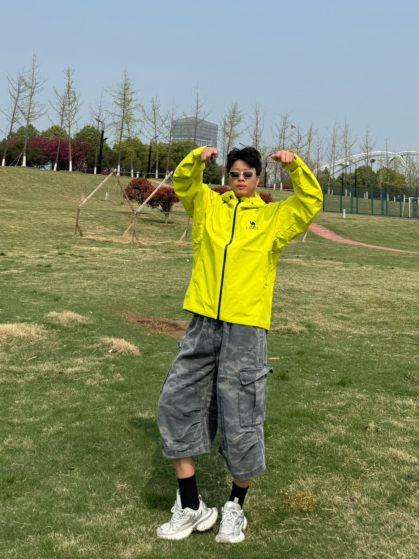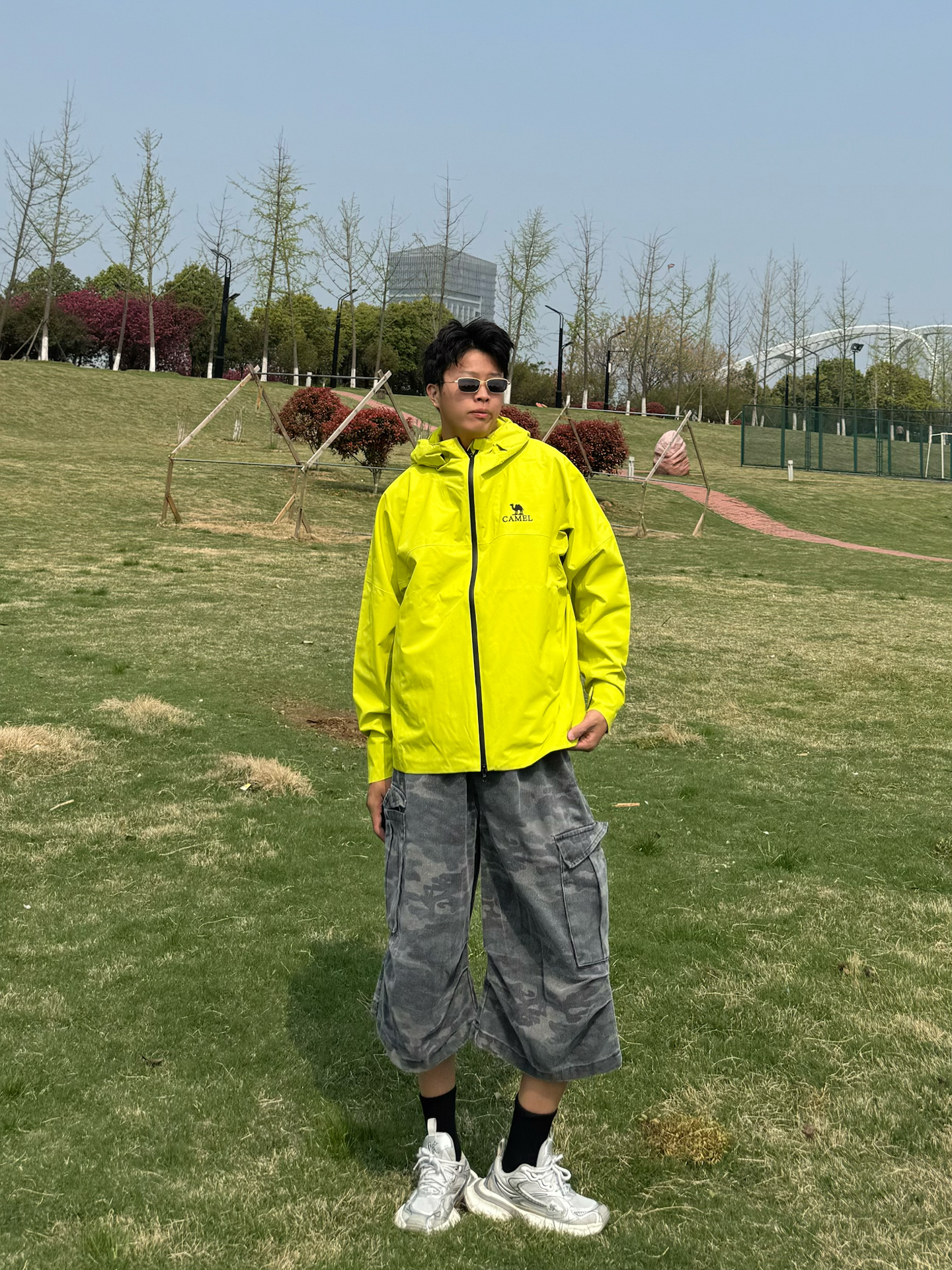 春天第一件冲锋衣选荧光黄准没错 这款骆驼冲锋衣颜色很正上身提亮肤色不突兀 轻薄款春秋天穿刚好不压身 版型宽松对身材包容度高 183的身高穿起来很舒展搭配迷彩七分裤和白跑鞋 山系少年感一下就出来了 日常cityboy风格适配度拉满