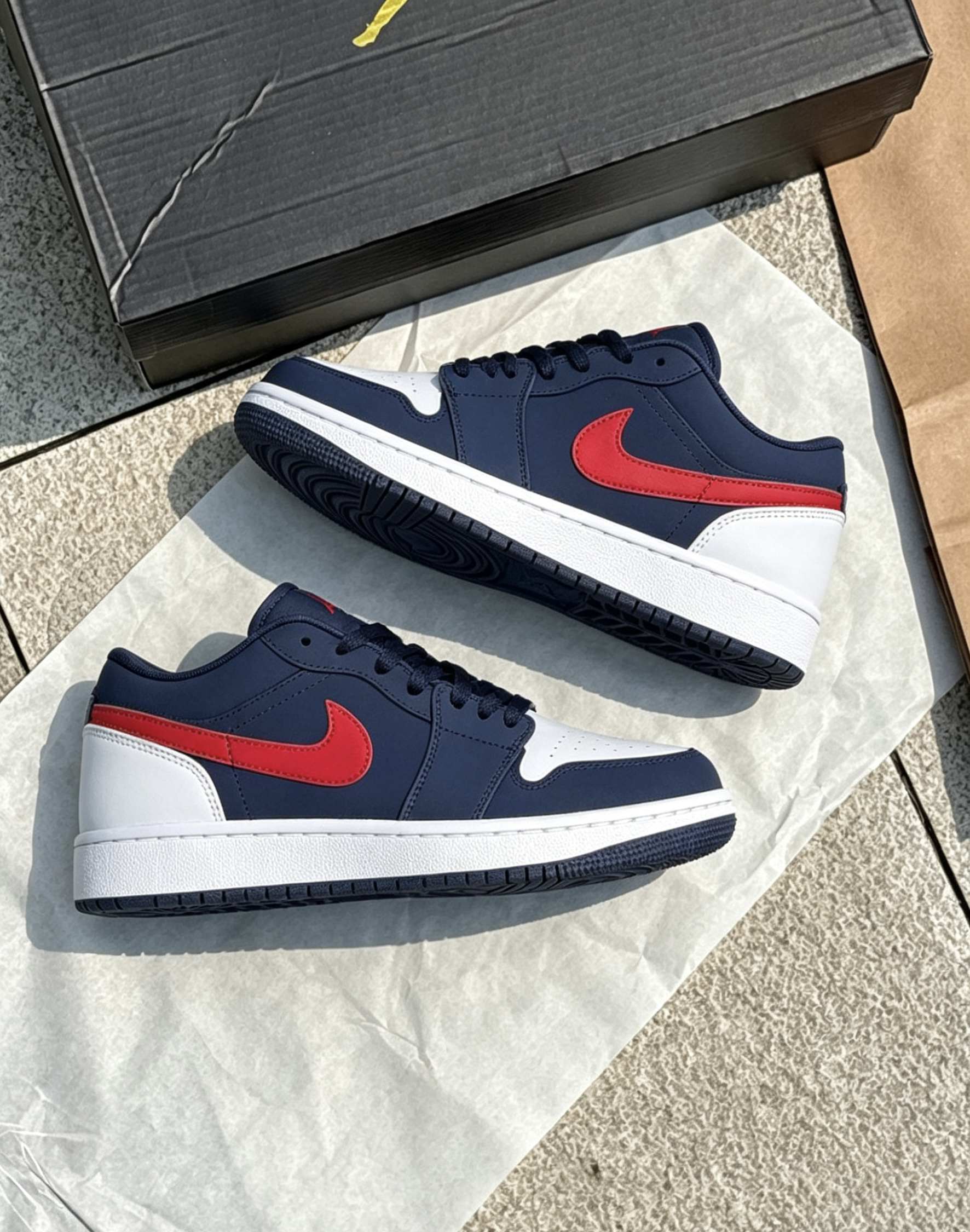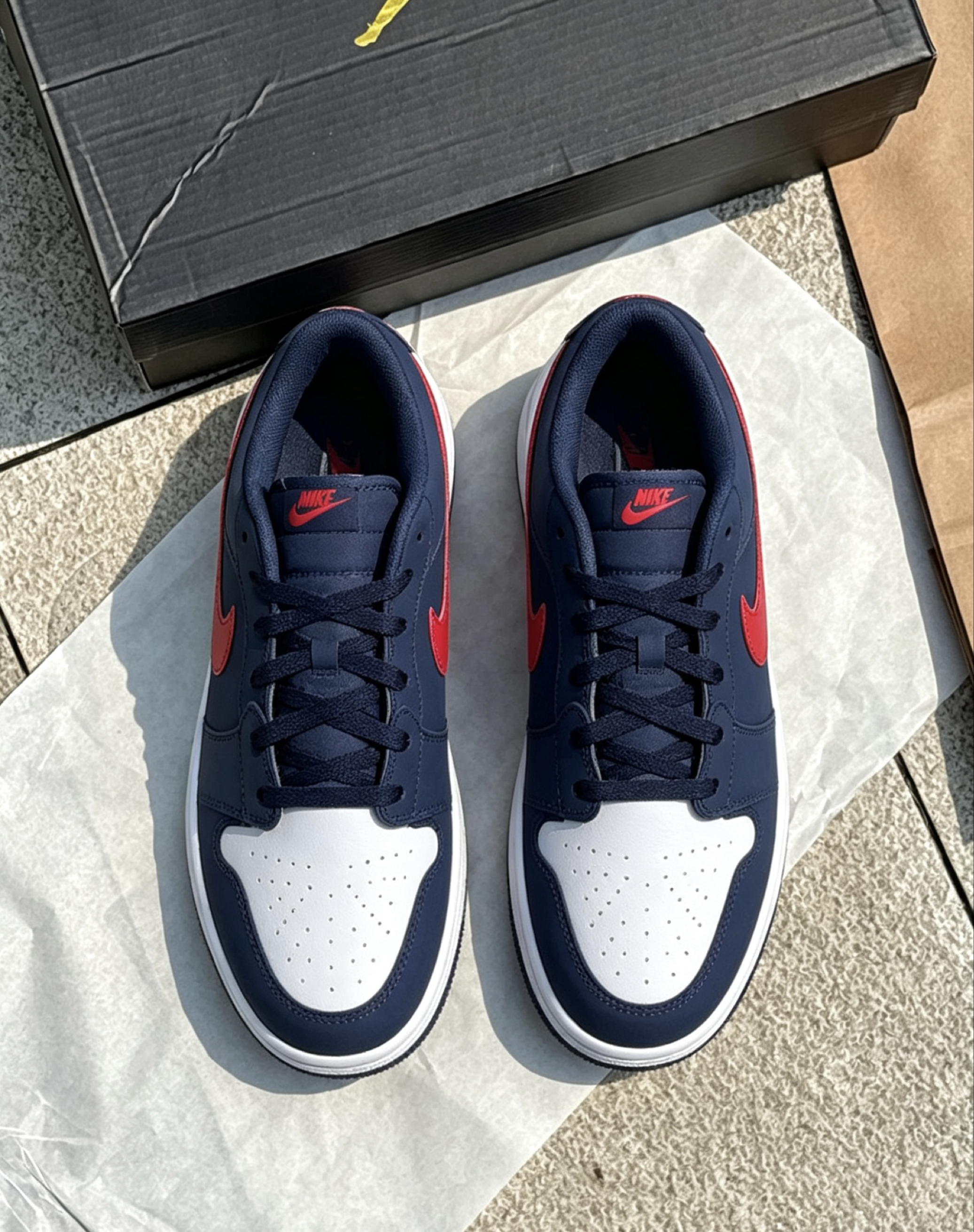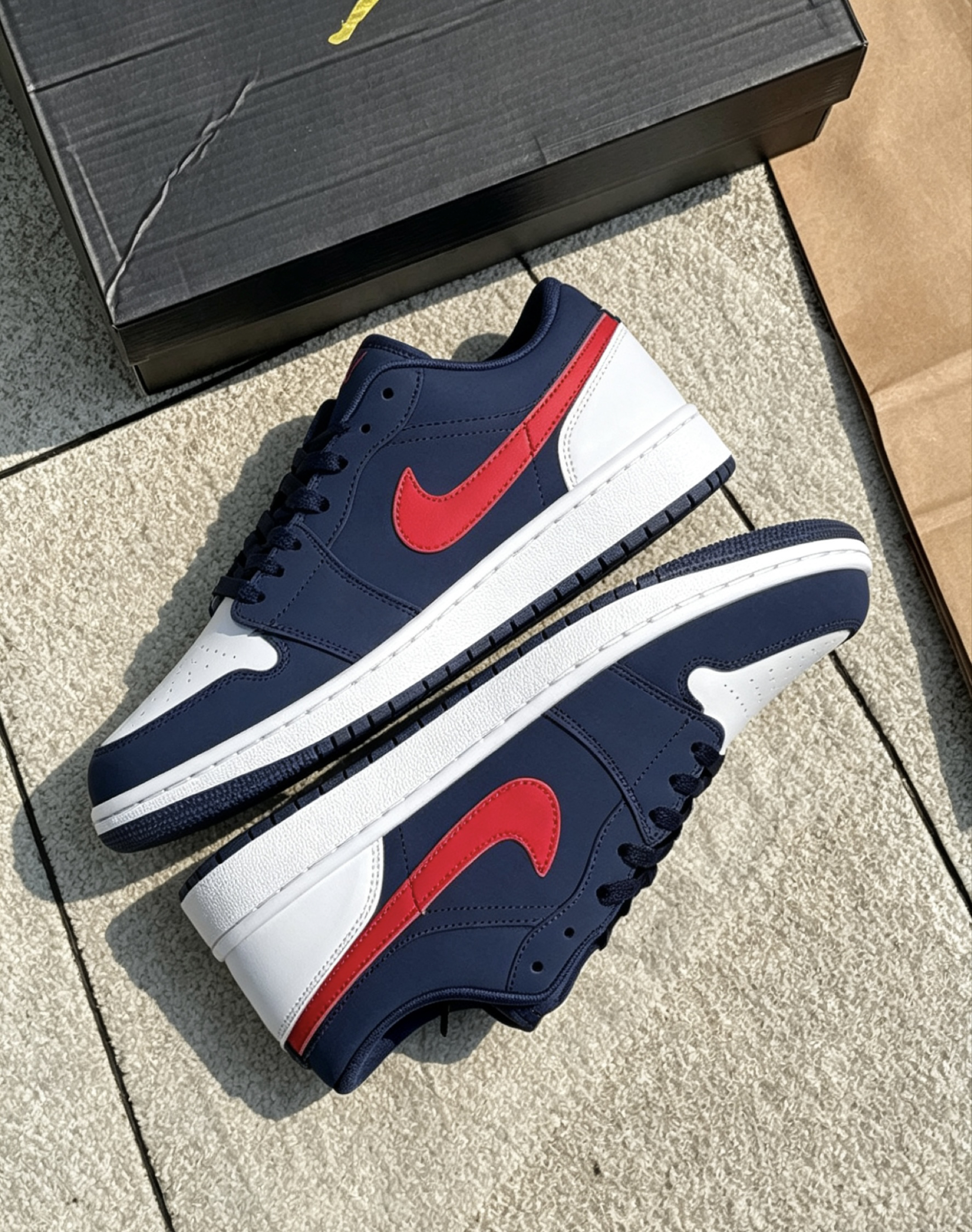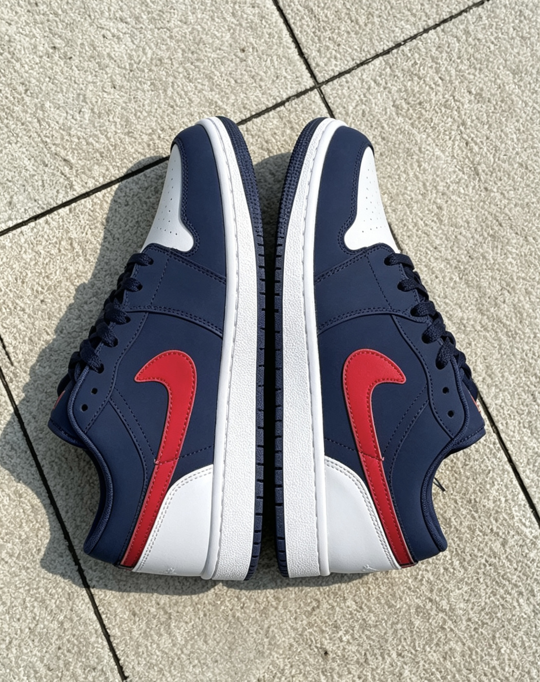 这双AJ1 low usa我日常穿了快半个月了😌 鞋型不挤脚,宽脚的朋友正常选码就行👟 藏青配红的配色很耐脏,不用经常打理🧹 鞋底软硬适中,通勤走久了也不会累脚🚶 你们平时穿这双都爱搭什么裤子呀?