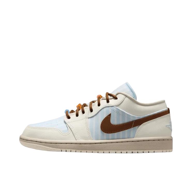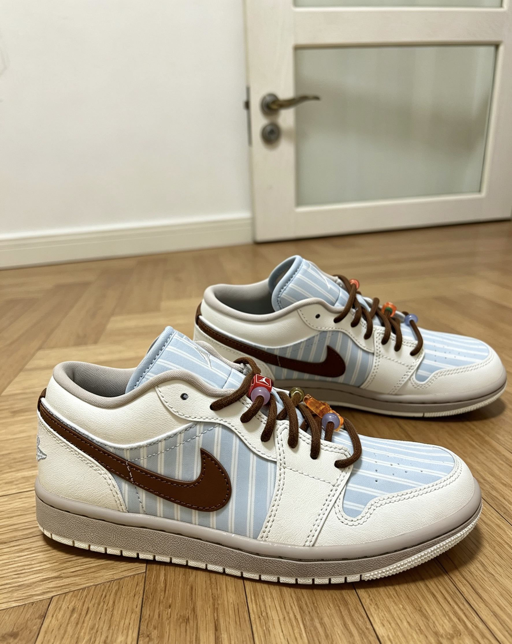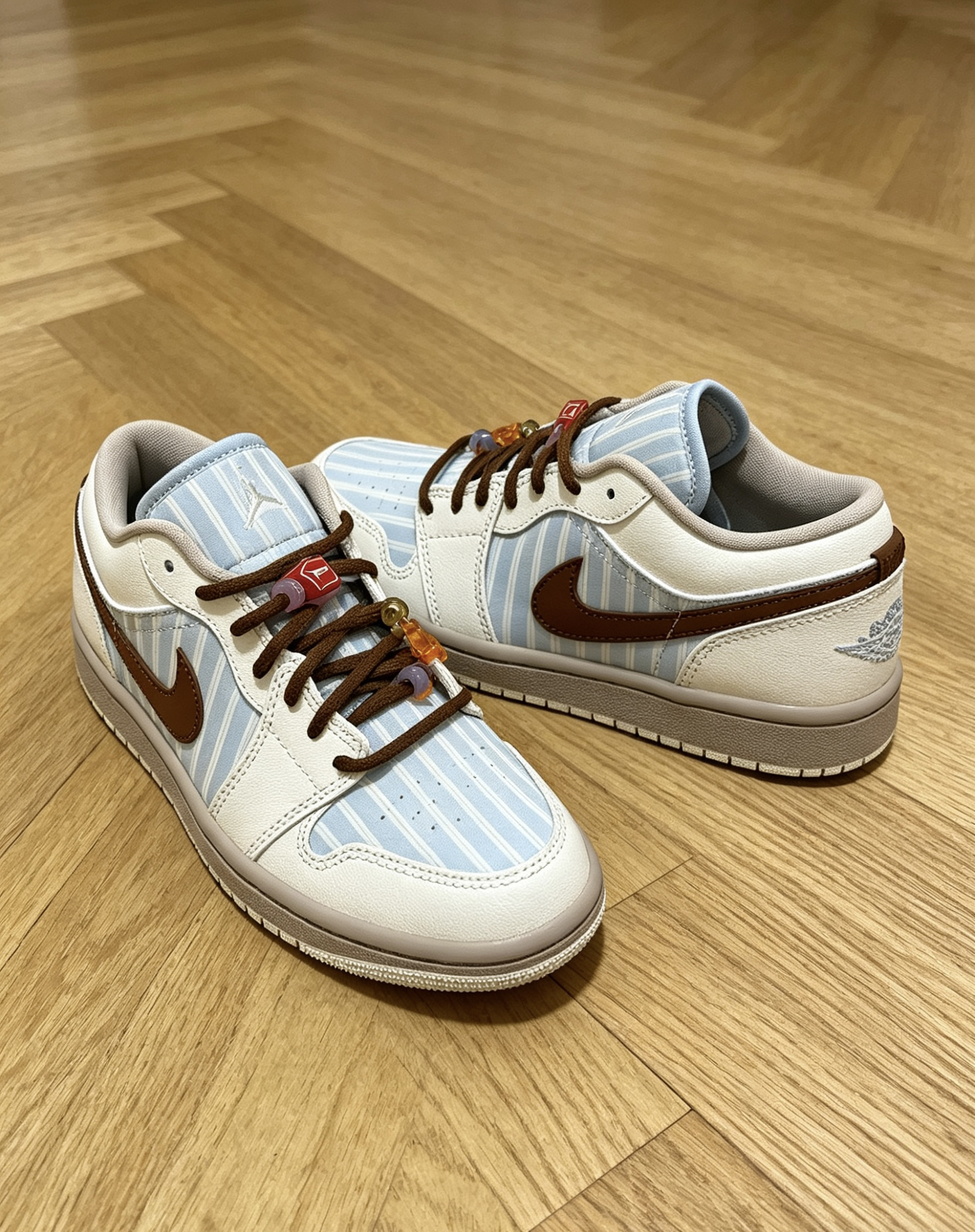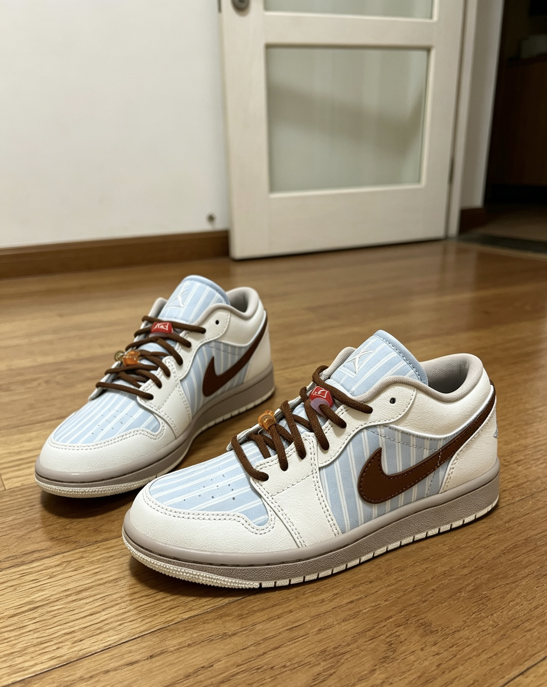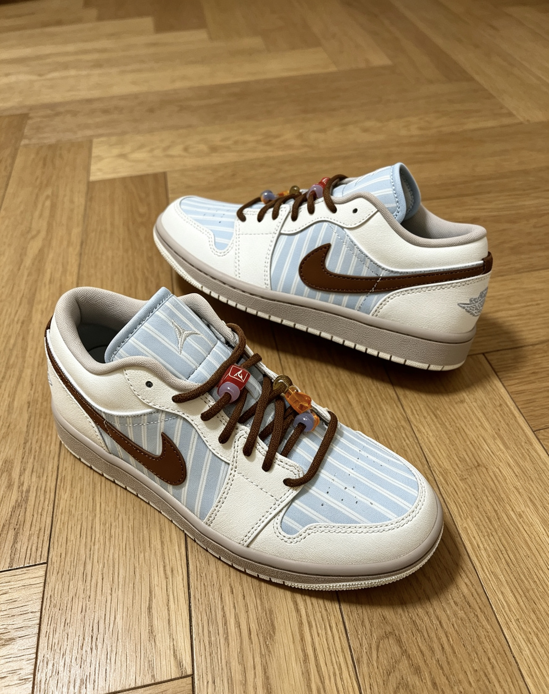 这双条纹AJ1我日常穿了快半个月了😌 鞋型不挤脚不压脚背,正常选码就合适👟 浅蓝条纹+棕勾的配色很清爽,不挑穿搭✨ 自带的串珠配件可以换着玩,可玩性很高🎨 光面皮好打理,蹭脏了湿巾一擦就干净🧹 你们平时会给这双换什么颜色的鞋带呀?