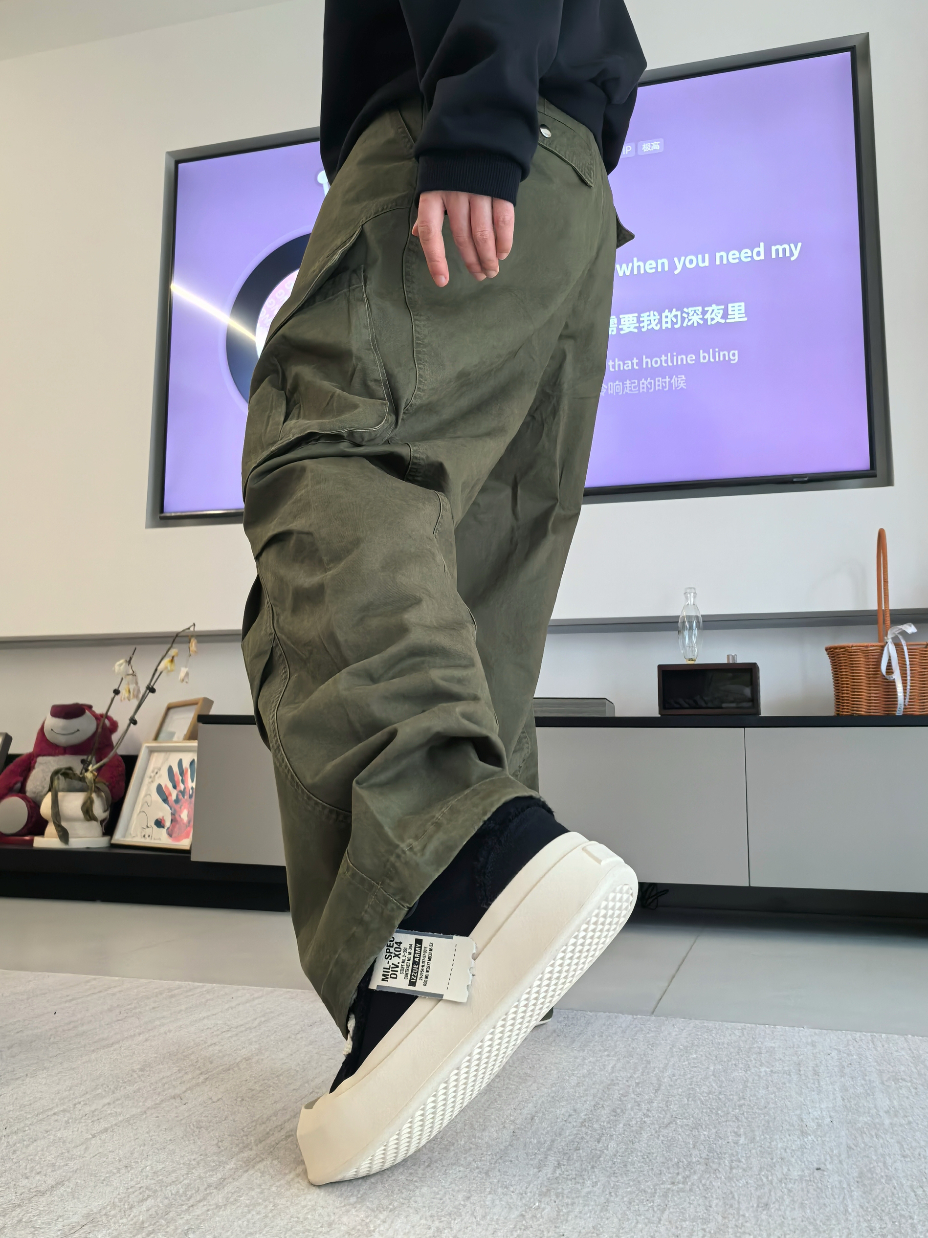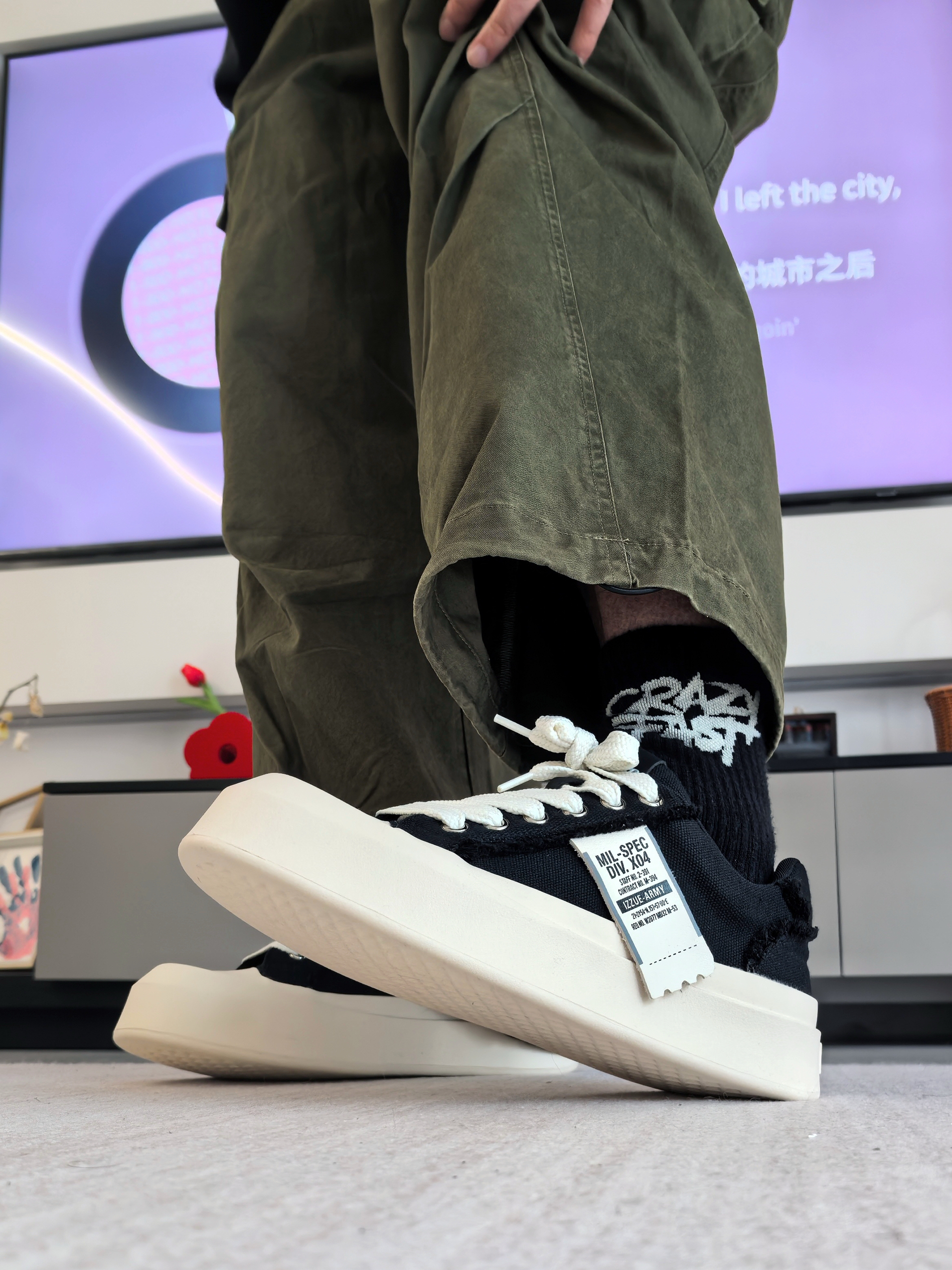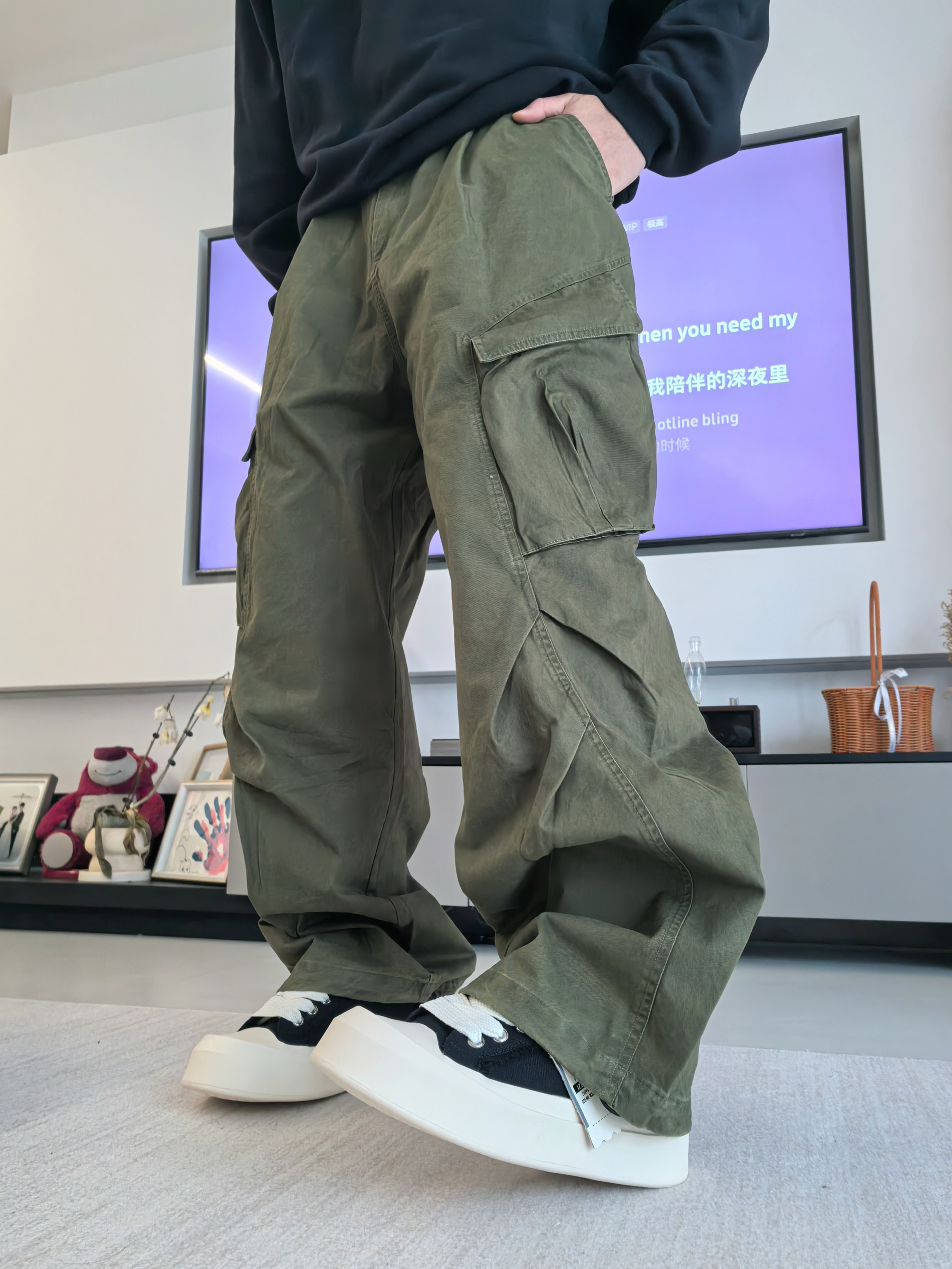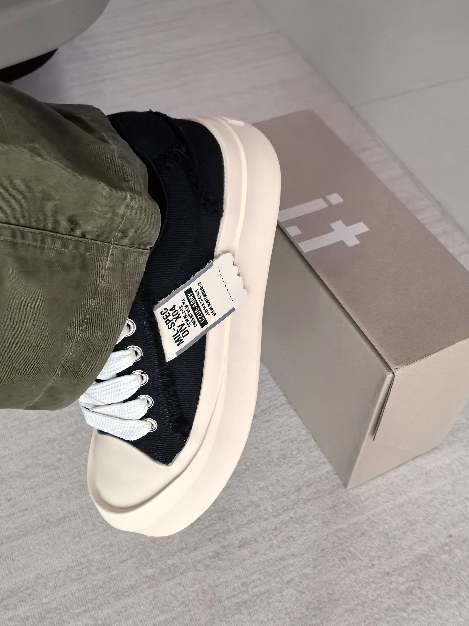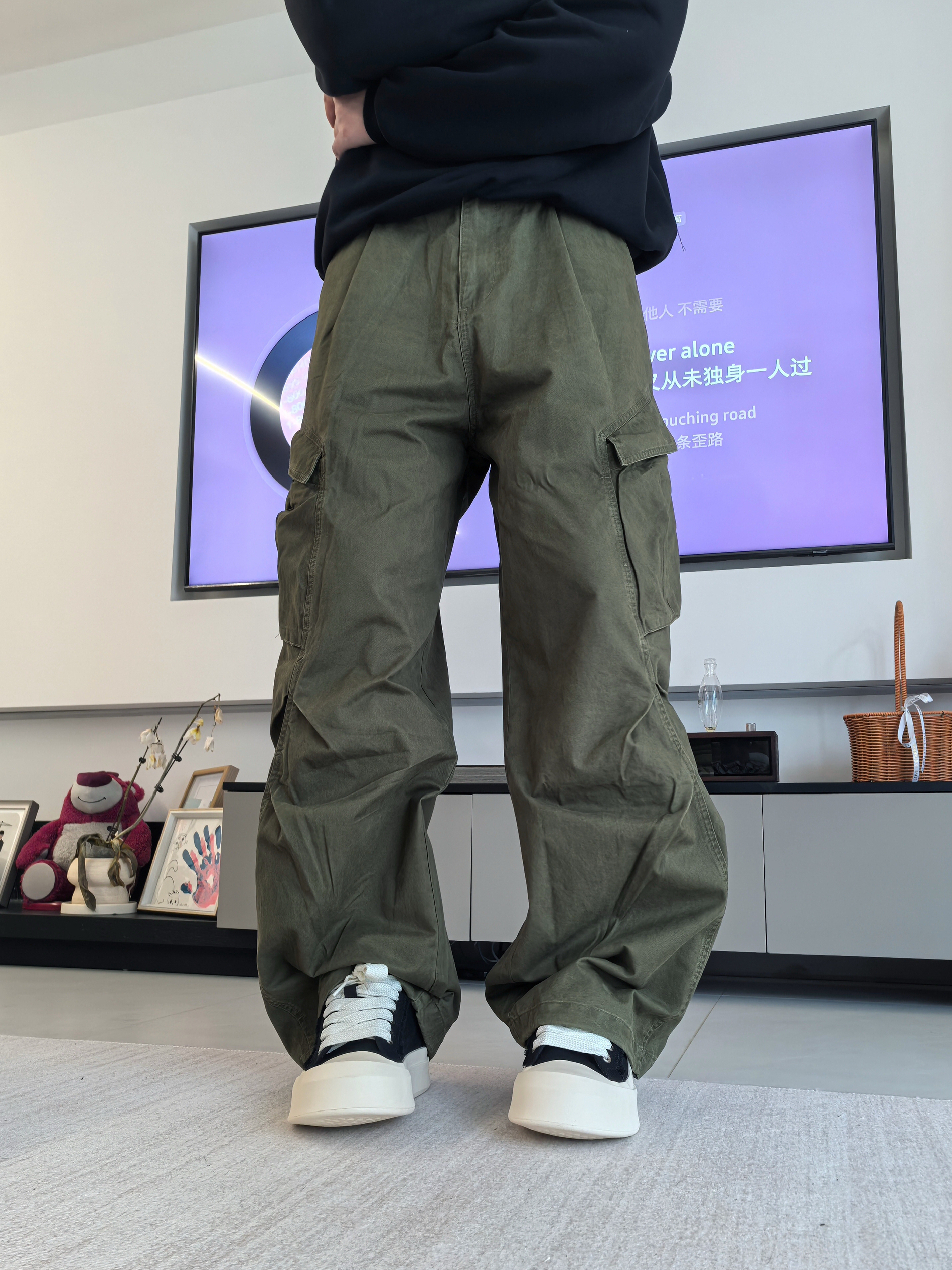 之前我总怕这种大头鞋会显脚大? 🏃结果今天我上脚后才敢说它不显脚大,并且能够增高显瘦 我先说最直观的,就是这个厚底,增高没毛病,关键是上脚不笨重,走路也没那种踩砖头的感觉,脚感软乎乎的 🤔还有这个毛边+黑白撞色的设计,越看越上头!自带那种街头松弛感 💥我搭配的是一个绿色工装裤,它就不吃配色,都可以去搭配,包括我的上衣选择一件纯黑卫衣,整体效果我自认为应该是能hold住👌