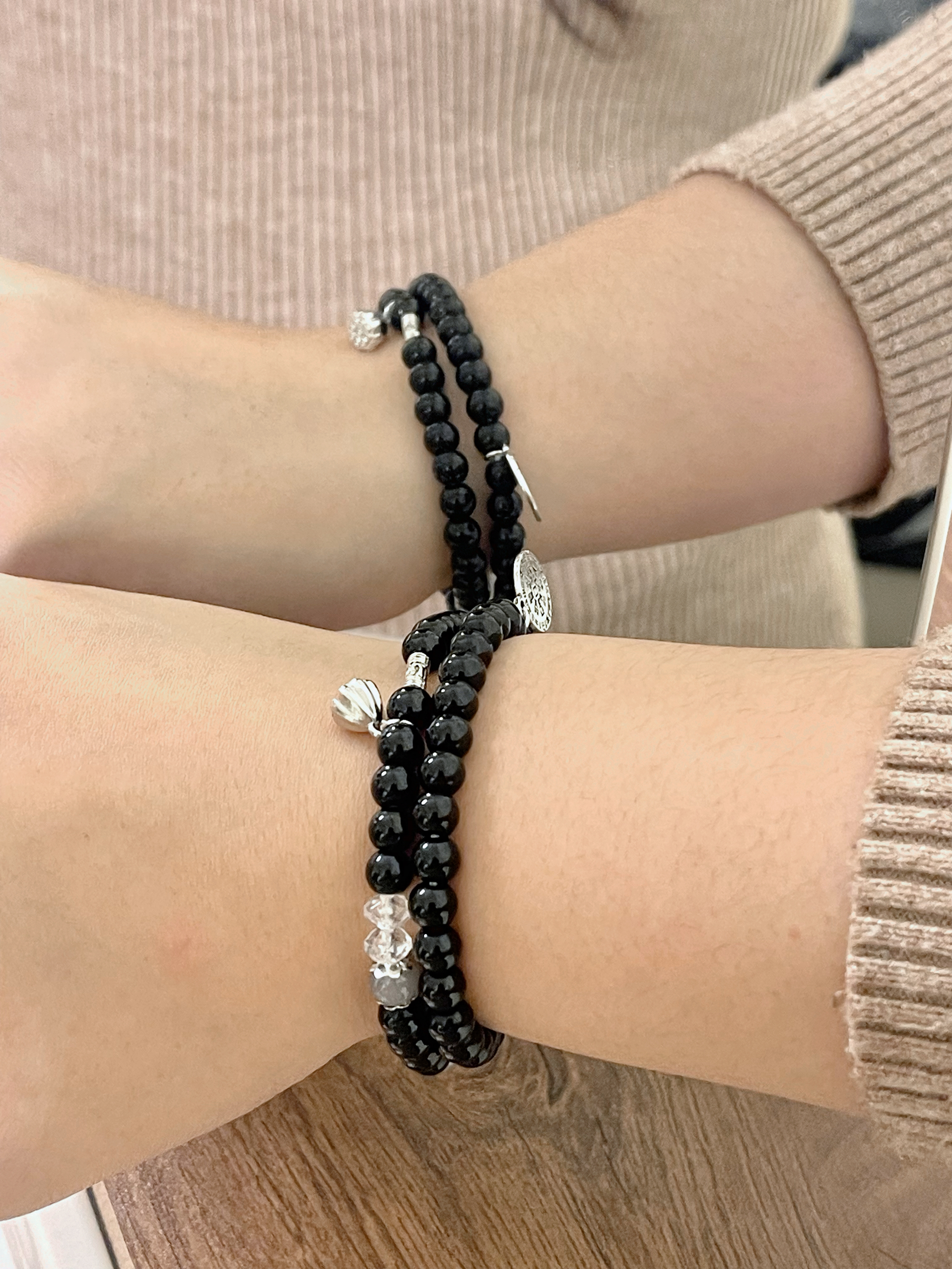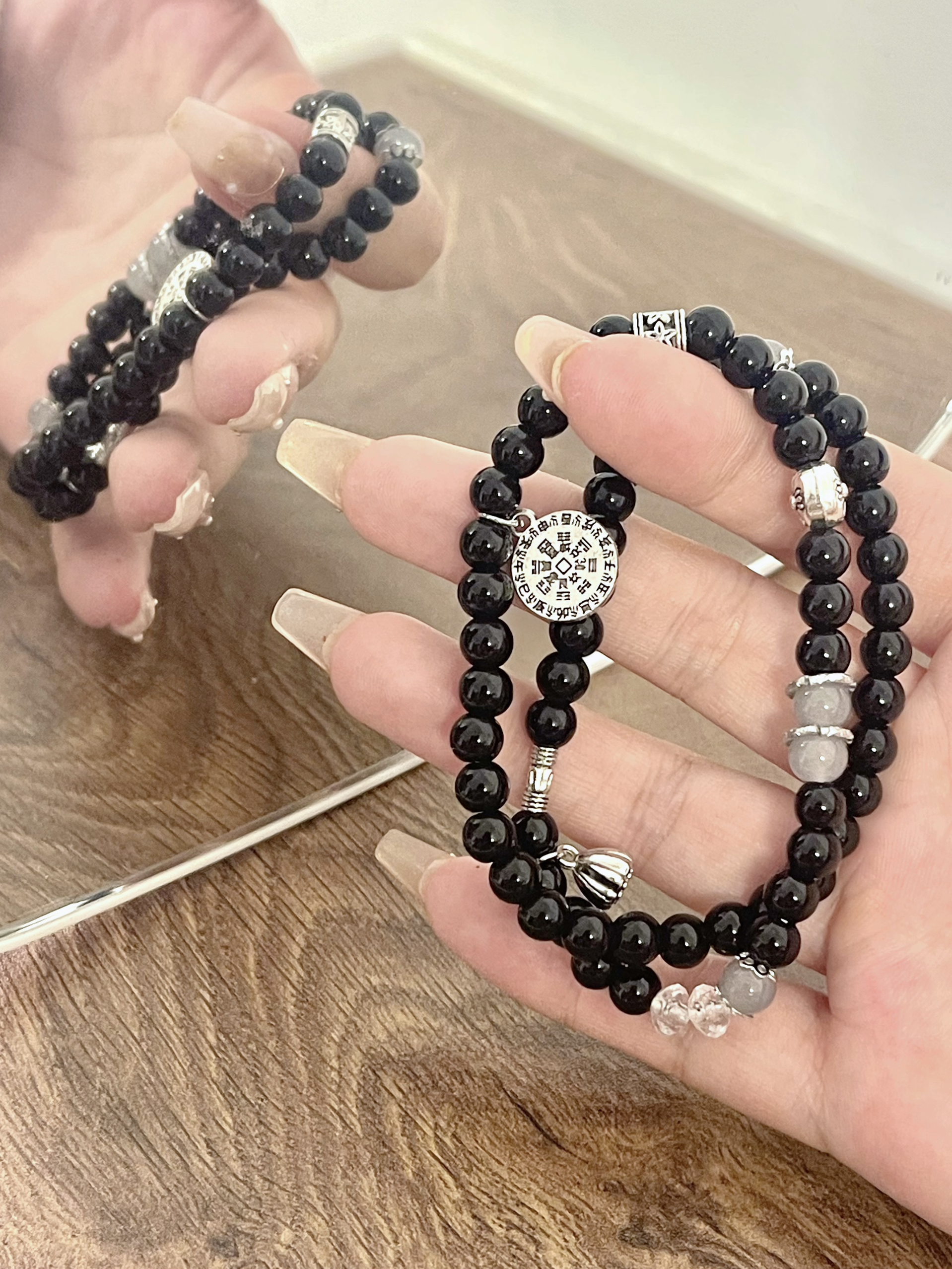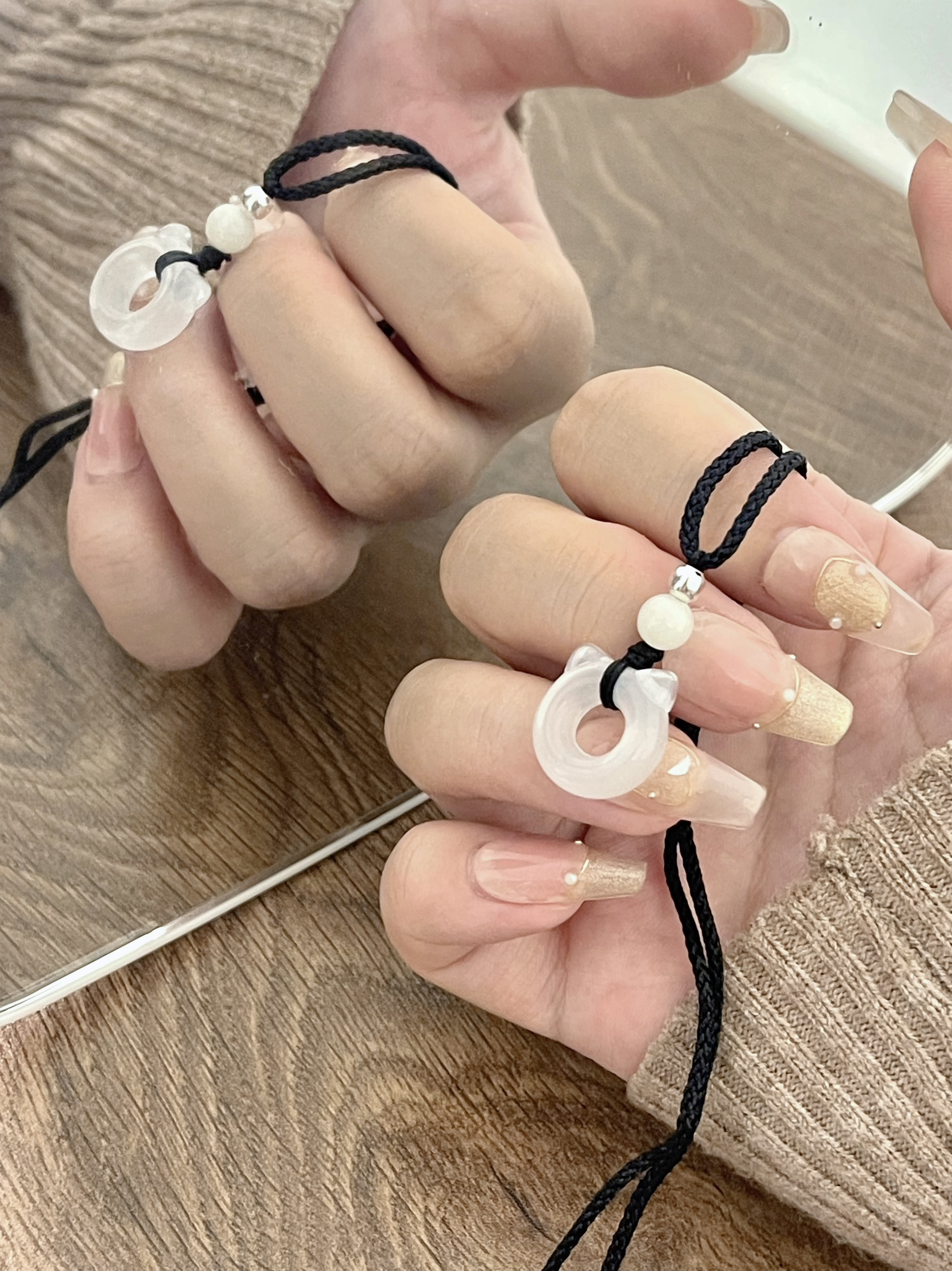 这个价格真的好香 实物到手根本看不出来这么白菜价 透亮透亮的很有质感 平安扣加上小猫耳朵 好可爱🐈⬛ 搭配黑色串珠 简约又大气 一套戴上氛围感满满 小众也不容易撞 单戴叠戴都好看🥰 日常通勤百搭好看 出门约会佩戴也合适 秋冬搭配毛衣大衣 更是出片 还可以和朋友或者对象一起戴~