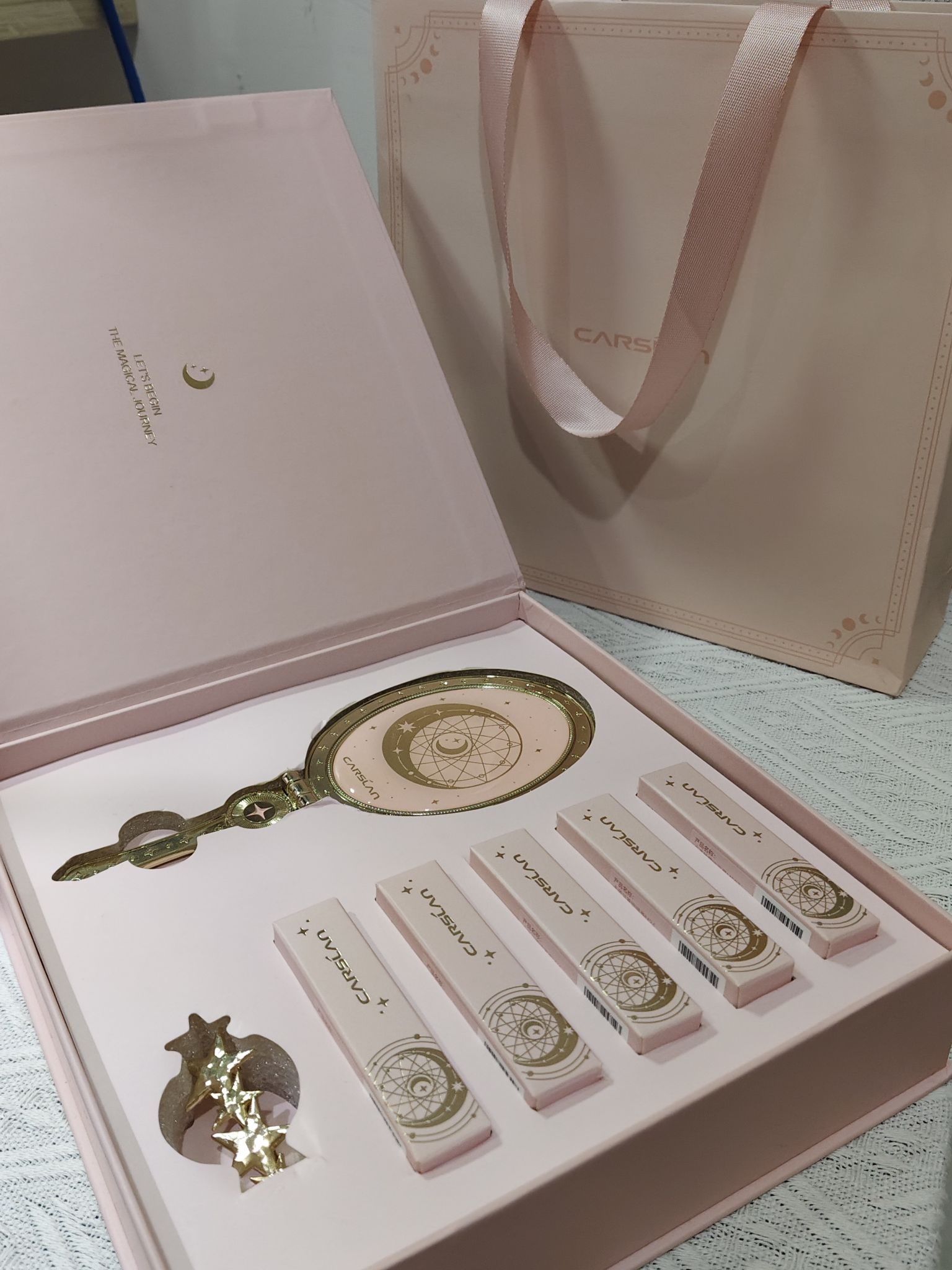 这个口红礼盒真的很好看,粉粉嘟嘟的一套有5支口红,颜色都很好看,春日出门随便涂一只都合适~上嘴丝滑,还有个好看的镜子可以折叠,发夹也很别致。整个礼盒设计就有星空梦幻的感觉,女孩子真的拒绝不了这么好看的包装