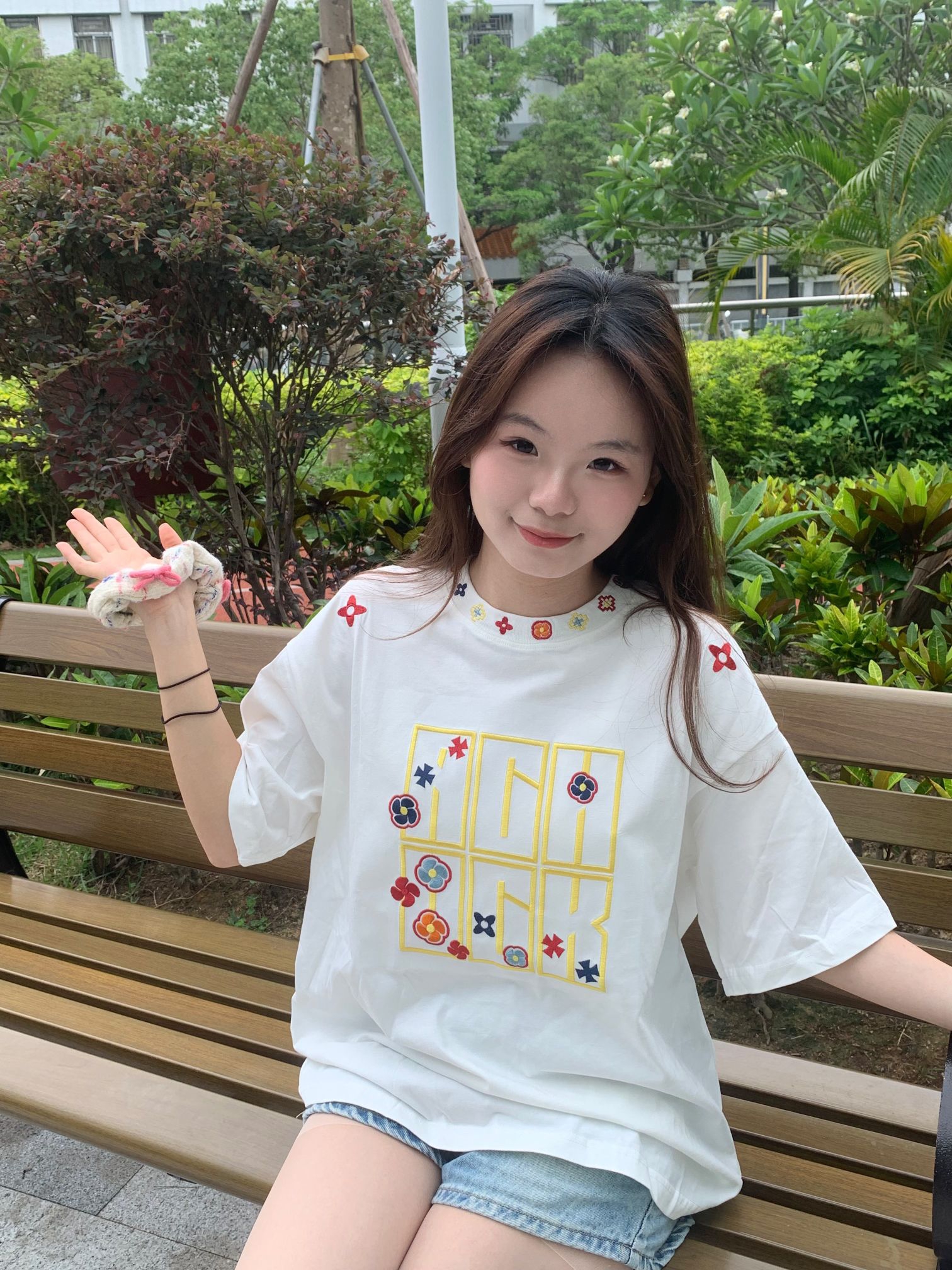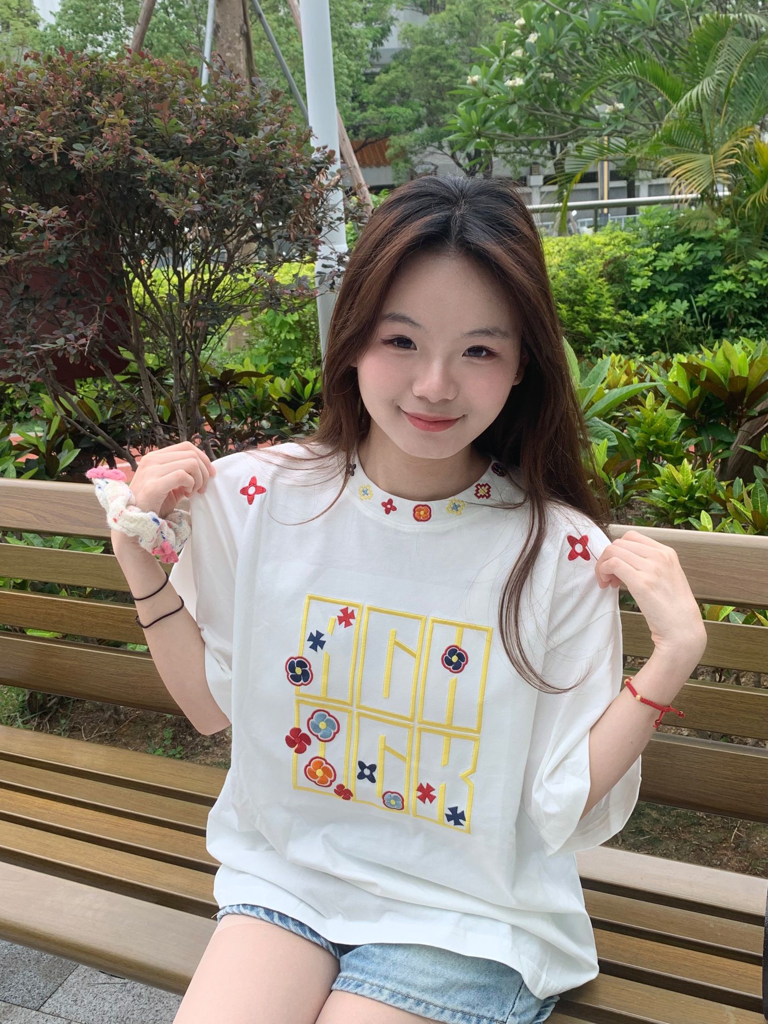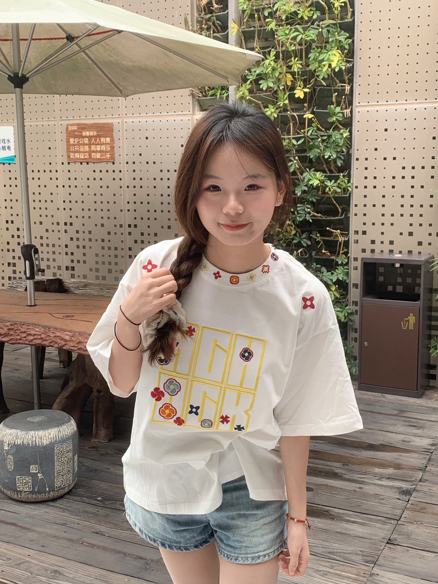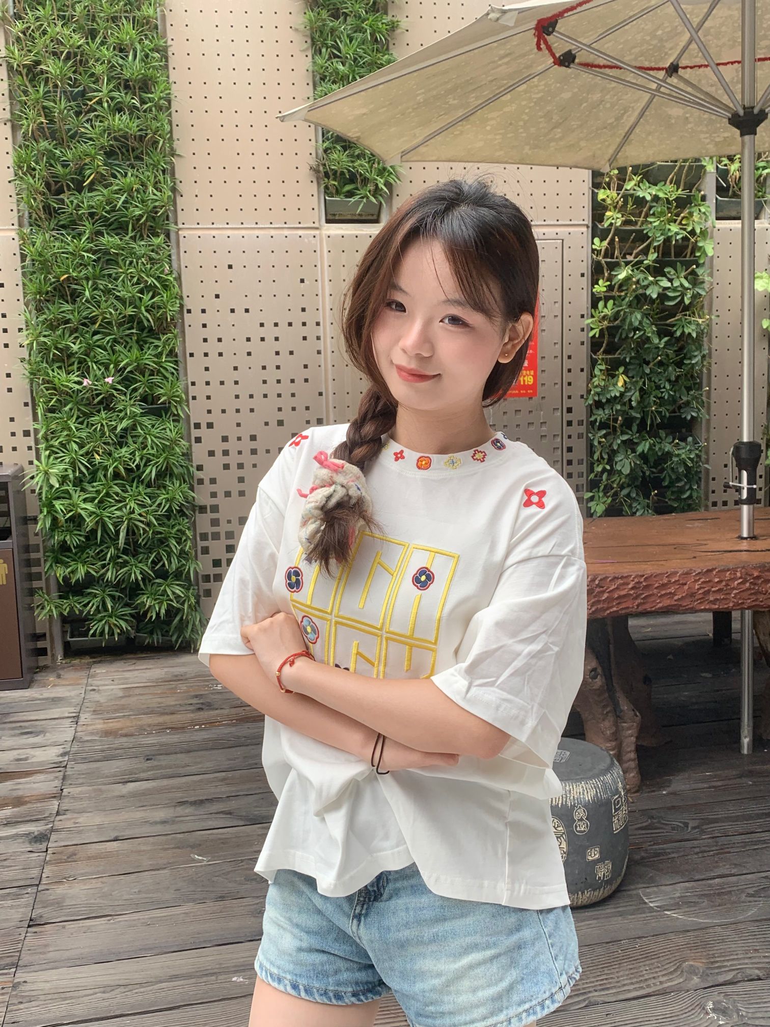 夏天的快乐,从一件好看的白T开始🌿 这件新中式刺绣白T真的长在我的审美上! 奶白色的底色干净又清爽,胸前的国风刺绣精致又有细节,红黄蓝的撞色设计,一下子就把中式氛围感拉满了✨