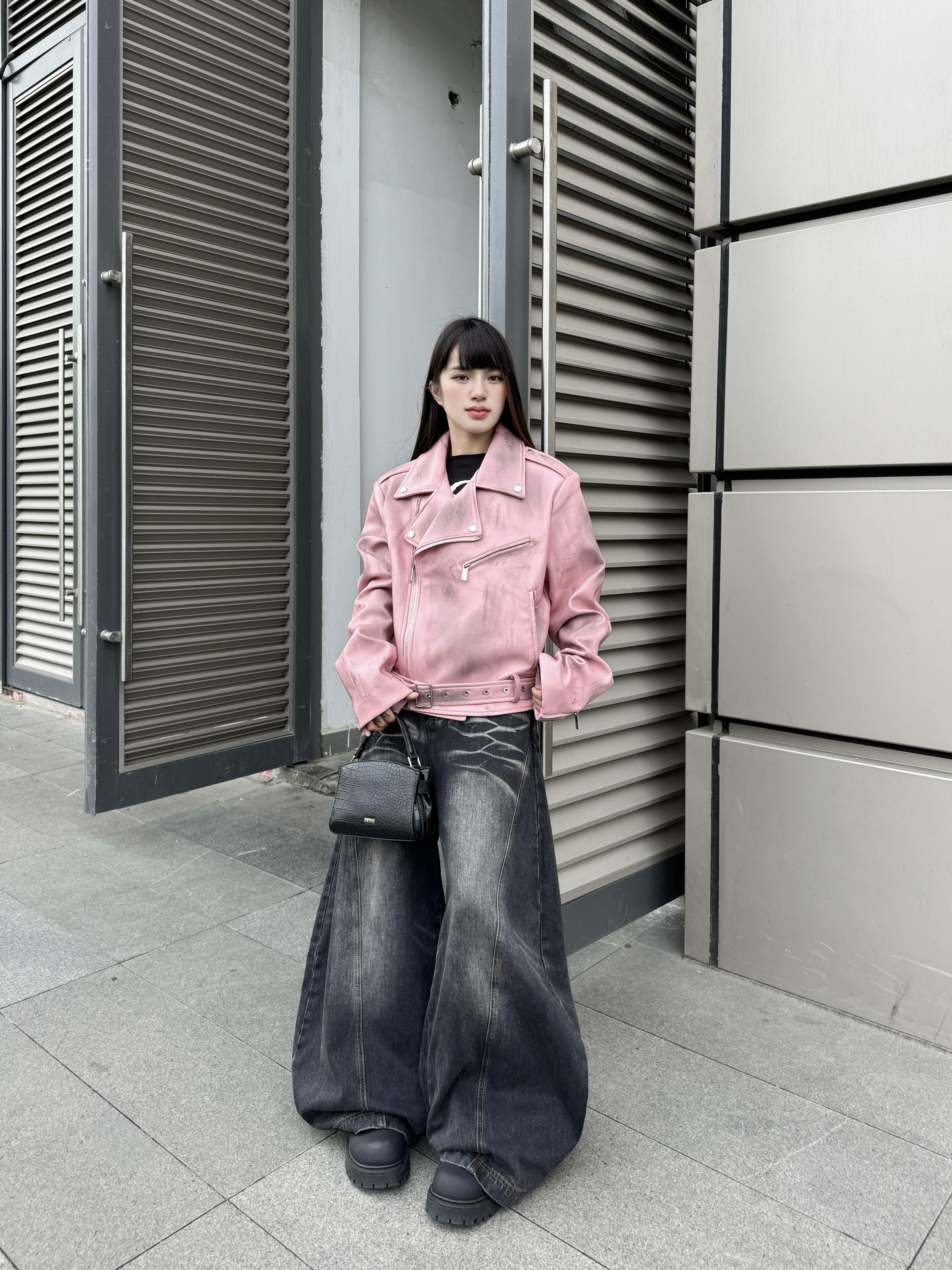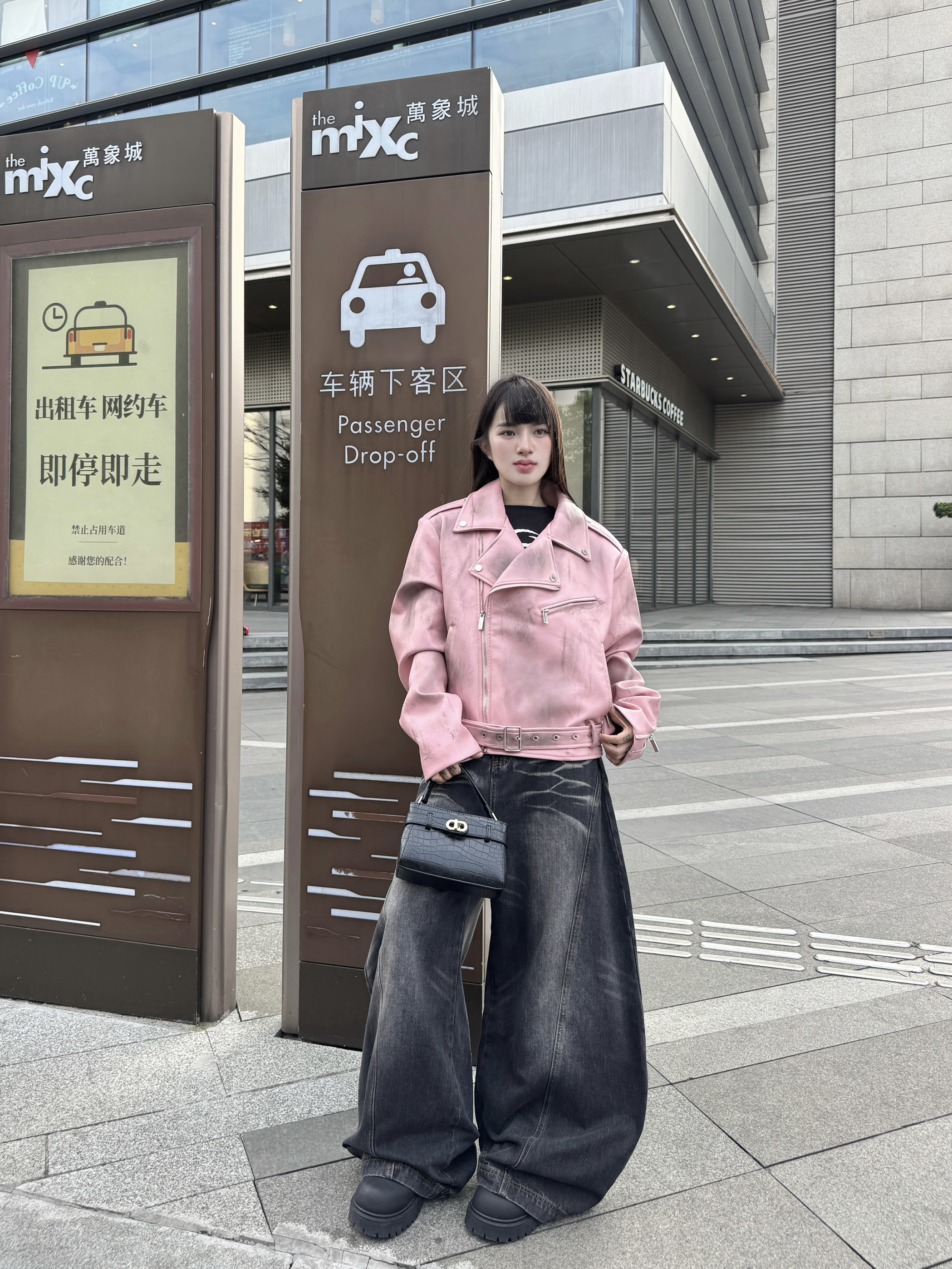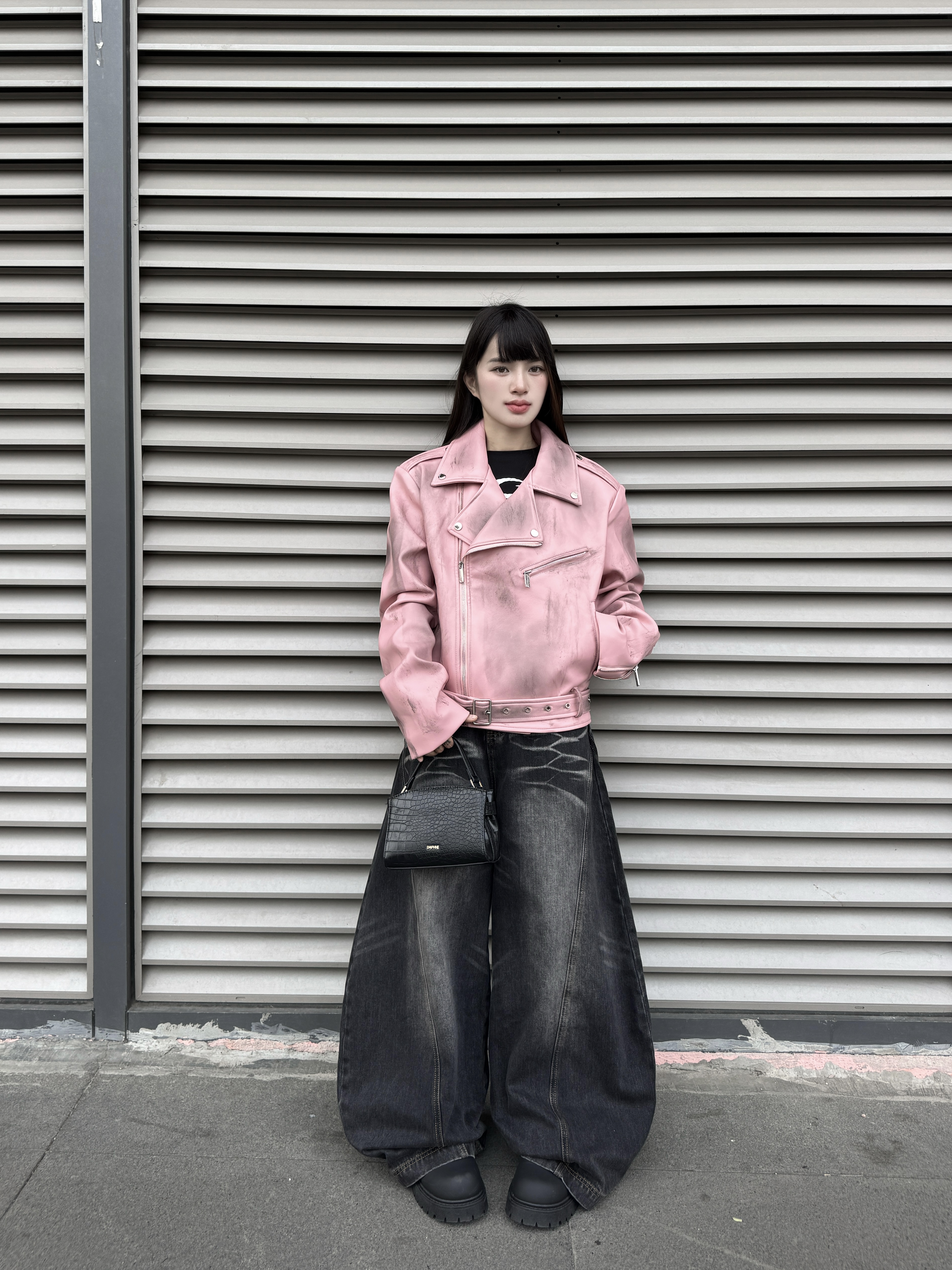 开春第一件本命穿搭🌸 这件粉色做旧皮衣真的绝了✨ 做旧纹理自带复古氛围 👖搭做旧阔腿牛仔裤 甜妹也能轻松驾驭的美式辣妹风 日常穿又酷又随性 春天的氛围感穿搭这不就来了嘛🍃