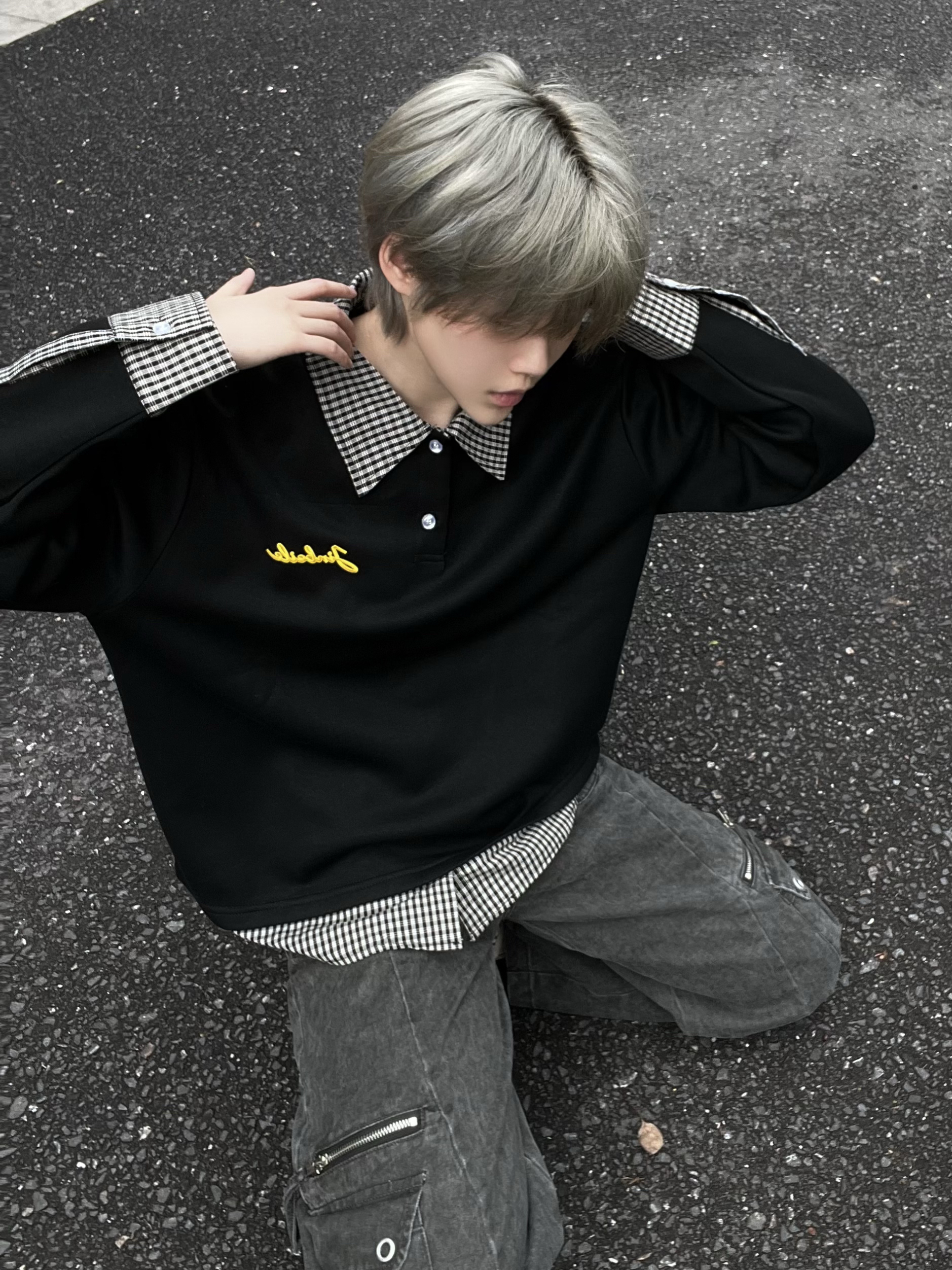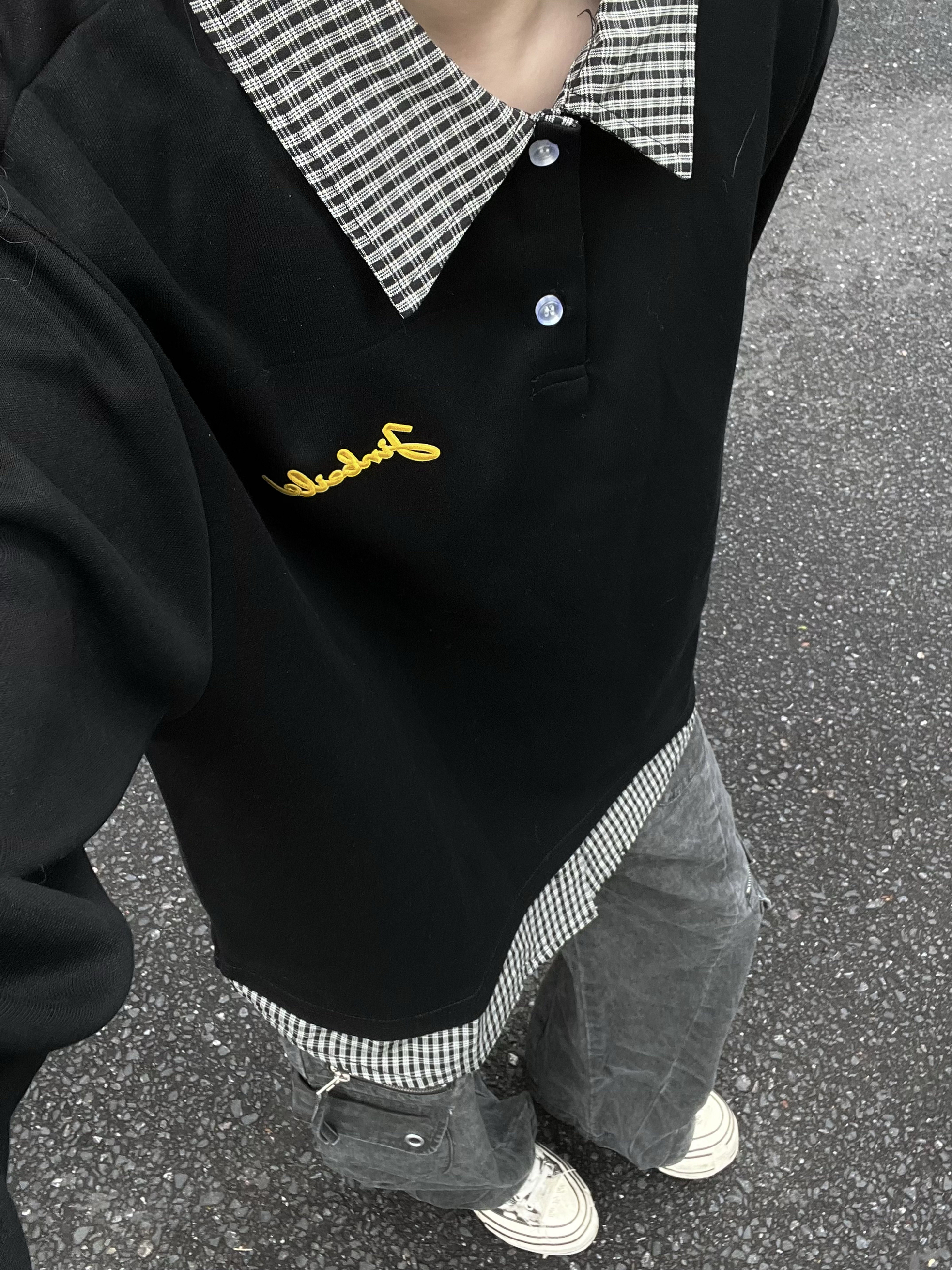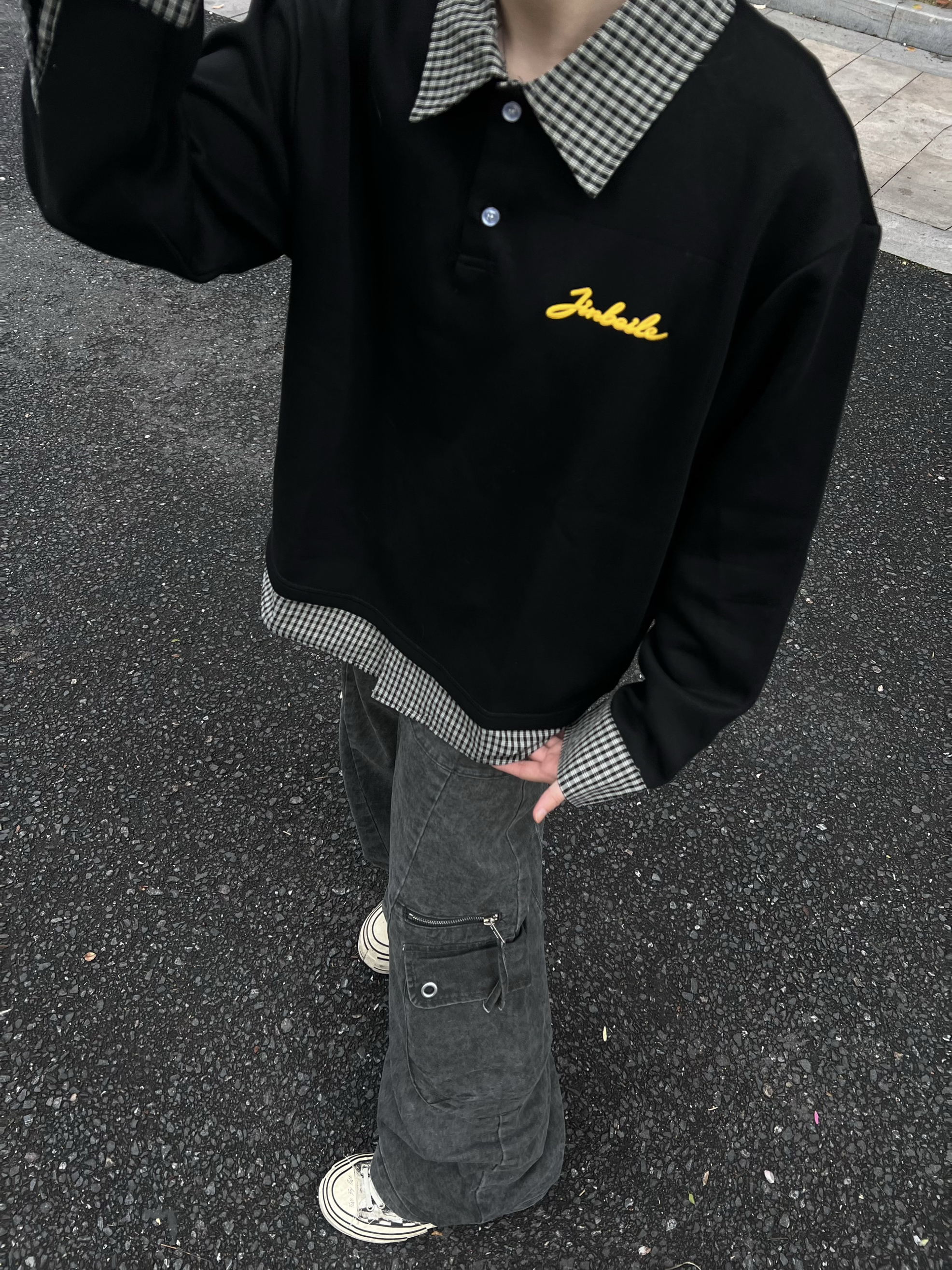 春天男生穿搭真的不用太复杂 一件假两件Polo衫就够了✨ 黑白格纹翻领+袖口假两件设计 不用自己叠穿,直接穿出层次感 黑色主体不挑身材,黄皮也能轻松驾驭 胸口的黄色刺绣字母,低调又有细节感 搭配做旧灰工装阔腿裤 松弛感直接拉满 日常出街、上学通勤都能穿 随便拍都很出片,韩系少年感这不就来了吗