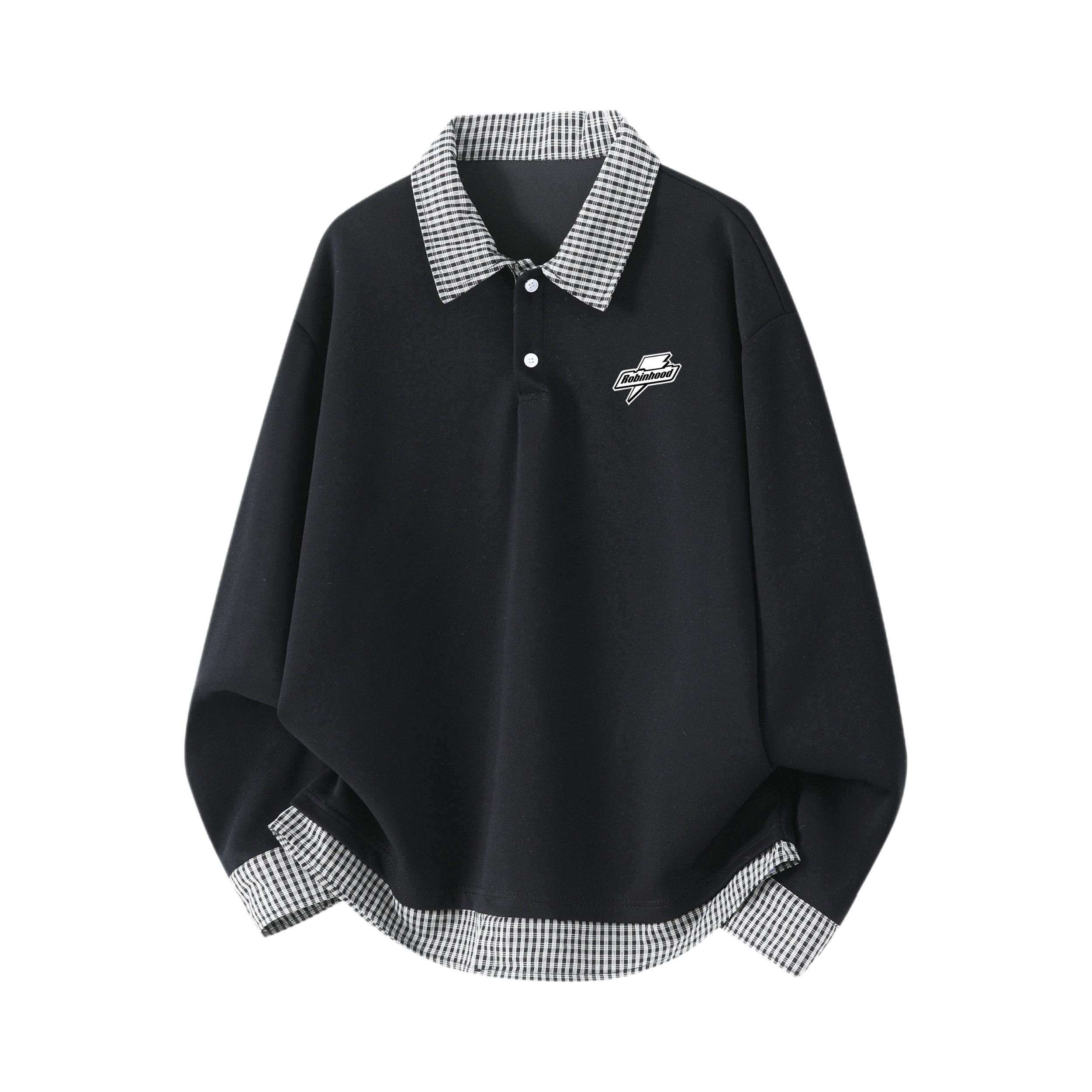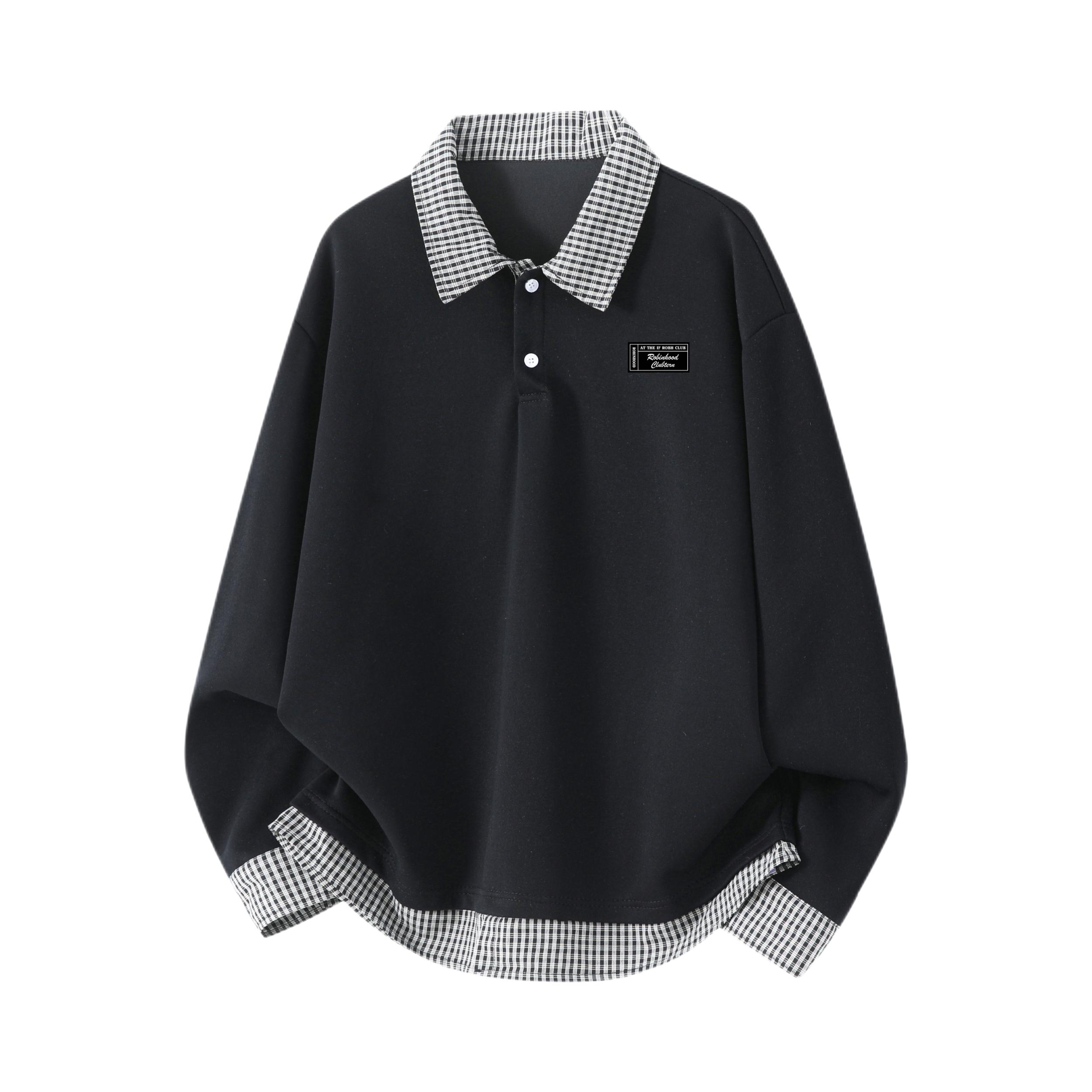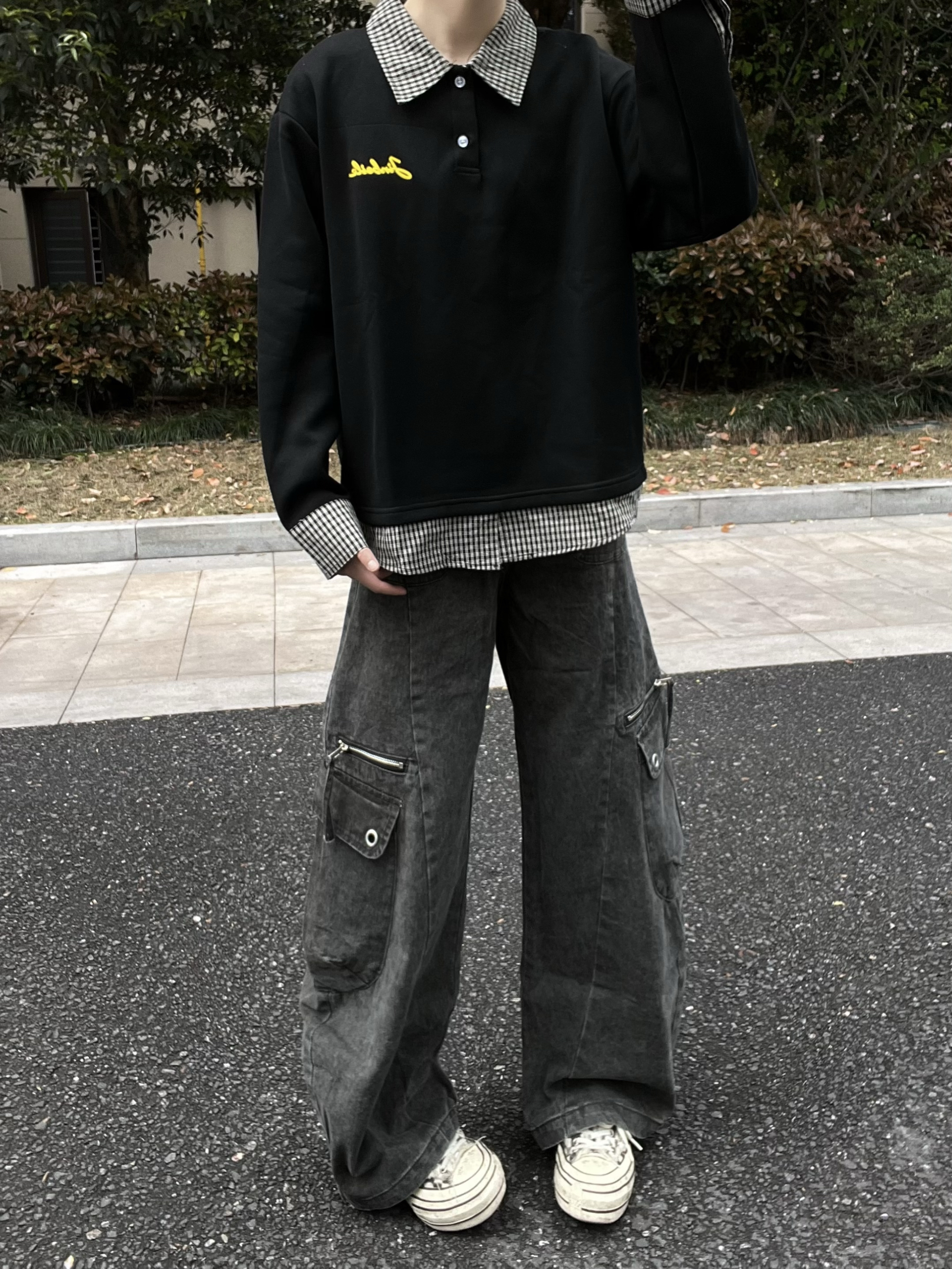 春天男生穿搭真的不用太复杂 一件假两件Polo衫就够了✨ 黑白格纹翻领+袖口假两件设计 不用自己叠穿,直接穿出层次感 黑色主体不挑身材,黄皮也能轻松驾驭 胸口的黄色刺绣字母,低调又有细节感 搭配做旧灰工装阔腿裤 松弛感直接拉满 日常出街、上学通勤都能穿 随便拍都很出片,韩系少年感这不就来了吗