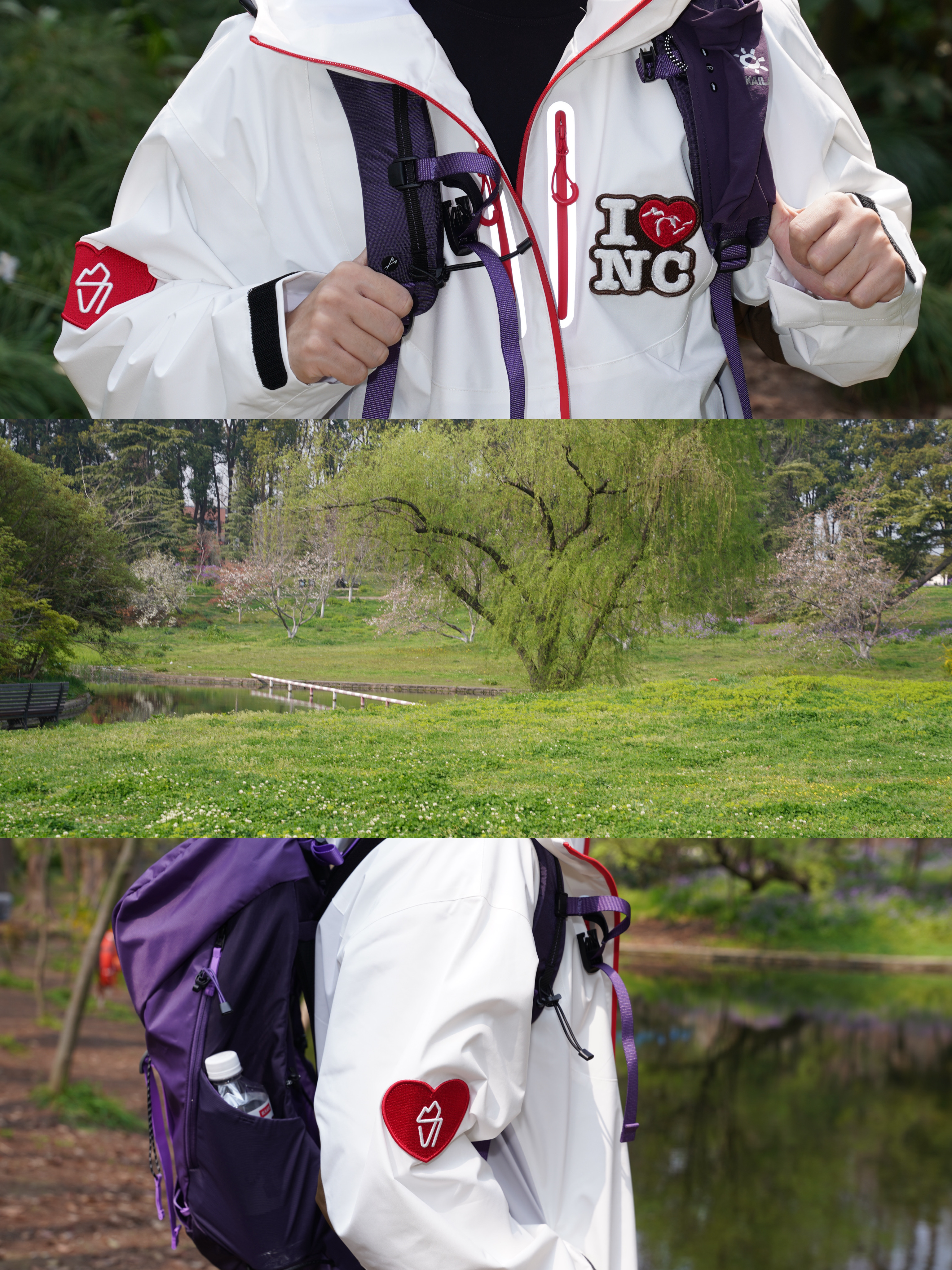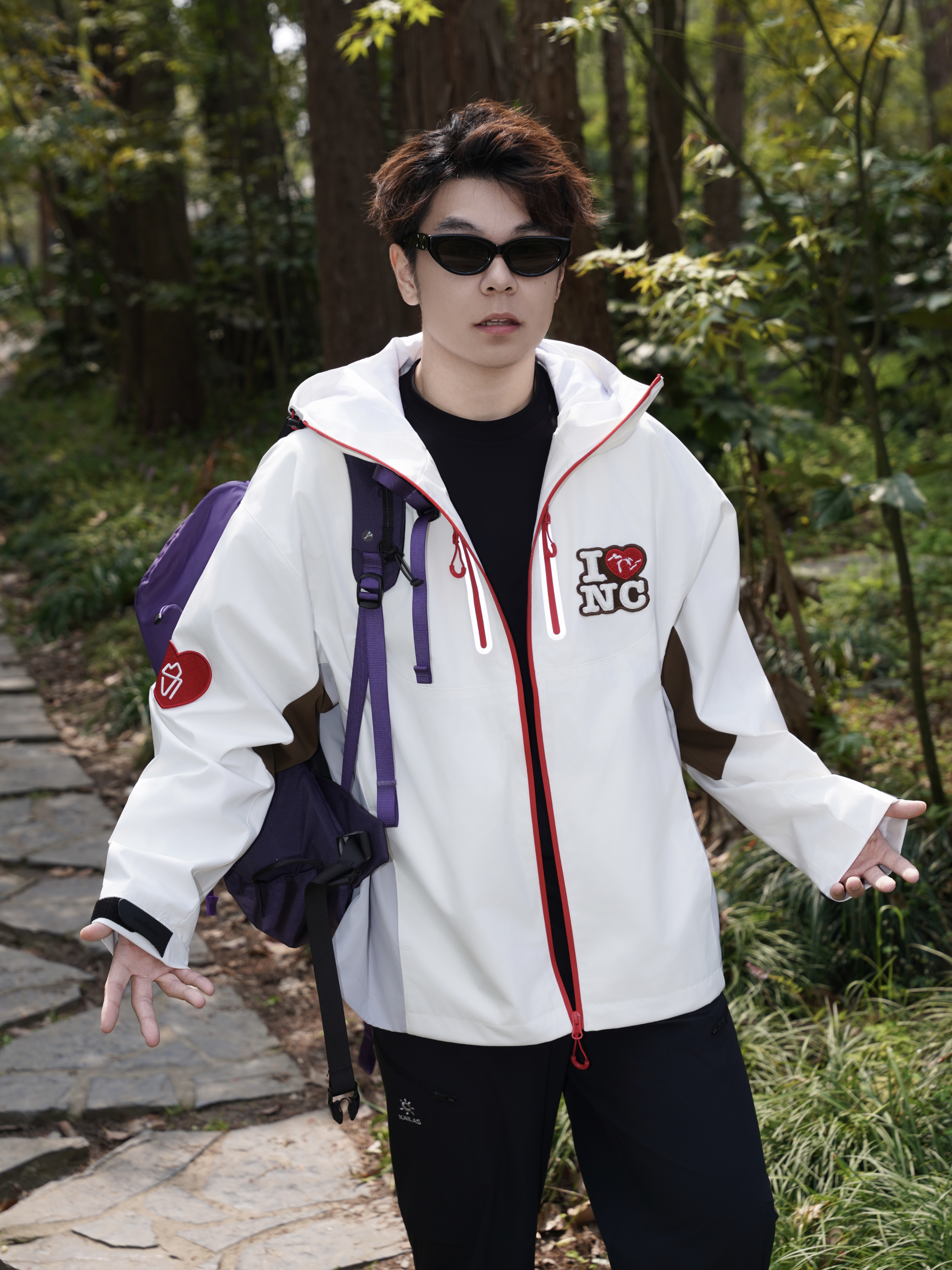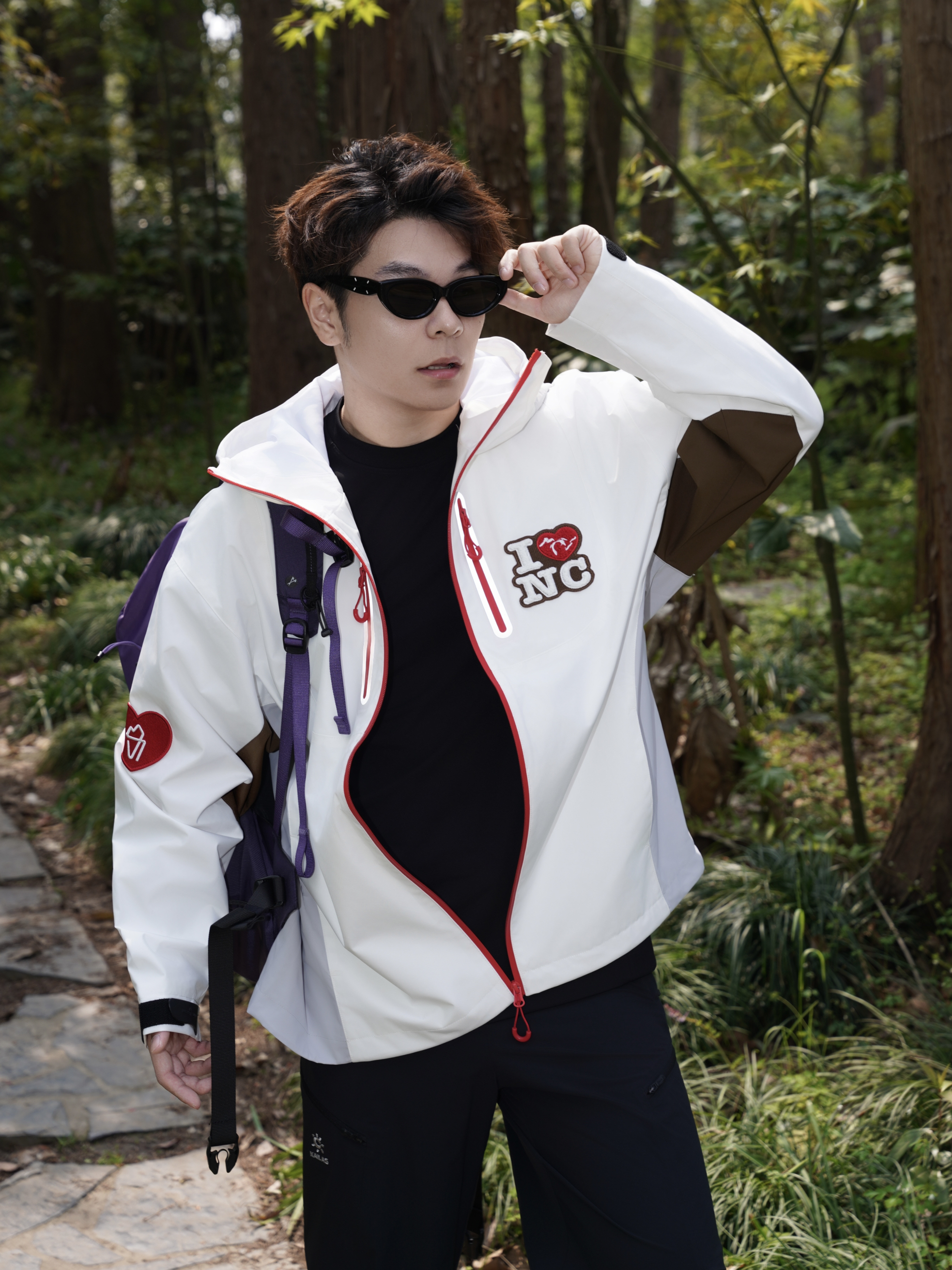 - 周末出门穿了这件冲锋衣,白色底配红色拼色,干干净净又有点不一样。胸前和手臂的毛巾绣花章是细节彩蛋,不张扬但很加分。 - 防风防水面料对轻户外太友好,突然下雨也不慌,而且透气不闷。设计感在线但不会用力过猛,搭配了凯乐石的软壳裤,这套日常通勤穿或者徒步都行。 -