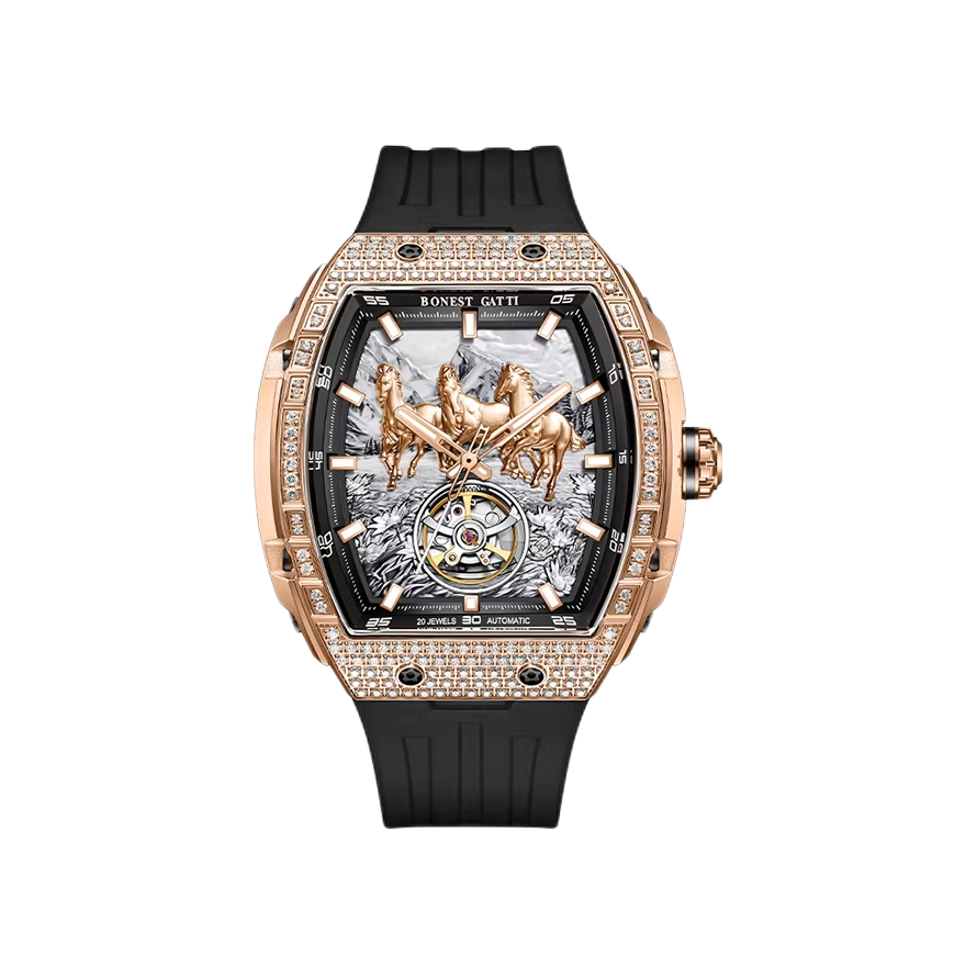 本篇笔记关联了BONEST GATTI/布加迪 马年生肖限量款满钻潮流全自动机械男士手表 玫金黑 BG5006-R1等商品,为用户提供真实的使用体验和购买参考。