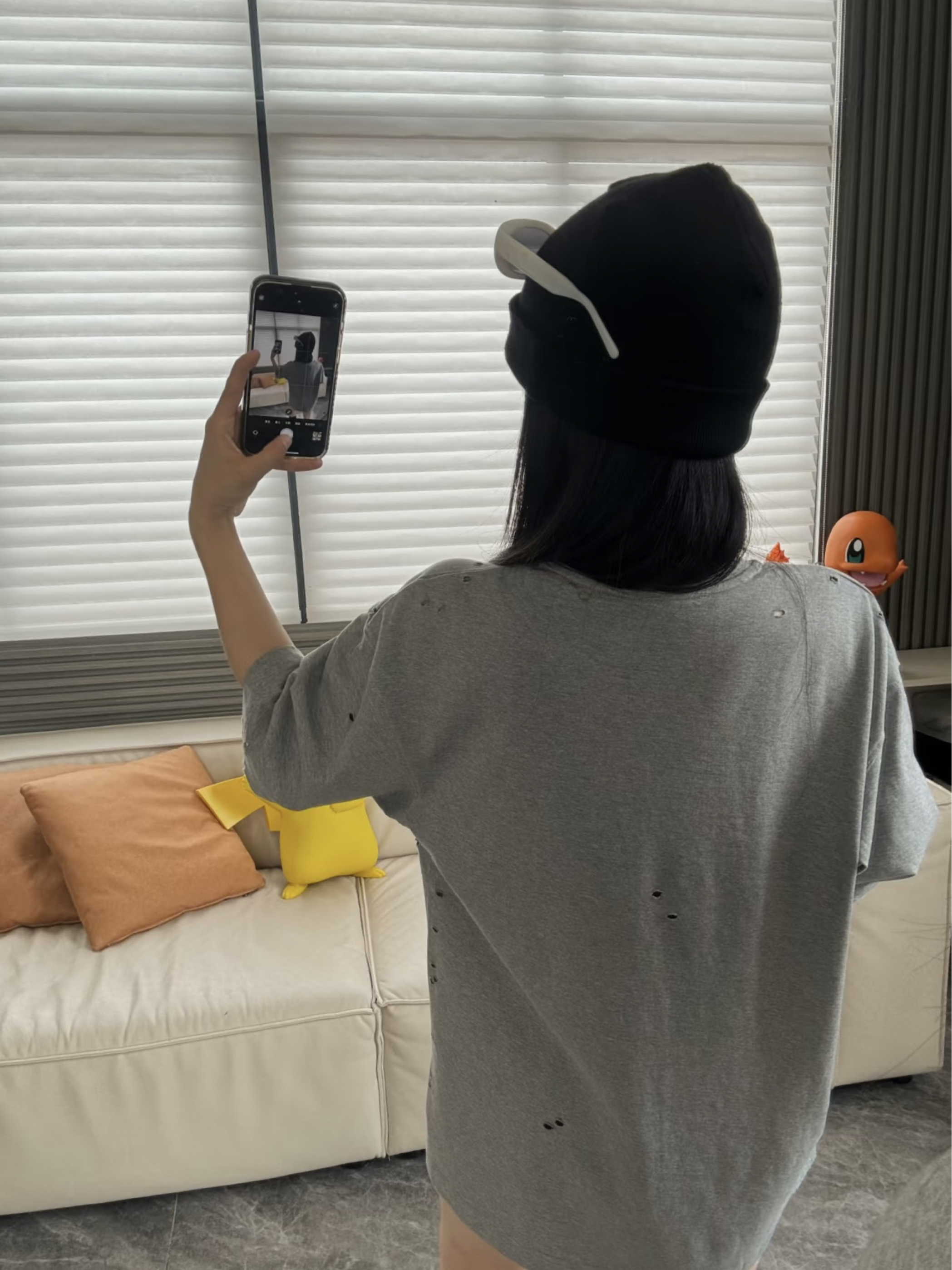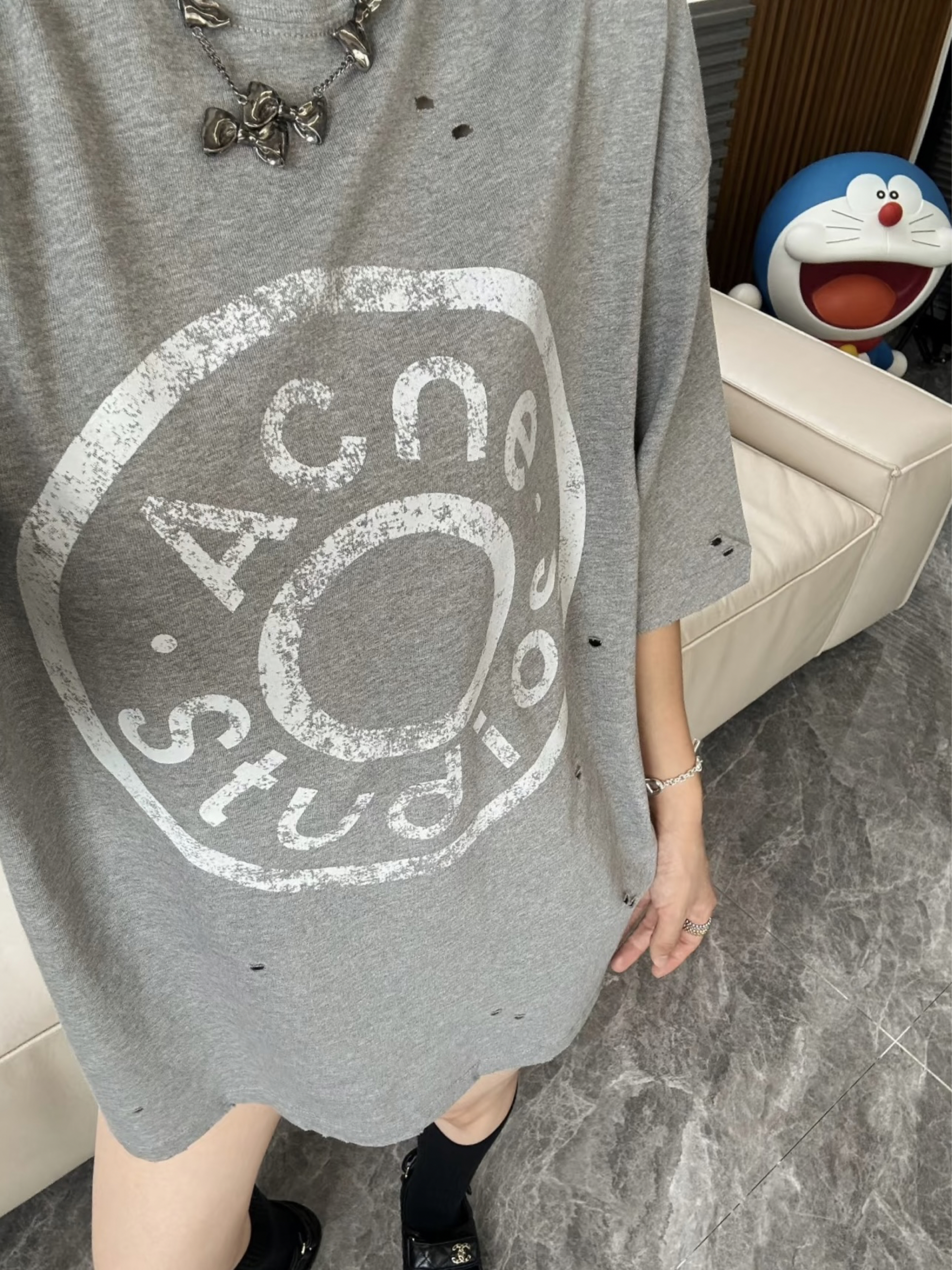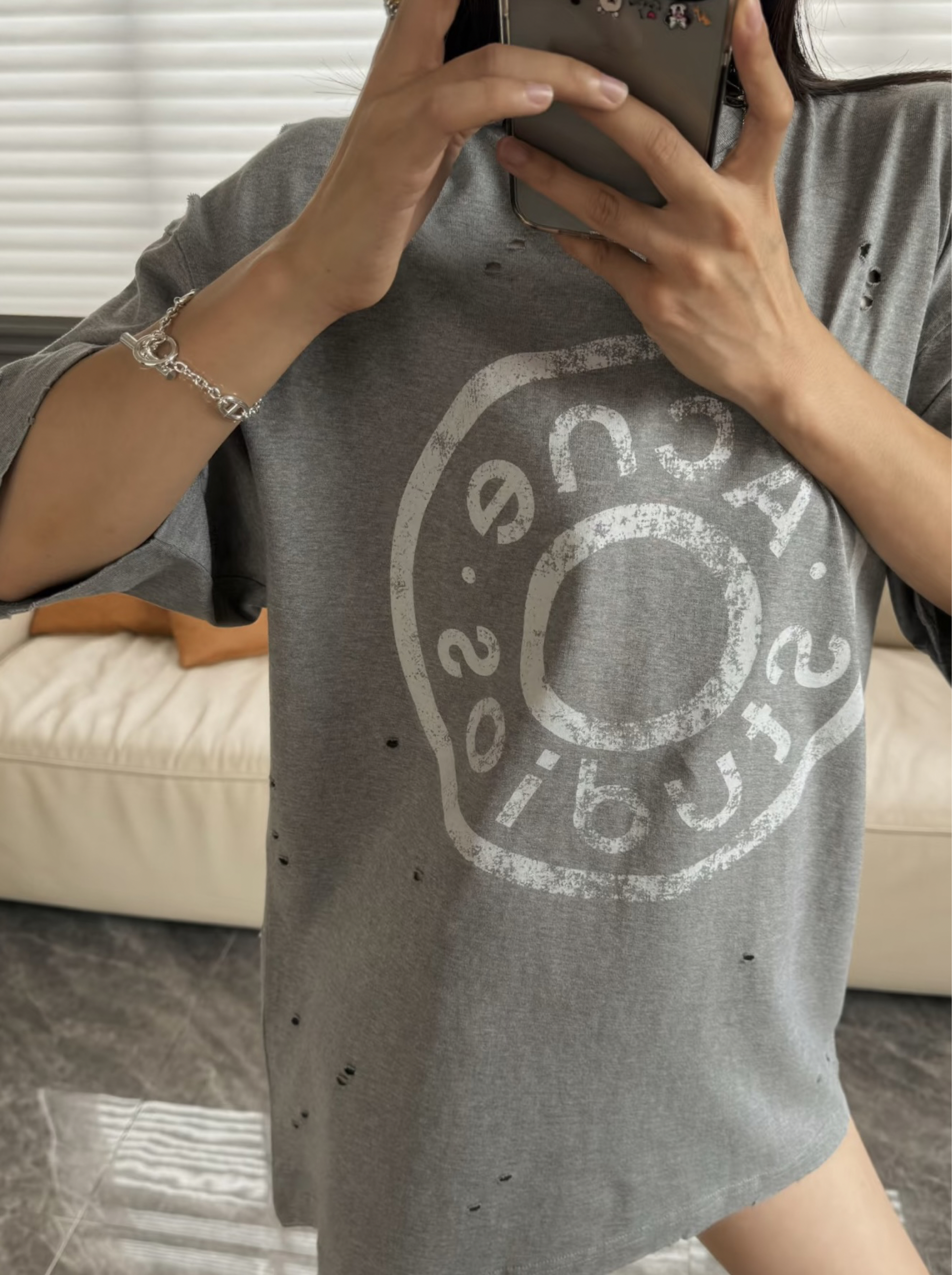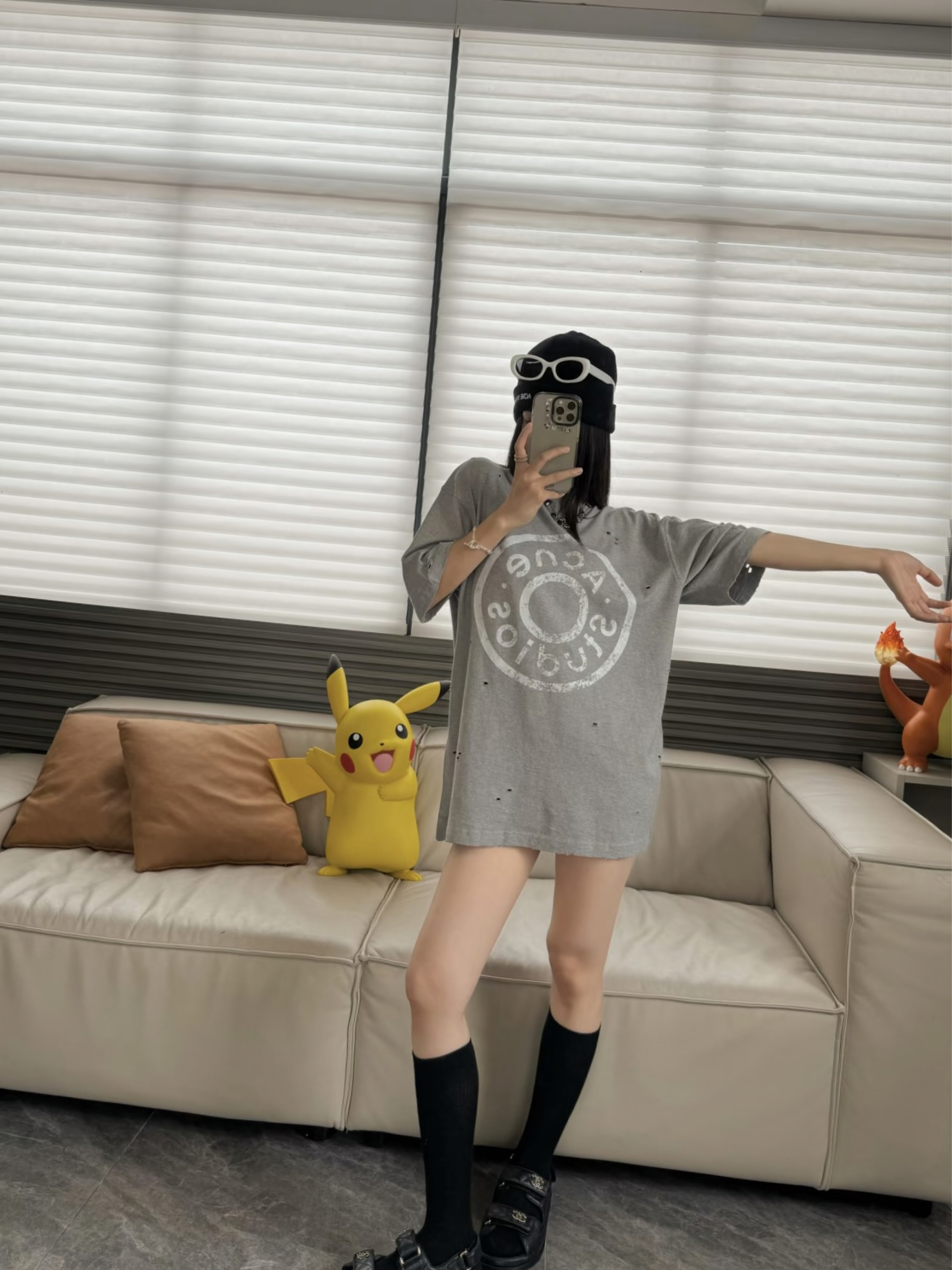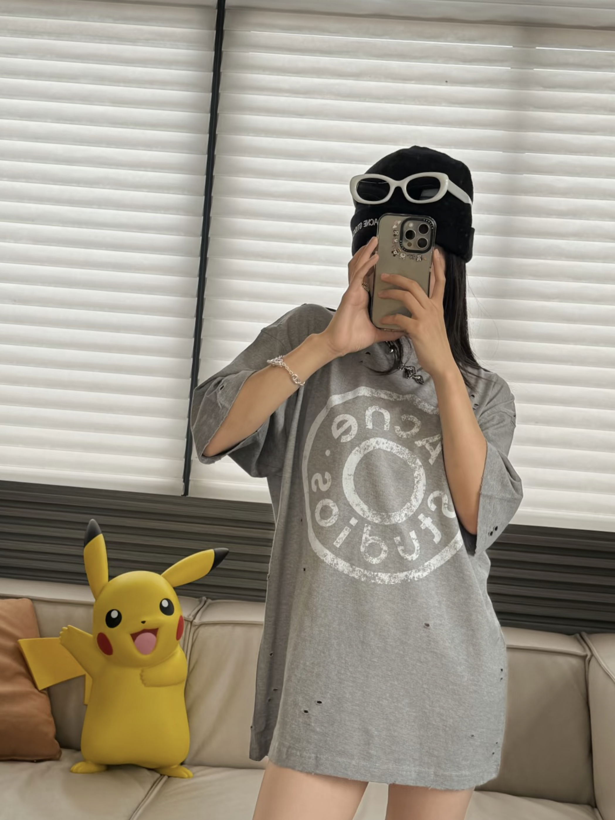 这件Acne Studios做旧灰T恤真的太懂潮人了!做旧磨白的圆形logo印花自带复古滤镜,不规则破洞设计又添了几分随性酷感,完全不撞款。 宽松落肩版型对身材包容性超强,下衣失踪穿法直接拉满辣度,日常搭短裤、leggings都超有范儿。 重磅棉料质感在线,上身透气不闷汗,做旧工艺越穿越有味道。不管是出街炸街还是日常通勤,都能轻松穿出高级松弛感,潮人闭眼入不亏!