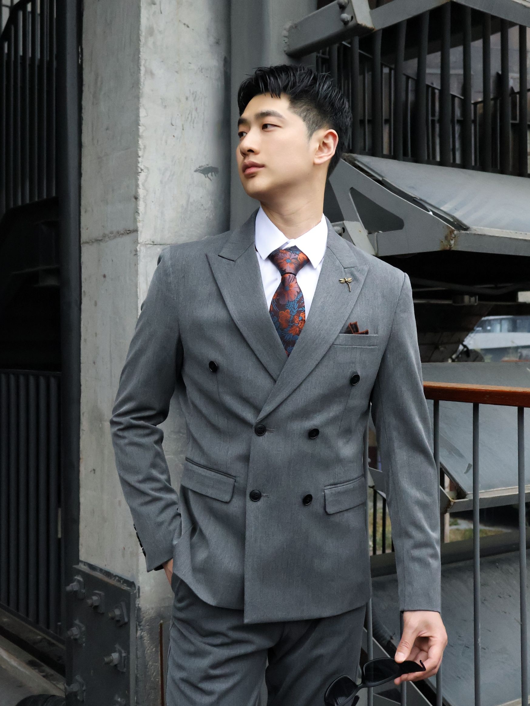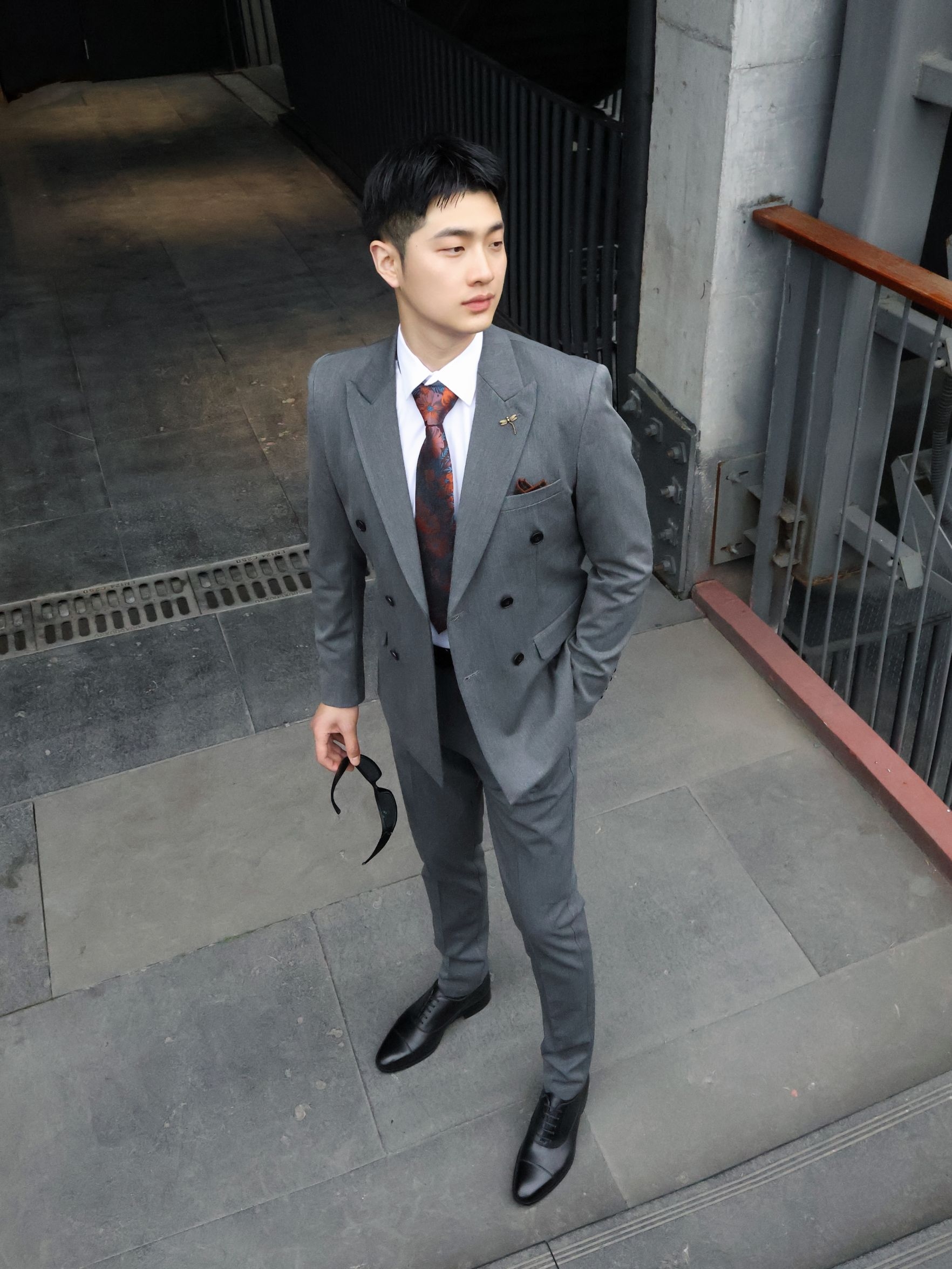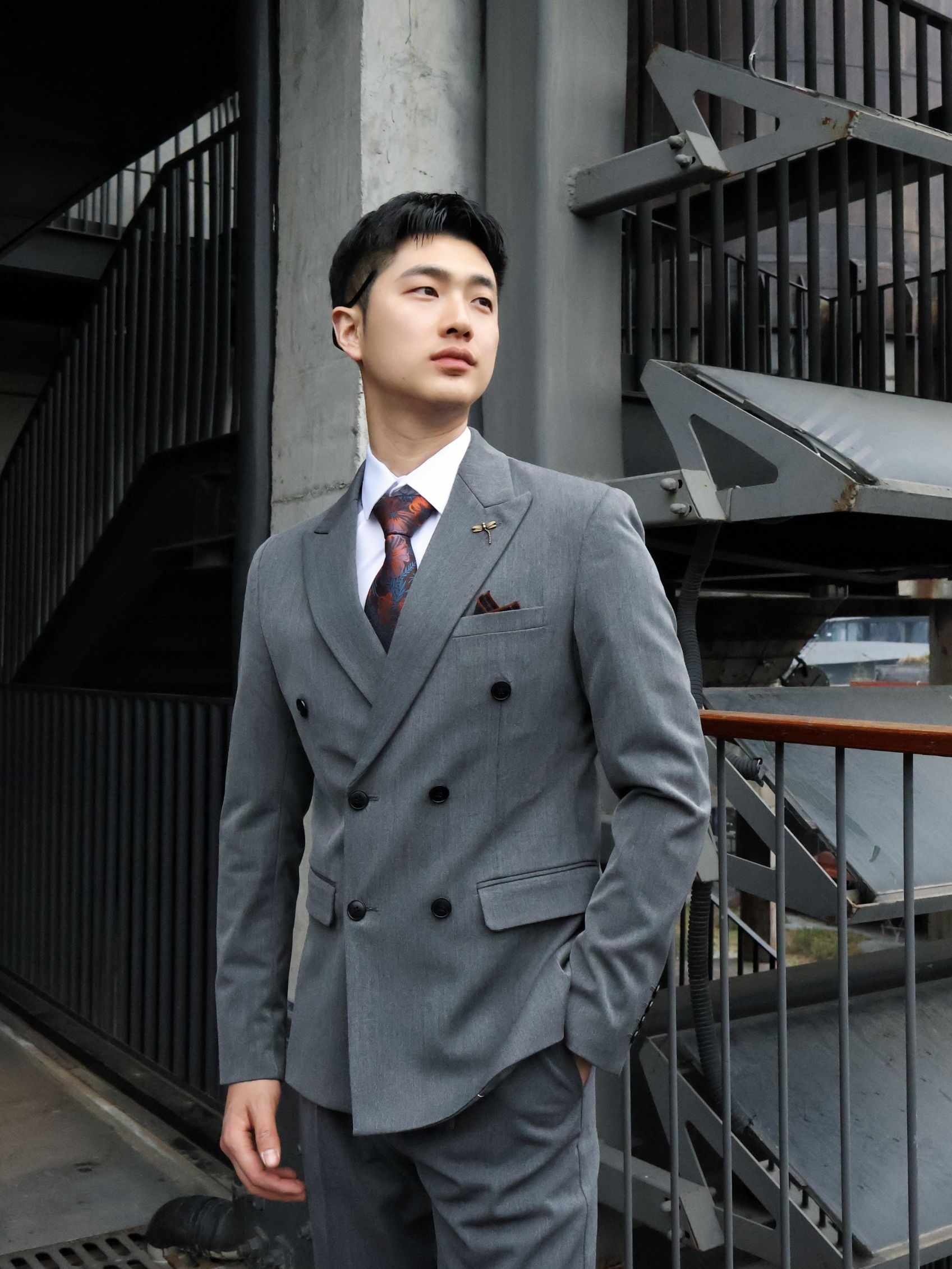不帅的西装我不穿!! 双排扣西装真的很有氛围感~ 浅灰色双排扣长在我的审美上了~ 正式感和松弛感直接拉满! 版型很好,挺括但不僵硬~ 内搭选了基础白衬衫~ 配了一条复古红棕花纹领带,瞬间就有了层次感~