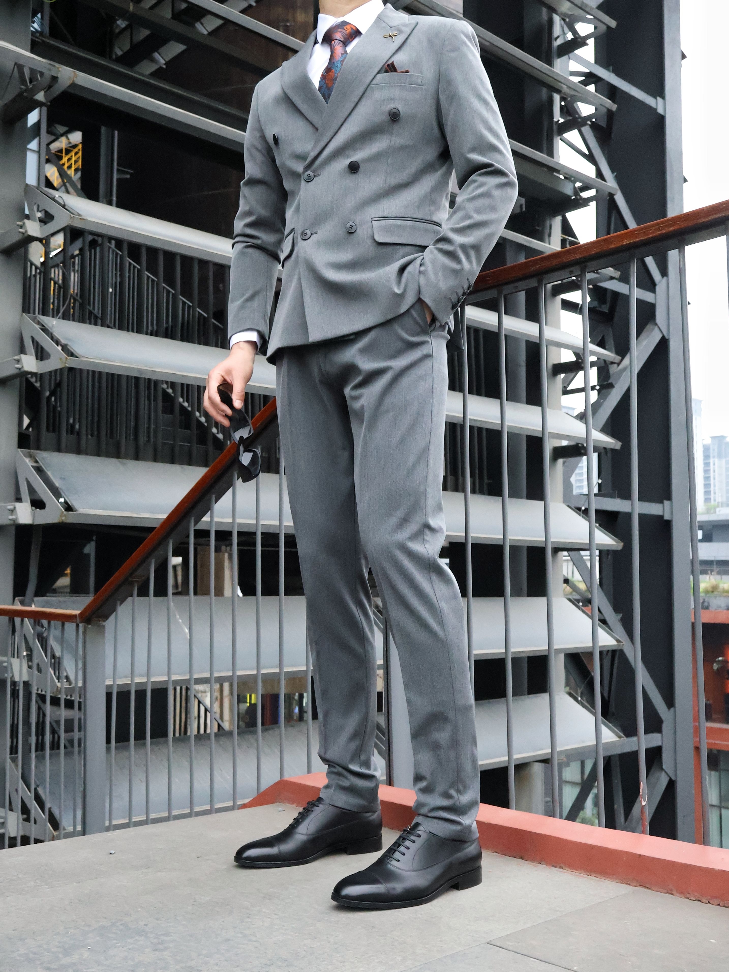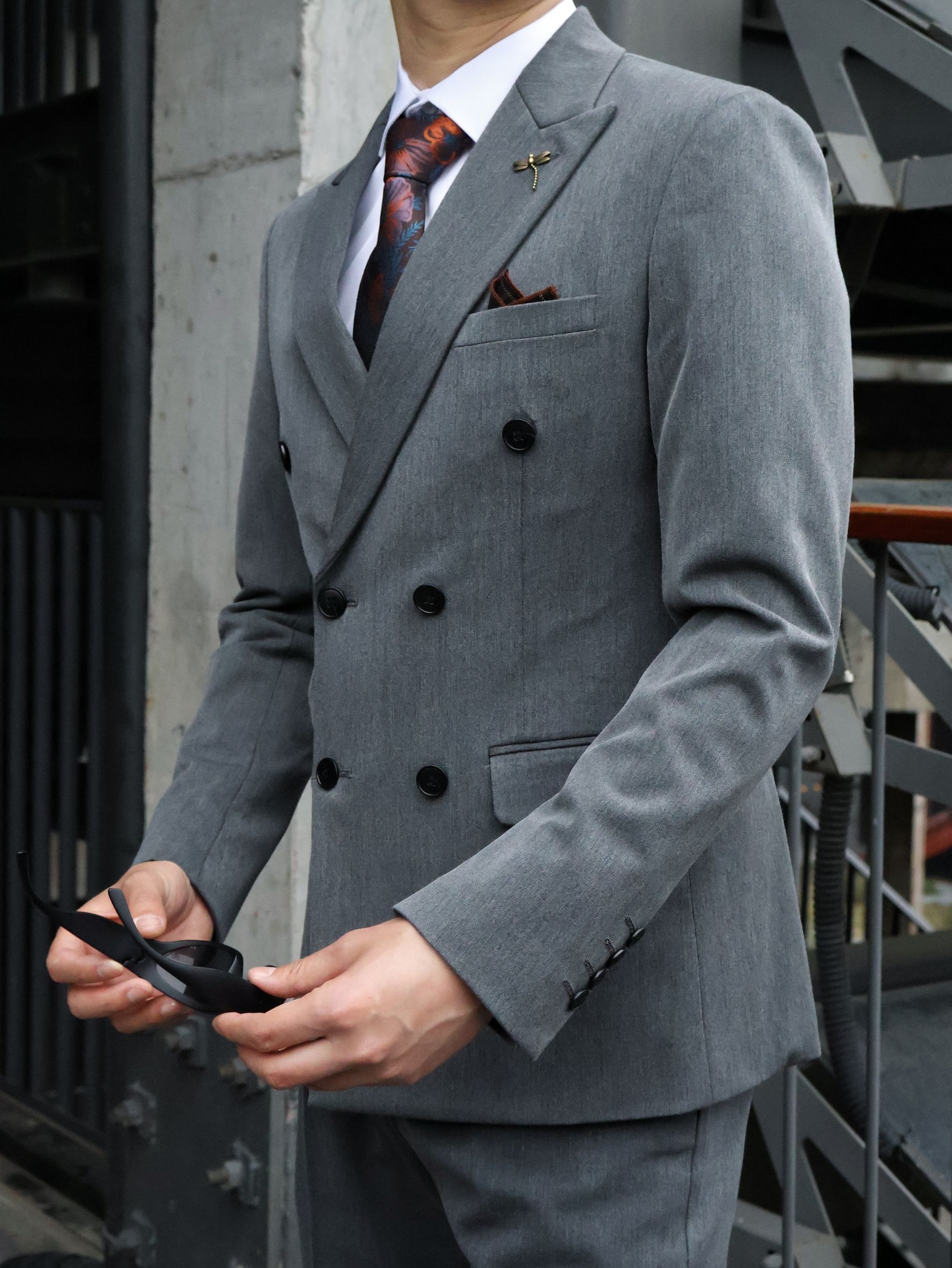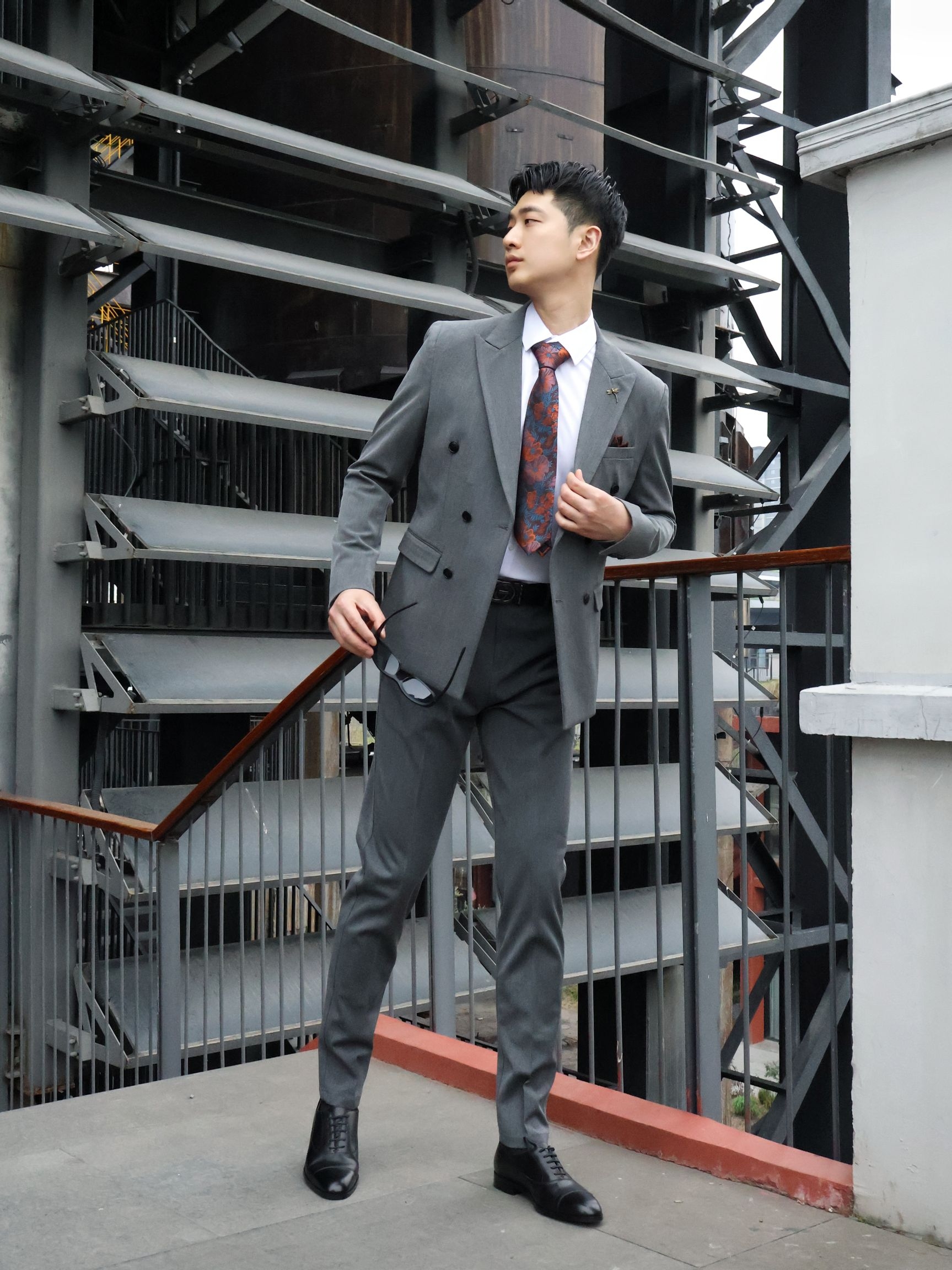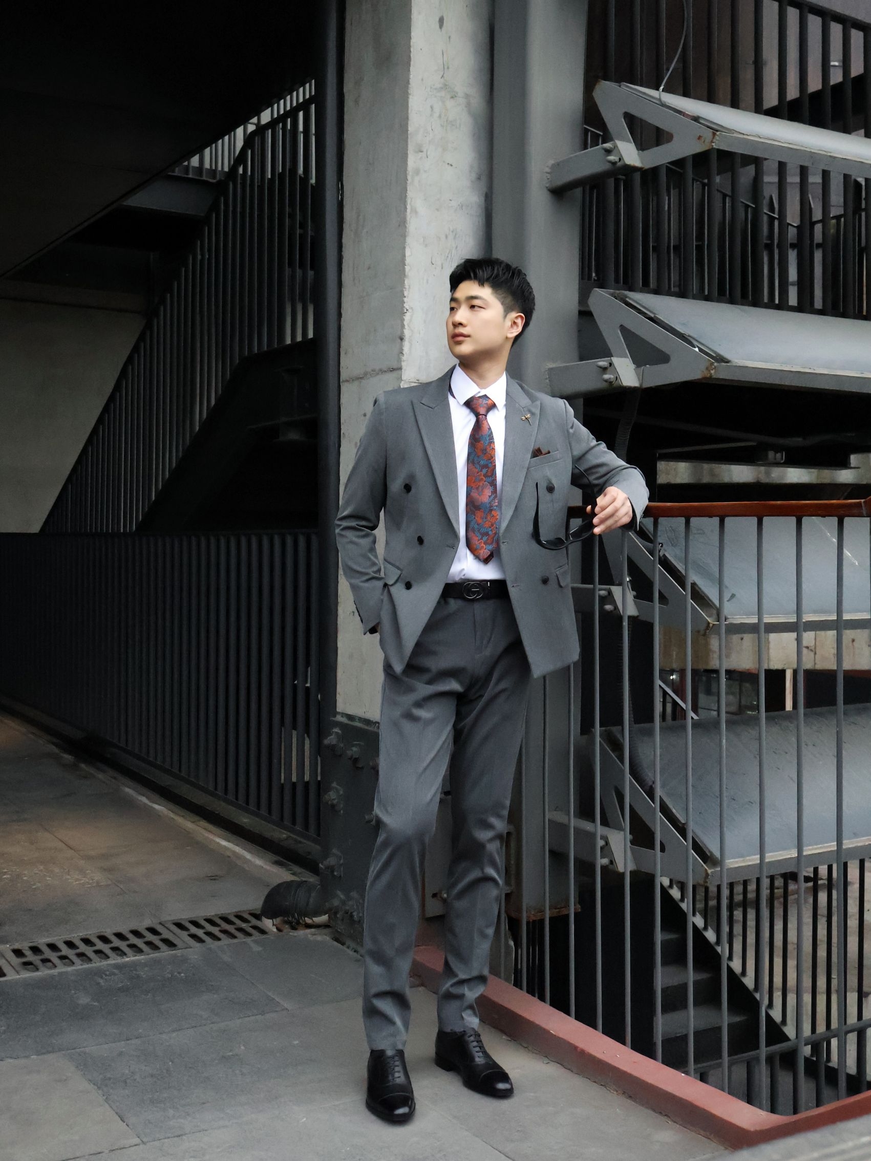 不帅的西装我不穿!! 双排扣西装真的很有氛围感~ 浅灰色双排扣长在我的审美上了~ 正式感和松弛感直接拉满! 版型很好,挺括但不僵硬~ 内搭选了基础白衬衫~ 配了一条复古红棕花纹领带,瞬间就有了层次感~