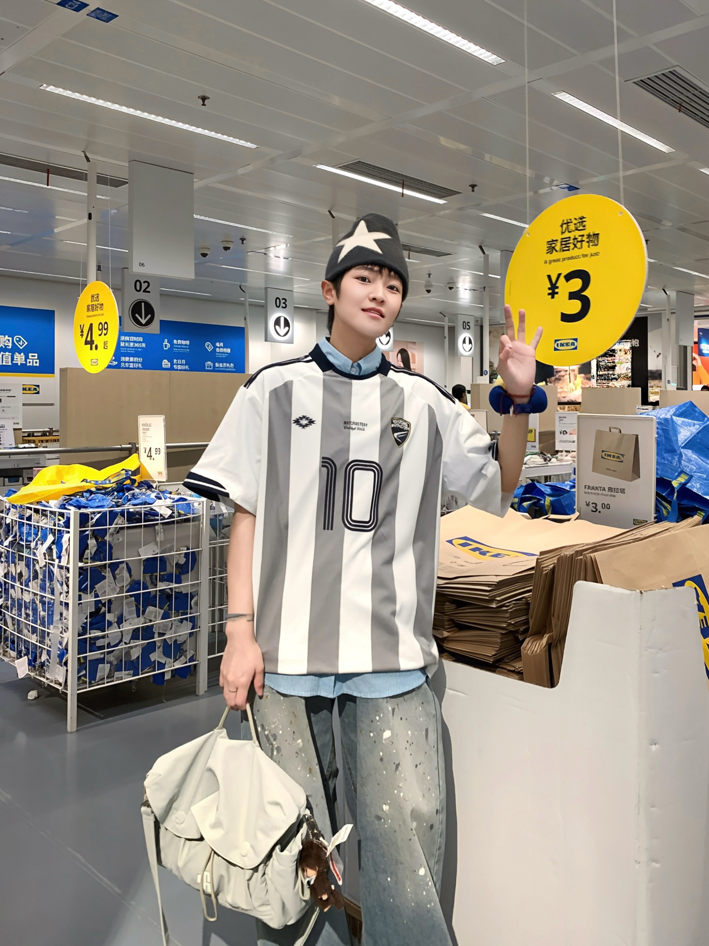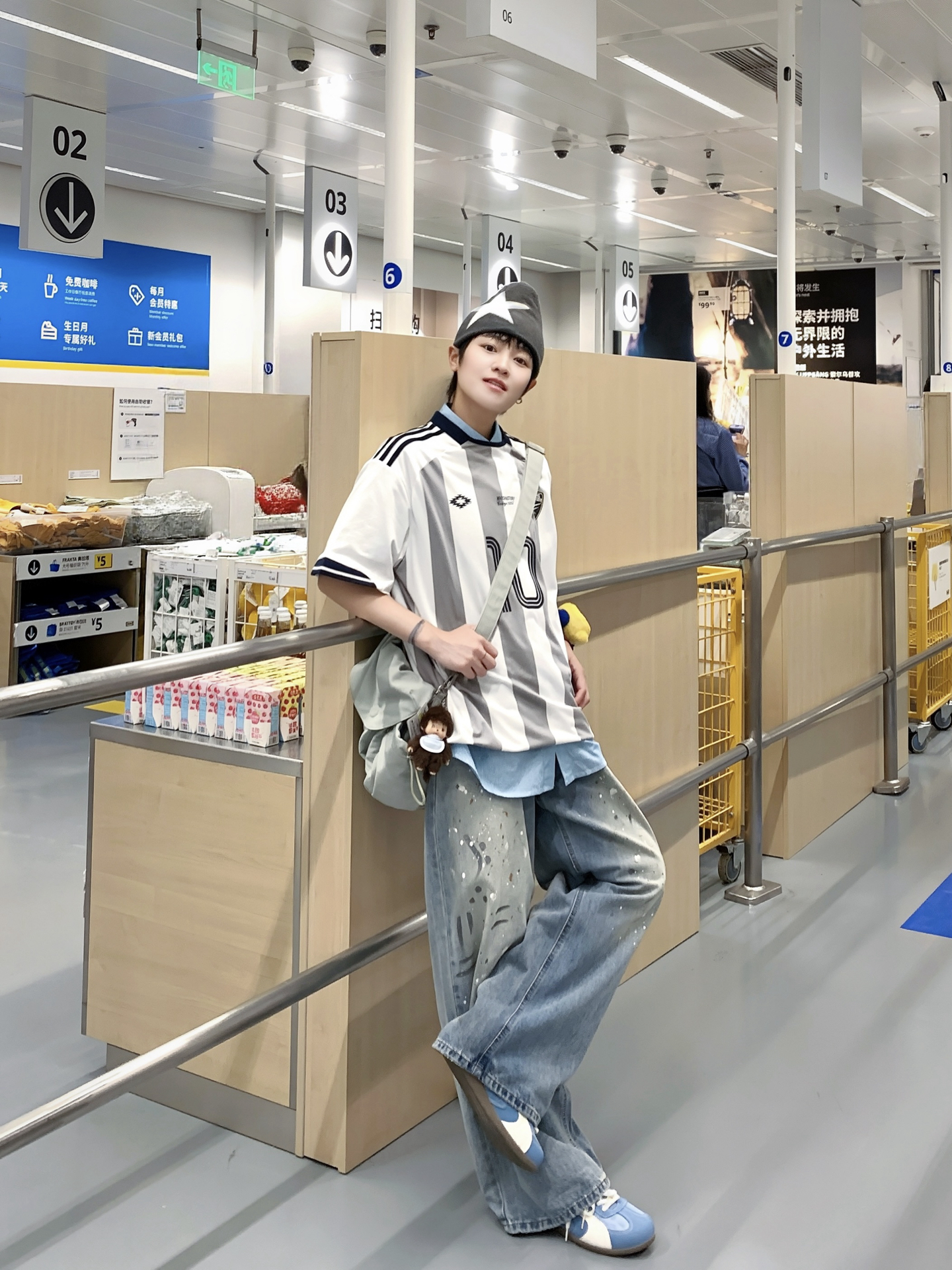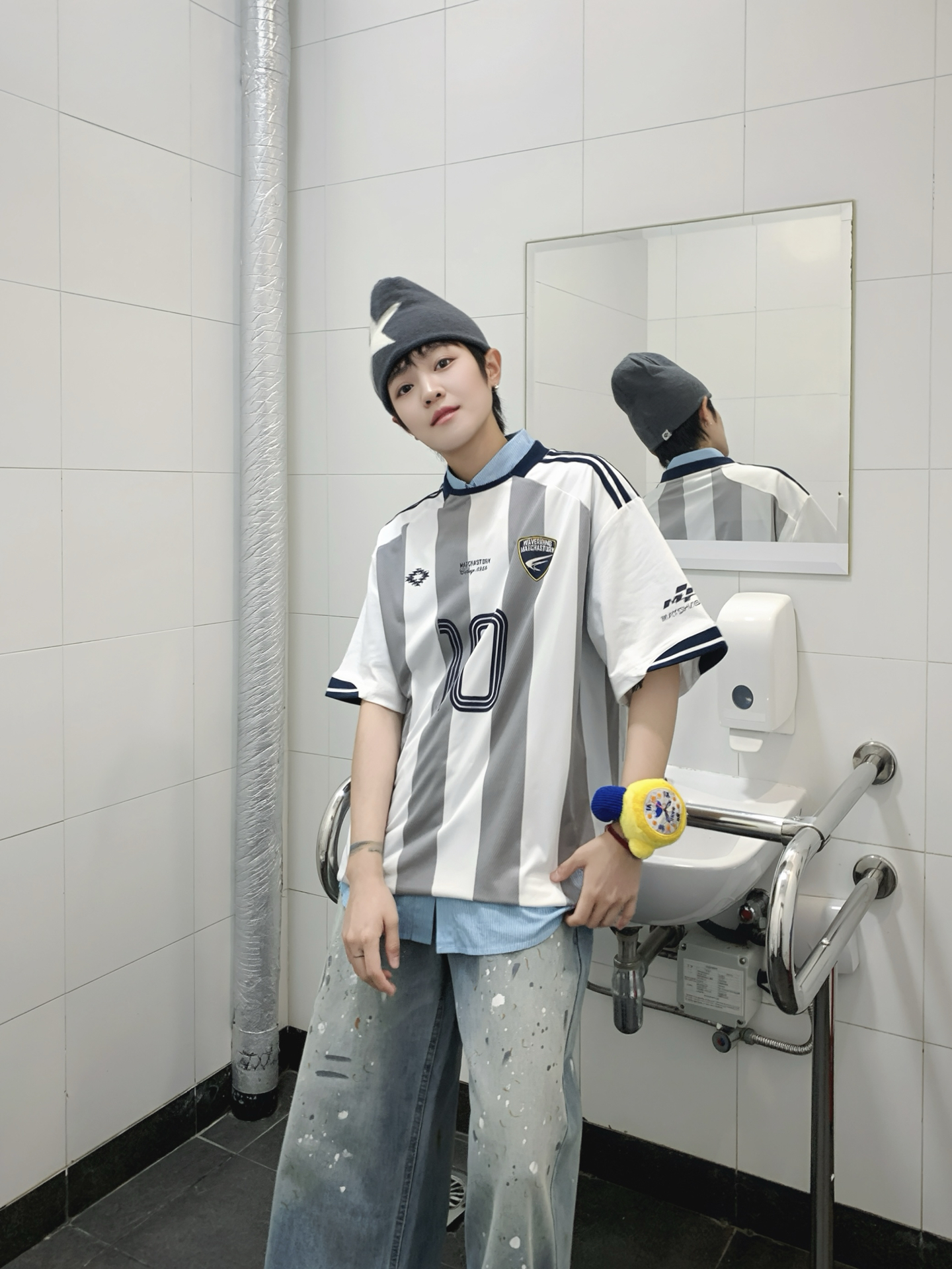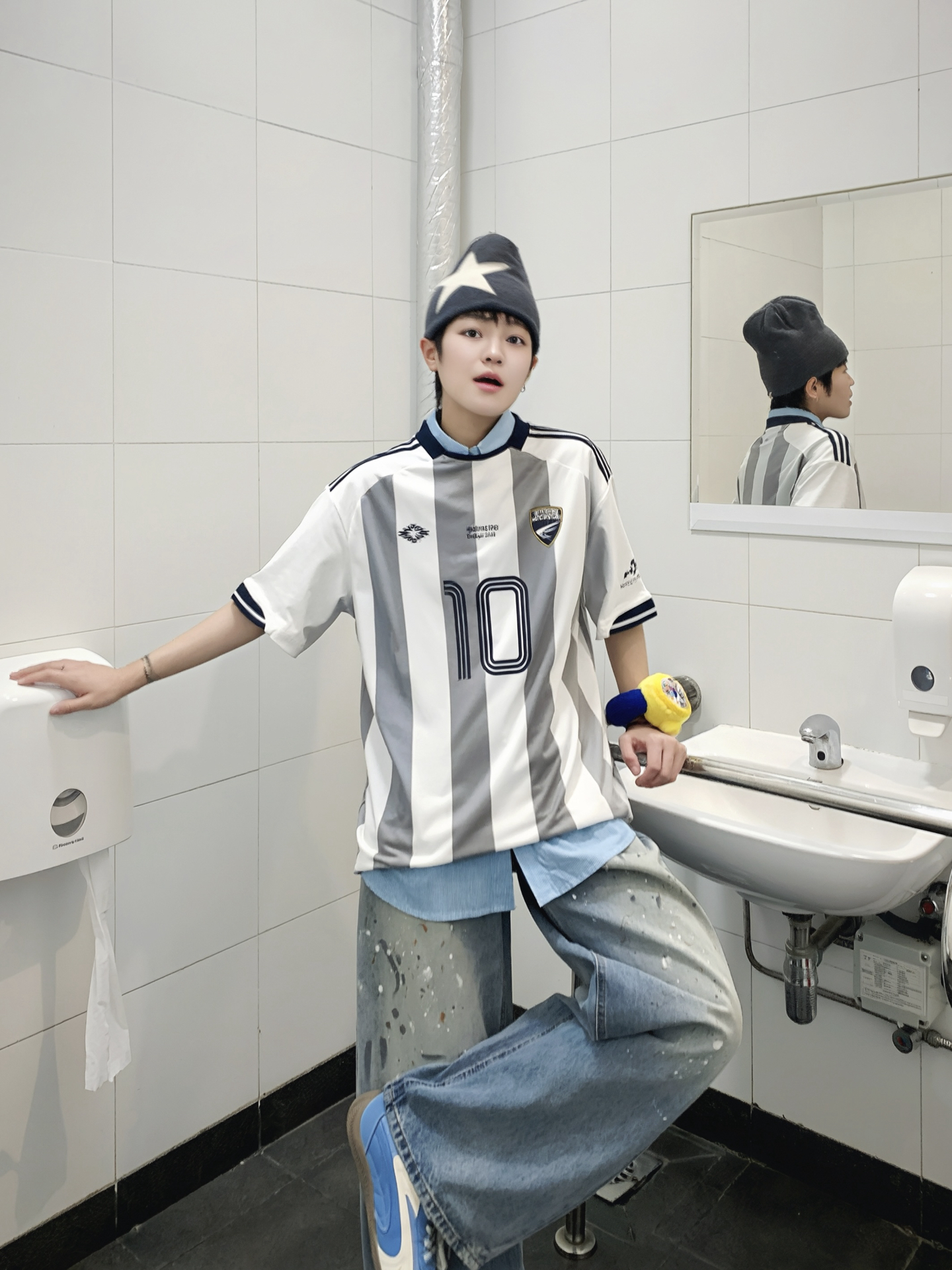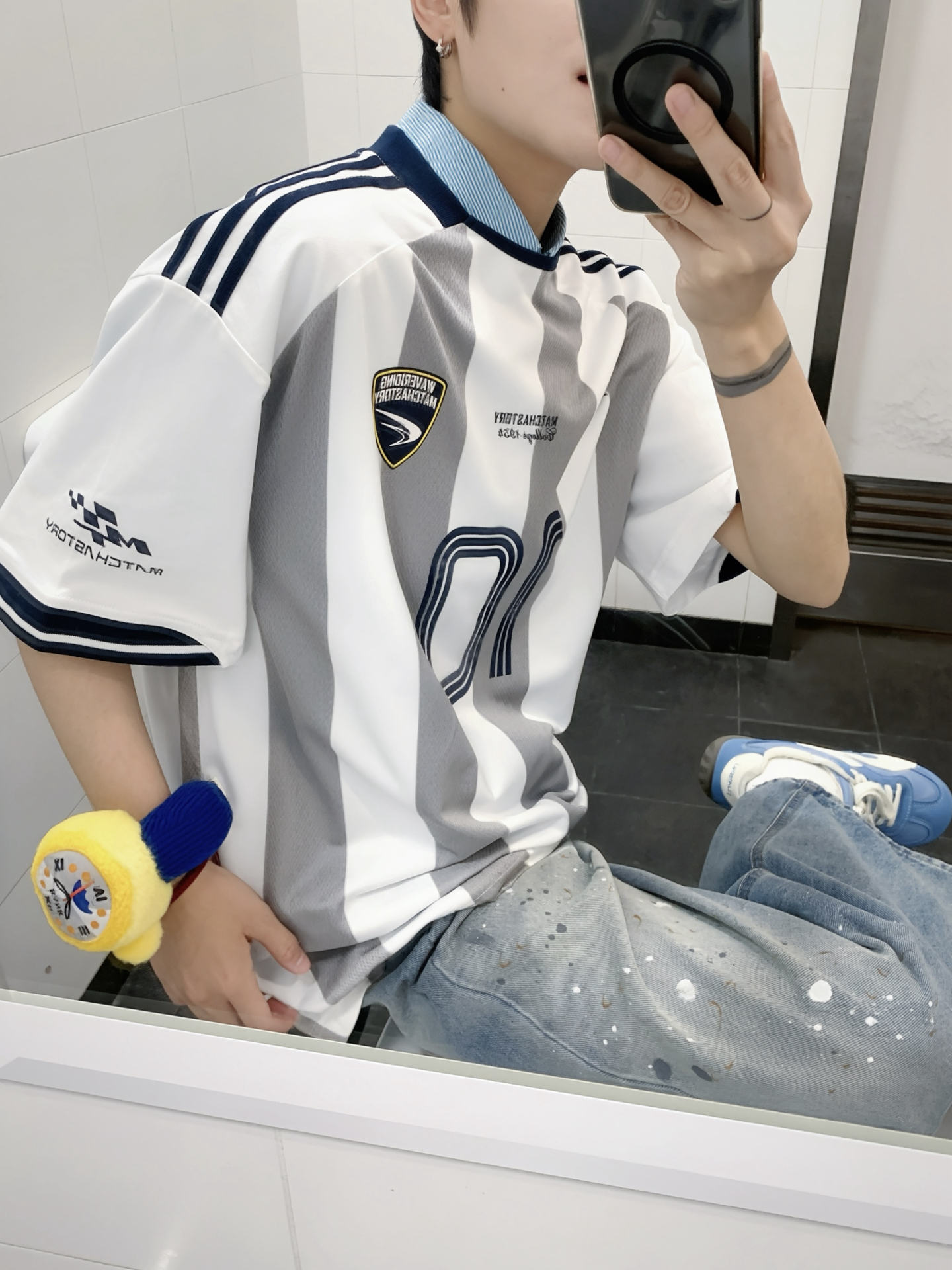 163 48 👔 STORY 学院系列经典竖条纹足球衫 🔓球服新穿法 来点🏎️赛车服混搭一下 运动街头风妥妥拿捏 内搭一件衬衫在里面整体更有叠穿感 👖 宽松阔腿泼墨直筒牛仔裤 163 48上身M比较宽松 做旧泼墨设计感十足 日常搭配球服也氛围感十足 不论是街头感还是日常早八穿搭 都能通通驾驭 一条本命牛仔裤 承包时髦穿搭