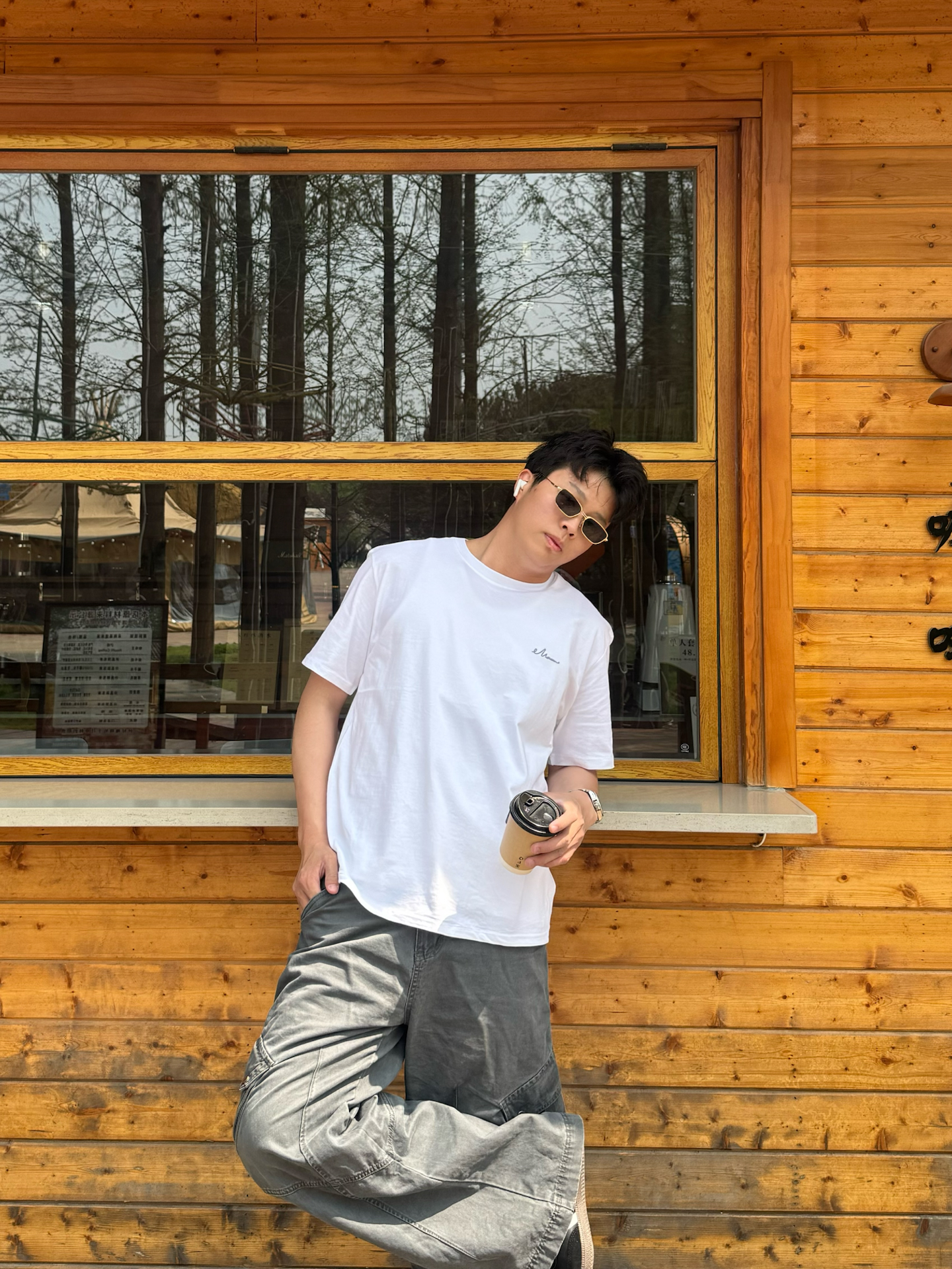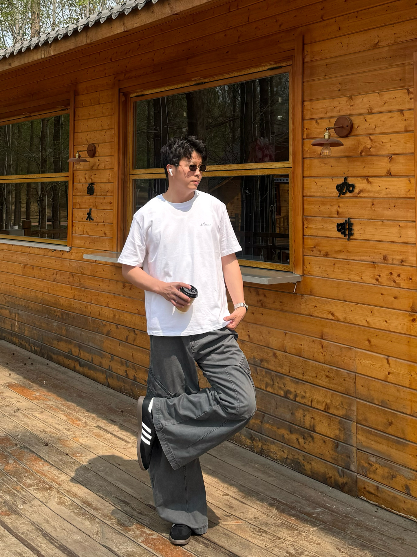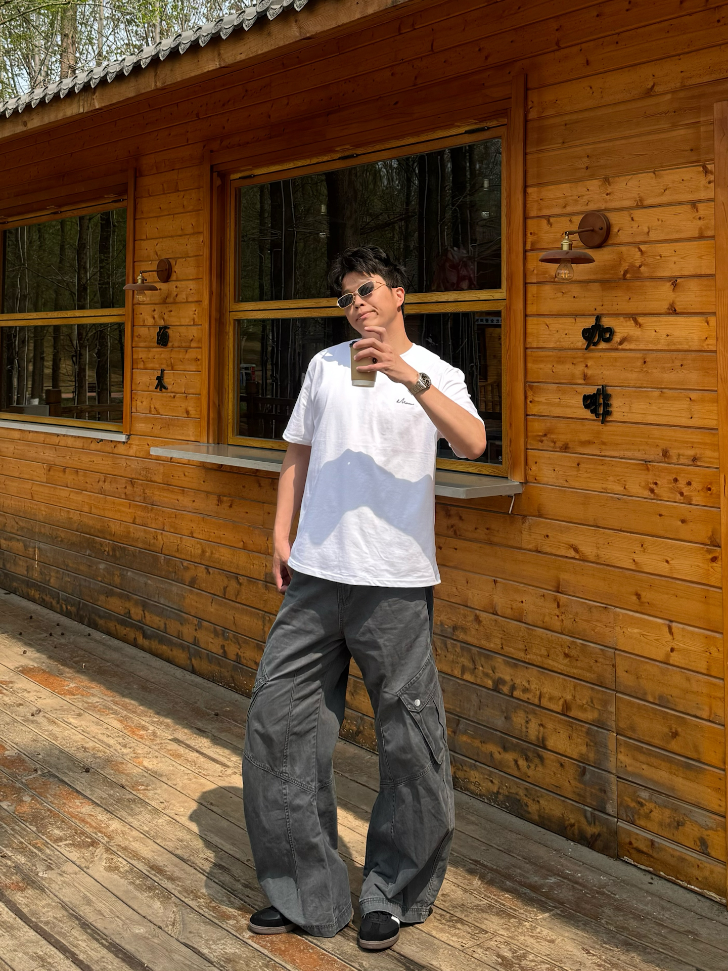 夏天真的就爱穿这种简单不出错的搭配 一件基础款白T版型宽松点藏肉又舒服 随便穿穿都有少年感 搭配这条深灰色工装裤口袋设计挺有质感 裤型宽松不贴腿夏天穿不闷腿 鞋子配了双百搭的运动鞋整体走的是松弛感路线 出门逛逛这套穿搭舒适度和颜值都在线