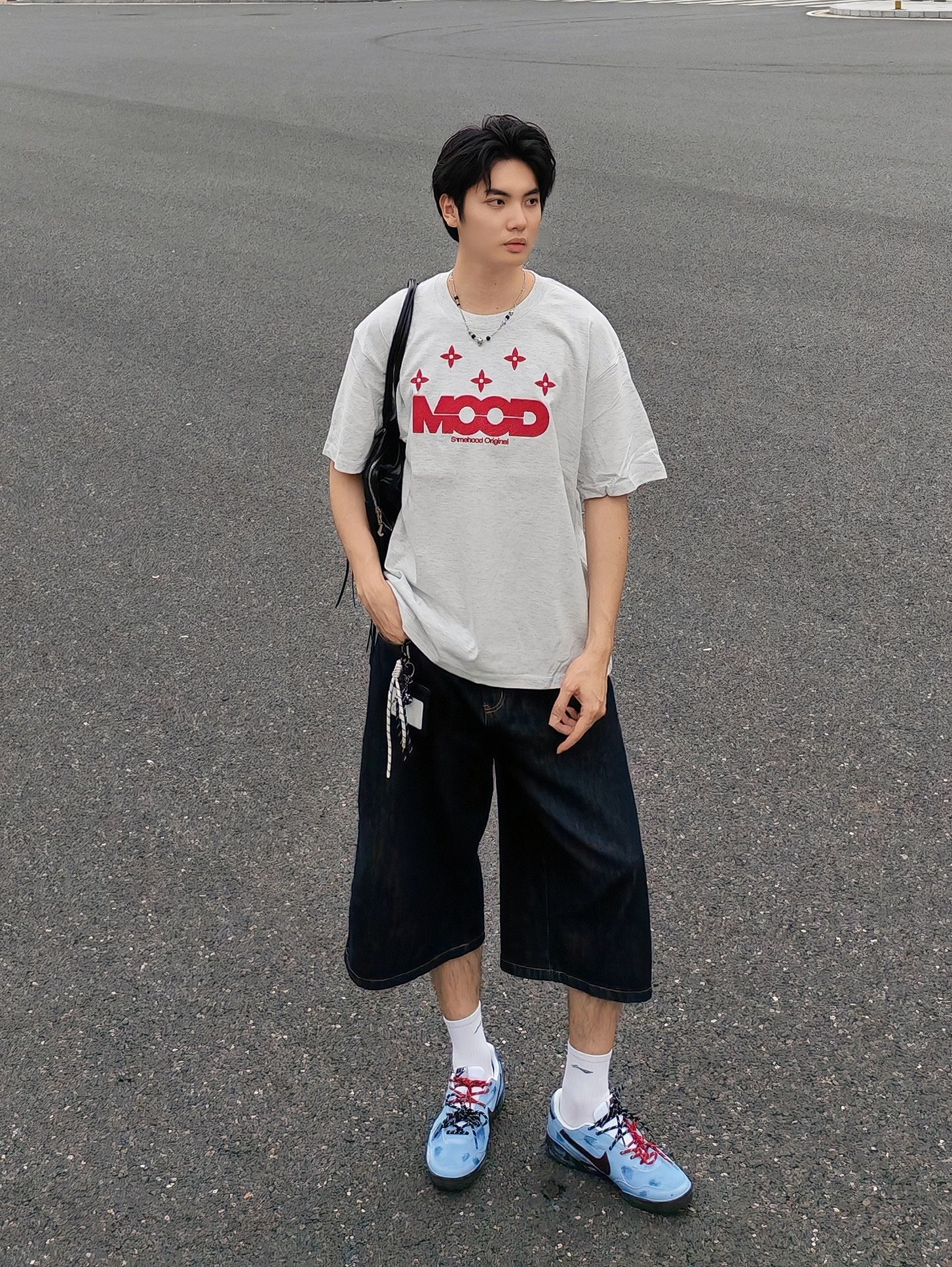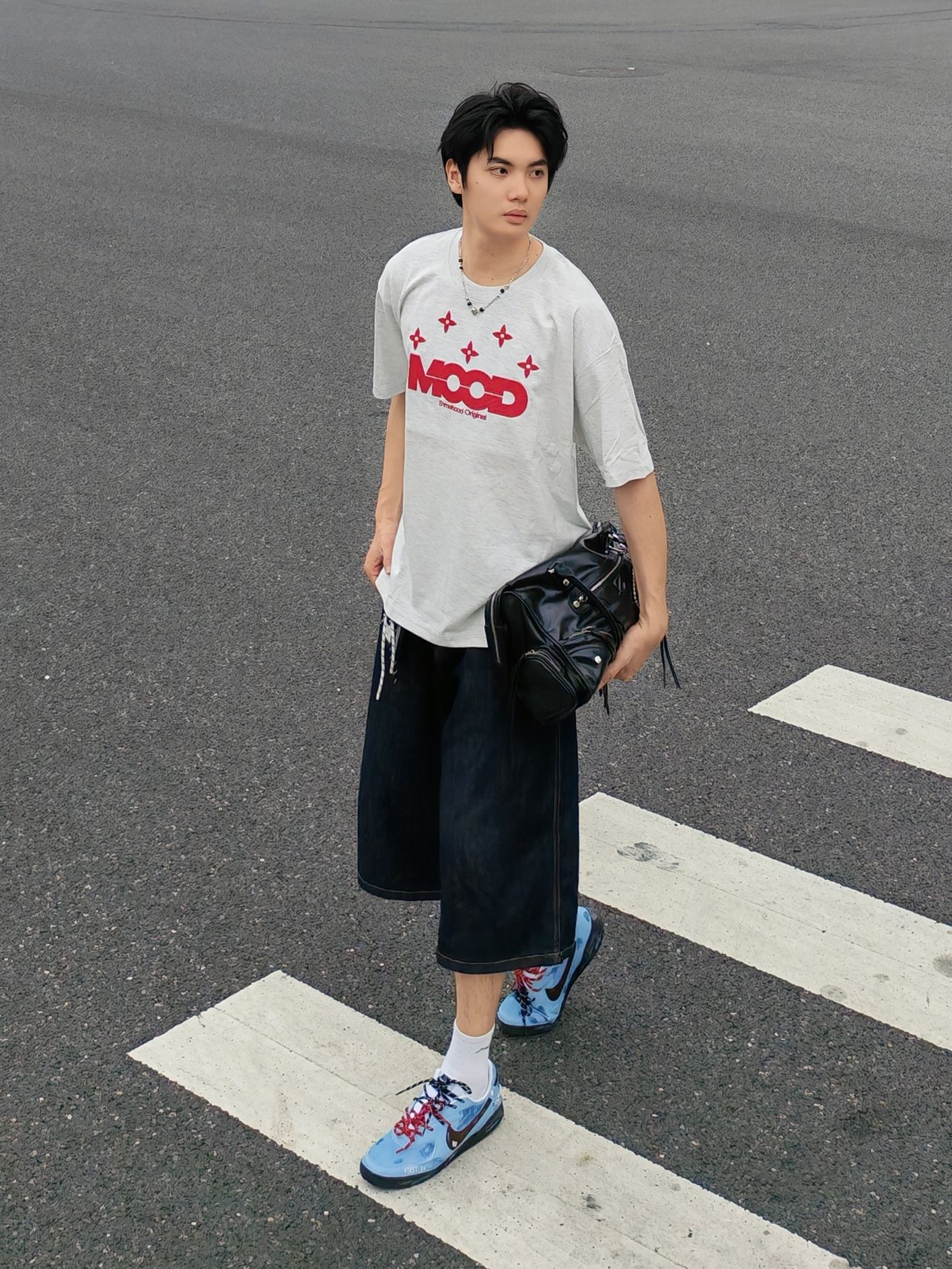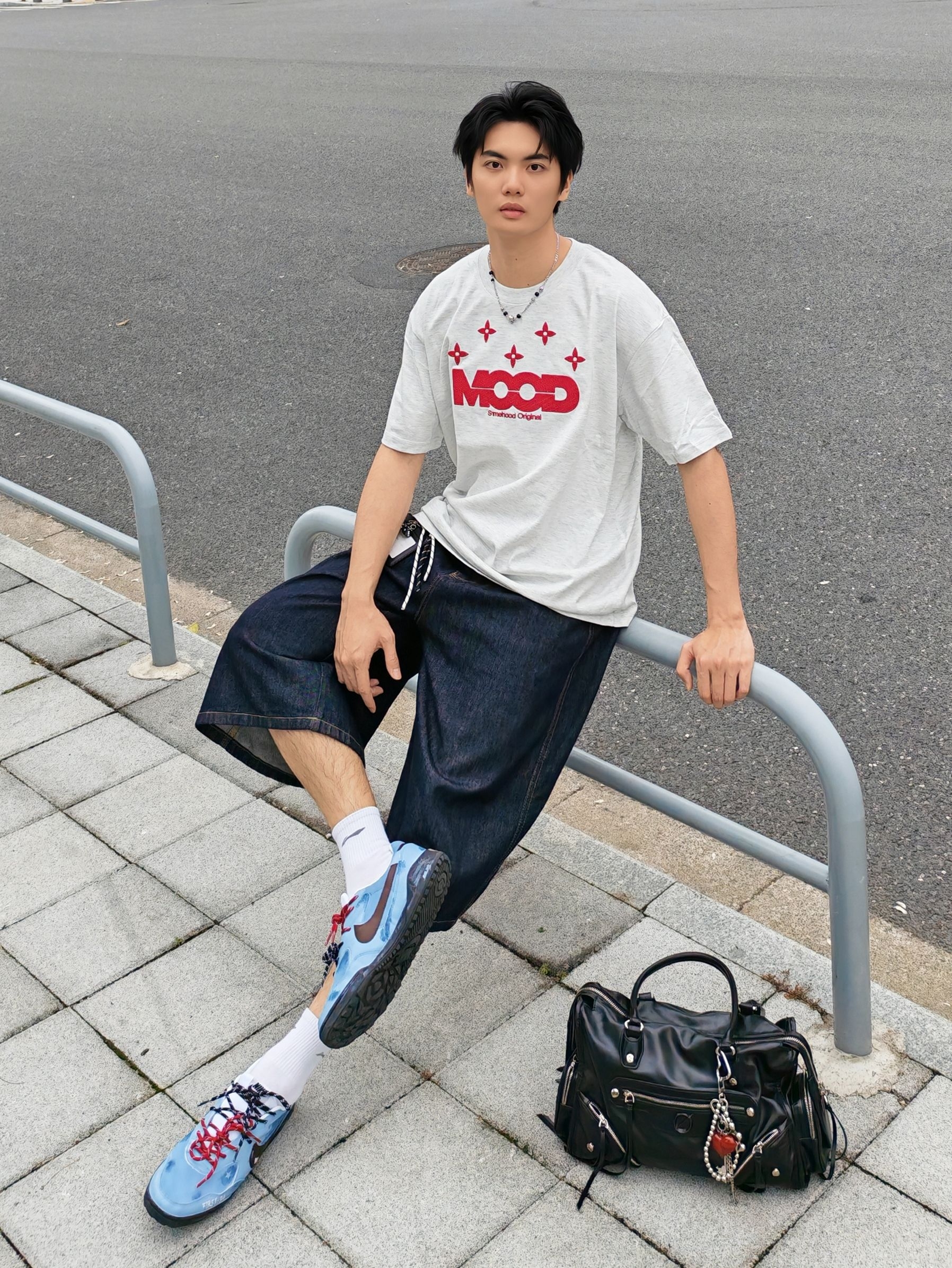 hi 这里是镭子的夏日清爽穿搭分享 浅灰T恤配红印花自带少年感,搭深色牛仔中裤慵懒又随性。 脚上这双蓝棕调运动鞋直接点亮整套造型,红黑鞋带小细节拉满,再用黑色机能包点缀,街头氛围感轻松拿捏~ 穿搭到位,颜值翻倍!选对单品、巧妙组合,普通人也能帅出新高度~