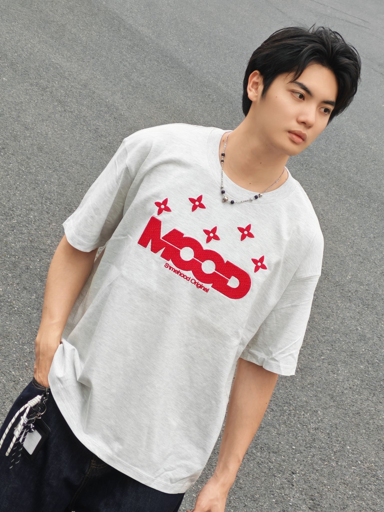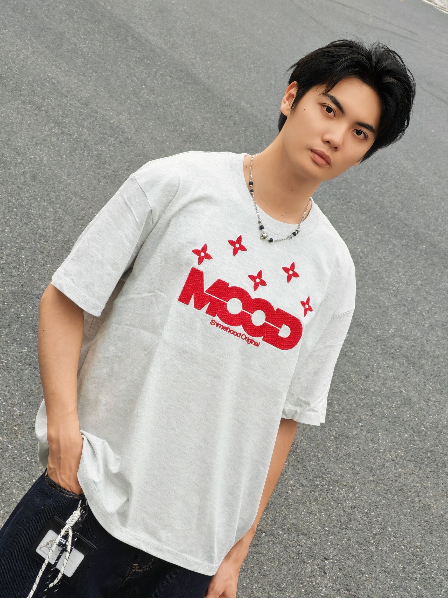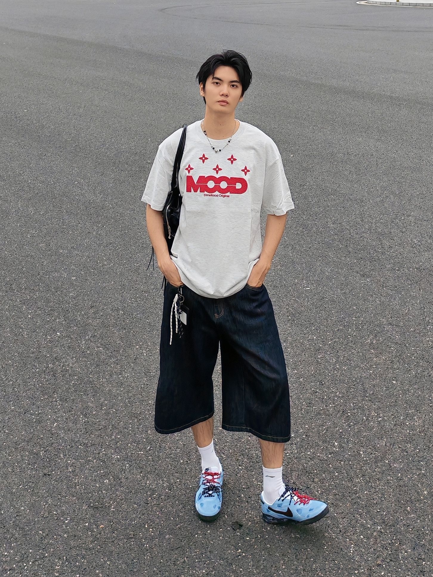 hi 这里是镭子的夏日清爽穿搭分享 浅灰T恤配红印花自带少年感,搭深色牛仔中裤慵懒又随性。 脚上这双蓝棕调运动鞋直接点亮整套造型,红黑鞋带小细节拉满,再用黑色机能包点缀,街头氛围感轻松拿捏~ 穿搭到位,颜值翻倍!选对单品、巧妙组合,普通人也能帅出新高度~