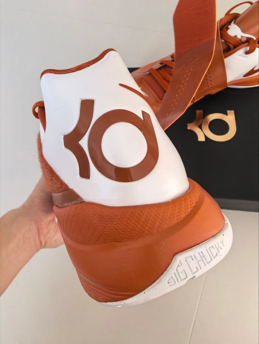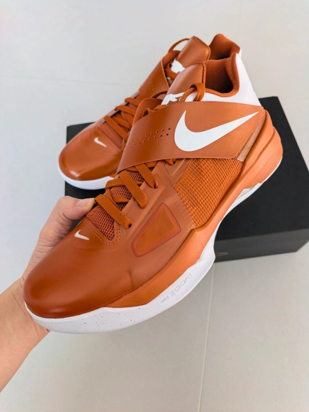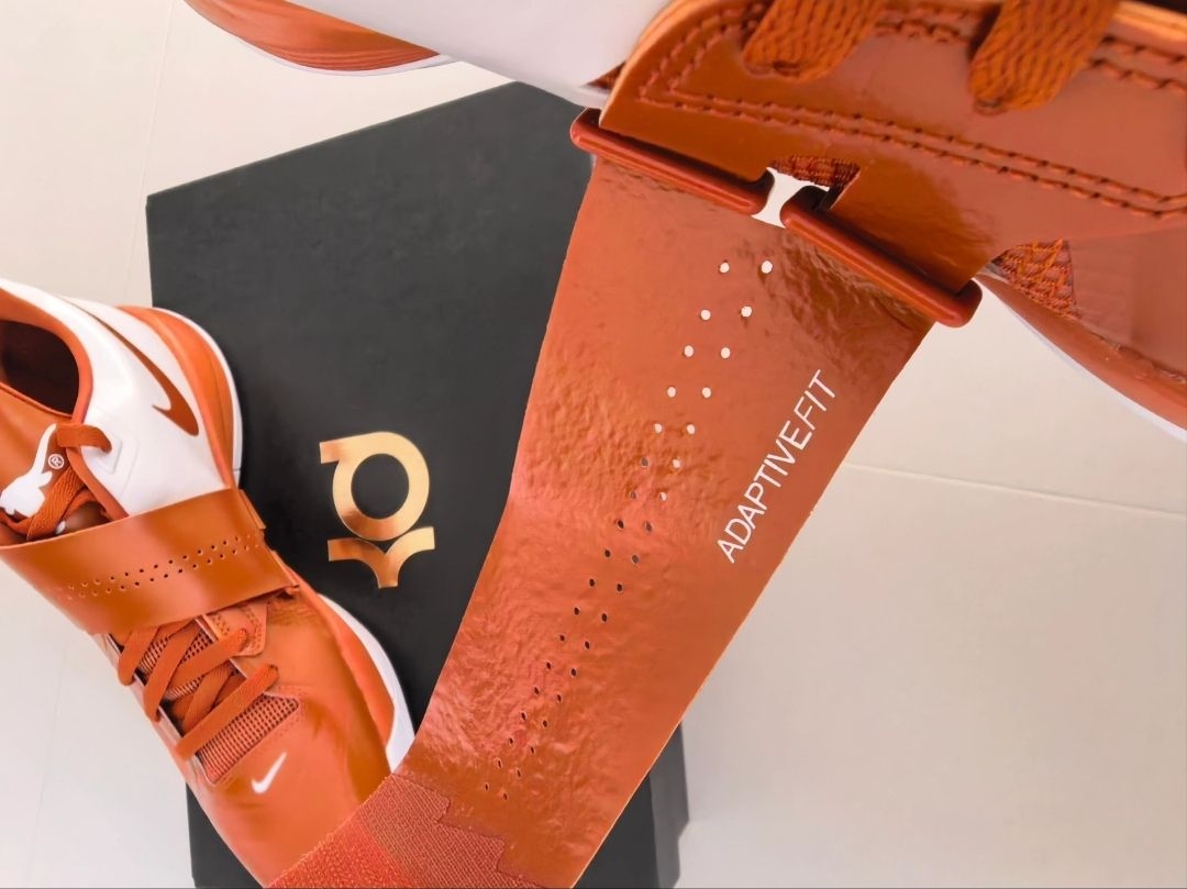 轻盈贴合与强劲缓震的完美结合,这双杜兰特4 Texas或许能成为你球场上的制胜法宝。 开箱瞬间,杜兰特4 Texas的配色方案立刻抓住了笔者的眼球——标志性的德州橙与纯白底色交织,鞋身充满大学球队元素,既保留了KD系列的经典设计语言,又注入了浓厚的校园篮球文化。 上脚第一感受是鞋面工程网布材质的轻盈与透气,那种贴合感宛如为双脚量身定制的“第二层皮肤”。