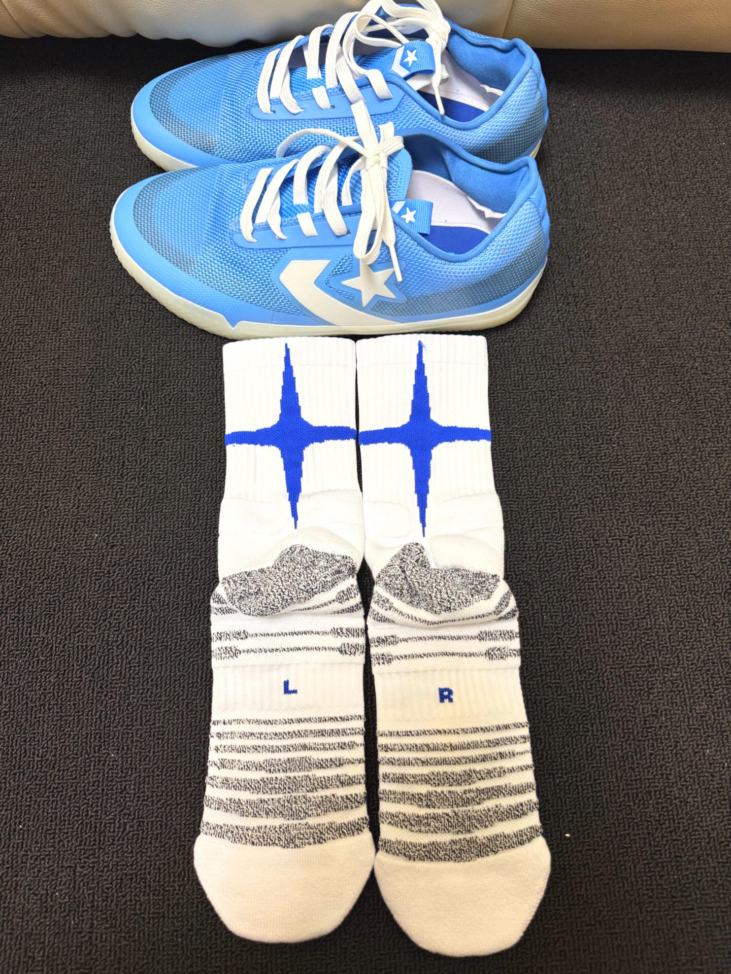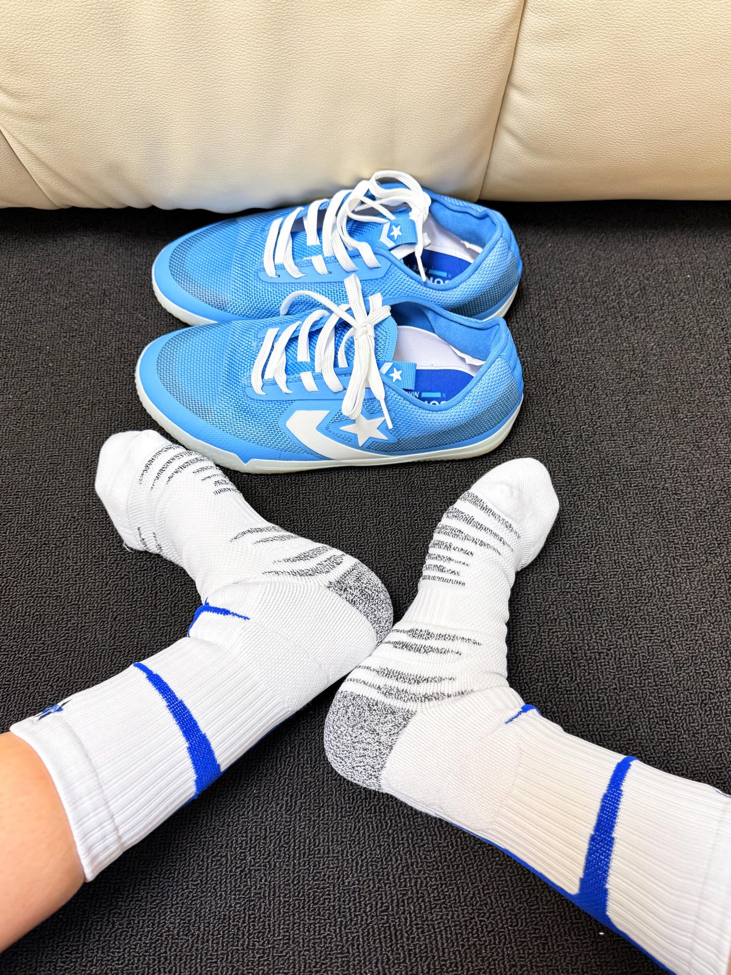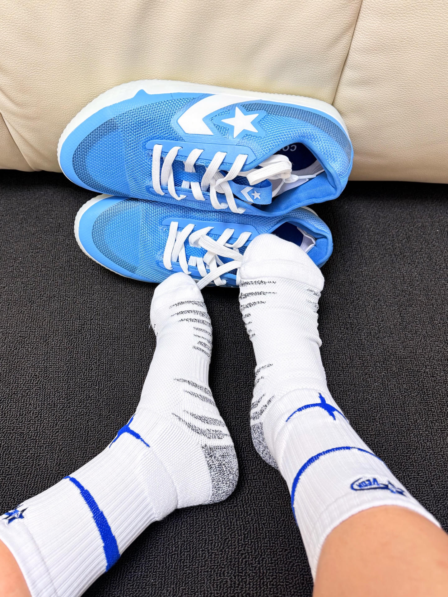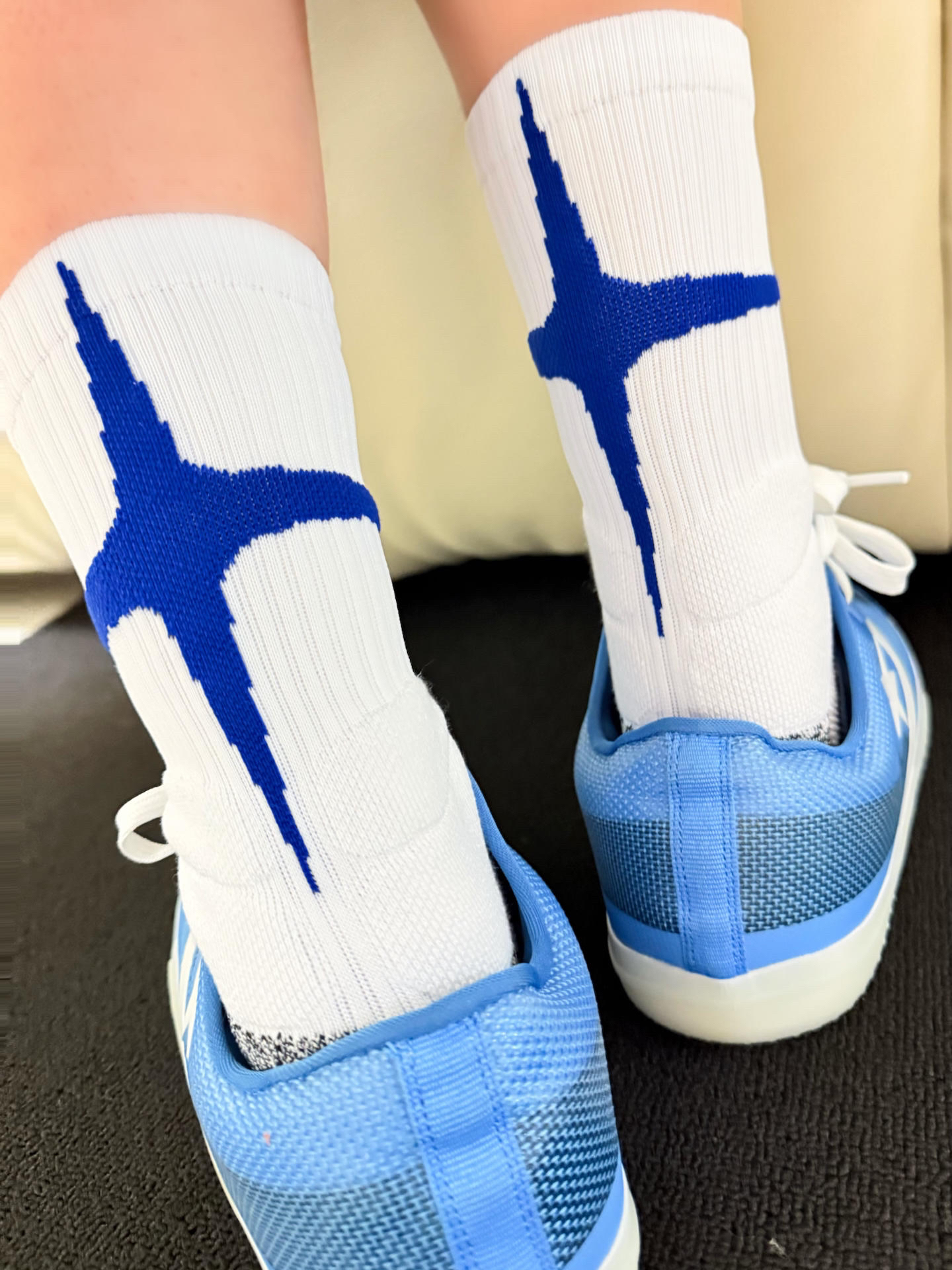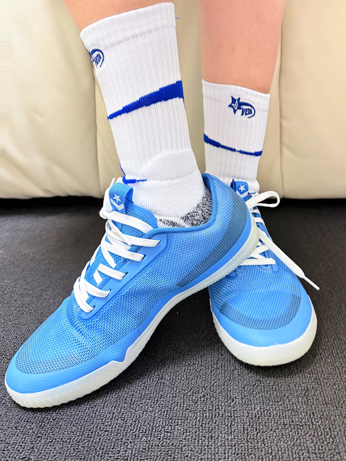 日常打球的时候穿的袜子总是容易掉跟 维动 VEIDOORN 家的这款星刃球袜就是我最近的心头爱 加厚毛巾底的设计 日常穿起来吸汗耐磨透气 平时打球训练穿着也比较的舒服 不会出现掉跟现象 球袜整体采用了白蓝两色的配色 看起来干净又清爽 搭配袜身的刺绣logo 以及后跟的四芒星图案设计 整体就氛围感满满 真的爱啦🫶