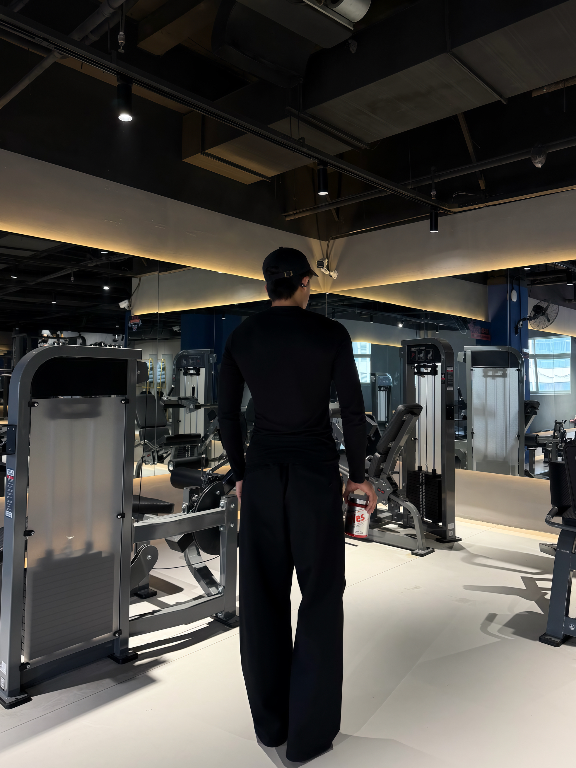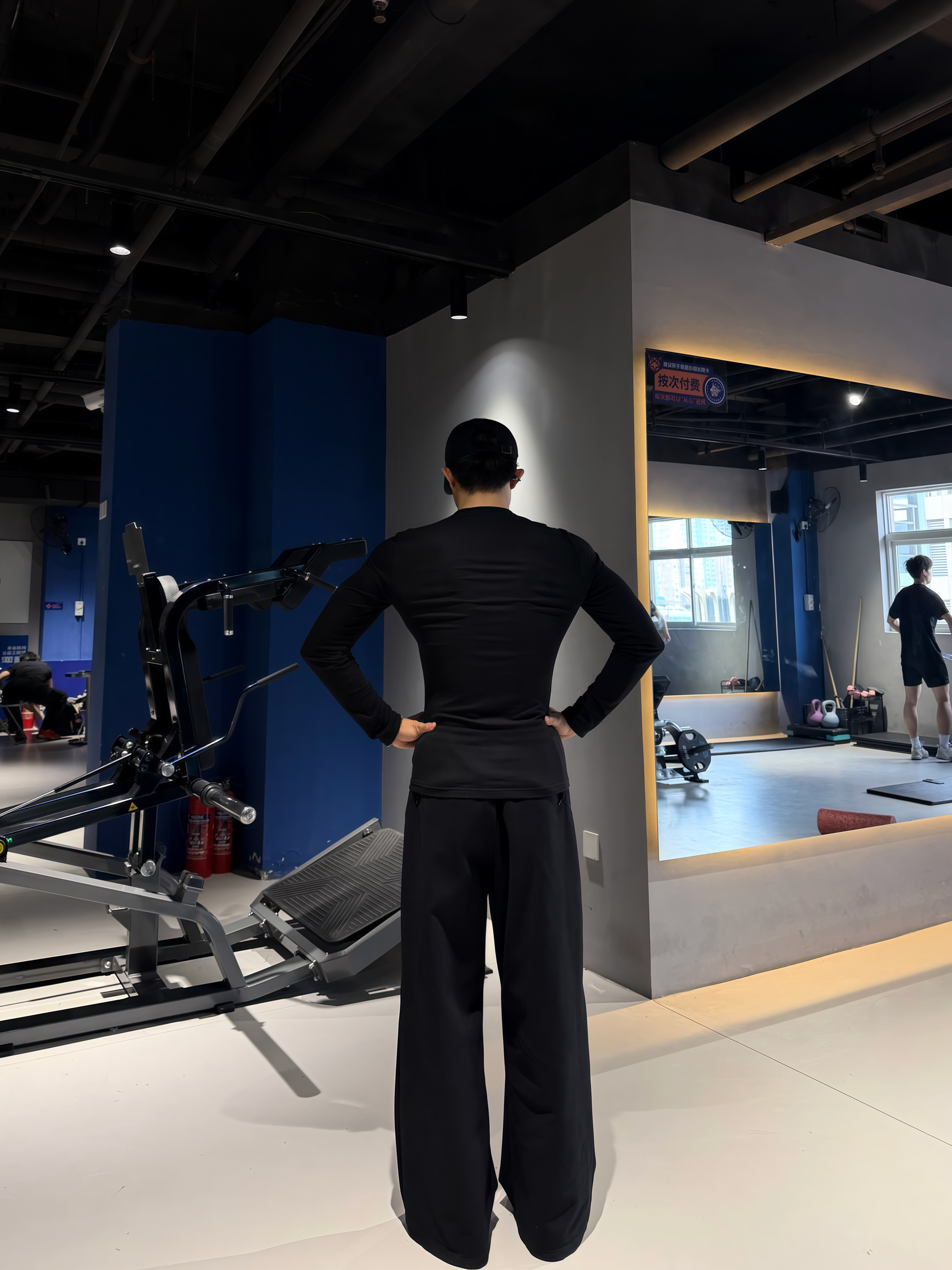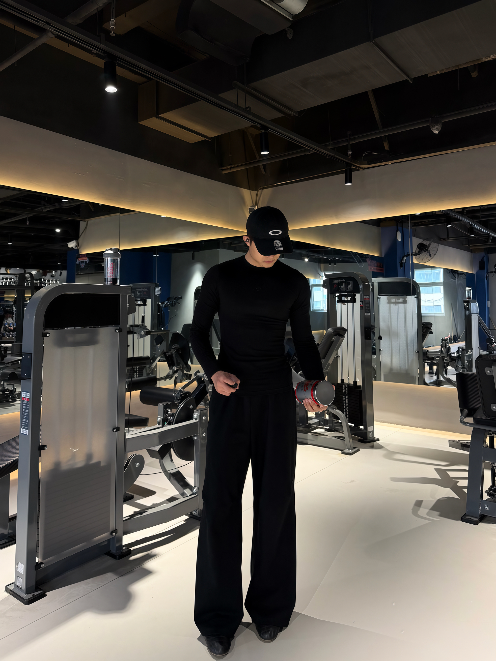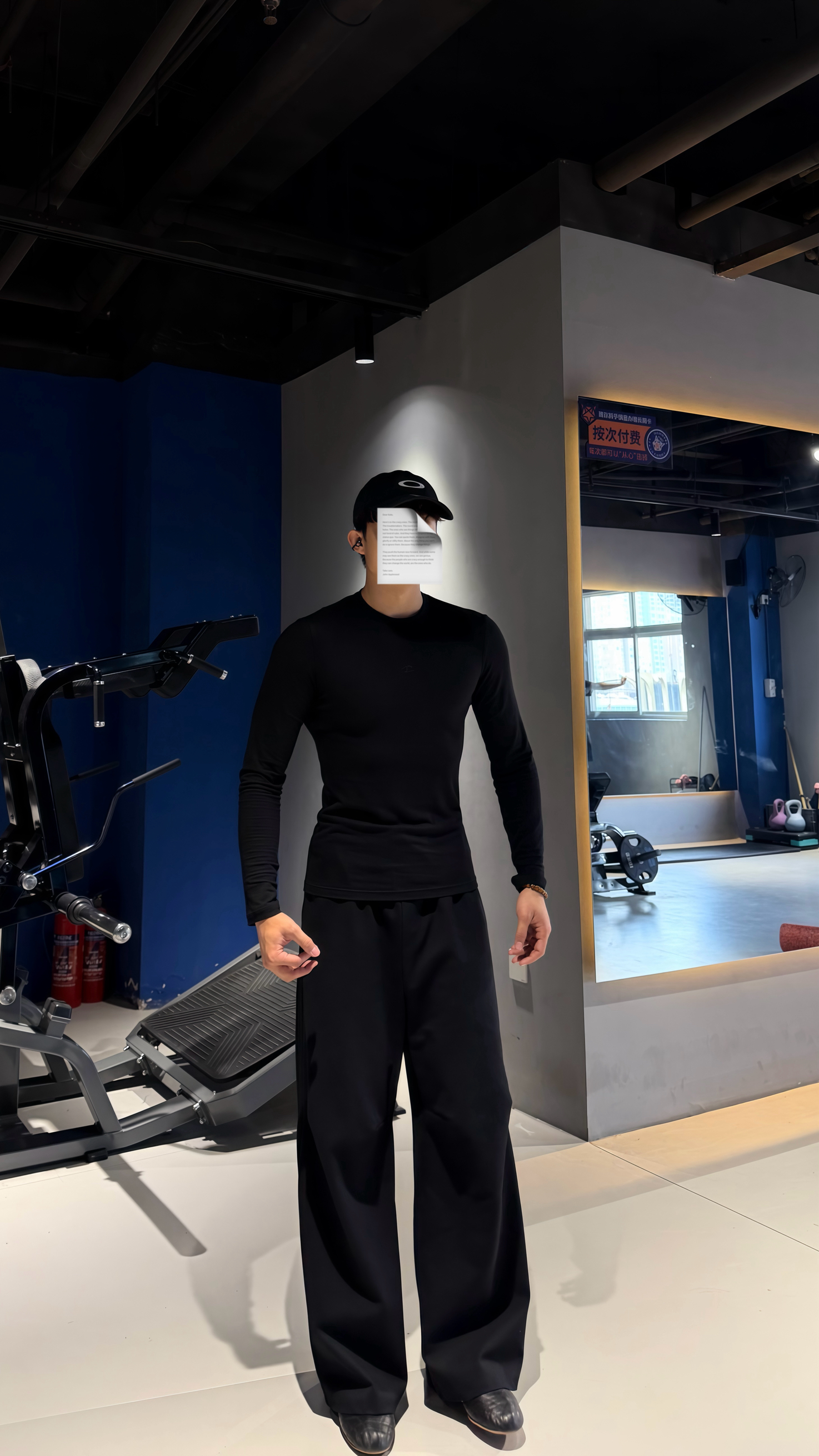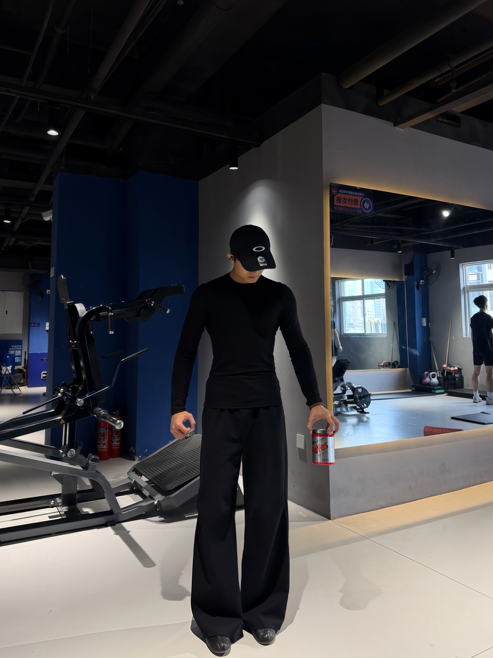180 140|OOTD穿搭分享 👔这件黑色紧身健身长T太懂健身人了!高弹面料贴肤不勒,完美勾勒练出的肩背线条,修身不紧绷,日常穿也不违和,纯欲感直接拉满! 👖黑色弯刀休闲裤直接封神!立体剪裁+垂感拉满,修饰腿型超绝,180穿拖地感拉满,松弛感和利落感双在线!