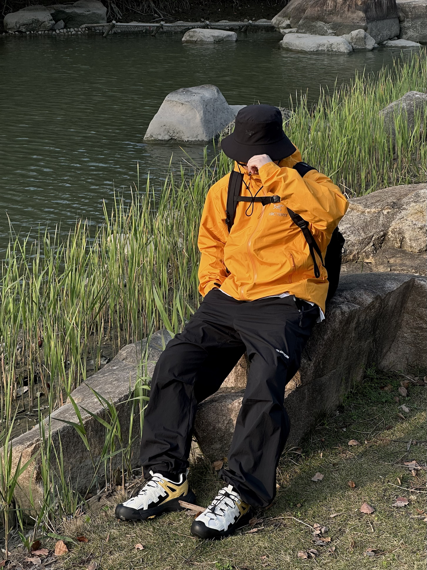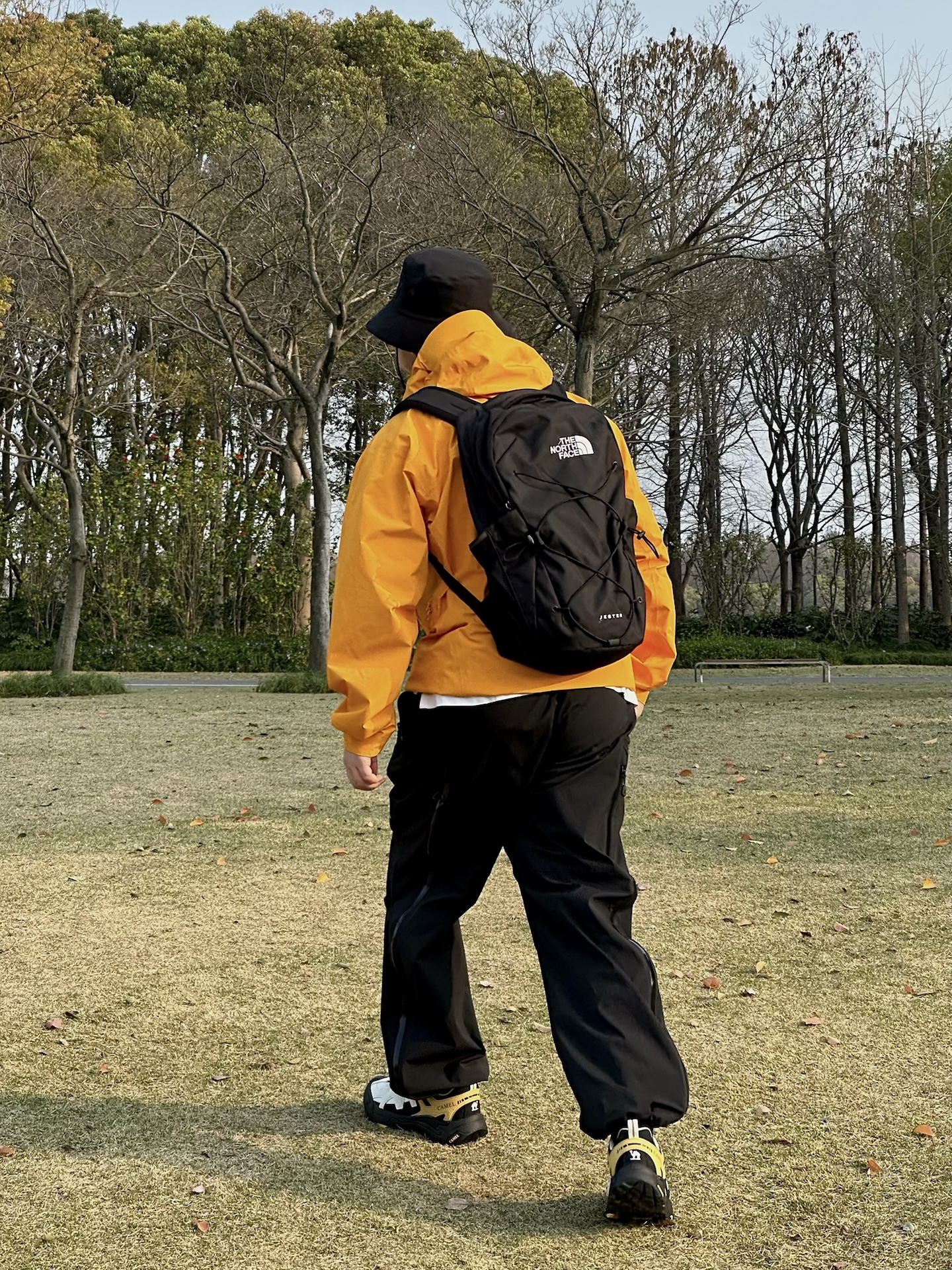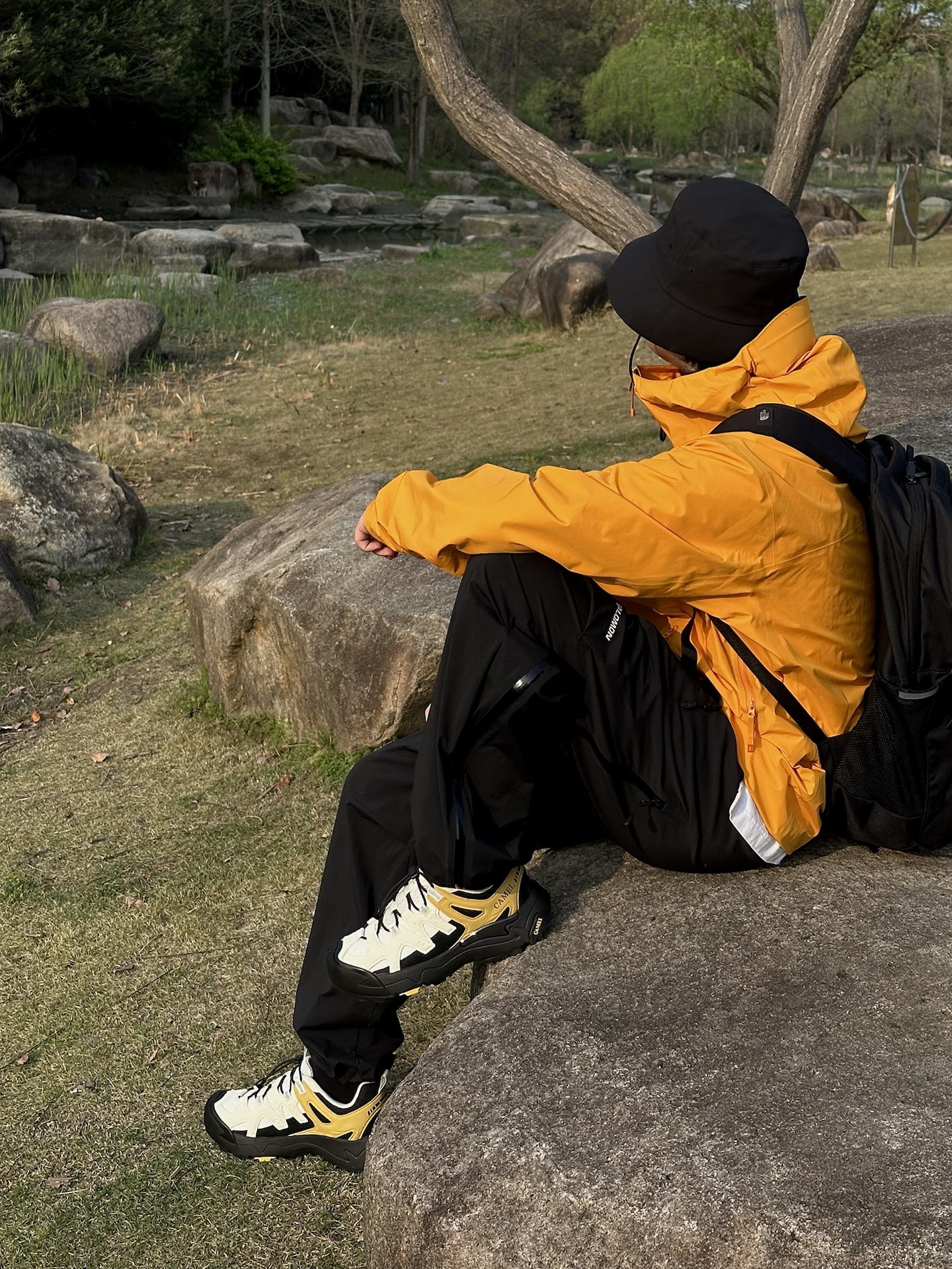 哈喽👋🏻大家好哇 这里是🪨石地夫的穿搭小日记📝 - 今天是春日户外ootd - 上身:亮橙色冲锋衣+白色内搭,层次感get🤏🏻 - 下身:黑色冲锋裤,宽松舒适 - 配饰:黑色渔夫帽+黑色双肩包,户外好搭子✨ - 鞋子: 黑白黄户外徒步鞋🥾,和上衣颜色呼应 脚感轻便,网面鞋面特别透气,很适合春夏🍃 加厚的橡胶大底,耐磨抓地力强,户外的每一步都安全感满满☑️