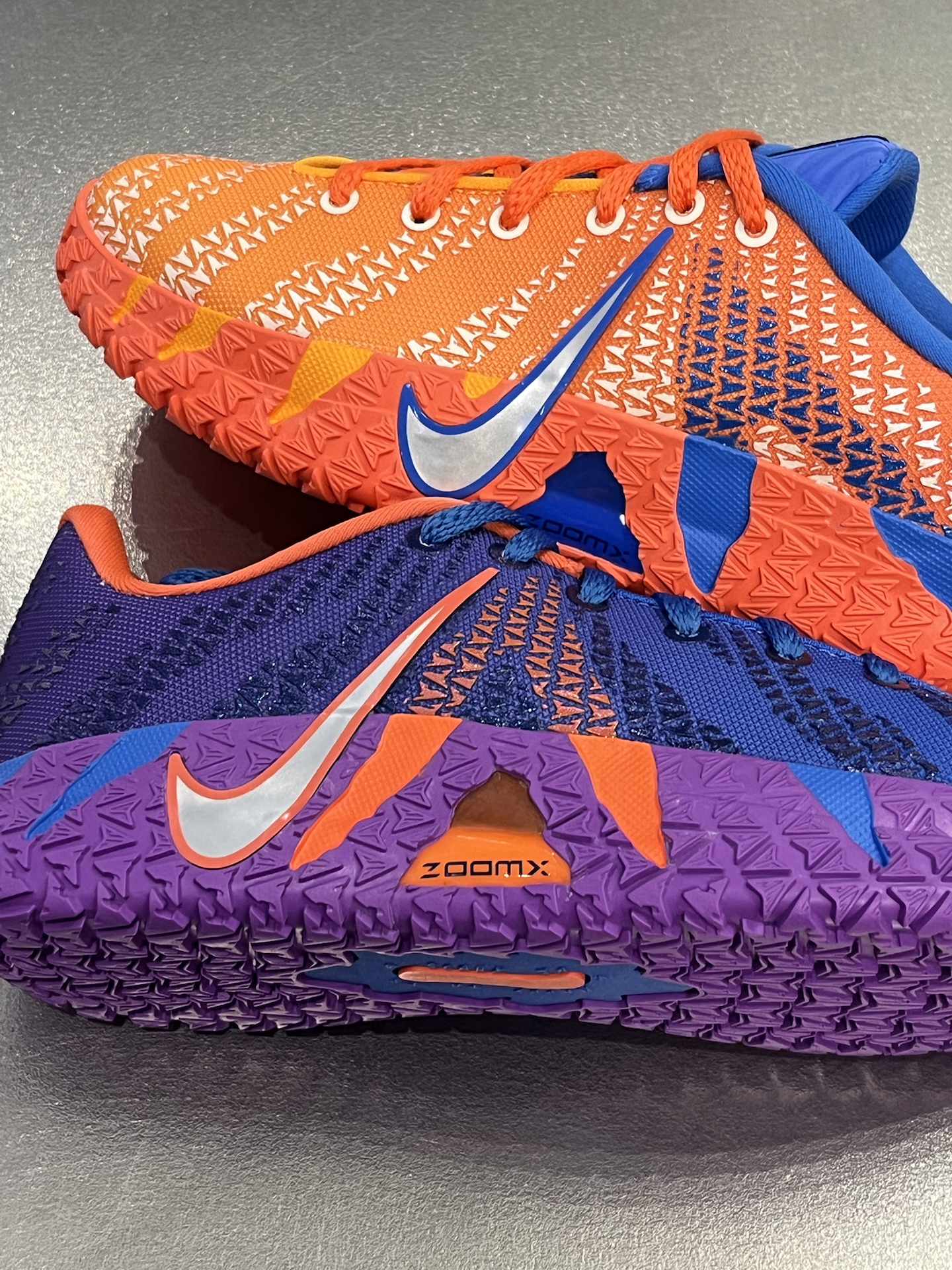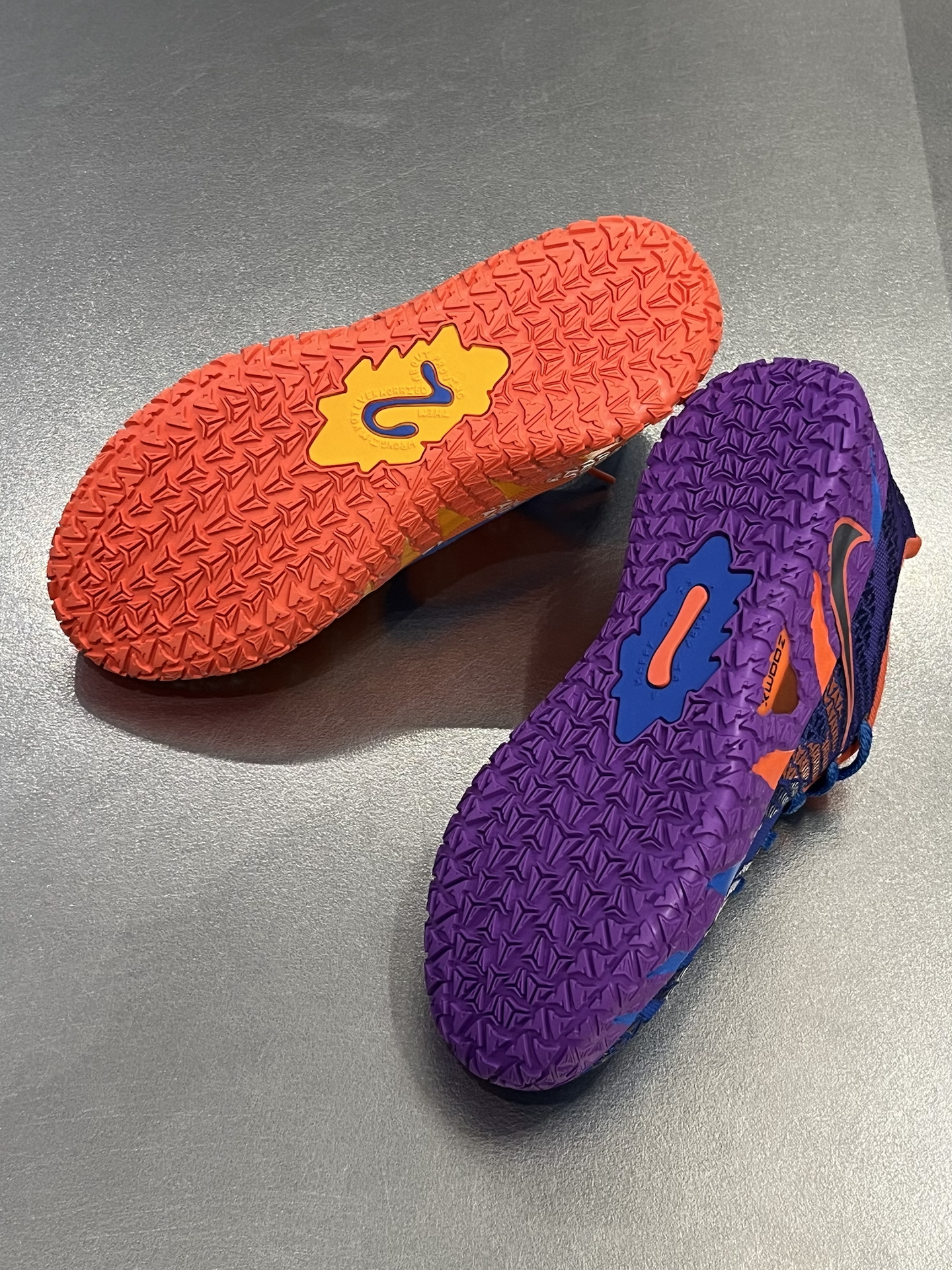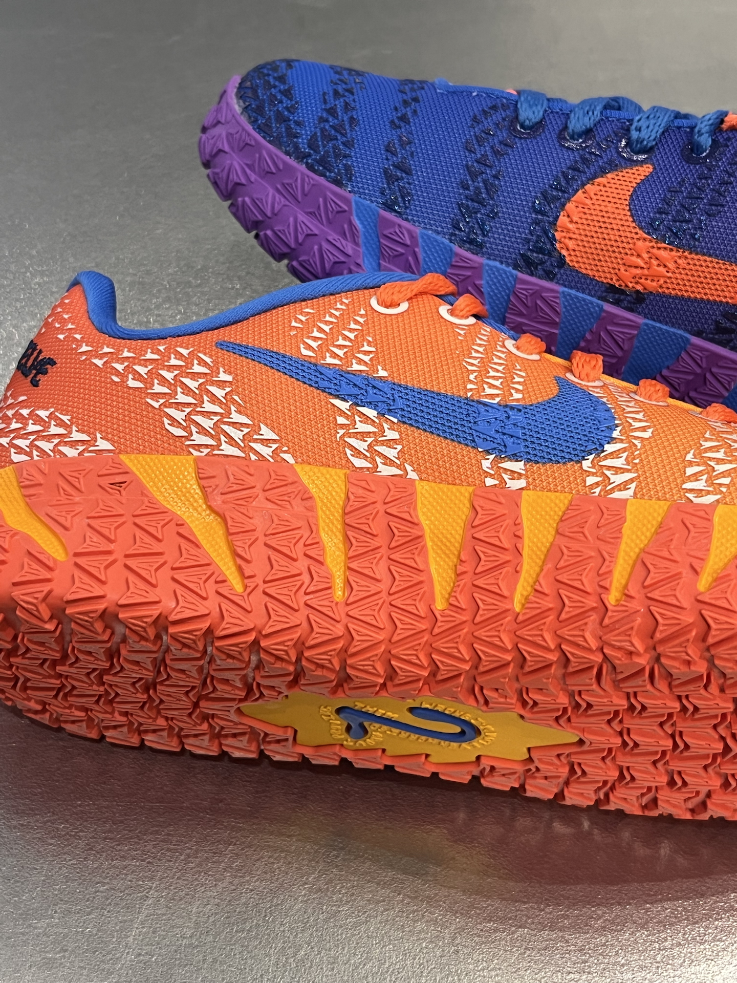 这双Ja3左右脚,分别是蓝橙色很亮眼,很难不多看几眼,妥妥的夏日多巴胺风格 鞋子重量很轻,感觉有点像跑鞋,跑跳起来就很灵活,不会有太多负担 中底是ZoomX泡绵,软弹的脚感,不用大体重也能明显感觉到缓震 这个底是橡胶鞋底,学生党在学校室外的水泥地、塑胶场打球也没啥问题,抓地很稳,不用担心打滑