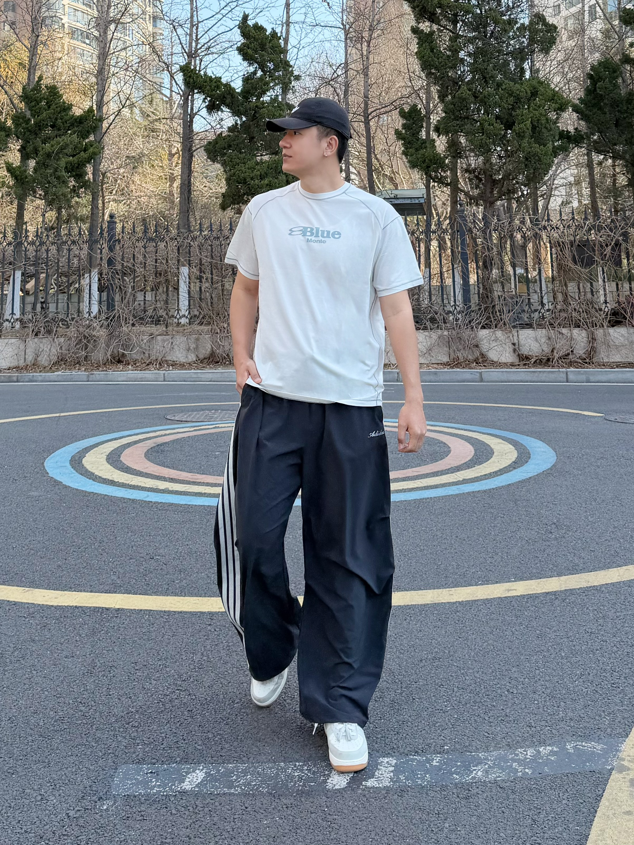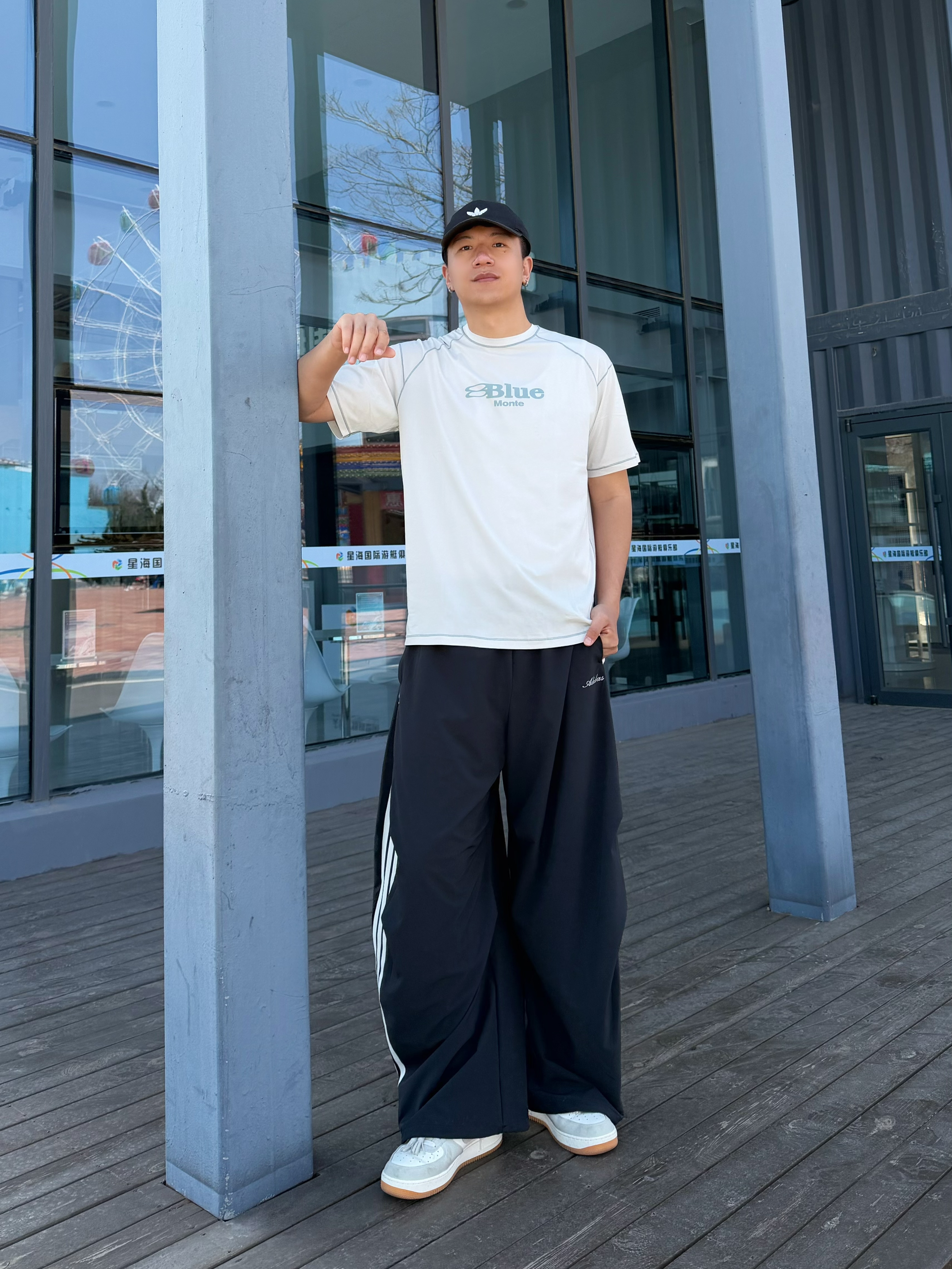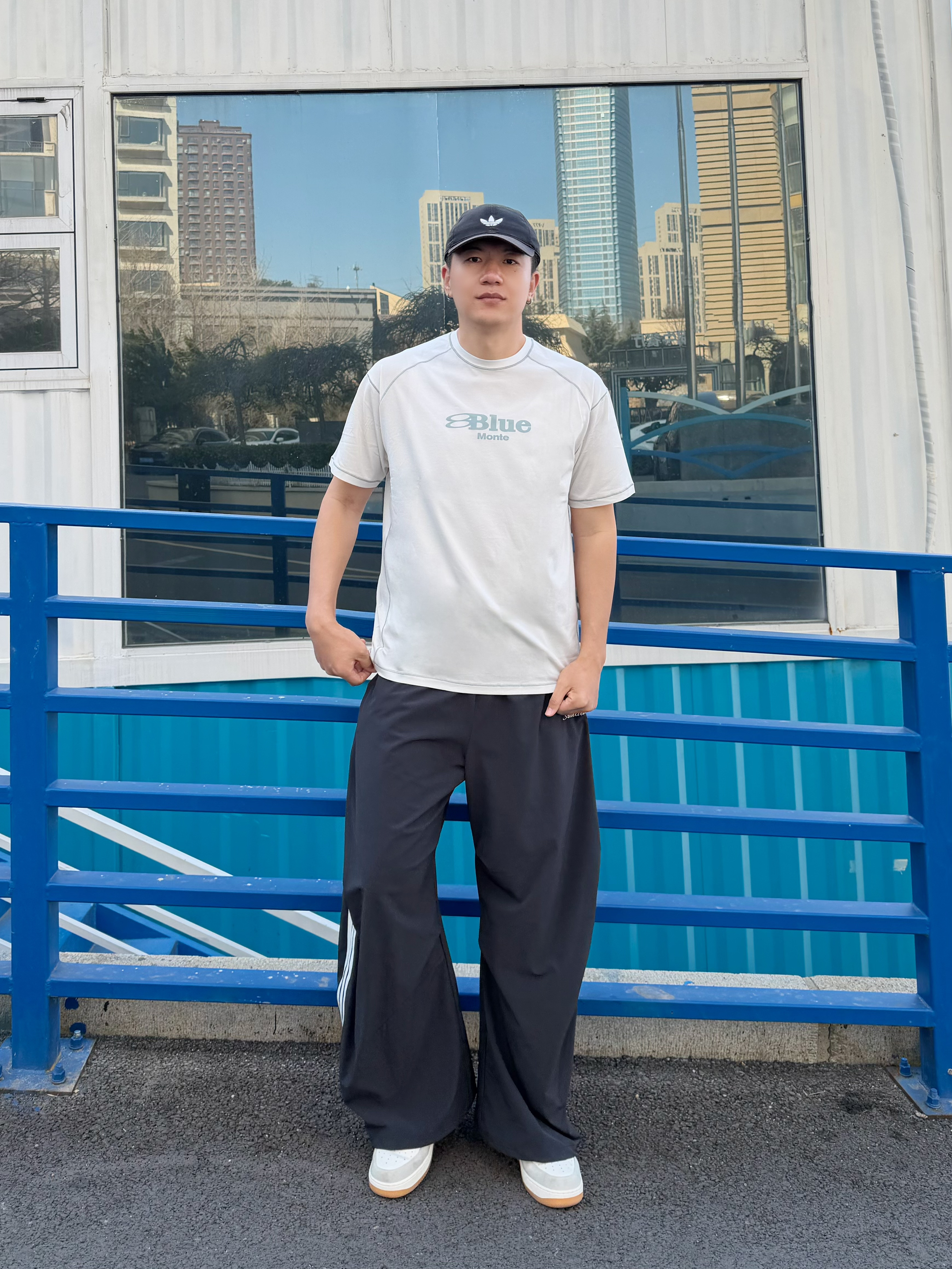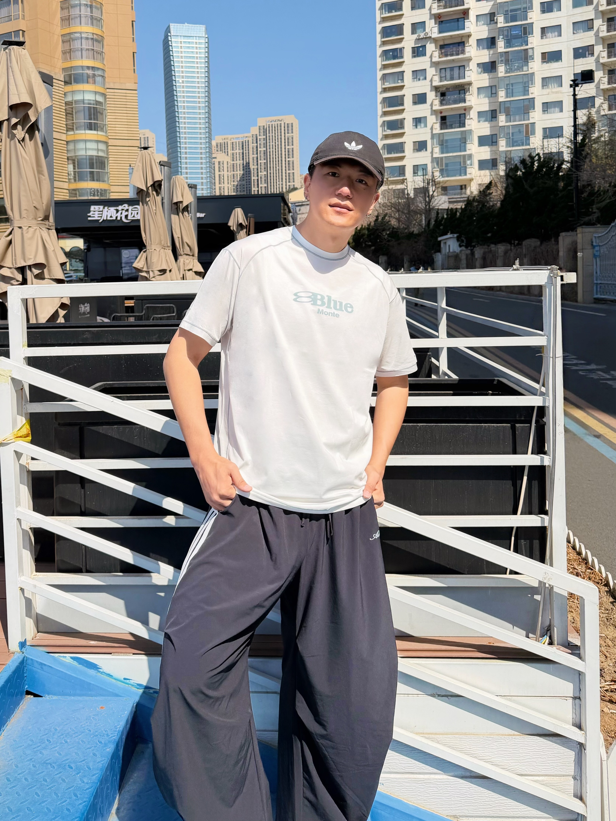 春夏T恤穿来穿去,还是简约风最耐看☁️ 这件蓝岐云峰白T恤,面料吸湿速干, 出汗不粘身,印花有点小设计感但不浮夸 下身黑裤+卡其板鞋,整体颜色干干净净,看着就舒服 个人感觉越简单越显质感,清爽一整天~ 👦🏻:188 | 85 👕:XL