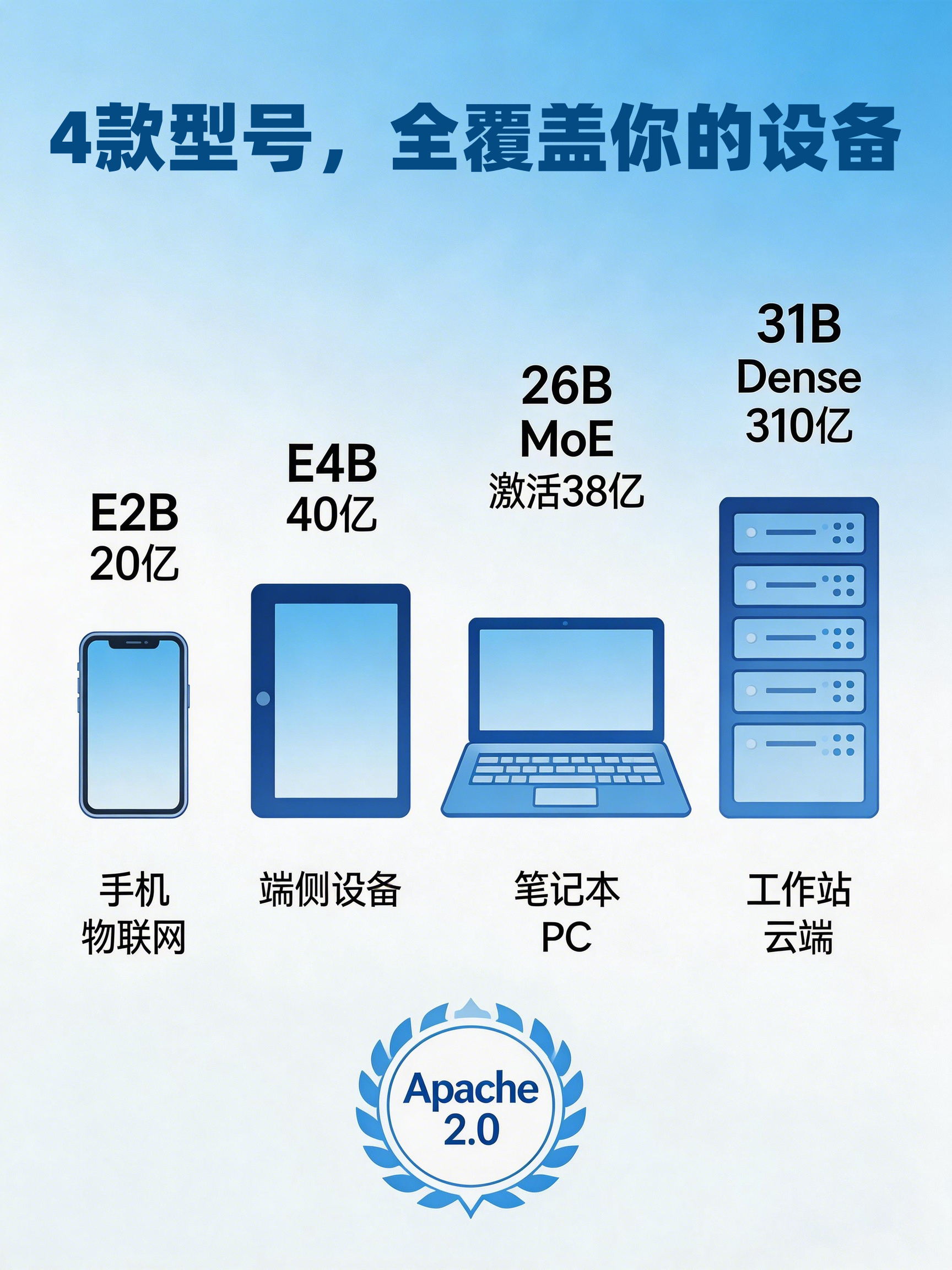 谷歌深夜放大招!Gemma 4 正式发布,这是他们迄今最智能的开源模型🔥 📊 4款型号全覆盖: E2B:20亿有效参数(总参51亿),手机/树莓派离线运行,支持音频输入 E4B:40亿有效参数(总参80亿),端侧专属优化,支持音频输入 26B MoE:激活仅38亿参数(总参260亿),推理速度接近4B模型,性能碾压数百亿竞品 31B Dense:31亿参数(总参31B),单卡H100就能跑 💡...