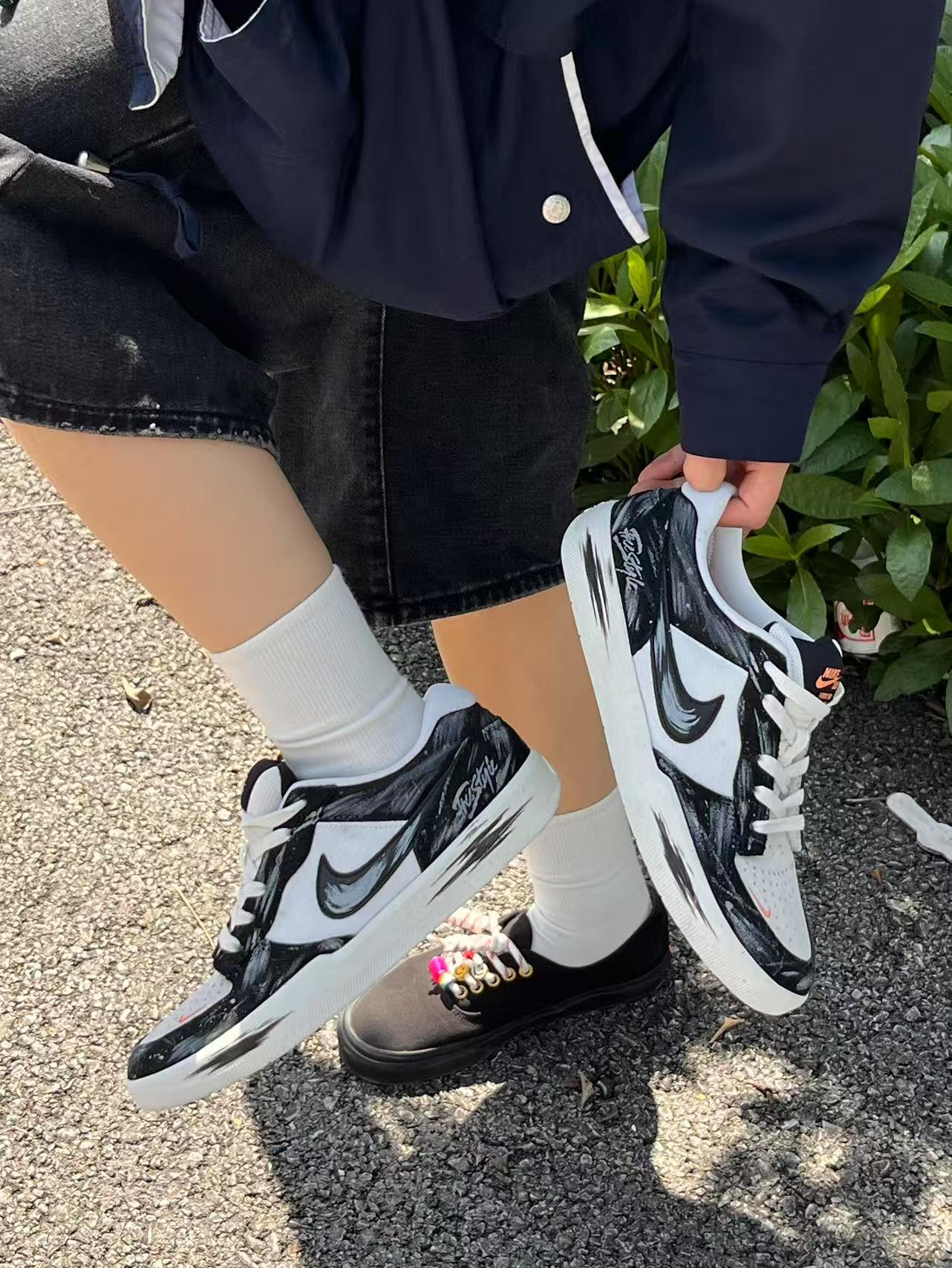 黑白灰涂鸦像打翻的墨水瓶,洒在翻毛皮鞋面上。 脚感比想象中轻软,走路带风还不闷脚。 今天先配了一条阔腿牛仔裤,慵懒里带点街头感。 不知道明天该搭什么裤子了…(或者有没有人想约Citywalk?😉)