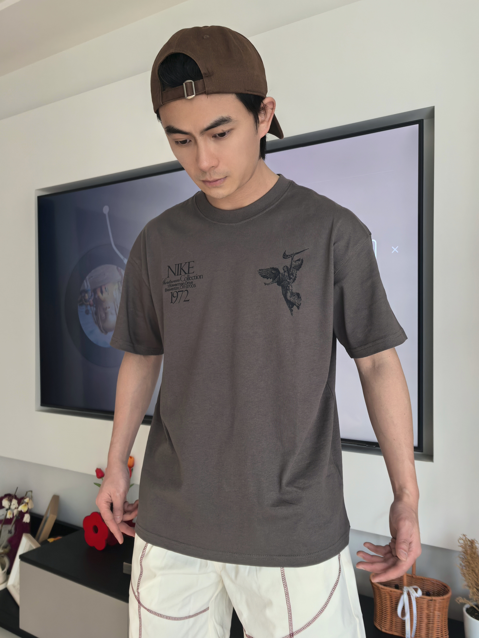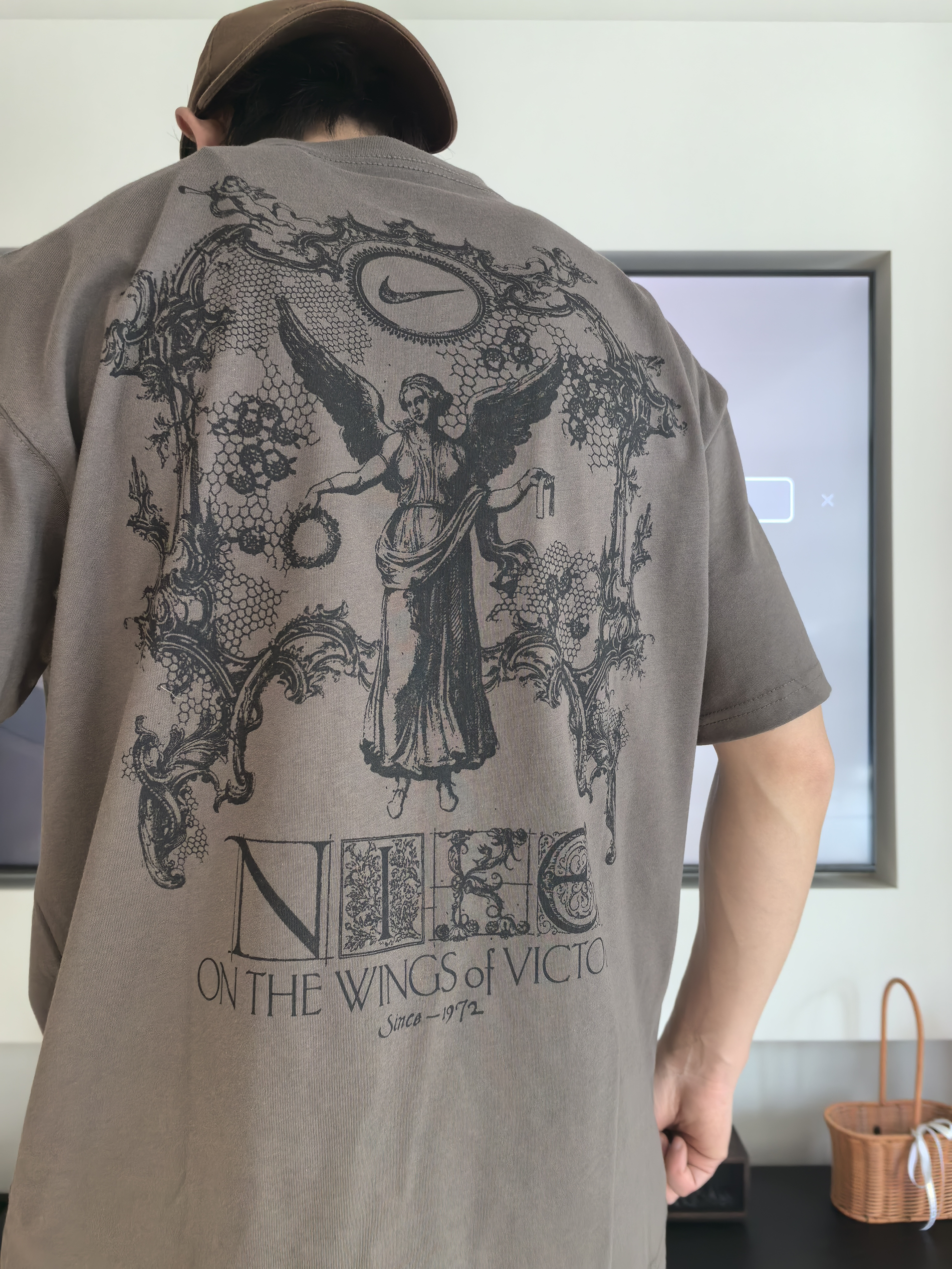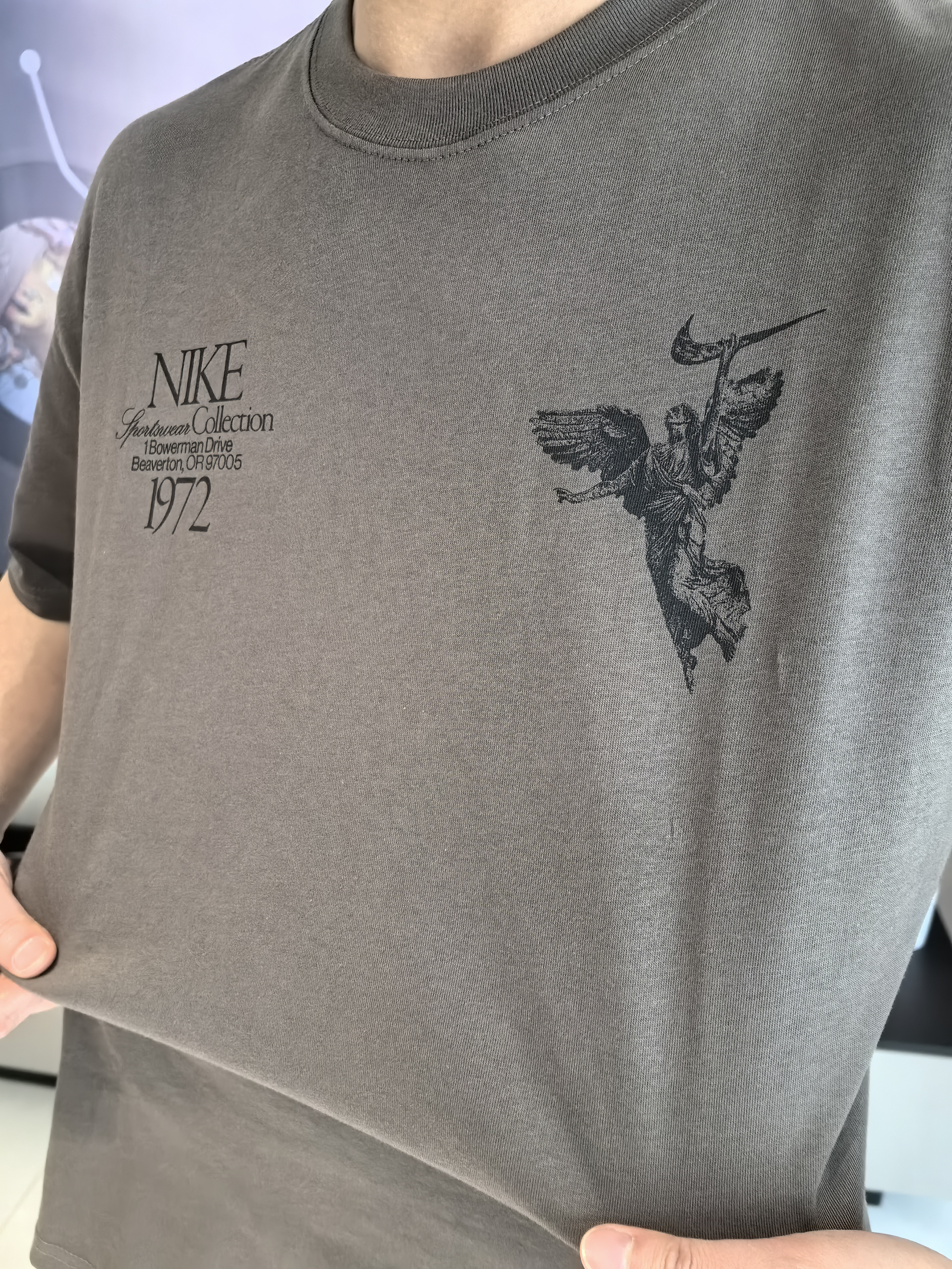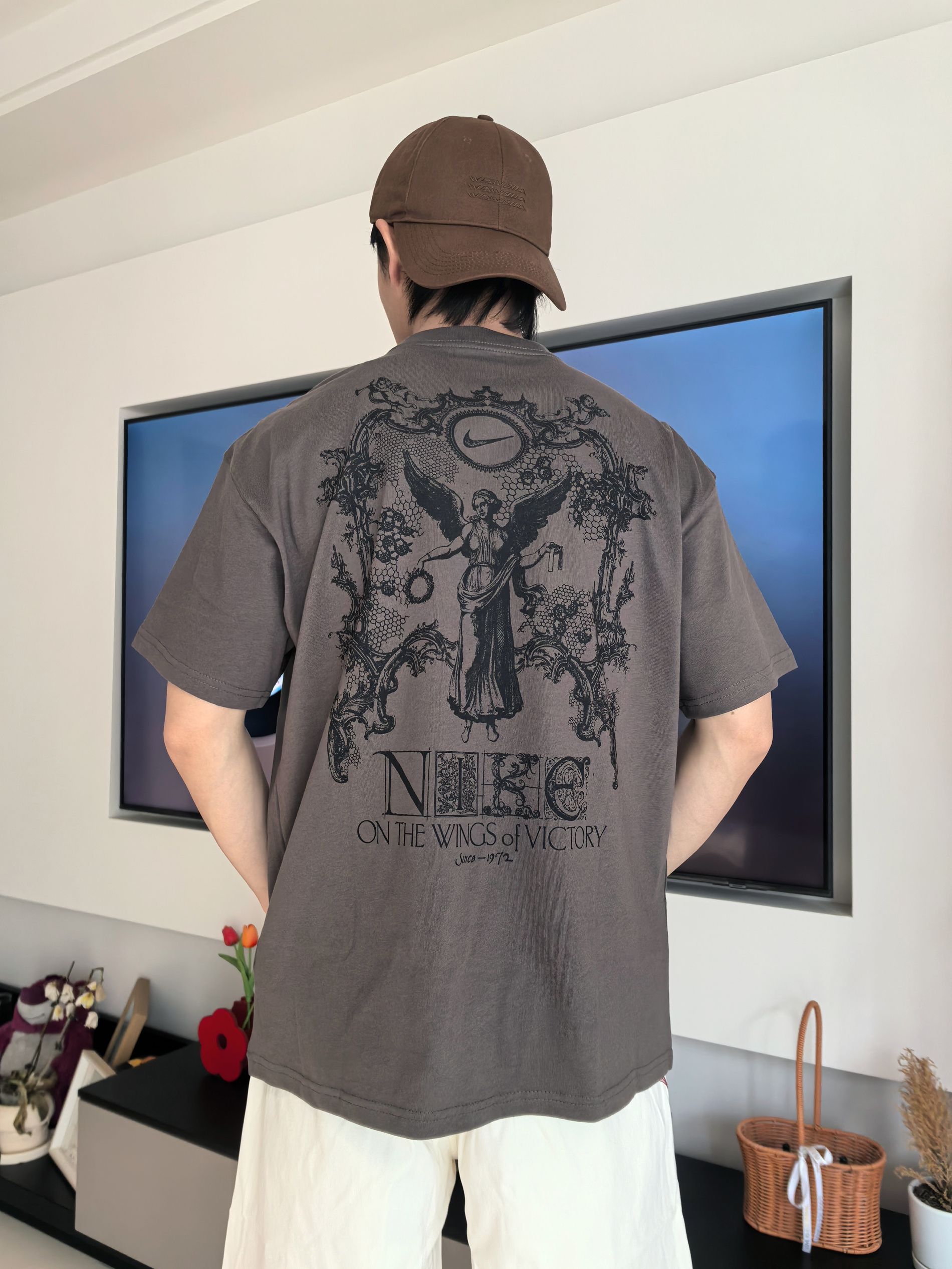 今天我上身这件短T,和日常看到的耐克短T还是有不同,毕竟显眼的就是背后的胜利女神浮雕印花太顶了 👀搭配复古的“ON THE WINGS of VICTORY”英文字样,复古底蕴浓厚,不是烂大街的款,出门完全不怕撞衫! 🏃炭灰色调自带高级感,不管是正面小logo的简约设计,还是背面满印的重工图案,细节都到位 宽松的落肩版型对身材包容性好,如果觉得袖口长可以挽一节还挺不错