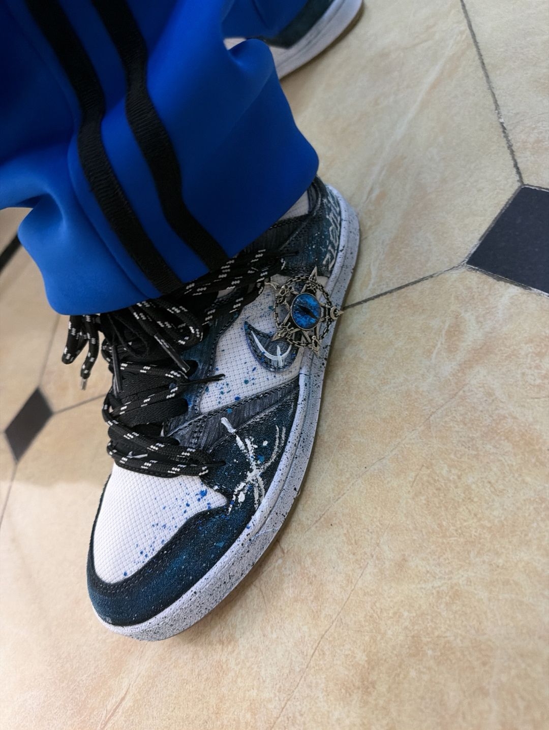这双定制款水墨板鞋 做旧晕染的蓝黑渐变太有氛围感了, 像把一整片深海星空穿在了脚上, 小众又高级,完全不会撞款! 网面+做旧皮革的拼接设计, 透气又有质感,上脚软乎乎的, 暴走一天都不磨脚。 搭配牛仔裤直接氛围感十足, 不管是日常通勤还是出街拍照都巨出片, 鞋侧的宝石装饰更是点睛之笔! 喜欢小众潮鞋的姐妹真的可以冲, 上脚就是行走的穿搭亮点, 回头率百分百!