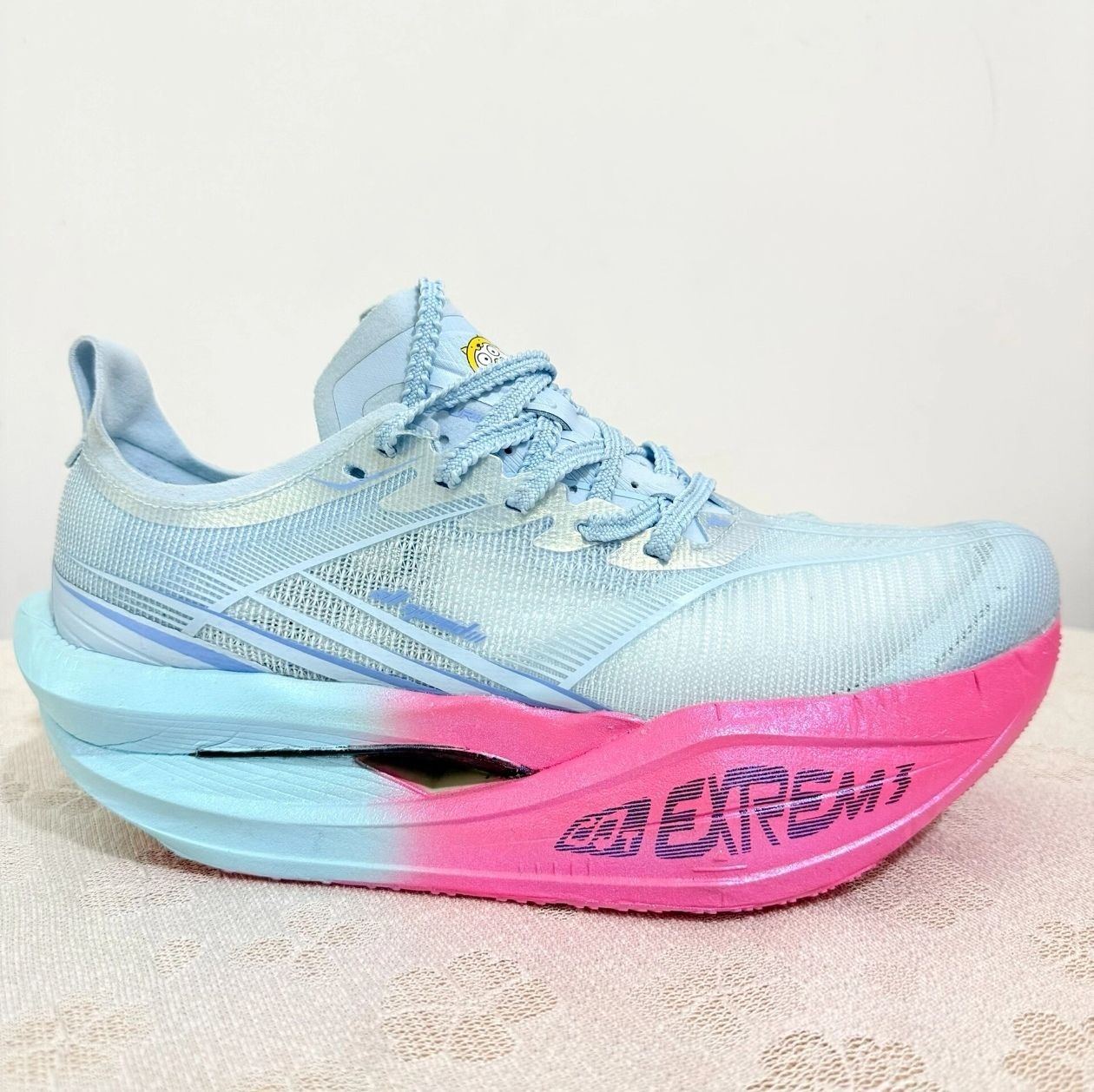 碳板刚性属于中等偏上,不是那种踩不动的死硬,但也不是软碳板能兼容多种配速。我实测430-500配速区间最舒服,再快前掌缓冲不够,再慢后跟拖沓。半马PB穿它破的,全马后程10公里脚踝力量不够,碳板反成负担,每一步都在对抗