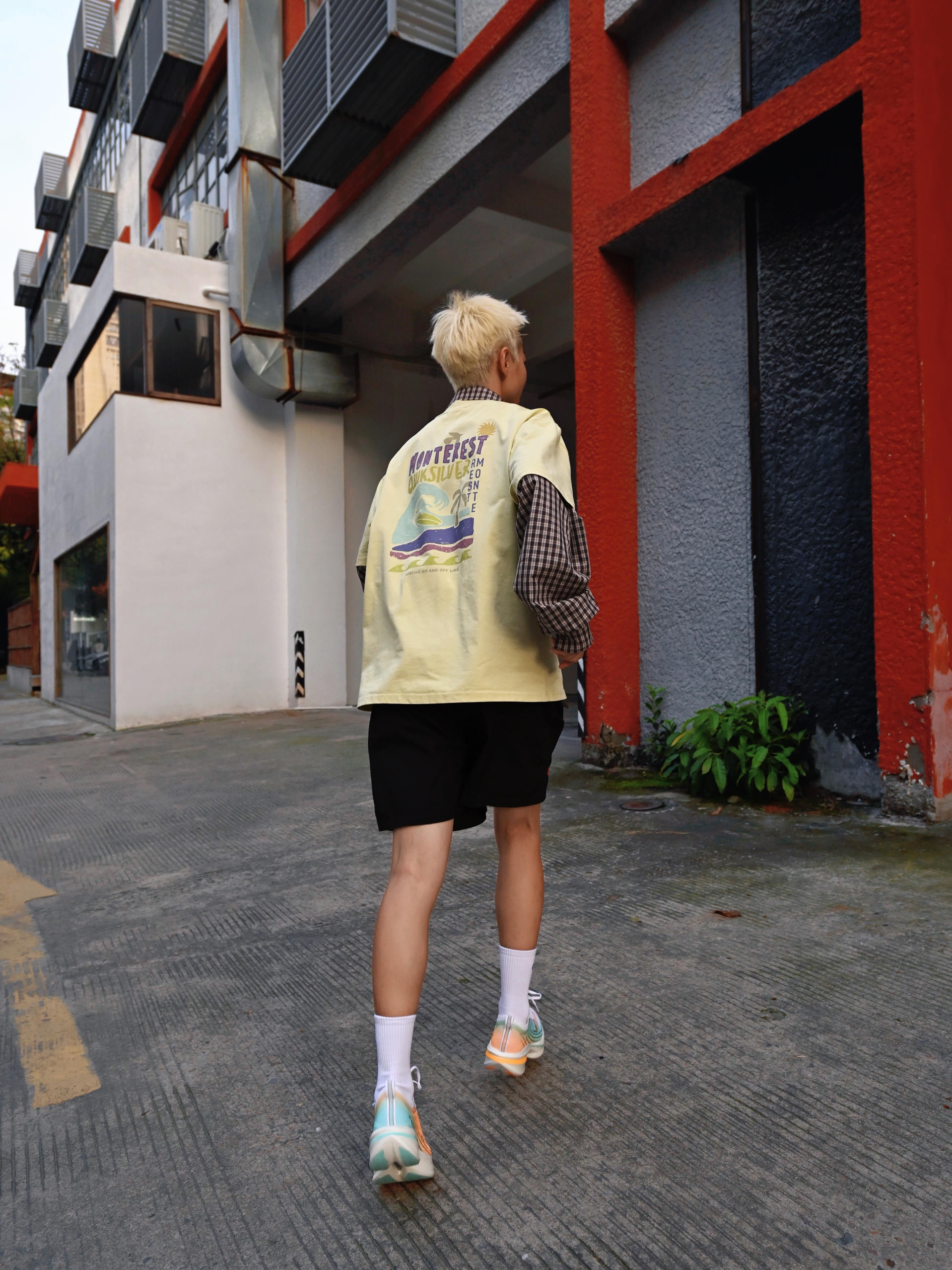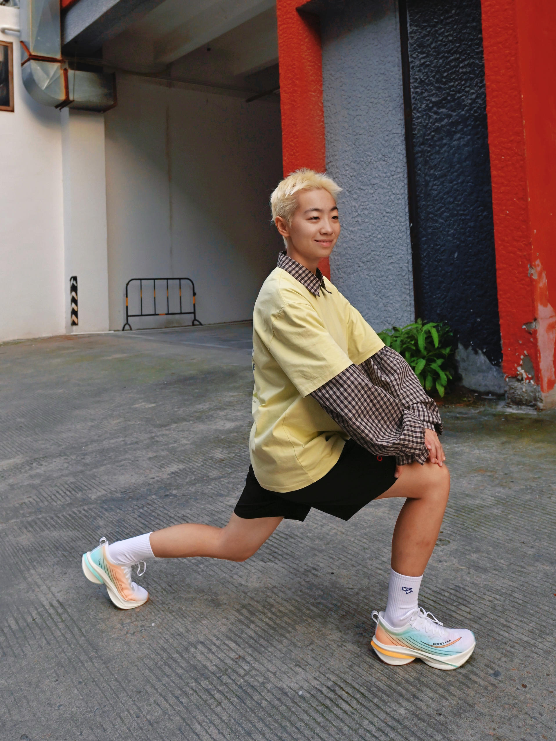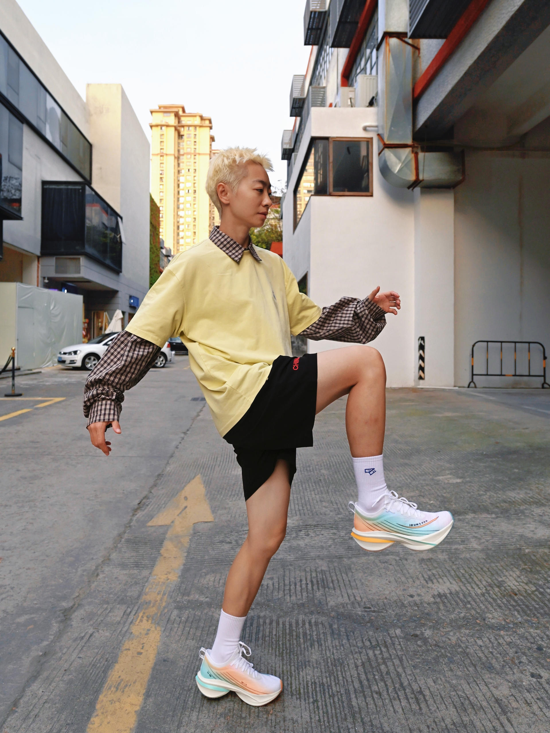 172CM|55KG 👔:m👖:m|👟:39码 🌞春夏街头运动风穿搭来啦~ 浅黄色拼接格纹长袖上衣(领口+袖口复古格纹撞色) 搭配黑色运动短裤,利落又显活力!穿上俺的艾跑者热火2.0PRO+,全掌碳板+超临界中底 防滑耐磨,稳定支撑每一步~彩色渐变鞋身超吸睛 搭配白色运动袜,潮感拉满!