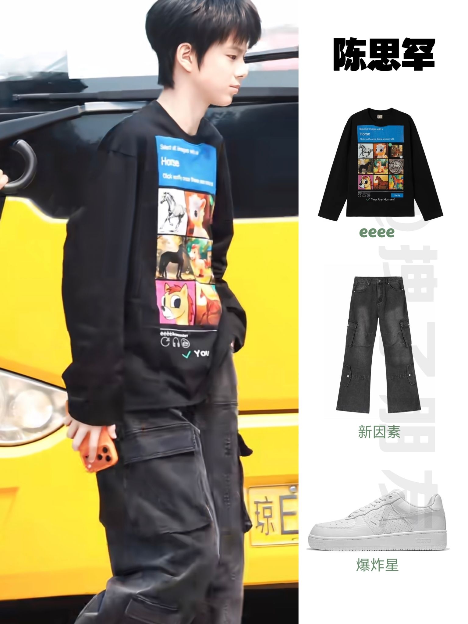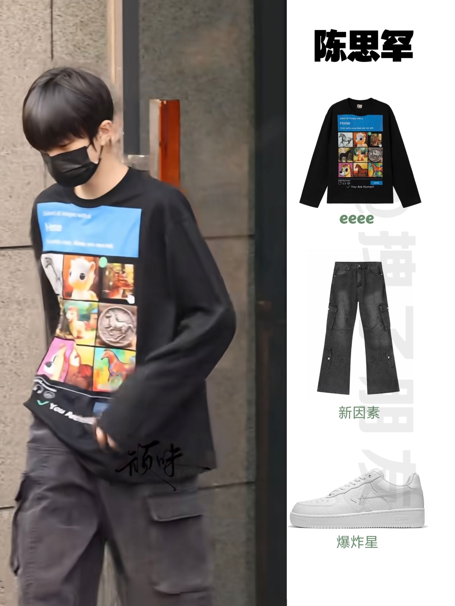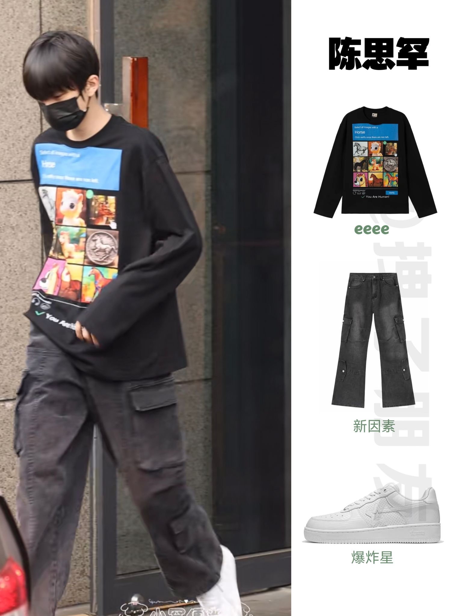 🧥eeeeArtmonster指鹿为马复古设计感小马验证马年限定长袖T恤 👖新因素弯刀复古水洗做旧工装裤 👟爆炸星SKBD BK-01Carbon Fiber White厚底复古运动鞋