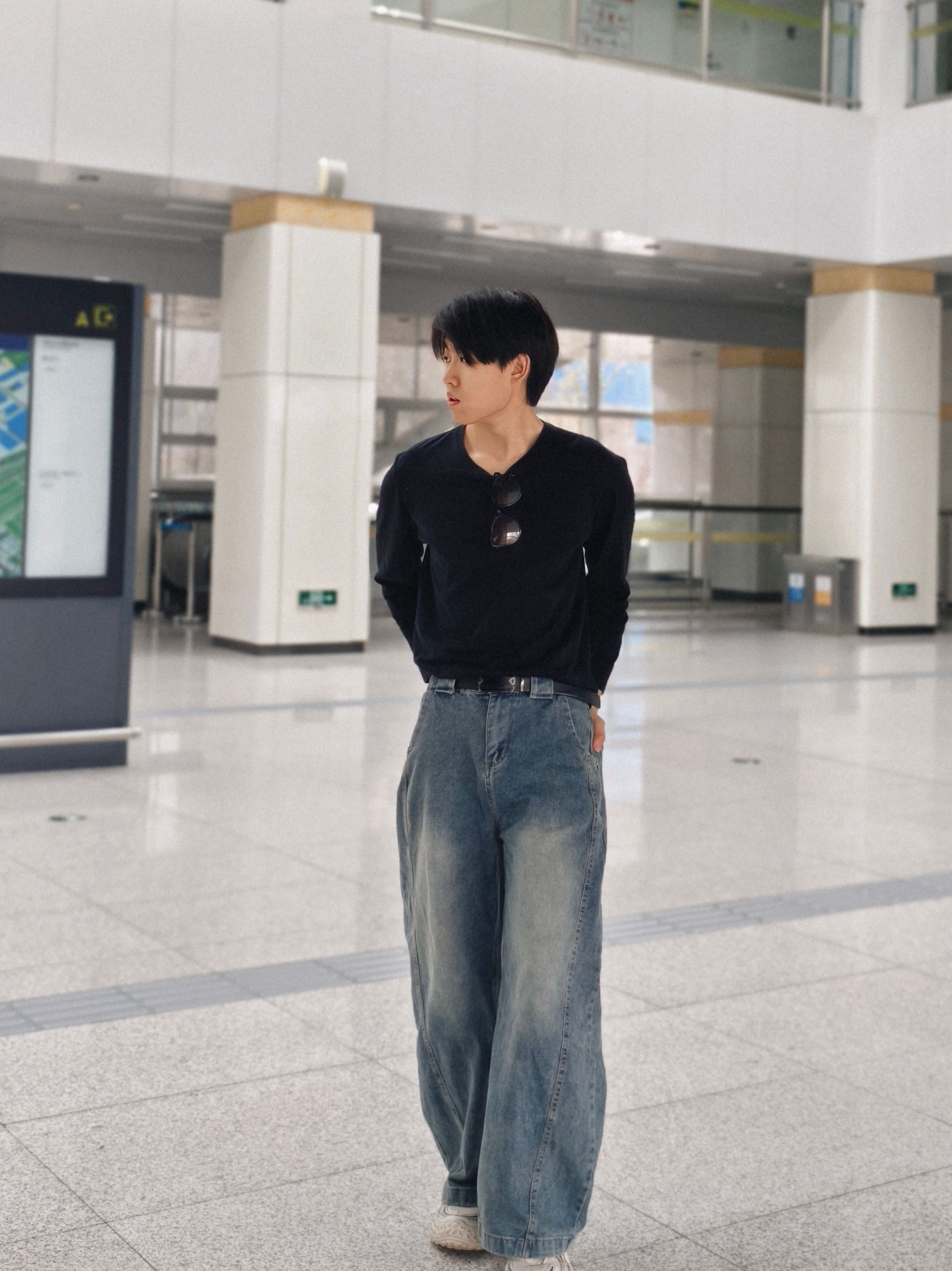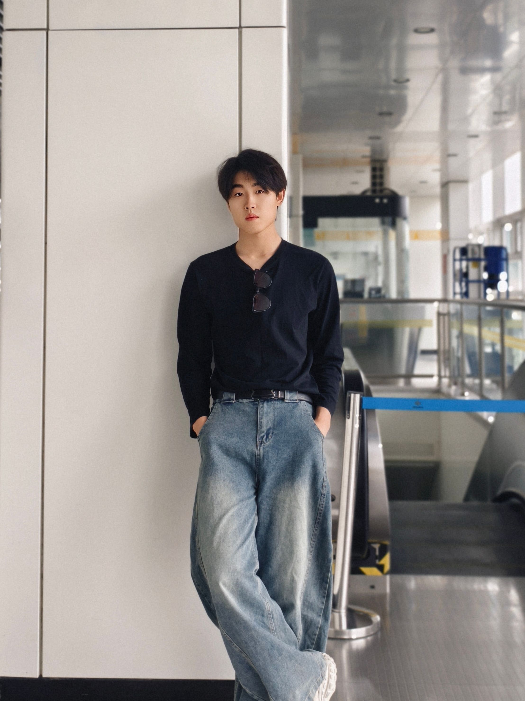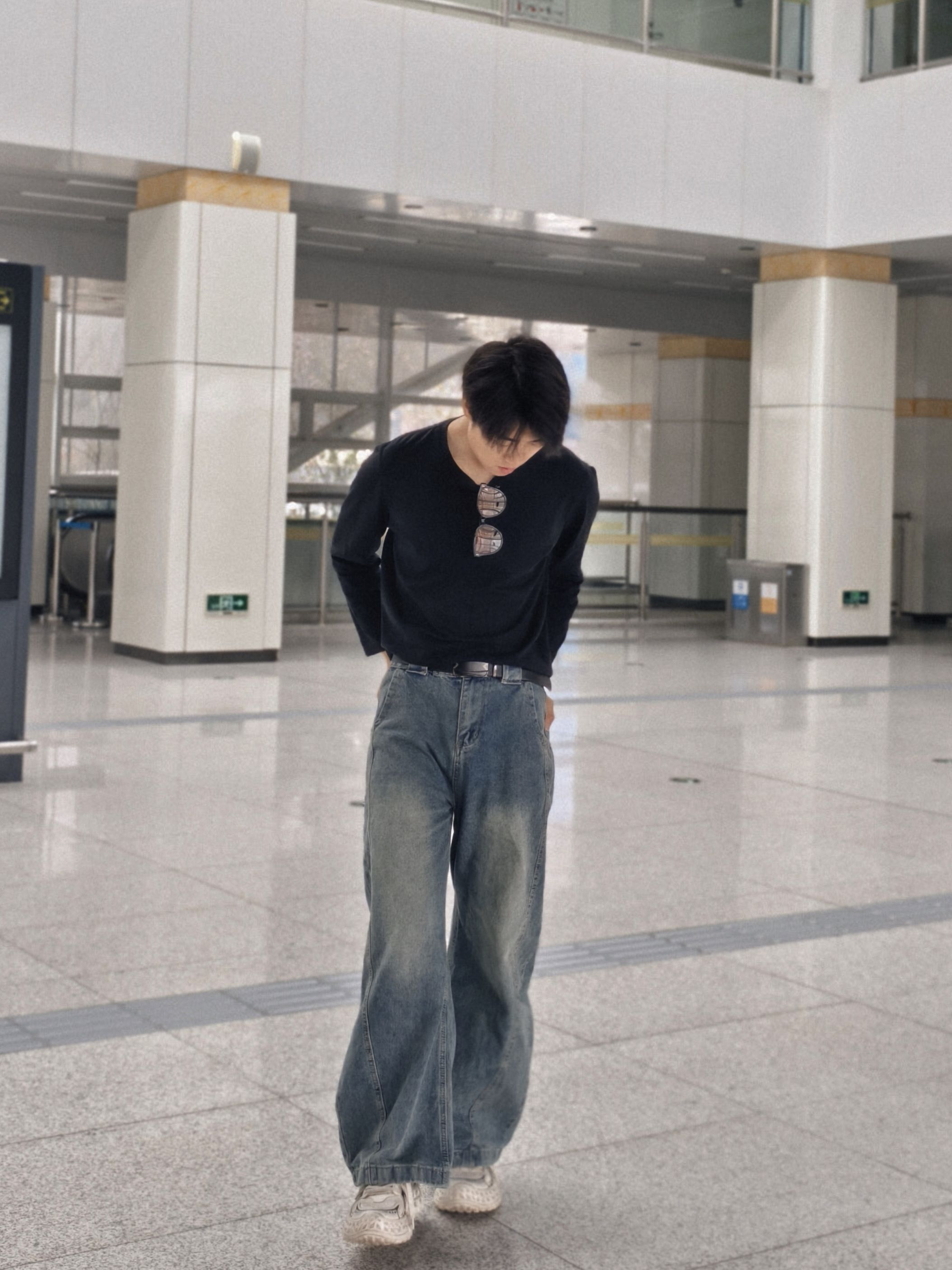 黑长袖+做旧阔腿牛仔,是不用动脑的高级感。 小V领露出一点脖颈线条,墨镜挂在领口当配饰,随性又利落。 宽裤腿+厚底鞋,把比例拉得刚刚好,走路带风的少年感直接拉满。 在人来人往的地铁站,也能拍出电影感大片。