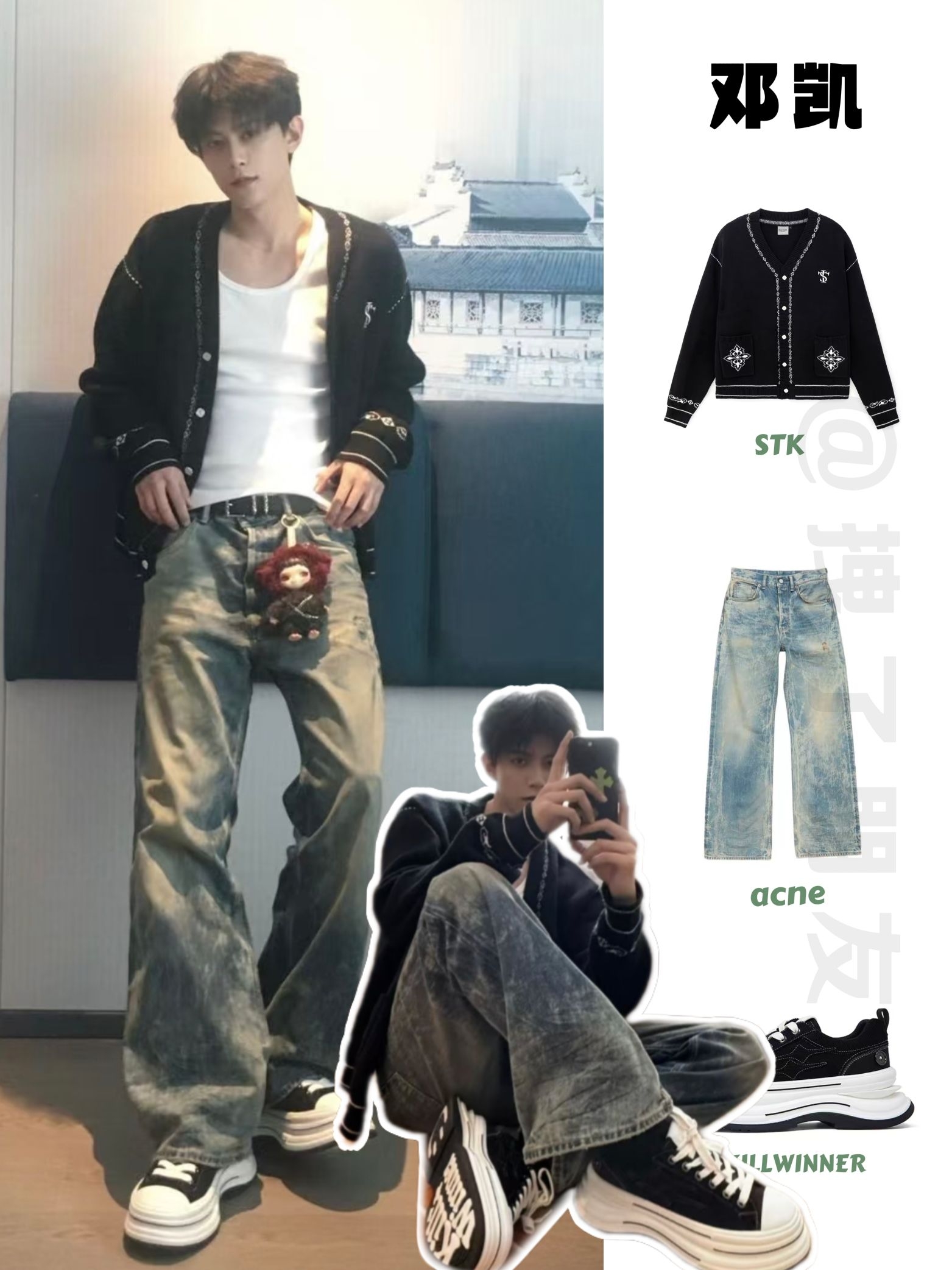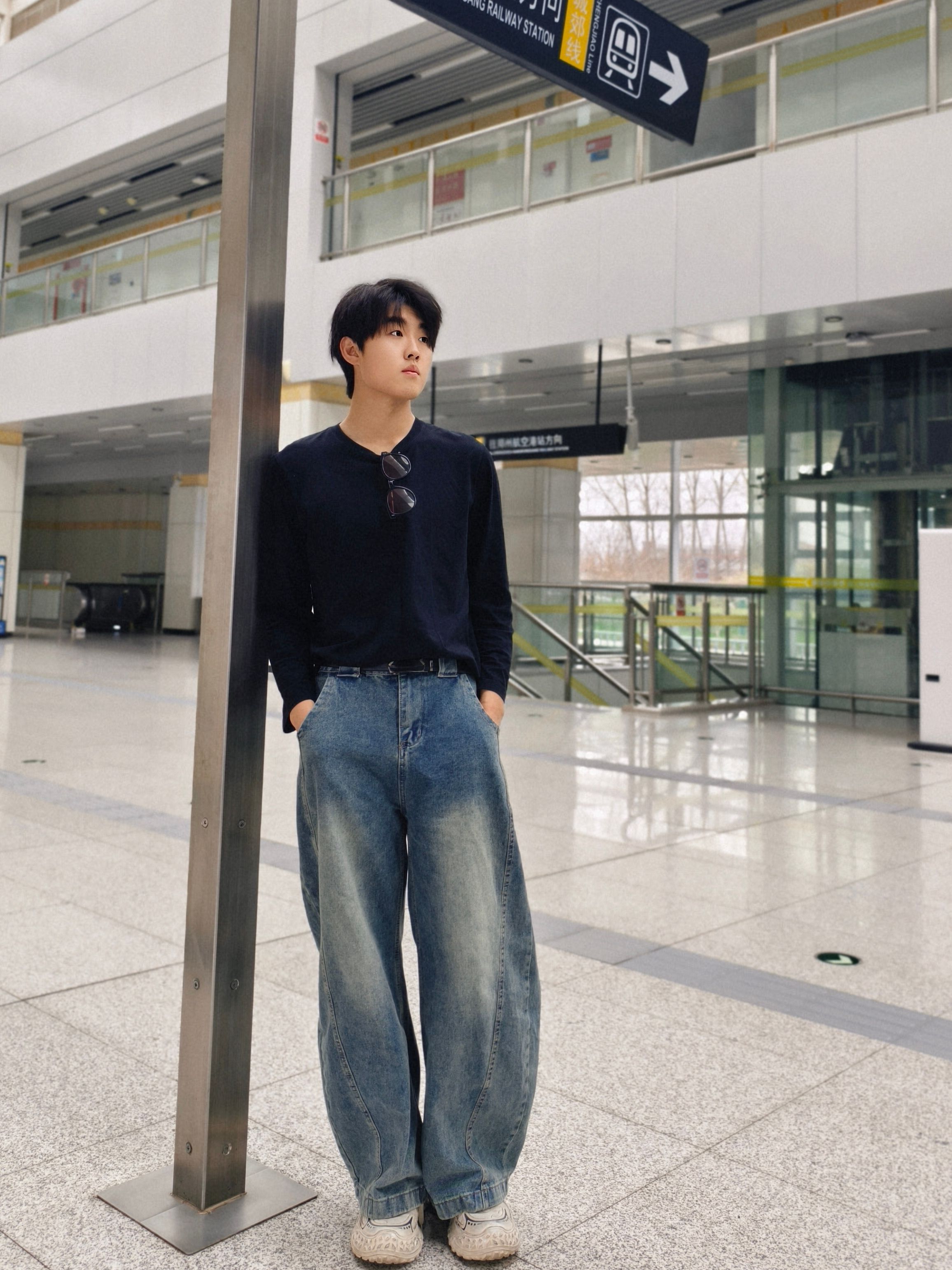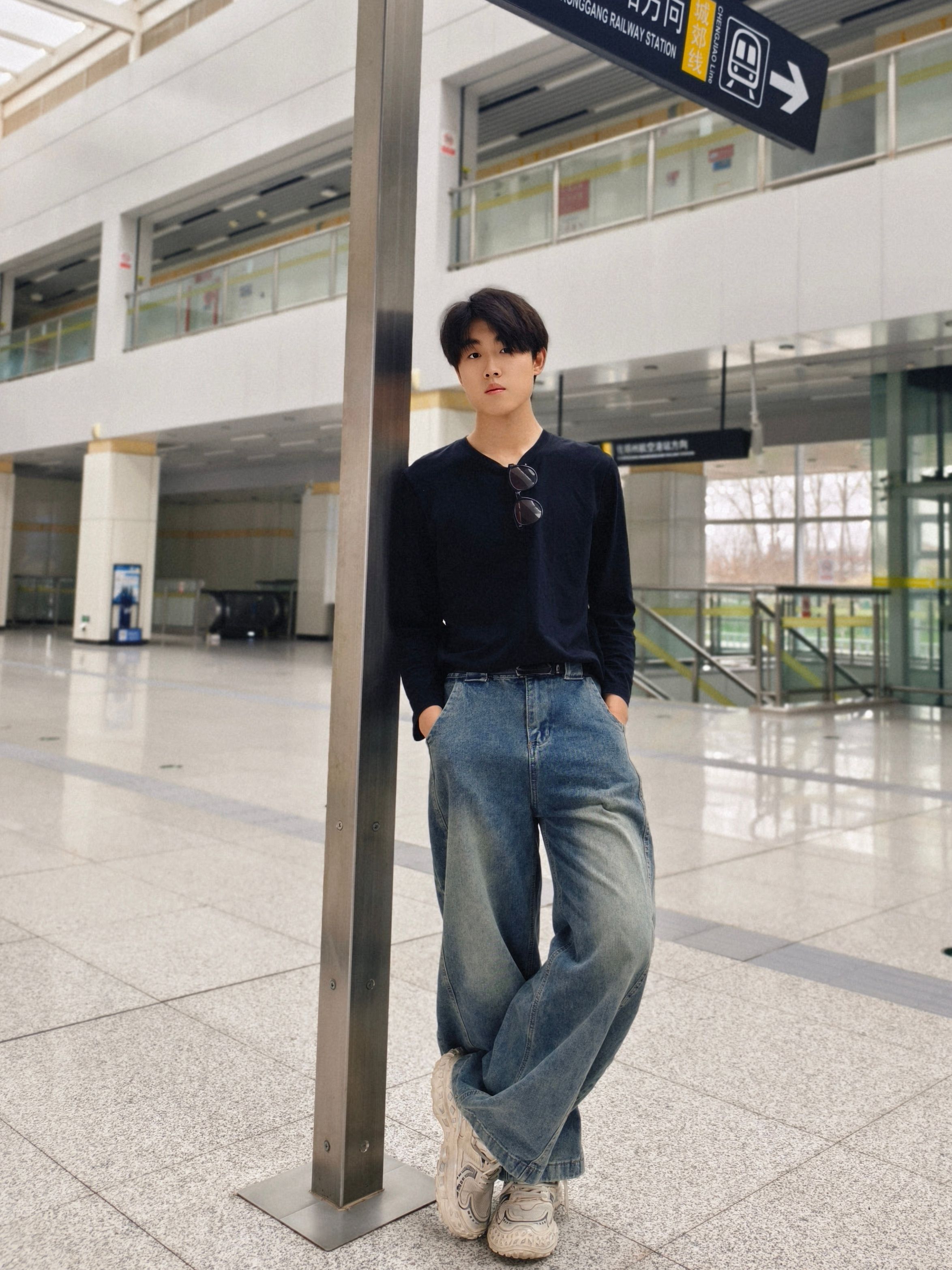黑长袖+做旧阔腿牛仔,是不用动脑的高级感。 小V领露出一点脖颈线条,墨镜挂在领口当配饰,随性又利落。 宽裤腿+厚底鞋,把比例拉得刚刚好,走路带风的少年感直接拉满。 在人来人往的地铁站,也能拍出电影感大片。