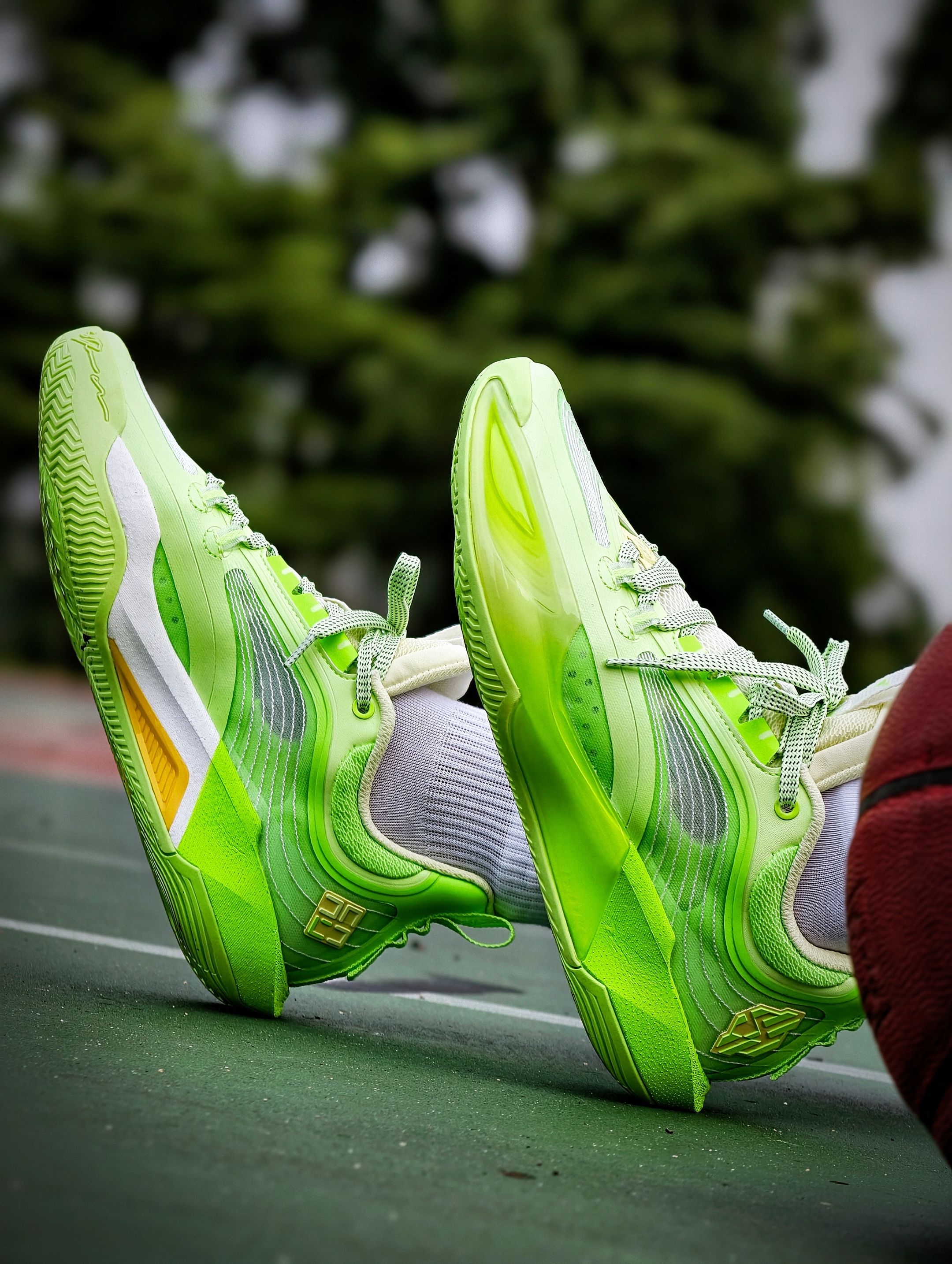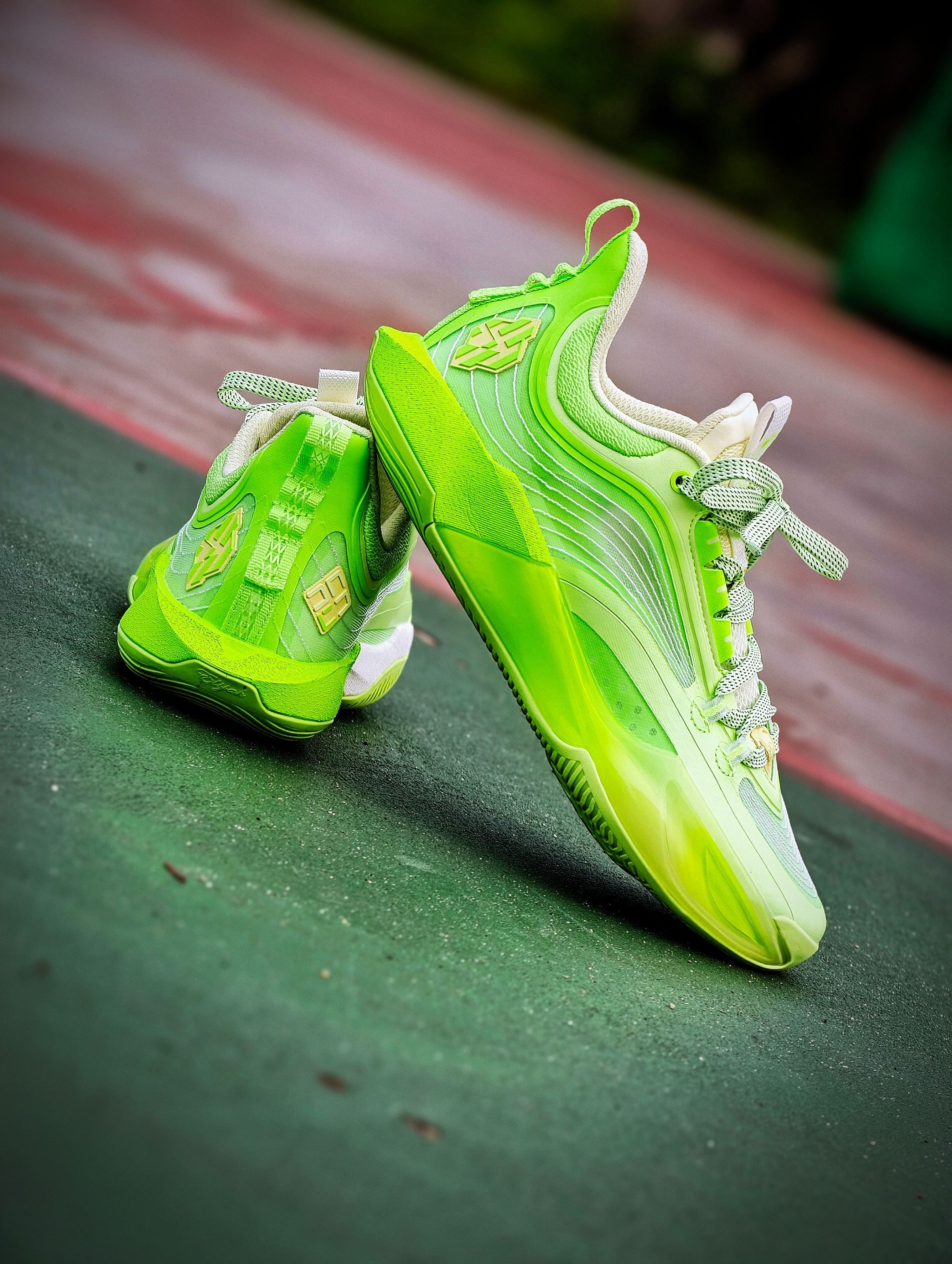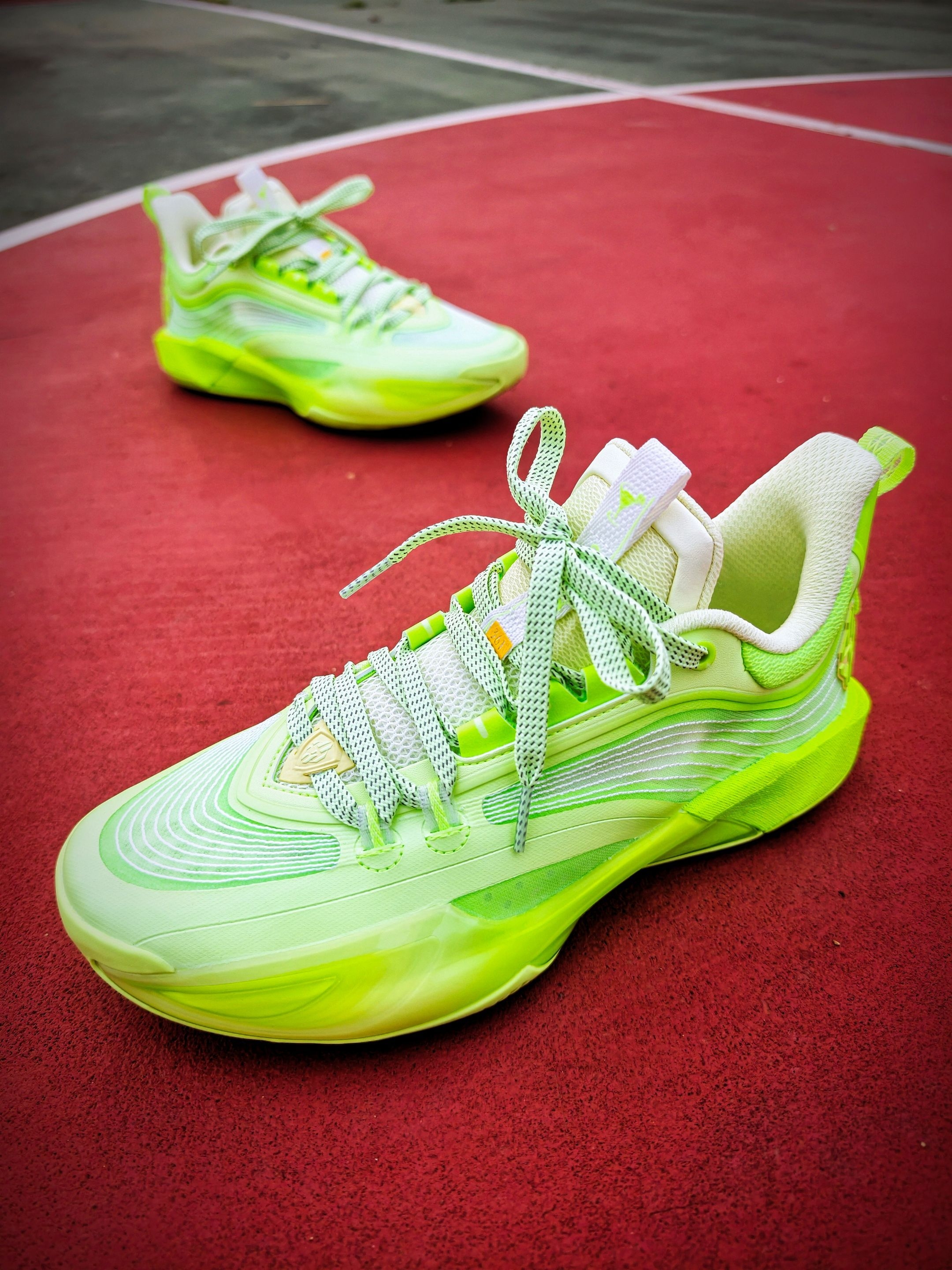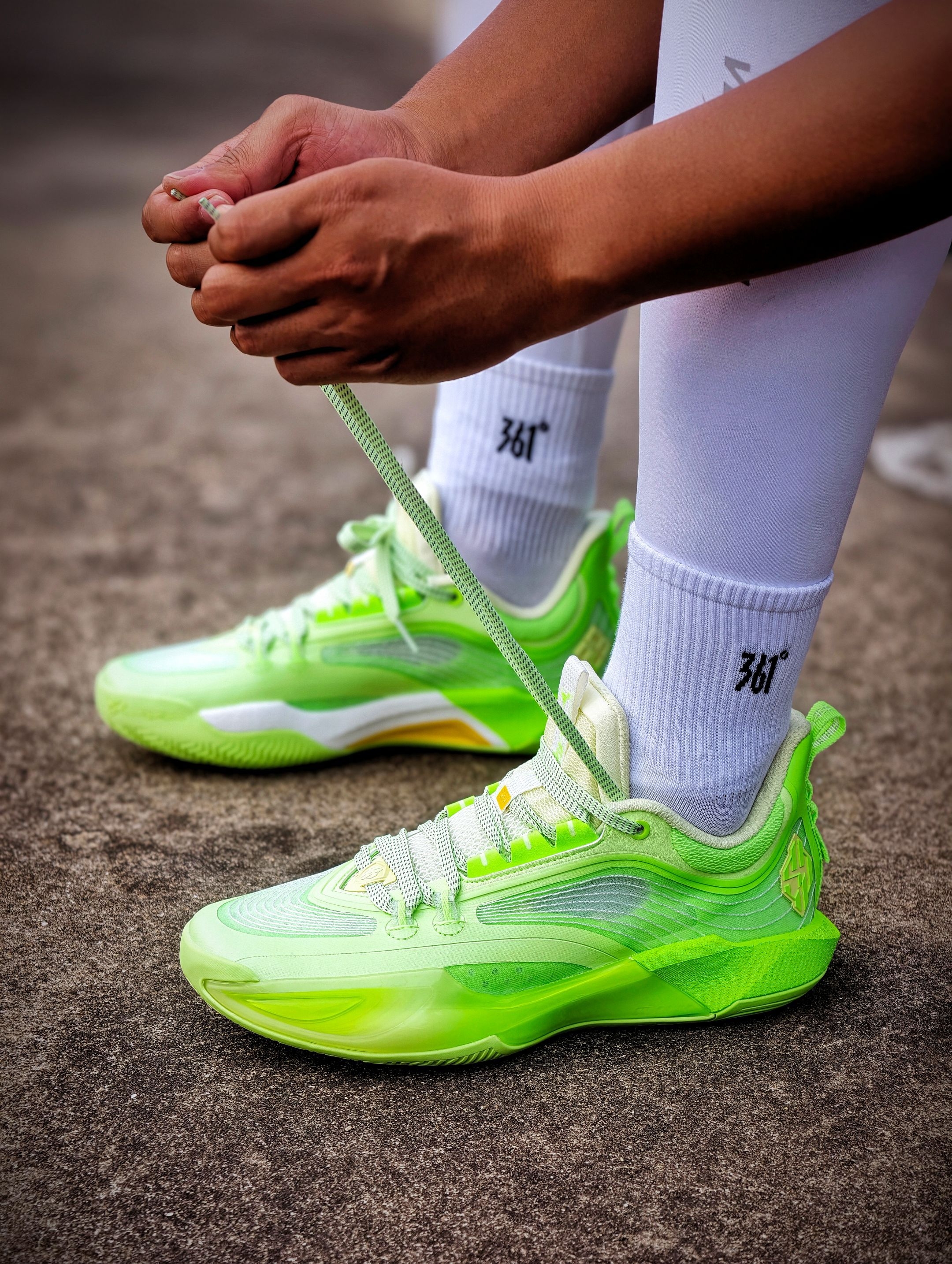 #361° DVD4 SE莫吉托配色实战篮球鞋 主打荧光绿+白色配色,活力满满 鞋面采用轻质网布,透气性超赞 鞋底缓震性能优秀,抓地力强 室内外球场都能轻松驾驭 鞋带是绿色编织款,细节感拉满 整体设计兼具功能与时尚 超适合追求个性的篮球爱好者