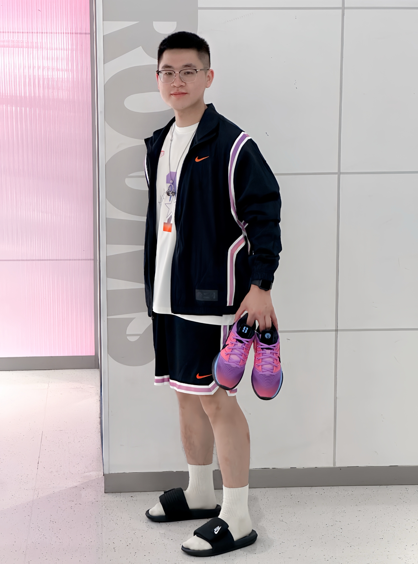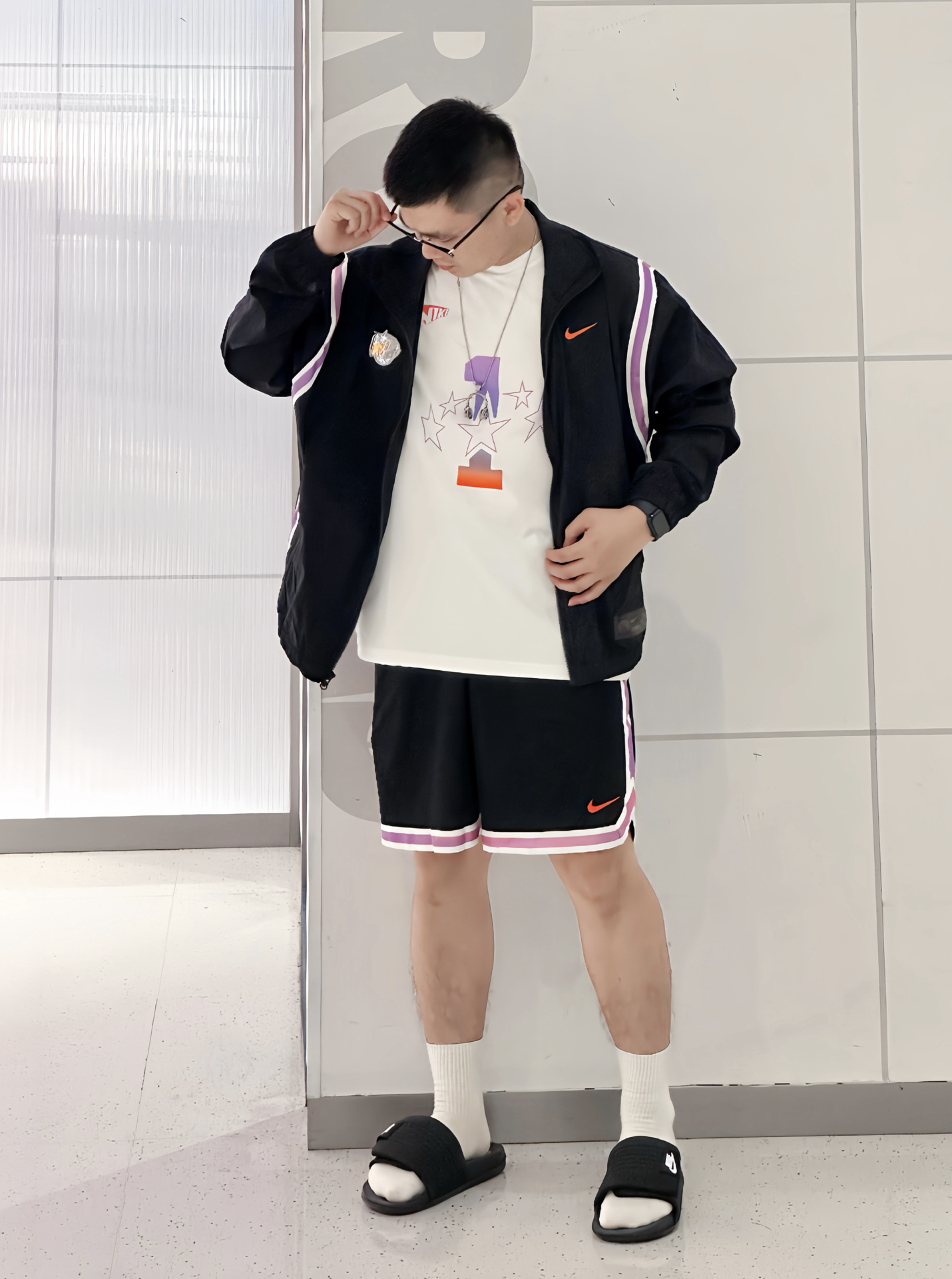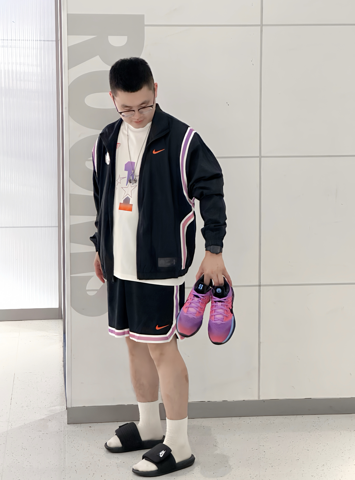 乍一看黑白很基础,但细节却是今年CHBL元素,紫橙渐变银河,很有夏日多巴胺的感觉 我这件梭织外套,近期早晚温差大,轻薄拒水刚好可以穿,内搭坎肩背心,去健身房锻炼也行 脚上这双经典魔术贴拖鞋,脚宽、脚厚的兄弟可以穿,运动前后穿很方便 Sabrina3虽没豪华配置,但前掌气垫➕XDR橡胶外底,学生党在学校打球/日常也是够用的