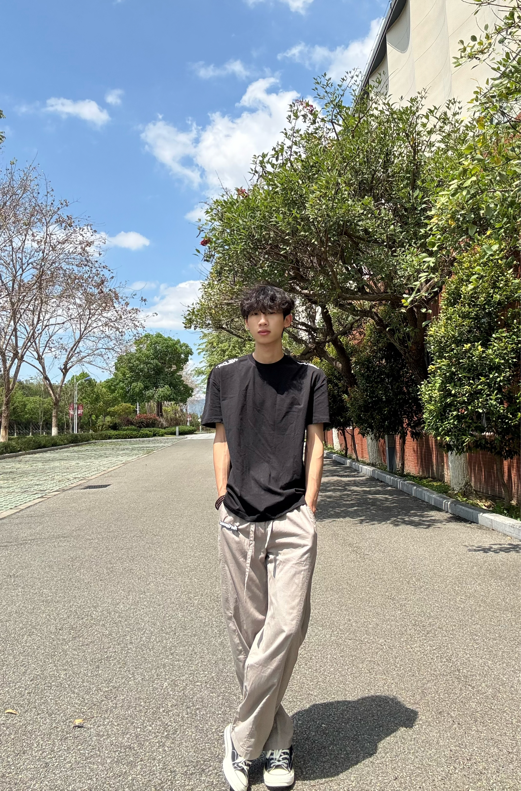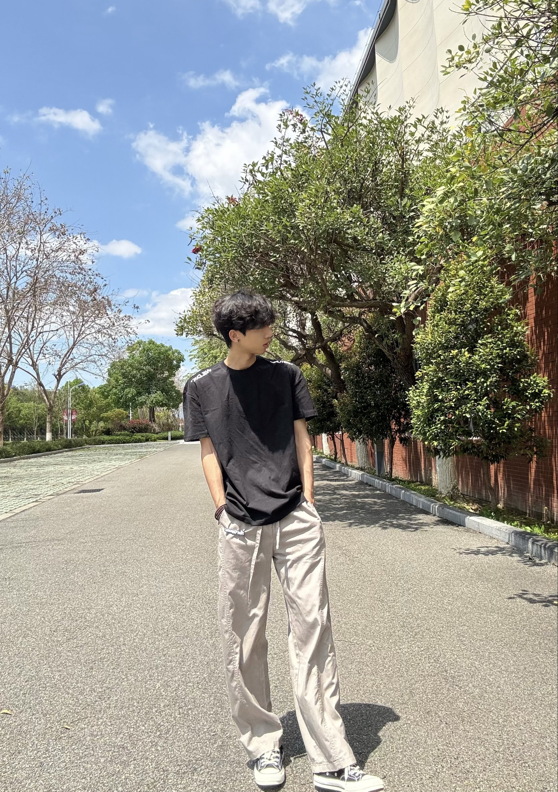 谁懂啊!男生夏天的穿搭真的越简单越高级! 这套基础款组合直接焊在身上,日常出门零思考,随手拍都是氛围感大片📸 ▫️上身:基础黑T 简约纯色款真的是衣柜常青树!宽松版型不挑身材,溜肩、小肚腩都能完美藏住,单穿干净利落,叠穿也超有层次感。领口做了加固处理,久穿不变形,日常通勤、校园出街都适配,百搭到没朋友~ ▫️下身:浅灰抽绳休闲裤 垂感直接拉满的神裤!冰感面料夏天穿完全不闷汗,宽松直筒版型对腿型...