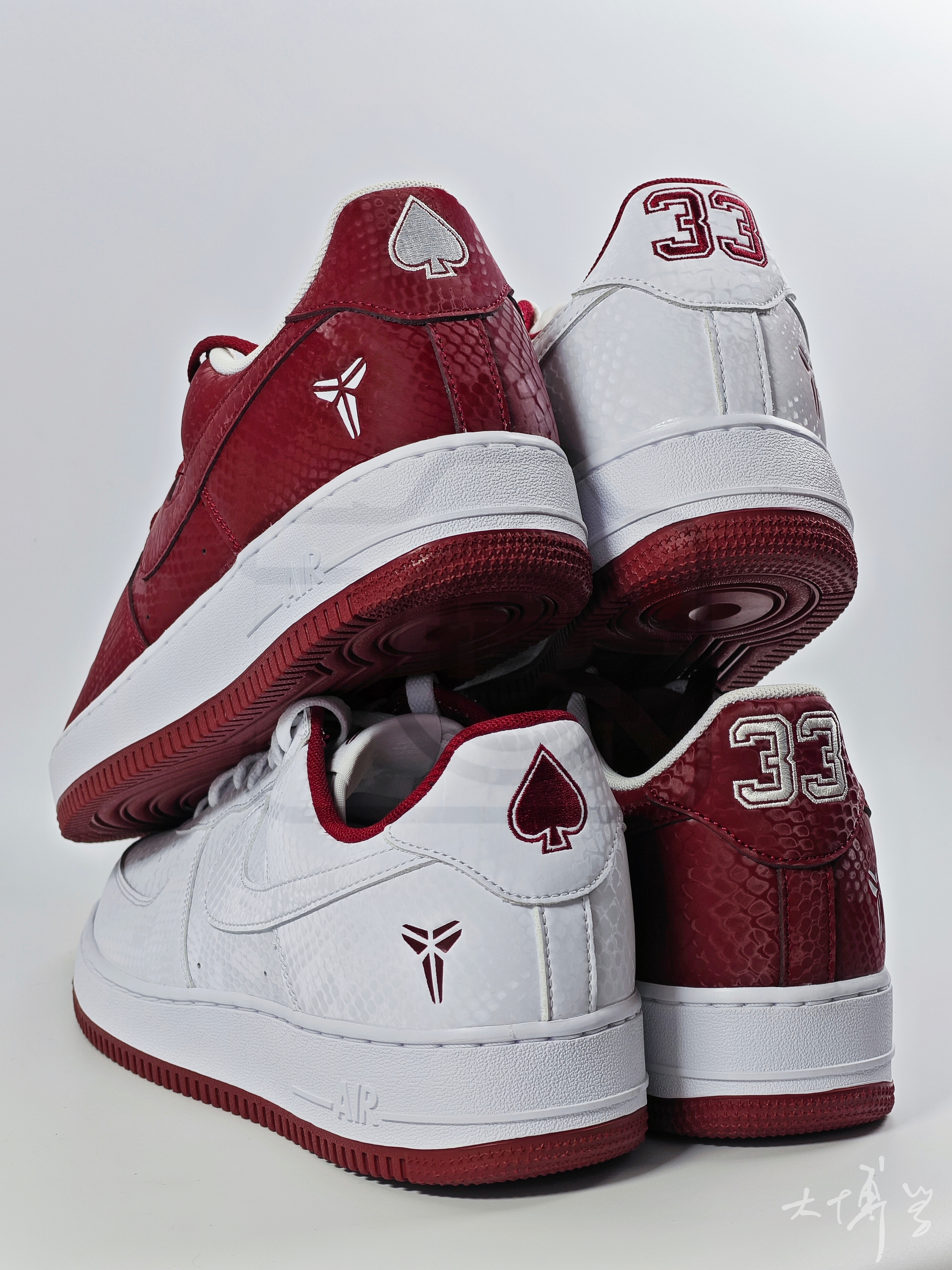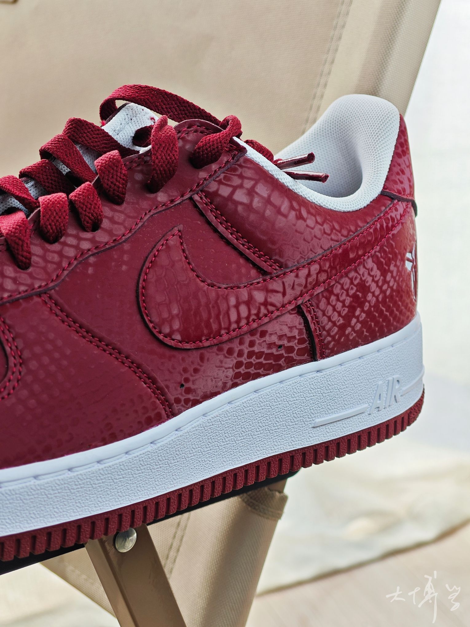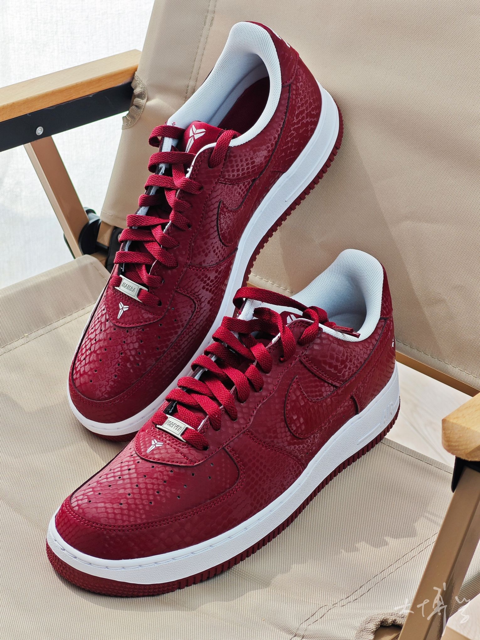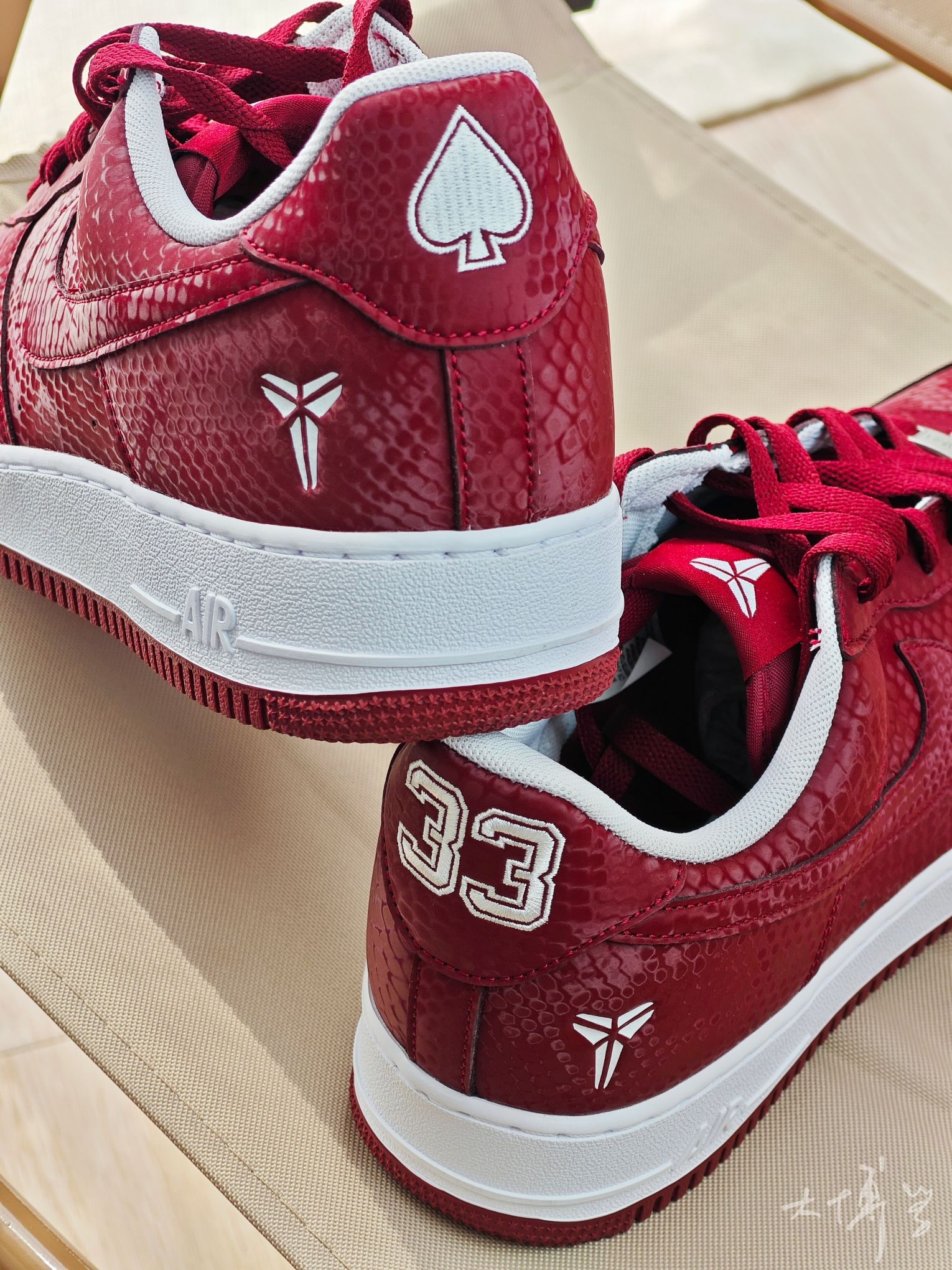 在AF1系列中 这双算是轻便款,海绵填充薄,皮质也薄 鞋面带有蛇鳞暗纹 算是一把双刃剑 充满个性而且明确了曼巴主题 但合成革质感确实不如真皮 有舍有得 颜色除了这个红色,还有一双白色的 这双红色可能更能代表劳尔梅里恩高中